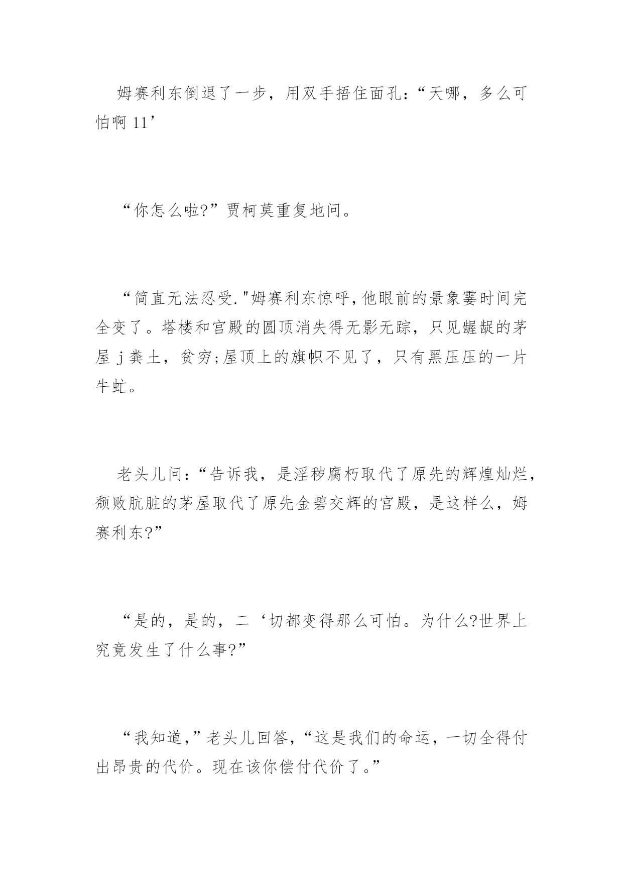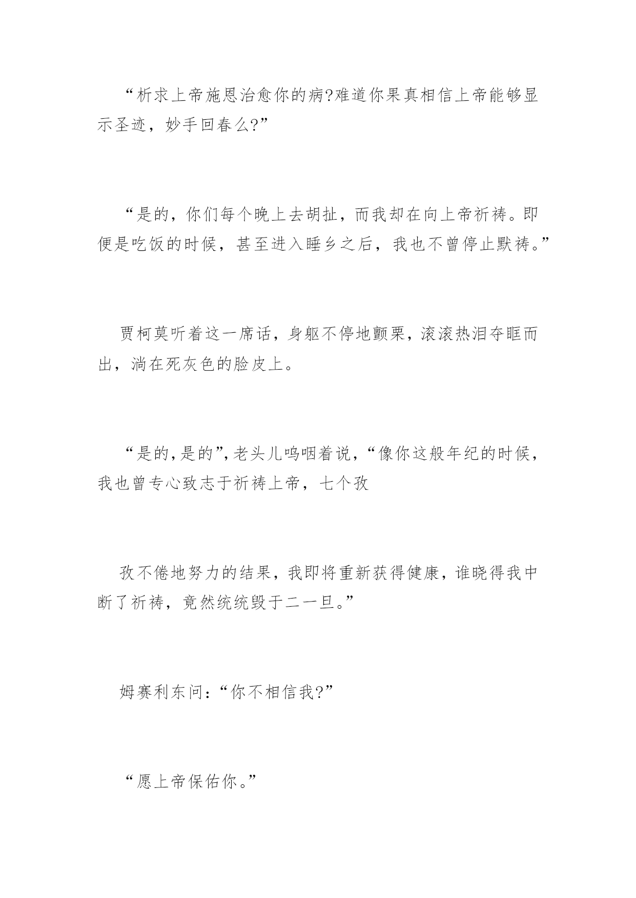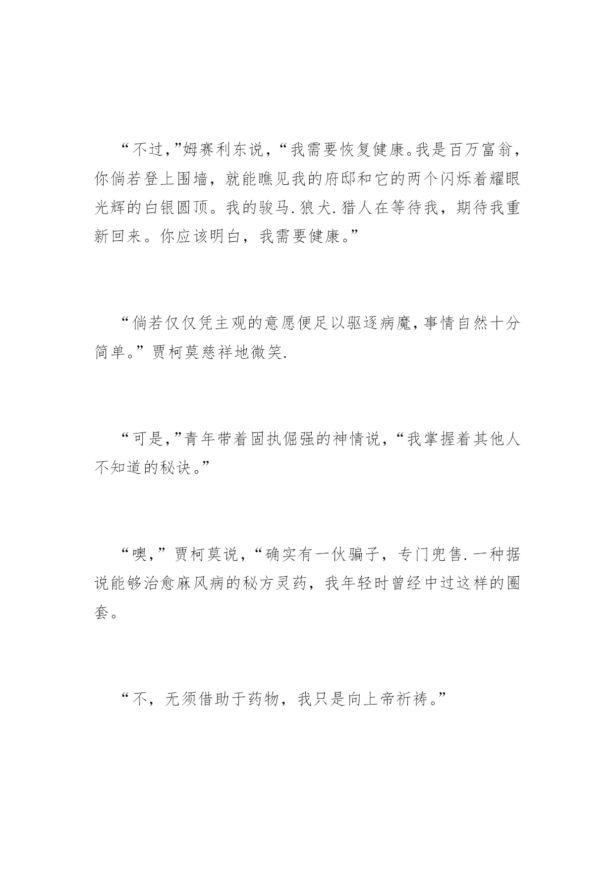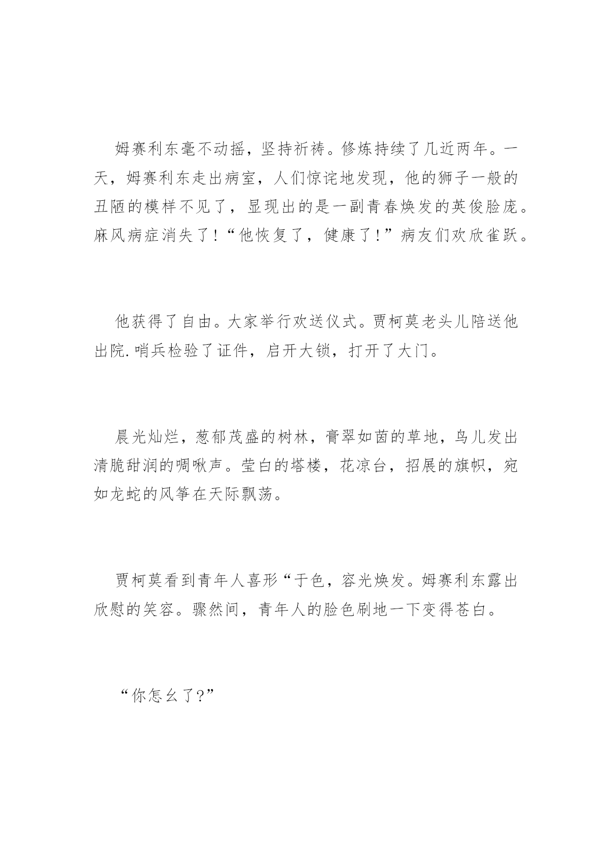 《渴望健康的人》阅读答案渴望健康的人距离城市约莫两公里的山岗上,坐落着-所庞大的城堡式的麻风病院.一道坚固的厚实的围墙高耸在城堡的四周。薄暮时分,麻风病人们照例聚集在围墙跟前。唯独一个年轻病人从不在这种场合露面。他入院方两个月,出身高贵门第,他叫姆赛利东。“你怎么在这里独自闷坐?”同伴们问道,“你不妨也去听听新闻,想必十分有趣呢!”“这意味着你们已经听任命运之神的摆布,而我并不甘心接受命运的安排,明白吗?”人群中走来一个名叫贾柯莫的老头,他是麻风痛院资格最老的病人,听到姆赛利东的话说:“可怜的孩子,我到这儿将近一百年了,凡我遇到的人,或者说走进这个大门的人,从来不曾有谁能够活着走出去的。这是麻风病人的命运."“不过,”姆赛利东说,“我需要恢复健康。我是百万富翁,你倘若登上围墙,就能瞧见我的府邸和它的两个闪烁着耀眼光辉的白银圆顶。我的骏马.狼犬.猎人在等待我,期待我重新回来。你应该明白,我需要健康。”“倘若仅仅凭主观的意愿便足以驱逐病魔,事情自然十分简单。”贾柯莫慈祥地微笑.“可是,”青年带着固执倔强的神情说,“我掌握着其他人不知道的秘诀。”“噢,”贾柯莫说,“确实有一伙骗子,专门兜售.一种据说能够治愈麻风病的秘方灵药,我年轻时曾经中过这样的圈套。“不,无须借助于药物,我只是向上帝祈祷。”“析求上帝施恩治愈你的病?难道你果真相信上帝能够显示圣迹,妙手回春么?”“是的,你们每个晚上去胡扯,而我却在向上帝祈祷。即便是吃饭的时候,甚至进入睡乡之后,我也不曾停止默祷。”贾柯莫听着这一席话,身躯不停地颤栗,滚滚热泪夺眶而出,淌在死灰色的脸皮上。“是的,是的”,老头儿呜咽着说,“像你这般年纪的时候,我也曾专心致志于祈祷上帝,七个孜孜不倦地努力的结果,我即将重新获得健康,谁晓得我中断了祈祷,竟然统统毁于二一旦。”姆赛利东问:“你不相信我?”“愿上帝保佑你。”姆赛利东毫不动摇,坚持祈祷。修炼持续了几近两年。一天,姆赛利东走出病室,人们惊诧地发现,他的狮子一般的丑陋的模样不见了,显现出的是一副青春焕发的英俊脸庞。麻风病症消失了!“他恢复了,健康了!”病友们欢欣雀跃。他获得了自由。大家举行欢送仪式。贾柯莫老头儿陪送他出院.哨兵检验了证件,启开大锁,打开了大门。晨光灿烂,葱郁茂盛的树林,膏翠如茵的草地,鸟儿发出清脆甜润的啁啾声。莹白的塔楼,花凉台,招展的旗帜,宛如龙蛇的风筝在天际飘荡。贾柯莫看到青年人喜形“于色,容光焕发。姆赛利东露出欣慰的笑容。骤然间,青年人的脸色刷地一下变得苍白。“你怎幺了?”姆赛利东倒退了一步,用双手捂住面孔:“天哪,多么可怕啊11’“你怎么啦?”贾柯莫重复地问。“简直无法忍受."姆赛利东惊呼,他眼前的景象霎时间完全变了。塔楼和宫殿的圆顶消失得无影无踪,只见龌龊的茅屋j粪土,贫穷;屋顶上的旗帜不见了,只有黑压压的一片牛虻。老头儿问:“告诉我,是淫秽腐朽取代了原先的辉煌灿烂,颓败肮脏的茅屋取代了原先金碧交辉的宫殿,是这样么,姆赛利东?”“是的,是的,二‘切都变得那么可怕。为什么?世界上究竟发生了什么事?”“我知道,”老头儿回答,“这是我们的命运,一切全得付出昂贵的代价。现在该你偿付代价了。”“偿付代价?为什么?”“因为上帝的恩典是你的精神力量。你战胜病魔,你不复是往日的你,而是脱胎换骨了。随着你逐渐恢复健康,驱使你渴望健康的种种人世间的诱惑便愈益远远地离开你,最终成为过眼云烟,你拥有百万家产,可如今你视金钱若粪土,你往日门第高贵,如今成了纯洁的圣者!这就是偿付的代价。你最终成了我们的人,姆赛利东,留下来吧,留在我们这些麻风病人中间,这是如今你唯一的幸福。喂,哨兵,把大门关上吧。”砰然一声响,哨兵关上城堡的大门.1.下列对小说有关内容的分析和概括,最恰当韵两项是(4分)A.小说讲述了姆赛利东进入麻风病城堡治疗麻风病并最终留在城堡的故事,,情节诡异独特,文笔华丽、清新。B.小说中的贾柯莫是个智慧老人,他用自己在麻风病城堡里的亲身经历教育指导姆赛利东。他与姆赛利东的对话推动了故事情节的发展。C.小说写到贾柯莫也曾七个月专心致志祈祷上帝,但因为中断了祈祷,结果竟然统统毁于一旦,这是作者为表现妈赛利东的毅力而设的衬托之笔。D.小说写姆赛利东“淫秽腐朽取代了原先的辉煌灿烂,颓败肮脏的茅屋取代了原先金碧交辉的宫殿”,说明他患病两年,他的豪华府邸无人打理荒芜.破败了,E.“随着你逐渐恢复健康,驱使你渴望健康的种种人世间的诱惑便愈益远远地离开你”,“如今你视金钱若粪土”,小说结尾,贾柯莫的话启发人们思考:什么才是真正健康的生活。2.结合文本,分析姆赛利东在挣扎着摆脱命运的过程中的心理变化.(4分)答:3.文中画线句子是—段景物描写,联系全文说说这段景物描写的作用.(