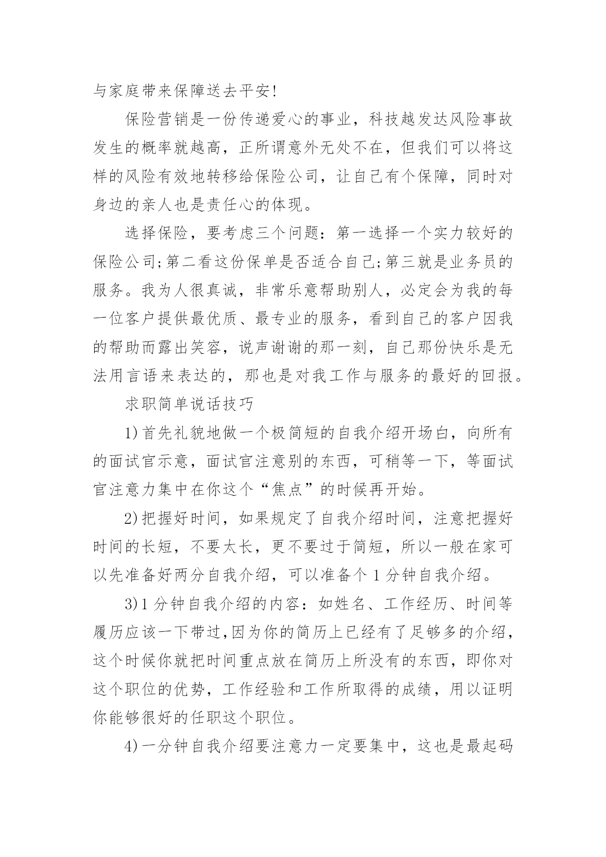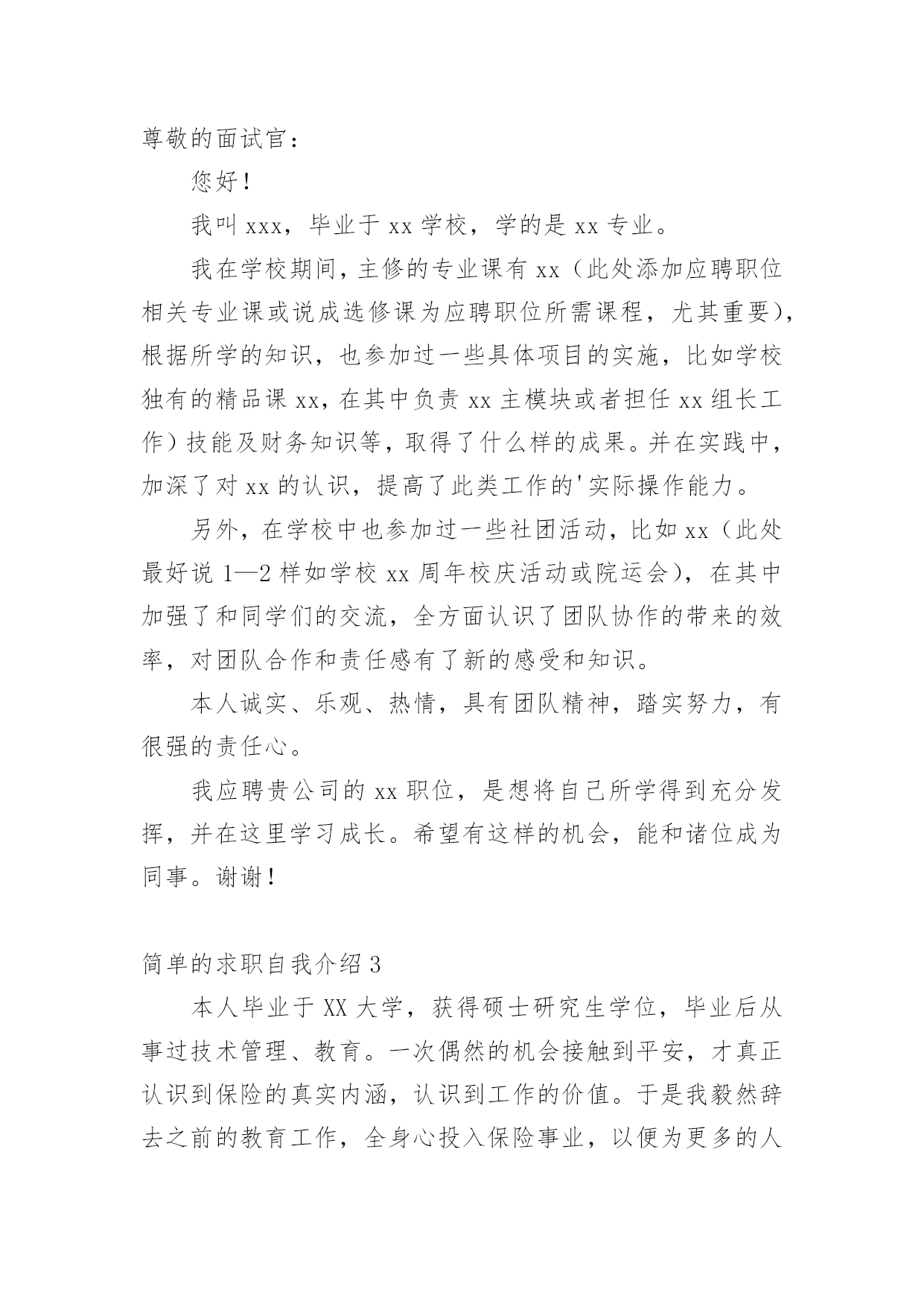 简单的求职自我介绍简单的求职自我介绍当换了一个新环境后,可能需要我们进行自我介绍,通过自我介绍可以让别人认识自己。那么我们该怎么去写自我介绍呢?下面是小编帮大家整理的简单的求职自我介绍,仅供参考,欢迎大家阅读。简单的求职自我介绍1我叫×××,来自绿城南宁。20xx年7月份以专业考试得分第一的好成绩毕业于广西大学的XX专业。毕业之前,我曾在XX公司实习过,XX公司和贵公司是同类行业。本人性格开朗,善于微笑,长于交际,会简单日语及芭蕾舞。我相信,这一切将成为我工作最大的财富。我在很久就注意到贵公司,贵公司无疑是××行业中的姣姣者(将你所了解的公司荣誉或成果填上)。同时我又了解到,这又是一支年轻而又富有活力的队伍。本人非常渴望能够在为其中的一员。如果有幸获聘,本人将以为公司创造最大利益为自己最大的利益,不讲价钱。真诚做好每一件事,和同事们团结奋斗。勤奋工作,加强学习,不断进步!谢谢!简单的求职自我介绍2尊敬的面试官:您好!我叫xxx,毕业于xx学校,学的是xx专业。我在学校期间,主修的专业课有xx(此处添加应聘职位相关专业课或说成选修课为应聘职位所需课程,尤其重要),根据所学的知识,也参加过一些具体项目的实施,比如学校独有的精品课xx,在其中负责xx主模块或者担任xx组长工作)技能及财务知识等,取得了什么样的成果。并在实践中,加深了对xx的认识,提高了此类工作的'实际操作能力。另外,在学校中也参加过一些社团活动,比如xx(此处最好说1—2样如学校xx周年校庆活动或院运会),在其中加强了和同学们的交流,全方面认识了团队协作的带来的效率,对团队合作和责任感有了新的感受和知识。本人诚实、乐观、热情,具有团队精神,踏实努力,有很强的责任心。我应聘贵公司的xx职位,是想将自己所学得到充分发挥,并在这里学习成长。希望有这样的机会,能和诸位成为同事。谢谢!简单的求职自我介绍3本人毕业于XX大学,获得硕士研究生学位,毕业后从事过技术管理、教育。一次偶然的机会接触到平安,才真正认识到保险的真实内涵,认识到工作的价值。于是我毅然辞去之前的教育工作,全身心投入保险事业,以便为更多的人与家庭带来保障送去平安!保险营销是一份传递爱心的事业,科技越发达风险事故发生的概率就越高,正所谓意外无处不在,但我们可以将这样的风险有效地转移给保险公司,让自己有个保障,同时对身边的亲人也是责任心的体现。选择保险,要考虑三个问题:第一选择一个实力较好的保险公司;第二看这份保单是否适合自己;第三就是业务员的服务。我为人很真诚,非常乐意帮助别人,必定会为我的每一位客户提供最优质、最专业的服务,看到自己的客户因我的帮助而露出笑容,说声谢谢的那一刻,自己那份快乐是无法用言语来表达的,那也是对我工作与服务的最好的回报。求职简单说话技巧1)首先礼貌地做一个极简短的自我介绍开场白,向所有的面试官示意,面试官注意别的东西,可稍等一下,等面试官注意力集中在你这个“焦点”的时候再开始。2)把握好时间,如果规定了自我介绍时间,注意把握好时间的长短,不要太长,更不要过于简短,所以一般在家可以先准备好两分自我介绍,可以准备个1分钟自我介绍。3)1分钟自我介绍的内容:如姓名、工作经历、时间等履历应该一下带过,因为你的简历上已经有了足够多的介绍,这个时候你就把时间重点放在简历上所没有的东西,即你对这个职位的优势,工作经验和工作所取得的成绩,用以证明你能够很好的任职这个职位。4)一分钟自我介绍要注意力一定要集中,这也是最起码的礼貌,如果你四处张望,漫不经心,如果你是面试官,你会要这样的人嘛?姿势可以保持一个姿势,毕竟很短暂的时间。5)一分钟自我介绍演讲结束后:结束后一定要谢谢面试官,耐心的听你的介绍,一段短短的自我介绍,就是为了下次更深入的了解而做的准备而已。