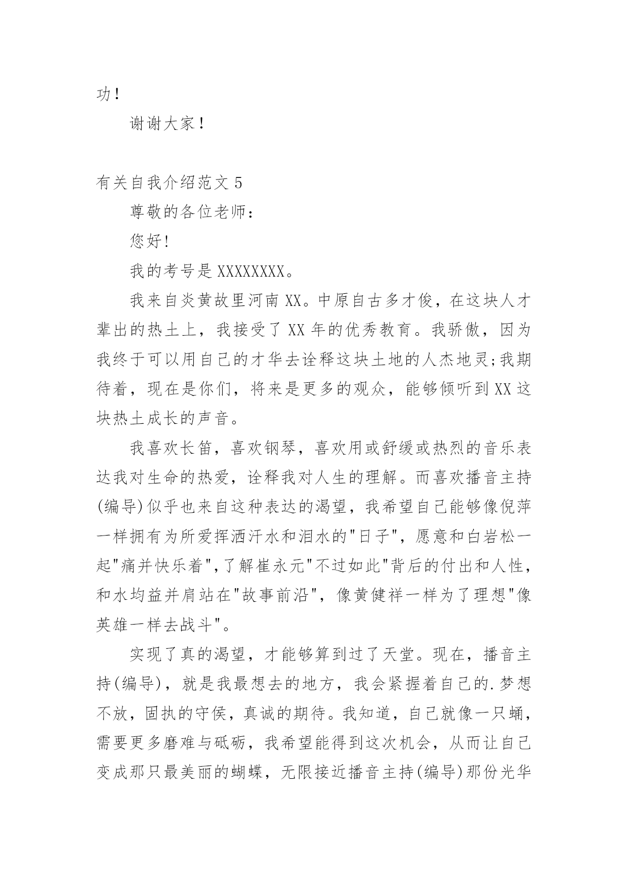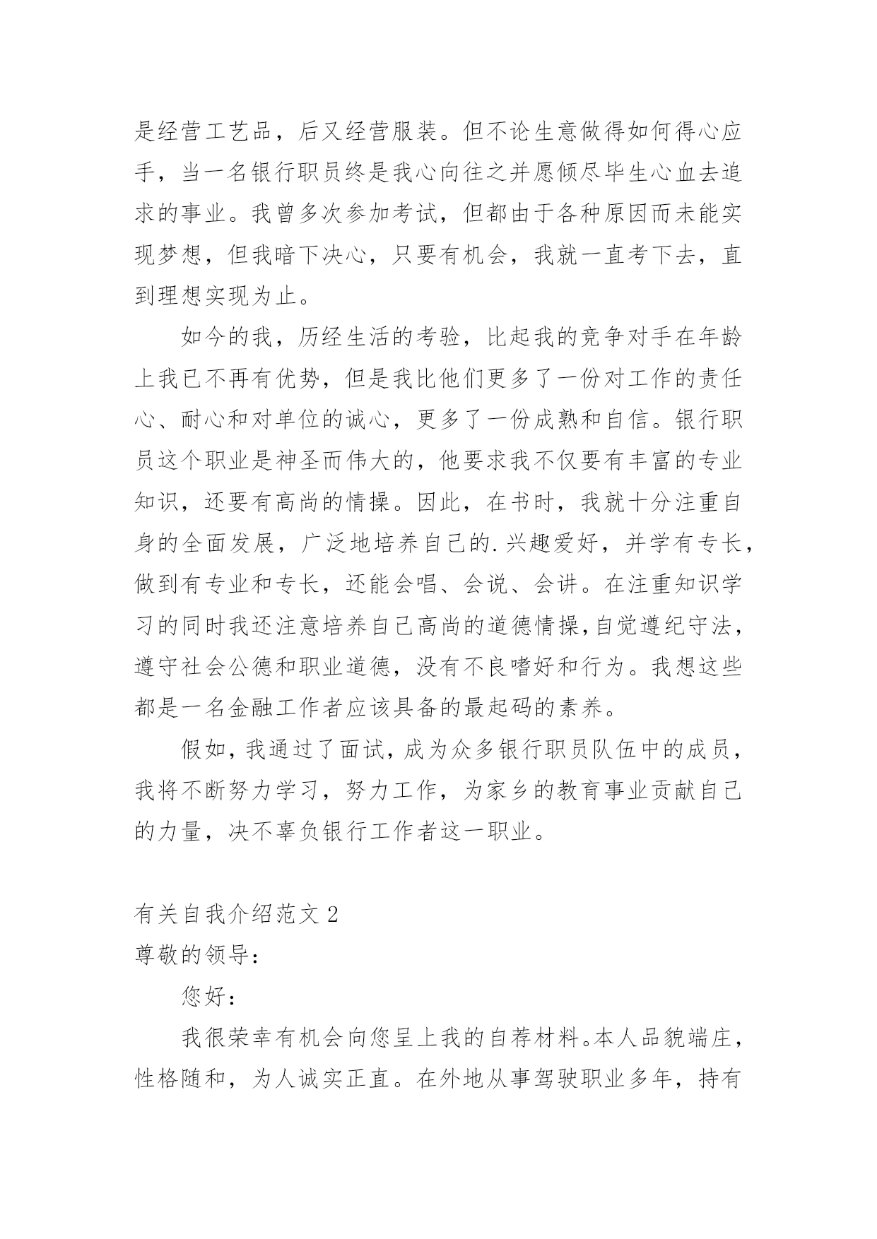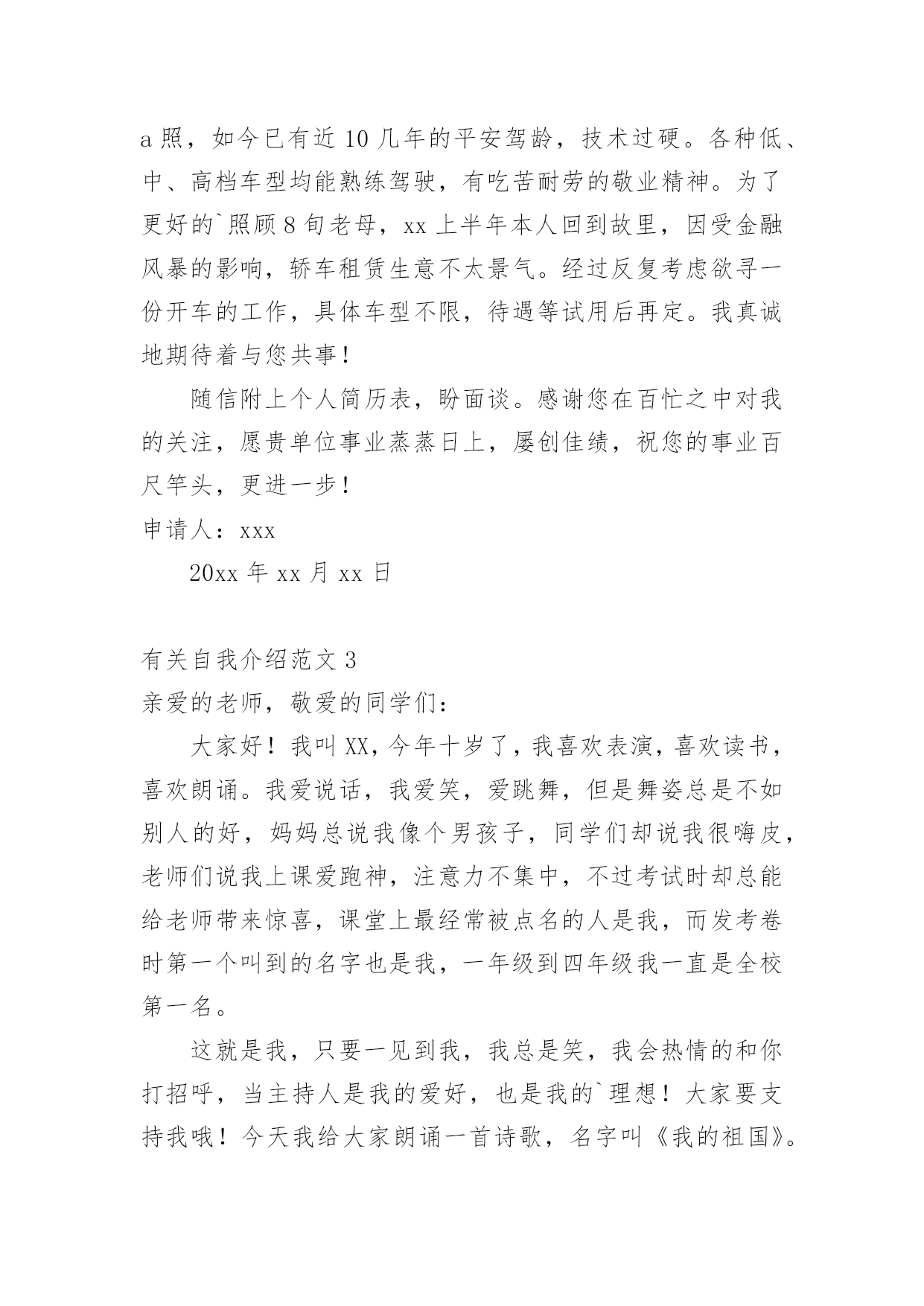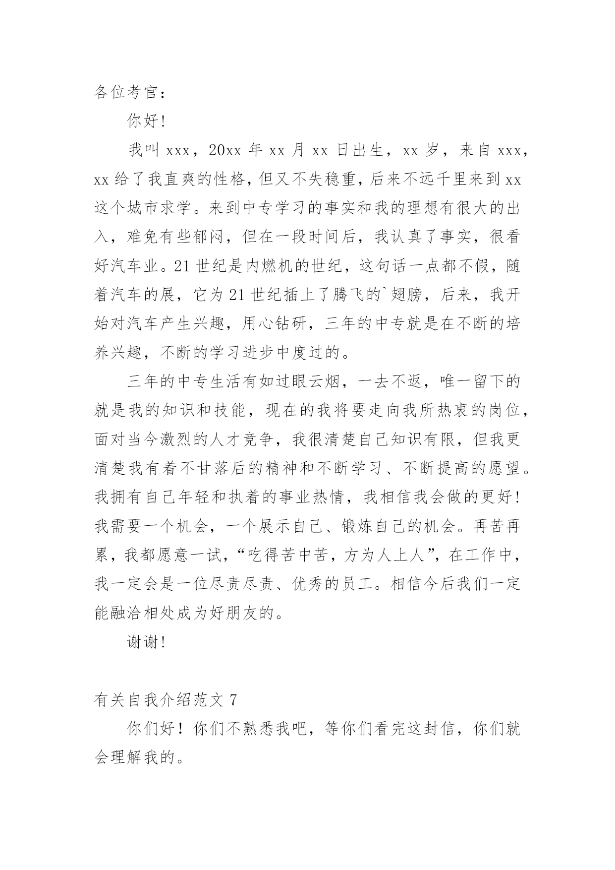 自我介绍有关自我介绍范文当来到一个新环境时,时常需要用到自我介绍,自我介绍是人与人进行沟通的出发点。你所见过的自我介绍是什么样的呢?下面是小编整理的有关自我介绍范文,希望对大家有所帮助。有关自我介绍范文1各位考官好:您好!通过考试,今天,我以本岗位笔试第的成绩进入了面试。对我来说,这次工作机会显得尤为珍贵。我叫xx,今年x岁。xx年7月我从学院系毕业。由于原因,使我与“太阳底下最光辉的职业”失之交臂。幸好,当时,经人介绍,我在单位有了的工作经历。回想起那段时光真是既甜蜜又美好,虽然工资很低,但听着别人对我工作的赞美,看着那一双双充满信任的眼睛,我心里充满报幸福与甜蜜。我原想,即使不能转正,只要单位需要,就是当一辈子临时工我也心甘情愿。今天,我想通过此次考试重新走上工作岗位的愿望是那样迫切!我家共有三姊妹,两个姐姐在外打工,为了照顾已上了年纪的父母,我一直留在他们身边。我曾开过铺子,先是经营工艺品,后又经营服装。但不论生意做得如何得心应手,当一名银行职员终是我心向往之并愿倾尽毕生心血去追求的事业。我曾多次参加考试,但都由于各种原因而未能实现梦想,但我暗下决心,只要有机会,我就一直考下去,直到理想实现为止。如今的我,历经生活的考验,比起我的竞争对手在年龄上我已不再有优势,但是我比他们更多了一份对工作的责任心、耐心和对单位的诚心,更多了一份成熟和自信。银行职员这个职业是神圣而伟大的,他要求我不仅要有丰富的专业知识,还要有高尚的情操。因此,在书时,我就十分注重自身的全面发展,广泛地培养自己的.兴趣爱好,并学有专长,做到有专业和专长,还能会唱、会说、会讲。在注重知识学习的同时我还注意培养自己高尚的道德情操,自觉遵纪守法,遵守社会公德和职业道德,没有不良嗜好和行为。我想这些都是一名金融工作者应该具备的最起码的素养。假如,我通过了面试,成为众多银行职员队伍中的成员,我将不断努力学习,努力工作,为家乡的教育事业贡献自己的力量,决不辜负银行工作者这一职业。有关自我介绍范文2尊敬的领导:您好:我很荣幸有机会向您呈上我的自荐材料。本人品貌端庄,性格随和,为人诚实正直。在外地从事驾驶职业多年,持有a照,如今已有近10几年的平安驾龄,技术过硬。各种低、中、高档车型均能熟练驾驶,有吃苦耐劳的敬业精神。为了更好的`照顾8旬老母,xx上半年本人回到故里,因受金融风暴的影响,轿车租赁生意不太景气。经过反复考虑欲寻一份开车的工作,具体车型不限,待遇等试用后再定。我真诚地期待着与您共事!随信附上个人简历表,盼面谈。感谢您在百忙之中对我的关注,愿贵单位事业蒸蒸日上,屡创佳绩,祝您的事业百尺竿头,更进一步!申请人:xxx20xx年xx月xx日有关自我介绍范文3亲爱的老师,敬爱的同学们:大家好!我叫XX,今年十岁了,我喜欢表演,喜欢读书,喜欢朗诵。我爱说话,我爱笑,爱跳舞,但是舞姿总是不如别人的好,妈妈总说我像个男孩子,同学们却说我很嗨皮,老师们说我上课爱跑神,注意力不集中,不过考试时却总能给老师带来惊喜,课堂上最经常被点名的人是我,而发考卷时第一个叫到的名字也是我,一年级到四年级我一直是全校第一名。这就是我,只要一见到我,我总是笑,我会热情的和你打招呼,当主持人是我的爱好,也是我的`理想!大家要支持我哦!今天我给大家朗诵一首诗歌,名字叫《我的祖国》。有关自我介绍范文4尊敬的各位考官、各位评委老师:大家好!我是xx师范学院数学系xxxx届数学教育专业的一名毕业生,名叫XXX,很高兴能有机会在此向各位考官学习!xx师范学院数学系是我们学院最悠久、教学质量最优异的系别,在此学习环境下,使我的知识能力受益匪浅。在学好专业课的同时,我勤练教师基本技能,有较好的教学语言表达能力,掌握了教育学和心理学的许多知识,在假期从事的家教工作中加以运用。在实习期间,我思索激励教法、课件制作和教具选择,在课堂上取得了学生主动要学的效果,得到了校领导和指导老师的好评。我出生于教师家庭,对父辈循循善诱的引导深受感染;对父辈们的殷殷嘱咐,使我踏踏实实、勤勤恳恳做人;对所受到的'学校教育,让我用科学的理论知识的专业技能干好每一件事;坦诚、踏实的性格,让我在工作中与领导、同事相处融洽,较好的完成了各项任务。我期望:有一个合适的平台,用我的热情和智慧去全力开拓、耕耘。我希望:能到贵学校任职,为贵校的发展出一份力,相信我的付出也正是您的英明选择!我坚信:只要不断地在社会这个大熔炉中学习,用“心”去面对一切,必然能不断战胜自己、超越自己,逐步走向成功!谢谢大家!有关自我介绍范文5尊敬的各位老师:您好!我的考号是XXXXXXXX。我来自炎黄故里河南XX。中原自古多才俊,在这块人才辈出的热土上,我接受了XX年的优秀教育。我骄傲,因为我终于可以用自己的才华去诠释这块土地的人杰地灵;我期待着,现在是你们,将来是更