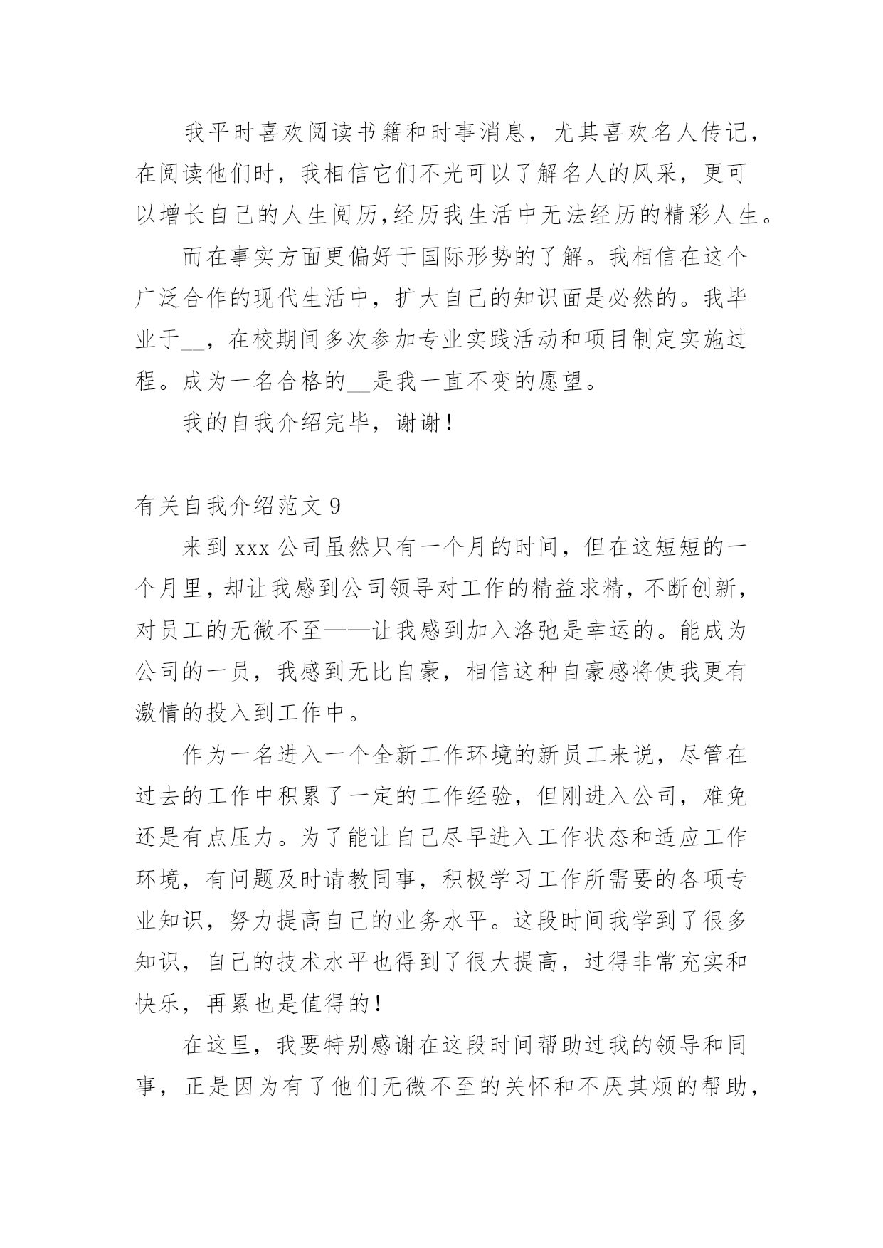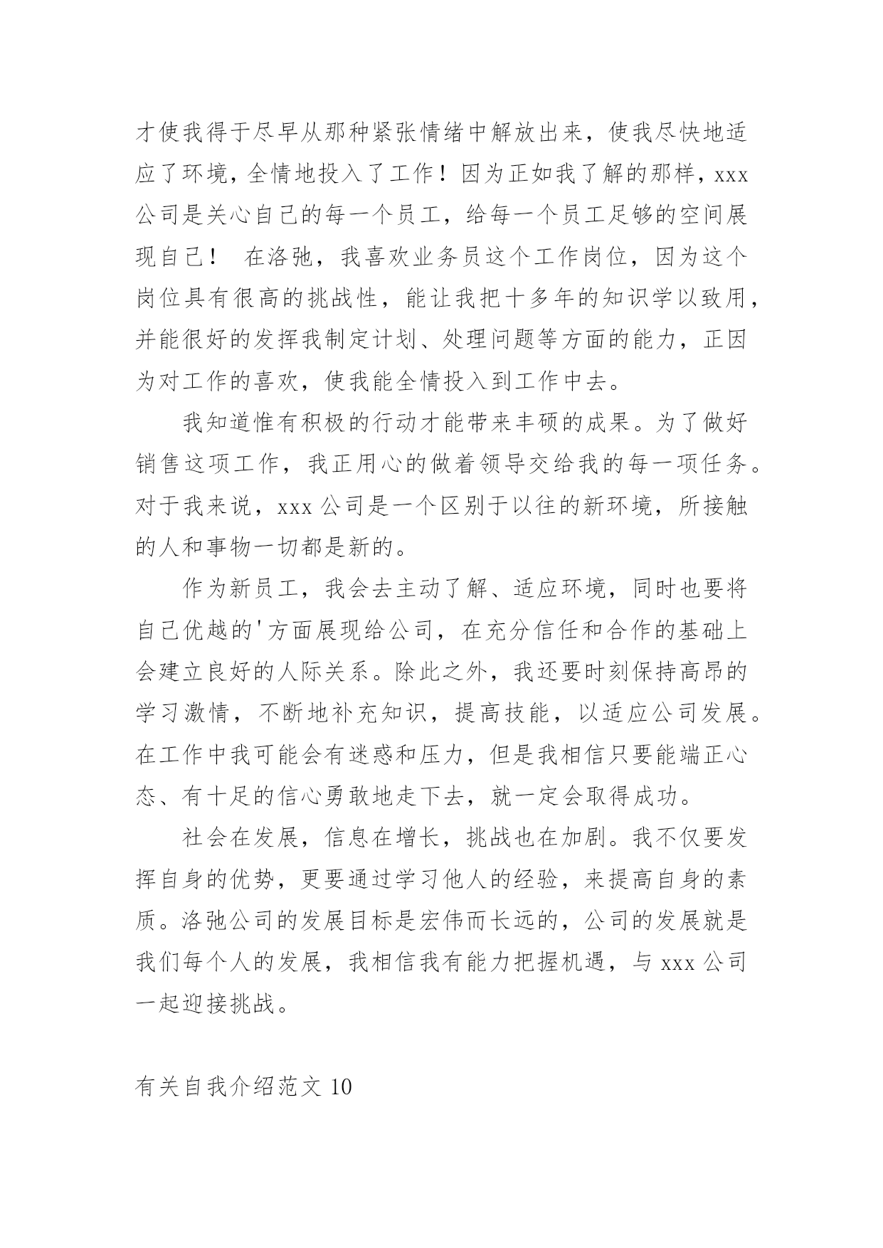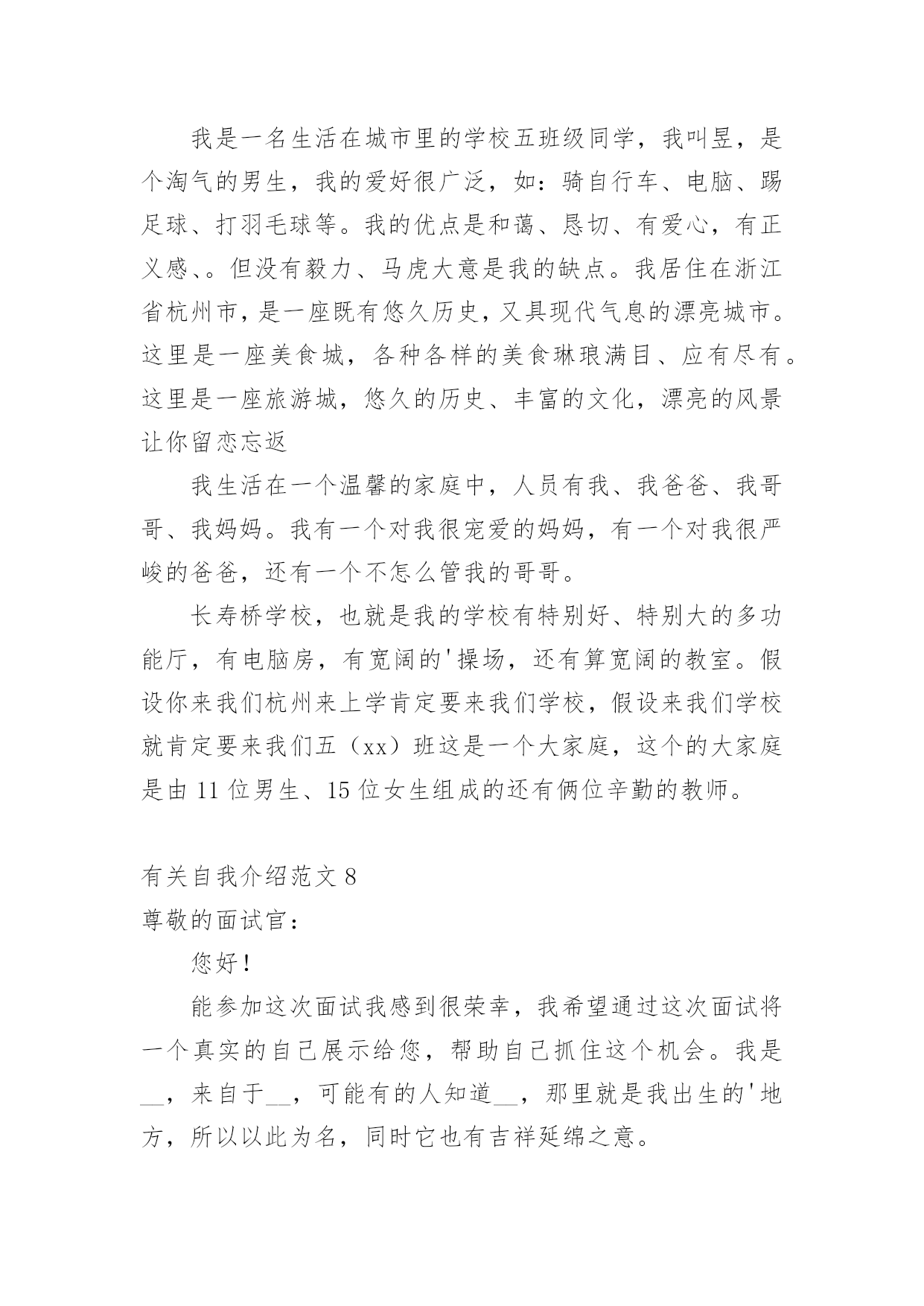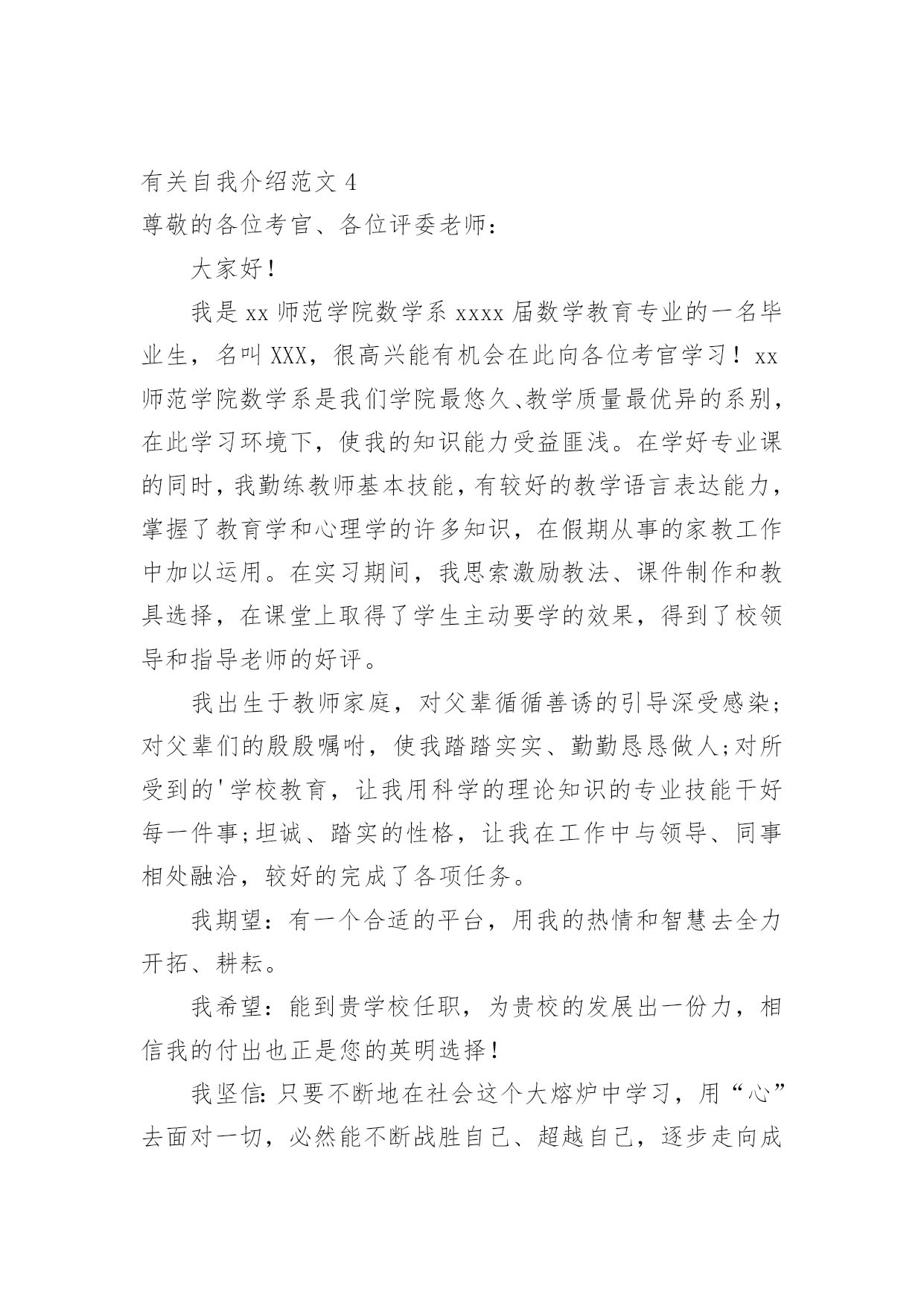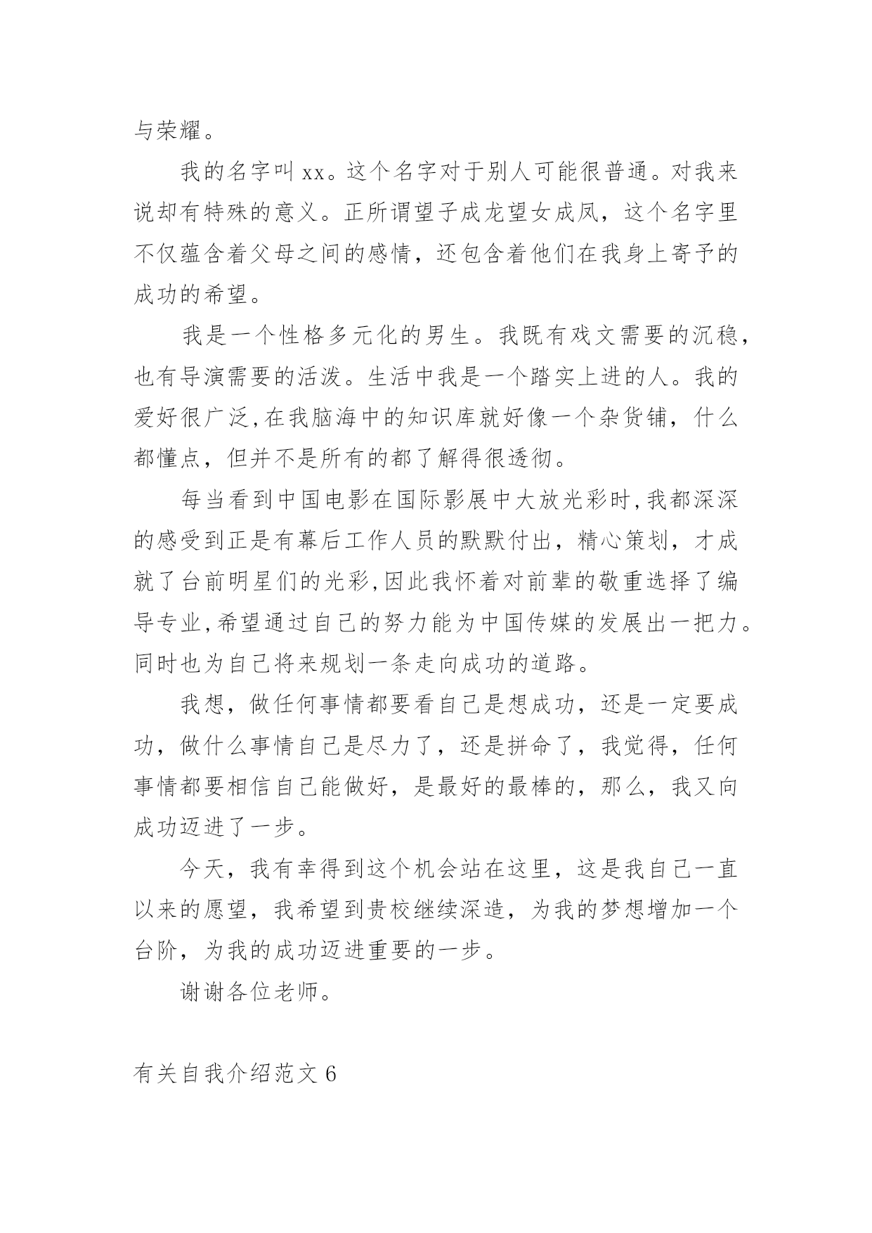 自我介绍有关自我介绍范文当来到一个新环境时,时常需要用到自我介绍,自我介绍是人与人进行沟通的出发点。你所见过的自我介绍是什么样的呢?下面是小编整理的有关自我介绍范文,希望对大家有所帮助。有关自我介绍范文1各位考官好:您好!通过考试,今天,我以本岗位笔试第的成绩进入了面试。对我来说,这次工作机会显得尤为珍贵。我叫xx,今年x岁。xx年7月我从学院系毕业。由于原因,使我与“太阳底下最光辉的职业”失之交臂。幸好,当时,经人介绍,我在单位有了的工作经历。回想起那段时光真是既甜蜜又美好,虽然工资很低,但听着别人对我工作的赞美,看着那一双双充满信任的眼睛,我心里充满报幸福与甜蜜。我原想,即使不能转正,只要单位需要,就是当一辈子临时工我也心甘情愿。今天,我想通过此次考试重新走上工作岗位的愿望是那样迫切!我家共有三姊妹,两个姐姐在外打工,为了照顾已上了年纪的父母,我一直留在他们身边。我曾开过铺子,先是经营工艺品,后又经营服装。但不论生意做得如何得心应手,当一名银行职员终是我心向往之并愿倾尽毕生心血去追求的事业。我曾多次参加考试,但都由于各种原因而未能实现梦想,但我暗下决心,只要有机会,我就一直考下去,直到理想实现为止。如今的我,历经生活的考验,比起我的竞争对手在年龄上我已不再有优势,但是我比他们更多了一份对工作的责任心、耐心和对单位的诚心,更多了一份成熟和自信。银行职员这个职业是神圣而伟大的,他要求我不仅要有丰富的专业知识,还要有高尚的情操。因此,在书时,我就十分注重自身的全面发展,广泛地培养自己的.兴趣爱好,并学有专长,做到有专业和专长,还能会唱、会说、会讲。在注重知识学习的同时我还注意培养自己高尚的道德情操,自觉遵纪守法,遵守社会公德和职业道德,没有不良嗜好和行为。我想这些都是一名金融工作者应该具备的最起码的素养。假如,我通过了面试,成为众多银行职员队伍中的成员,我将不断努力学习,努力工作,为家乡的教育事业贡献自己的力量,决不辜负银行工作者这一职业。有关自我介绍范文2尊敬的领导:您好:我很荣幸有机会向您呈上我的自荐材料。本人品貌端庄,性格随和,为人诚实正直。在外地从事驾驶职业多年,持有a照,如今已有近10几年的平安驾龄,技术过硬。各种低、中、高档车型均能熟练驾驶,有吃苦耐劳的敬业精神。为了更好的`照顾8旬老母,xx上半年本人回到故里,因受金融风暴的影响,轿车租赁生意不太景气。经过反复考虑欲寻一份开车的工作,具体车型不限,待遇等试用后再定。我真诚地期待着与您共事!随信附上个人简历表,盼面谈。感谢您在百忙之中对我的关注,愿贵单位事业蒸蒸日上,屡创佳绩,祝您的事业百尺竿头,更进一步!申请人:xxx20xx年xx月xx日有关自我介绍范文3亲爱的老师,敬爱的同学们:大家好!我叫XX,今年十岁了,我喜欢表演,喜欢读书,喜欢朗诵。我爱说话,我爱笑,爱跳舞,但是舞姿总是不如别人的好,妈妈总说我像个男孩子,同学们却说我很嗨皮,老师们说我上课爱跑神,注意力不集中,不过考试时却总能给老师带来惊喜,课堂上最经常被点名的人是我,而发考卷时第一个叫到的名字也是我,一年级到四年级我一直是全校第一名。这就是我,只要一见到我,我总是笑,我会热情的和你打招呼,当主持人是我的爱好,也是我的`理想!大家要支持我哦!今天我给大家朗诵一首诗歌,名字叫《我的祖国》。有关自我介绍范文4尊敬的各位考官、各位评委老师:大家好!我是xx师范学院数学系xxxx届数学教育专业的一名毕业生,名叫XXX,很高兴能有机会在此向各位考官学习!xx师范学院数学系是我们学院最悠久、教学质量最优异的系别,在此学习环境下,使我的知识能力受益匪浅。在学好专业课的同时,我勤练教师基本技能,有较好的教学语言表达能力,掌握了教育学和心理学的许多知识,在假期从事的家教工作中加以运用。在实习期间,我思索激励教法、课件制作和教具选择,在课堂上取得了学生主动要学的效果,得到了校领导和指导老师的好评。我出生于教师家庭,对父辈循循善诱的引导深受感染;对父辈们的殷殷嘱咐,使我踏踏实实、勤勤恳恳做人;对所受到的'学校教育,让我用科学的理论知识的专业技能干好每一件事;坦诚、踏实的性格,让我在工作中与领导、同事相处融洽,较好的完成了各项任务。我期望:有一个合适的平台,用我的热情和智慧去全力开拓、耕耘。我希望:能到贵学校任职,为贵校的发展出一份力,相信我的付出也正是您的英明选择!我坚信:只要不断地在社会这个大熔炉中学习,用“心”去面对一切,必然能不断战胜自己、超越自己,逐步走向成功!谢谢大家!有关自我介绍范文5尊敬的各位老师:您好!我的考号是XXXXXXXX。我来自炎黄故里河南XX。中原自古多才俊,在这块人才辈出的热土上,我接受了XX年的优秀教育。我骄傲,因为我终于可以用自己的才华去诠释这块土地的人杰地灵;我期待着,现在是你们,将来是更
