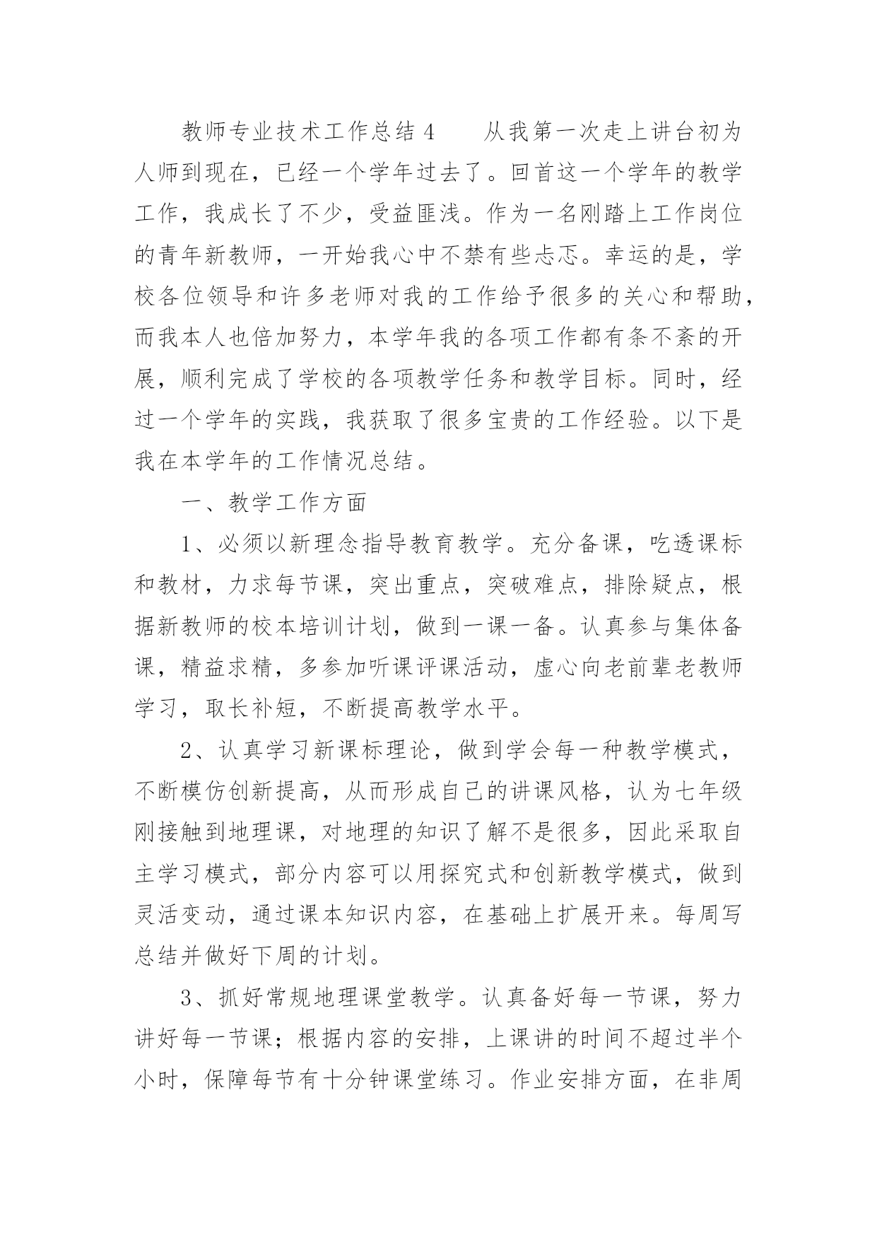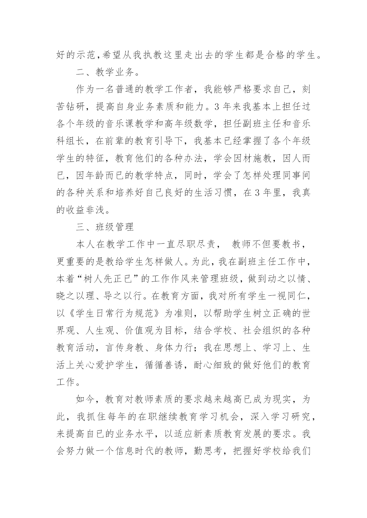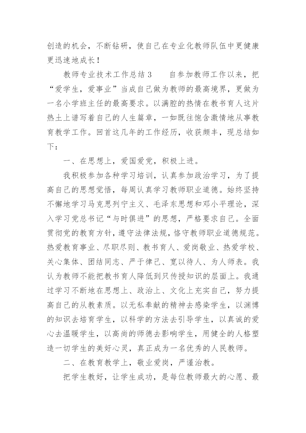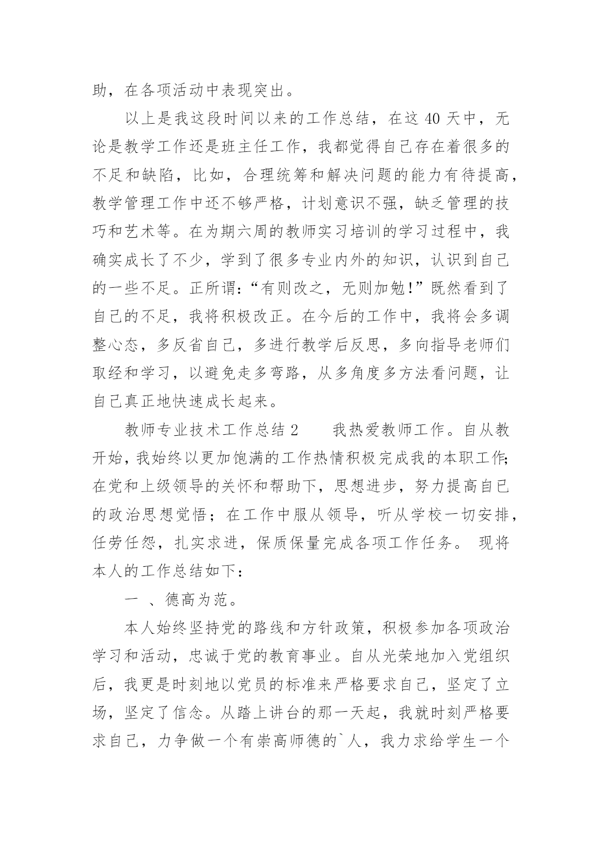 教师专业技术工作总结有关教师专业技术工作总结范文忙碌而又充实的工作已经告一段落了,这段时间里,相信大家面临着许多挑战,也收获了许多成长,该好好写一份工作总结,分析一下过去这段时间的工作了。那么问题来了,工作总结应该怎么写?以下是小编收集整理的有关教师专业技术工作总结范文,供大家参考借鉴,希望可以帮助到有需要的朋友。教师专业技术工作总结1时光如梭,六周的实习期即将结束。在这40多天里,在各位领导和指导老师的人心支持和帮助下,我认真做好教学工作和班主任工作,积极完成学校布置的各项任务,下面我把我的工作做一个简要的汇报总结。一、师德表现在这实习期间,我在思想上严以律己,热爱教育和我的学生。在工作中更是时时刻刻严格要求自己。积极参加学校的各种活动,努力提高自身的综合素质能力。服从学校的工作安排,配合领导做好内外的各项工作。二、教育教学情况在教学工作中,我注意做到:1、深入细致的备好每一节课。在备课前,主动向指导老师悉心请教教学意见。在备课中,我认真研究教材,力求准确把握重点,难点,并注重参阅各种资料,制定符合学校认识规律的`教学方法及教学形式。注意弱化难点强调重点。教案编写认真,并不断归纳总结提高教学水平。2、认真上好每一节课。上课时注重学生主动性的发挥,发散学生的思维,注重综合能力有一时的培养学生思维的严谨性及逻辑性,在教学中提高学生的思维素质,并保证每一节课的质量。3、认真及时批改作业,注意听取学生的意见,及时了解学生的学习情况,并有目的的对学生进行辅导。4、坚持听课,注意知道老师们的教学经验和同组同学的教学长处,努力探索适合自己的教学模式,并坚持每周听课三节课一上,对自己的教学促进很大。不仅如此,还抓住每次的学习机会,取长补短,收获不少。5、注重教育理论的学习,并注意把一些现金的理论应用于课堂,做到学有所用。6、扎实自己的基本功。通过向老师和同学的学习,切实提高自己的知识能力。三、班主任工作情况学校领导出于对我们的磨练与培养,让我担任班主任的工作,六周的工作让我认识到作为一名班主任的重要性。班主任除了要维持好正常的教学秩序,保证同学良好的学习环境外,更应该关注每一个学生的思想状况,全面了解学生情况,无论是学习上的还是生活上。我平时非常注重于学生的交流,通过与学生谈心,与家长的联系等方式,排除学生思想上的顾虑,解决他们的实际困难,以有利于他们的学习和生活。现在班级情况相对稳定,学习气氛浓厚,同学互帮互助,在各项活动中表现突出。以上是我这段时间以来的工作总结,在这40天中,无论是教学工作还是班主任工作,我都觉得自己存在着很多的不足和缺陷,比如,合理统筹和解决问题的能力有待提高,教学管理工作中还不够严格,计划意识不强,缺乏管理的技巧和艺术等。在为期六周的教师实习培训的学习过程中,我确实成长了不少,学到了很多专业内外的知识,认识到自己的一些不足。正所谓:“有则改之,无则加勉!”既然看到了自己的不足,我将积极改正。在今后的工作中,我将会多调整心态,多反省自己,多进行教学后反思,多向指导老师们取经和学习,以避免走多弯路,从多角度多方法看问题,让自己真正地快速成长起来。教师专业技术工作总结2我热爱教师工作。自从教开始,我始终以更加饱满的工作热情积极完成我的本职工作;在党和上级领导的关怀和帮助下,思想进步,努力提高自已的政治思想觉悟;在工作中服从领导,听从学校一切安排,任劳任怨,扎实求进,保质保量完成各项工作任务。现将本人的工作总结如下:一、德高为范。本人始终坚持党的路线和方针政策,积极参加各项政治学习和活动,忠诚于党的教育事业。自从光荣地加入党组织后,我更是时刻地以党员的标准来严格要求自己,坚定了立场,坚定了信念。从踏上讲台的那一天起,我就时刻严格要求自己,力争做一个有崇高师德的`人,我力求给学生一个好的示范,希望从我执教这里走出去的学生都是合格的学生。二、教学业务。作为一名普通的教学工作者,我能够严格要求自己,刻苦钻研,提高自身业务素质和能力。3年来我基本上担任过各个年级的音乐课教学和高年级数学,担任副班主任和音乐科组长,在前辈的教育引导下,我基本已经掌握了各个年级学生的特征,教育他们的各种办法,学会因材施教,因人而已,因年龄而已的教学特点,同时,学会了怎样处理同事间的各种关系和培养好自己良好的生活习惯,在3年里,我真的收益非浅。三、班级管理本人在教学工作中一直尽职尽责,教师不但要教书,更重要的是教给学生怎样做人。为此,我在副班主任工作中,本着“树人先正已”的工作作风来管理班级,做到动之以情、晓之以理、导之以行。在教育方面,我对所有学生一视同仁,以《学生日常行为规范》为准则,以帮助学生树立正确的世界观、人生观、价值观为目标,结合学校、社会组织的各种教育活动,言传身教、身体力行;我在思想上、学习上、生活上关心爱护学生,循循善诱,耐心细致的