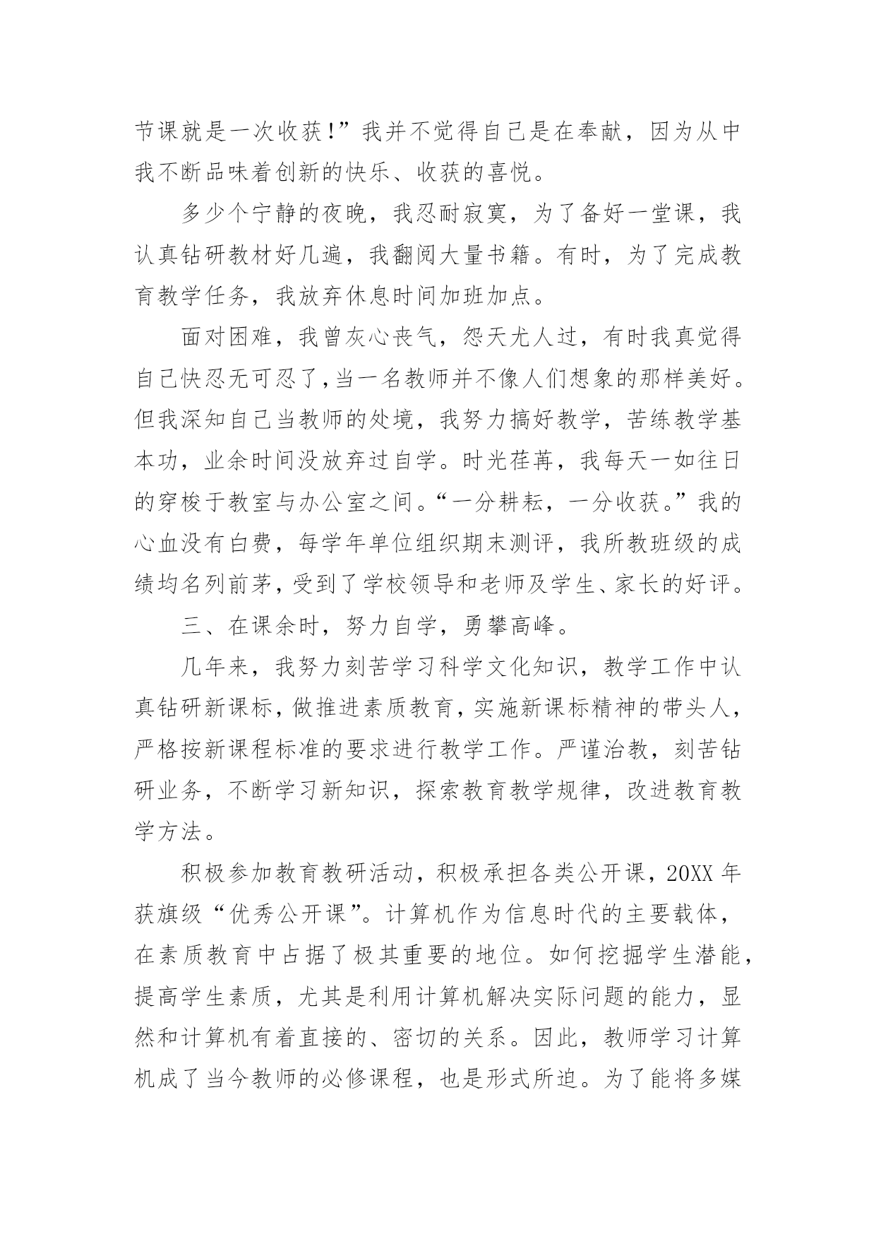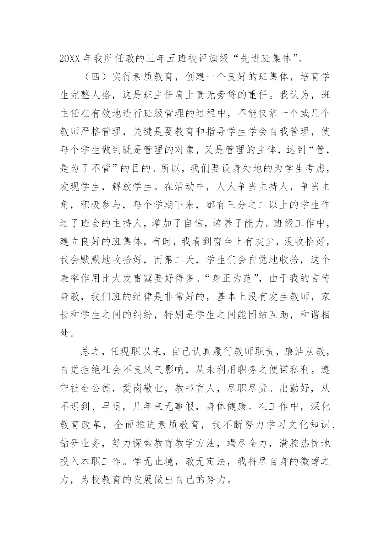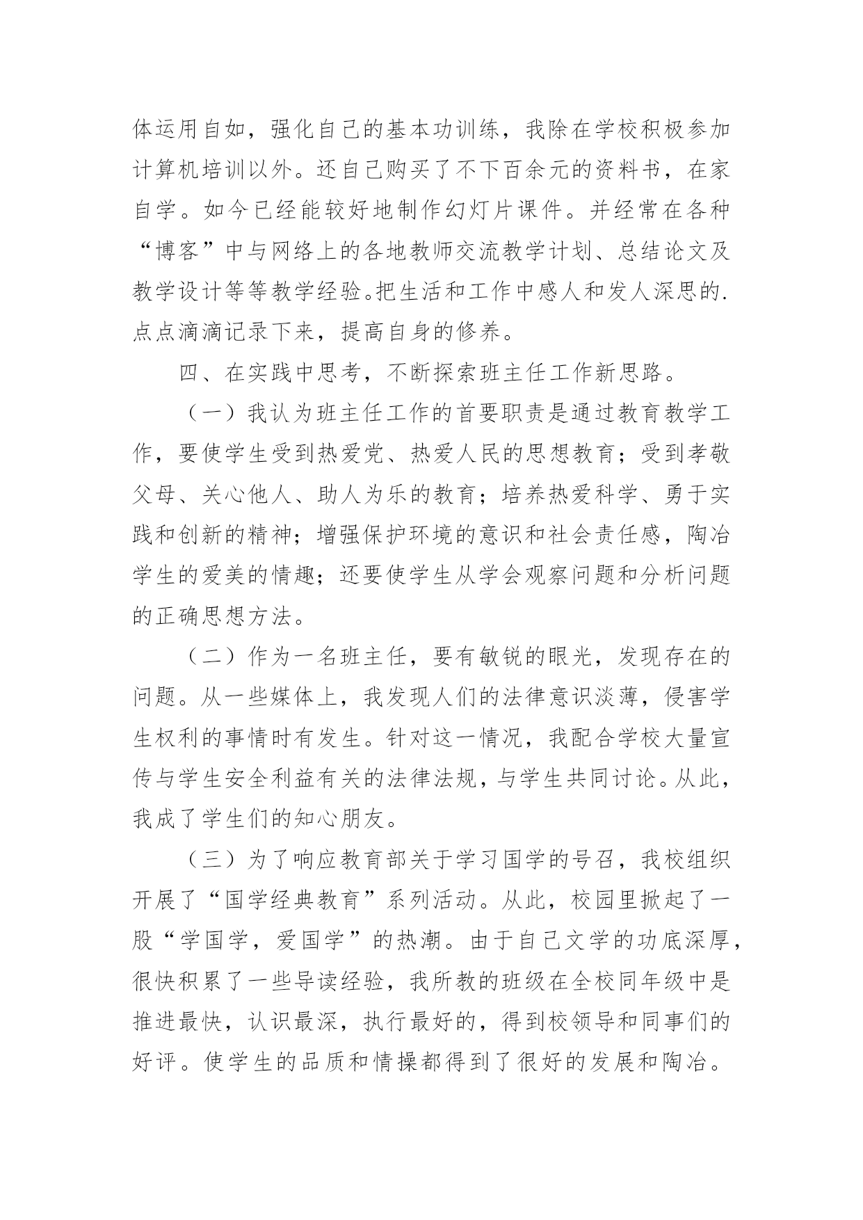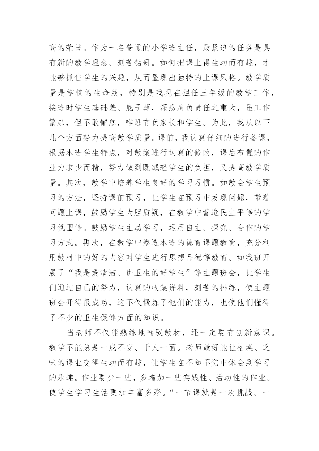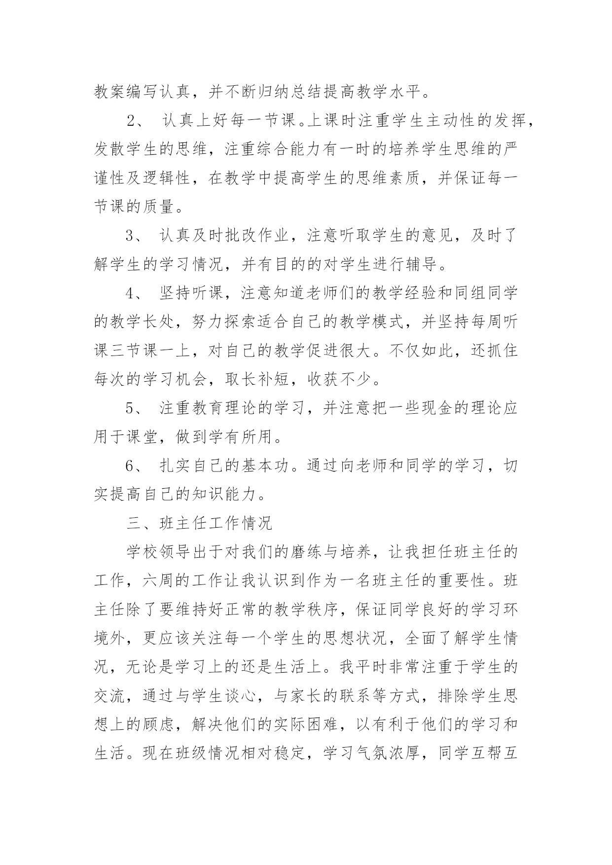 教师专业技术工作总结有关教师专业技术工作总结范文忙碌而又充实的工作已经告一段落了,这段时间里,相信大家面临着许多挑战,也收获了许多成长,该好好写一份工作总结,分析一下过去这段时间的工作了。那么问题来了,工作总结应该怎么写?以下是小编收集整理的有关教师专业技术工作总结范文,供大家参考借鉴,希望可以帮助到有需要的朋友。教师专业技术工作总结1时光如梭,六周的实习期即将结束。在这40多天里,在各位领导和指导老师的人心支持和帮助下,我认真做好教学工作和班主任工作,积极完成学校布置的各项任务,下面我把我的工作做一个简要的汇报总结。一、师德表现在这实习期间,我在思想上严以律己,热爱教育和我的学生。在工作中更是时时刻刻严格要求自己。积极参加学校的各种活动,努力提高自身的综合素质能力。服从学校的工作安排,配合领导做好内外的各项工作。二、教育教学情况在教学工作中,我注意做到:1、深入细致的备好每一节课。在备课前,主动向指导老师悉心请教教学意见。在备课中,我认真研究教材,力求准确把握重点,难点,并注重参阅各种资料,制定符合学校认识规律的`教学方法及教学形式。注意弱化难点强调重点。教案编写认真,并不断归纳总结提高教学水平。2、认真上好每一节课。上课时注重学生主动性的发挥,发散学生的思维,注重综合能力有一时的培养学生思维的严谨性及逻辑性,在教学中提高学生的思维素质,并保证每一节课的质量。3、认真及时批改作业,注意听取学生的意见,及时了解学生的学习情况,并有目的的对学生进行辅导。4、坚持听课,注意知道老师们的教学经验和同组同学的教学长处,努力探索适合自己的教学模式,并坚持每周听课三节课一上,对自己的教学促进很大。不仅如此,还抓住每次的学习机会,取长补短,收获不少。5、注重教育理论的学习,并注意把一些现金的理论应用于课堂,做到学有所用。6、扎实自己的基本功。通过向老师和同学的学习,切实提高自己的知识能力。三、班主任工作情况学校领导出于对我们的磨练与培养,让我担任班主任的工作,六周的工作让我认识到作为一名班主任的重要性。班主任除了要维持好正常的教学秩序,保证同学良好的学习环境外,更应该关注每一个学生的思想状况,全面了解学生情况,无论是学习上的还是生活上。我平时非常注重于学生的交流,通过与学生谈心,与家长的联系等方式,排除学生思想上的顾虑,解决他们的实际困难,以有利于他们的学习和生活。现在班级情况相对稳定,学习气氛浓厚,同学互帮互助,在各项活动中表现突出。以上是我这段时间以来的工作总结,在这40天中,无论是教学工作还是班主任工作,我都觉得自己存在着很多的不足和缺陷,比如,合理统筹和解决问题的能力有待提高,教学管理工作中还不够严格,计划意识不强,缺乏管理的技巧和艺术等。在为期六周的教师实习培训的学习过程中,我确实成长了不少,学到了很多专业内外的知识,认识到自己的一些不足。正所谓:“有则改之,无则加勉!”既然看到了自己的不足,我将积极改正。在今后的工作中,我将会多调整心态,多反省自己,多进行教学后反思,多向指导老师们取经和学习,以避免走多弯路,从多角度多方法看问题,让自己真正地快速成长起来。教师专业技术工作总结2我热爱教师工作。自从教开始,我始终以更加饱满的工作热情积极完成我的本职工作;在党和上级领导的关怀和帮助下,思想进步,努力提高自已的政治思想觉悟;在工作中服从领导,听从学校一切安排,任劳任怨,扎实求进,保质保量完成各项工作任务。现将本人的工作总结如下:一、德高为范。本人始终坚持党的路线和方针政策,积极参加各项政治学习和活动,忠诚于党的教育事业。自从光荣地加入党组织后,我更是时刻地以党员的标准来严格要求自己,坚定了立场,坚定了信念。从踏上讲台的那一天起,我就时刻严格要求自己,力争做一个有崇高师德的`人,我力求给学生一个好的示范,希望从我执教这里走出去的学生都是合格的学生。二、教学业务。作为一名普通的教学工作者,我能够严格要求自己,刻苦钻研,提高自身业务素质和能力。3年来我基本上担任过各个年级的音乐课教学和高年级数学,担任副班主任和音乐科组长,在前辈的教育引导下,我基本已经掌握了各个年级学生的特征,教育他们的各种办法,学会因材施教,因人而已,因年龄而已的教学特点,同时,学会了怎样处理同事间的各种关系和培养好自己良好的生活习惯,在3年里,我真的收益非浅。三、班级管理本人在教学工作中一直尽职尽责,教师不但要教书,更重要的是教给学生怎样做人。为此,我在副班主任工作中,本着“树人先正已”的工作作风来管理班级,做到动之以情、晓之以理、导之以行。在教育方面,我对所有学生一视同仁,以《学生日常行为规范》为准则,以帮助学生树立正确的世界观、人生观、价值观为目标,结合学校、社会组织的各种教育活动,言传身教、身体力行;我在思想上、学习上、生活上关心爱护学生,循循善诱,耐心细致的