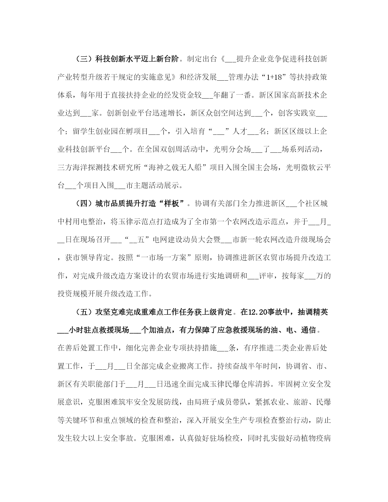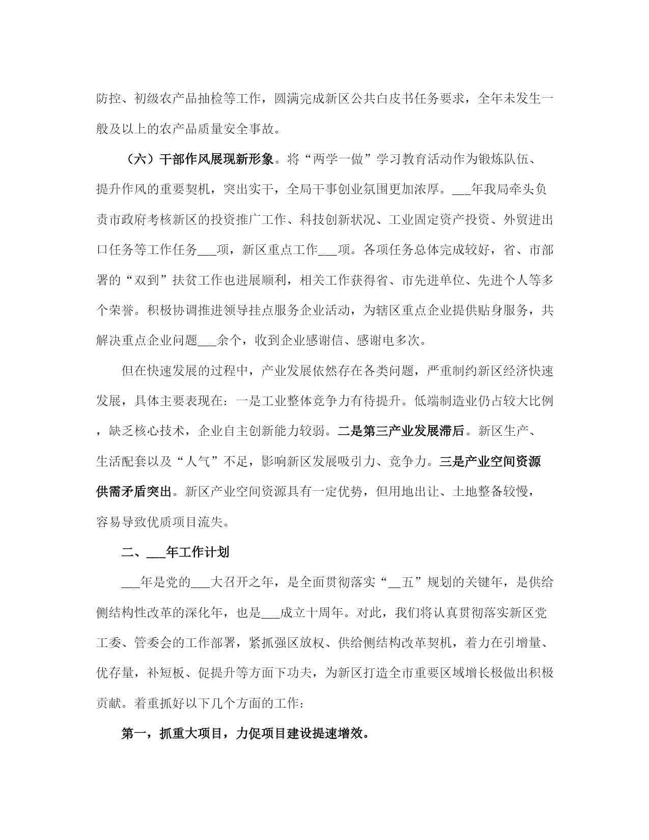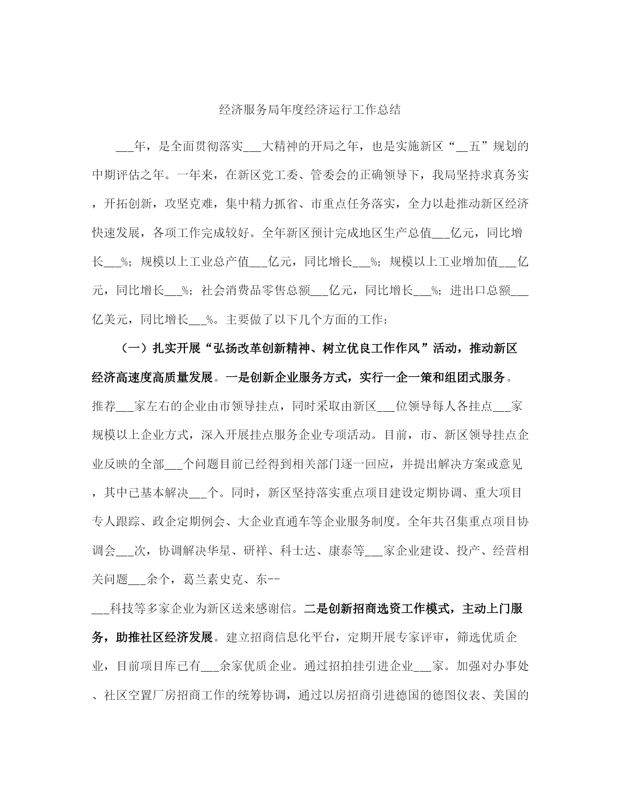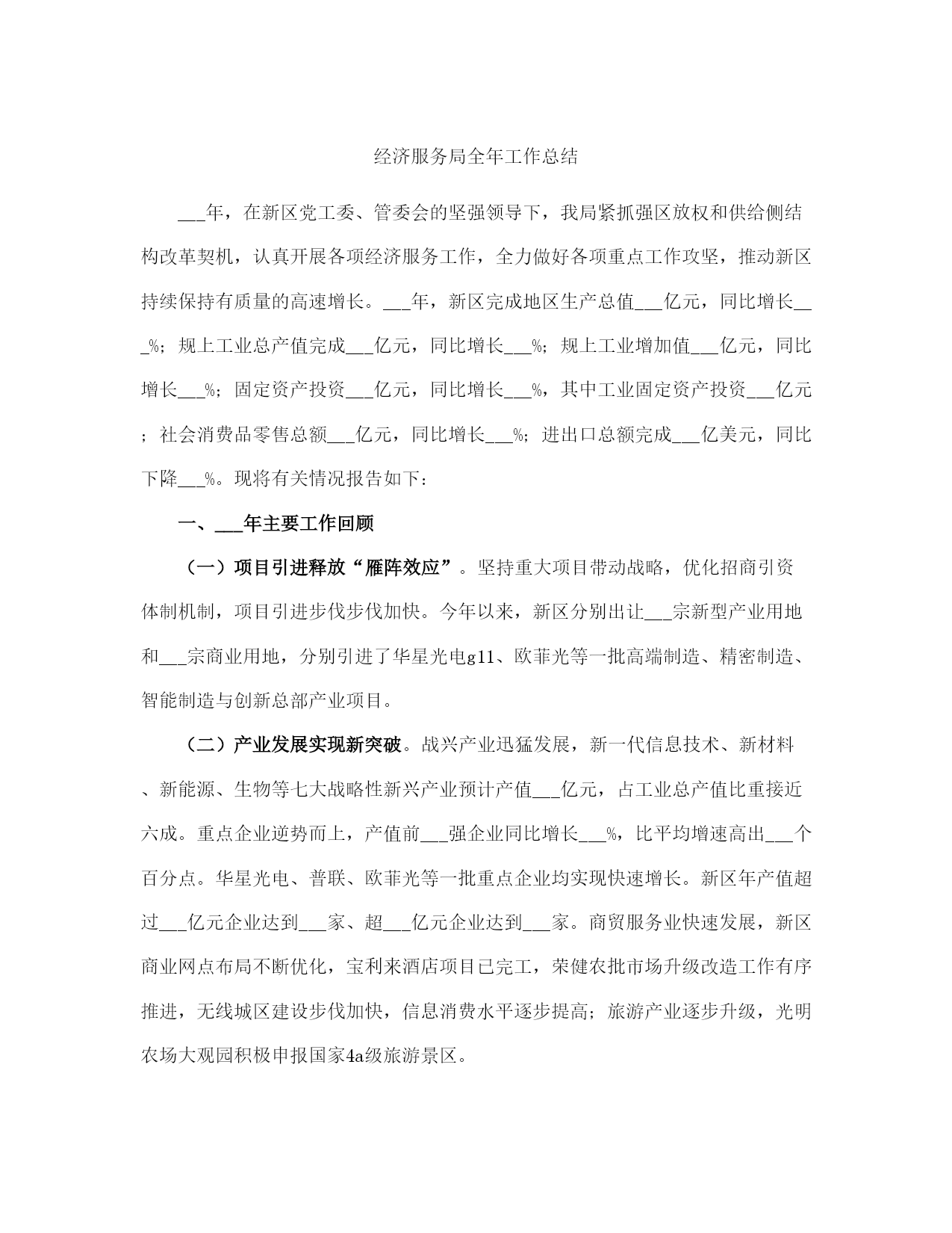 经济服务局全年工作总结(完整版)文档资料可直接使用,可编辑,欢迎下载经济服务局全年工作总结___年,在新区党工委、管委会的坚强领导下,我局紧抓强区放权和供给侧结构改革契机,认真开展各项经济服务工作,全力做好各项重点工作攻坚,推动新区持续保持有质量的高速增长。___年,新区完成地区生产总值___亿元,同比增长___%;规上工业总产值完成___亿元,同比增长___%;规上工业增加值___亿元,同比增长___%;固定资产投资___亿元,同比增长___%,其中工业固定资产投资___亿元;社会消费品零售总额___亿元,同比增长___%;进出口总额完成___亿美元,同比下降___%。现将有关情况报告如下:一、___年主要工作回顾(一)项目引进释放“雁阵效应”。坚持重大项目带动战略,优化招商引资体制机制,项目引进步伐步伐加快。今年以来,新区分别出让___宗新型产业用地和___宗商业用地,分别引进了华星光电g11、欧菲光等一批高端制造、精密制造、智能制造与创新总部产业项目。(二)产业发展实现新突破。战兴产业迅猛发展,新一代信息技术、新材料、新能源、生物等七大战略性新兴产业预计产值___亿元,占工业总产值比重接近六成。重点企业逆势而上,产值前___强企业同比增长___%,比平均增速高出___个百分点。华星光电、普联、欧菲光等一批重点企业均实现快速增长。新区年产值超过___亿元企业达到___家、超___亿元企业达到___家。商贸服务业快速发展,新区商业网点布局不断优化,宝利来酒店项目已完工,荣健农批市场升级改造工作有序推进,无线城区建设步伐加快,信息消费水平逐步提高;旅游产业逐步升级,光明农场大观园积极申报国家4a级旅游景区。(三)科技创新水平迈上新台阶。制定出台《___提升企业竞争促进科技创新产业转型升级若干规定的实施意见》和经济发展___管理办法“1+18”等扶持政策体系,每年用于直接扶持企业的经发资金较___年翻了一番。新区国家高新技术企业达到___家。创新创业平台迅速增长,新区众创空间达到___个,创客实践室___个;留学生创业园在孵项目___个,引入培育“___”人才___名;新区区级以上企业科技创新平台___个。在全国双创周活动中,光明分会场___了___场系列活动,三方海洋探测技术研究所“海神之戟无人船”项目入围全国主会场,光明微软云平台___个项目入围___市主题活动展示。(四)城市品质提升打造“样板”。协调有关部门全力推进新区___个社区城中村用电整治,将玉律示范点打造成为了全市第一个农网改造示范点,并于___月___日在现场召开___“__五”电网建设动员大会暨___市新一轮农网改造升级现场会,获市领导肯定。按照“一市场一方案”原则,协调推进新区农贸市场提升改造工作,对完成升级改造方案设计的农贸市场进行实地调研和___评审,按每家___万的投资规模开展升级改造工作。(五)攻坚克难完成重难点工作任务获上级肯定。在12.20事故中,抽调精英___小时驻点救援现场___个加油点,有力保障了应急救援现场的油、电、通信。在善后处置工作中,细化完善企业专项扶持措施___条,有序推进二类企业善后处置工作,于___月___日全部完成企业搬离工作。持续奋战半年时间,协调省、市、新区有关职能部门于___月___日迅速全面完成玉律民爆仓库清拆。牢固树立安全发展意识,克服困难筑牢安全发展防线,由局班子成员带队,紧抓农业、旅游、民爆等关键环节和重点领域的检查和整治,深入开展安全生产专项检查整治行动,防止发生较大以上安全事故。克服困难,认真做好驻场检疫,同时扎实做好动植物疫病防控、初级农产品抽检等工作,圆满完成新区公共白皮书任务要求,全年未发生一般及以上的农产品质量安全事故。(六)干部作风展现新形象。将“两学一做”学习教育活动作为锻炼队伍、提升作风的重要契机,突出实干,全局干事创业氛围更加浓厚。___年我局牵头负责市政府考核新区的投资推广工作、科技创新状况、工业固定资产投资、外贸进出口任务等工作任务___项,新区重点工作___项。各项任务总体完成较好,省、市部署的“双到”扶贫工作也进展顺利,相关工作获得省、市先进单位、先进个人等多个荣誉。积极协调推进领导挂点服务企业活动,为辖区重点企业提供贴身服务,共解决重点企业问题___余个,收到企业感谢信、感谢电多次。但在快速发展的过程中,产业发展依然存在各类问题,严重制约新区经济快速发展,具体主要表现在:一是工业整体竞争力有待提升。低端制造业仍占较大比例,缺乏核心技术,企业自主创新能力较弱。二是第三产业发展滞后。新区生产、生活配套以及“人气”不足,影响新区发展吸引力、竞争力。三是产业空间资源供需矛盾突出。新区产业空间资源具有一定优势,但用地出让、土地整备较慢,容易导致优质项目流失。二、___