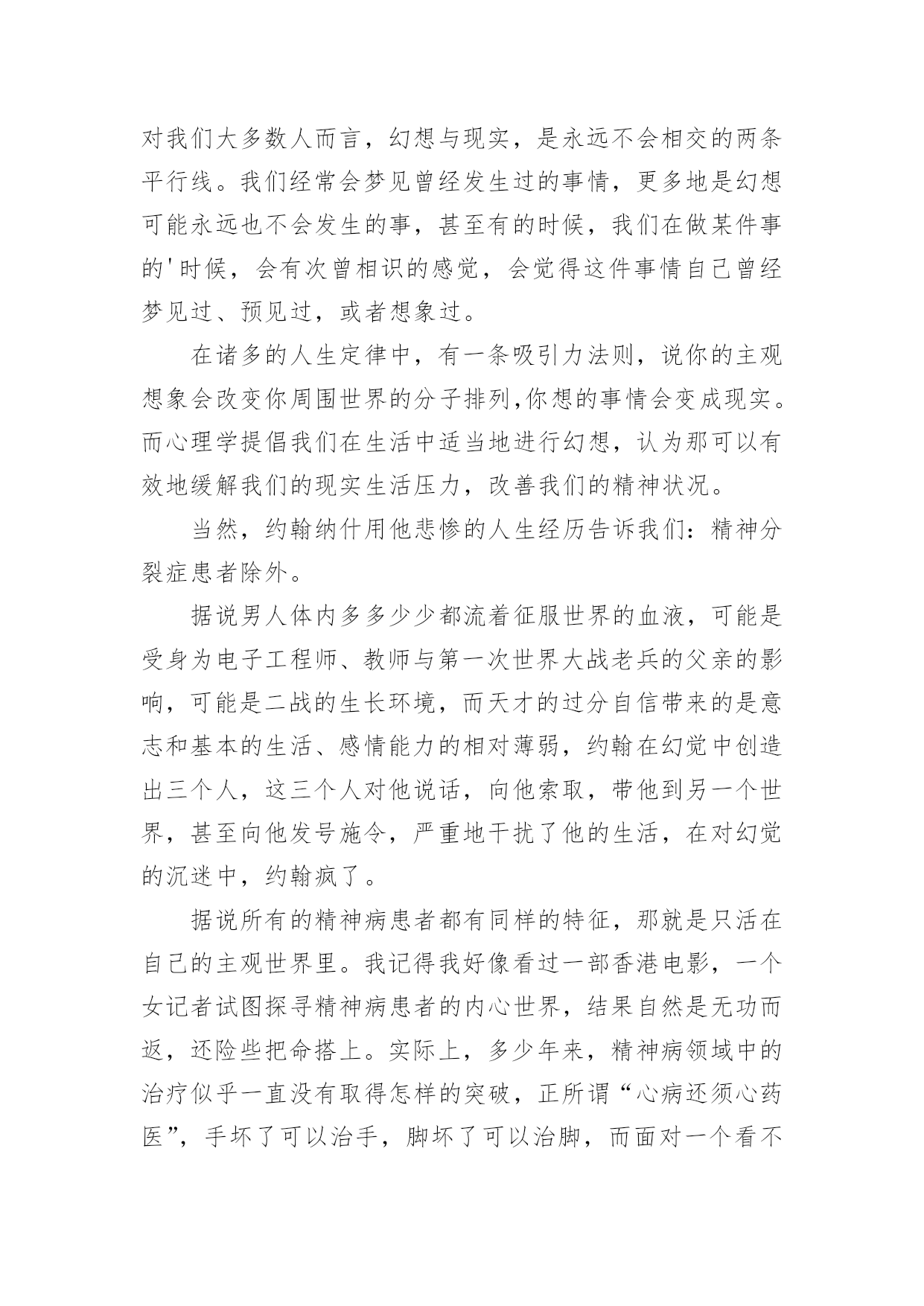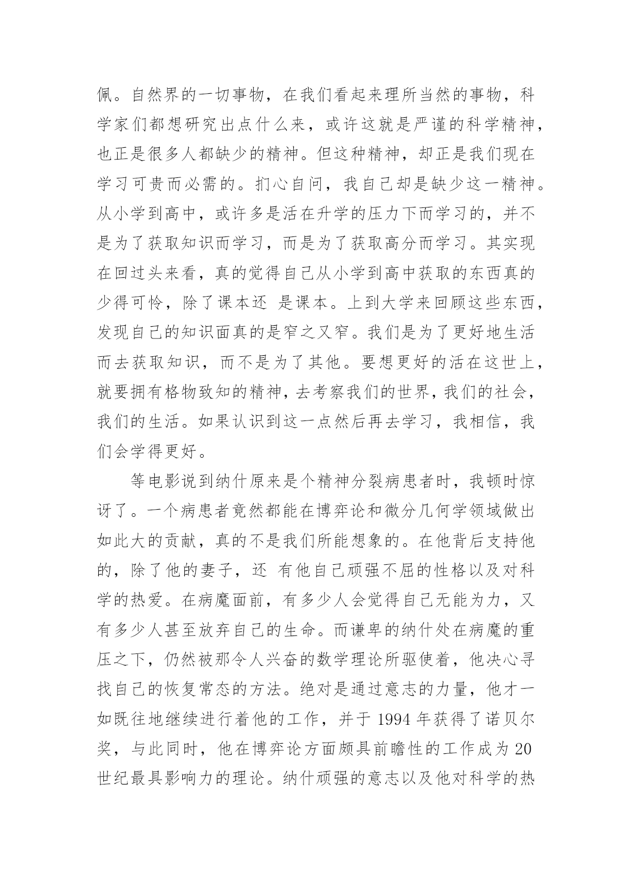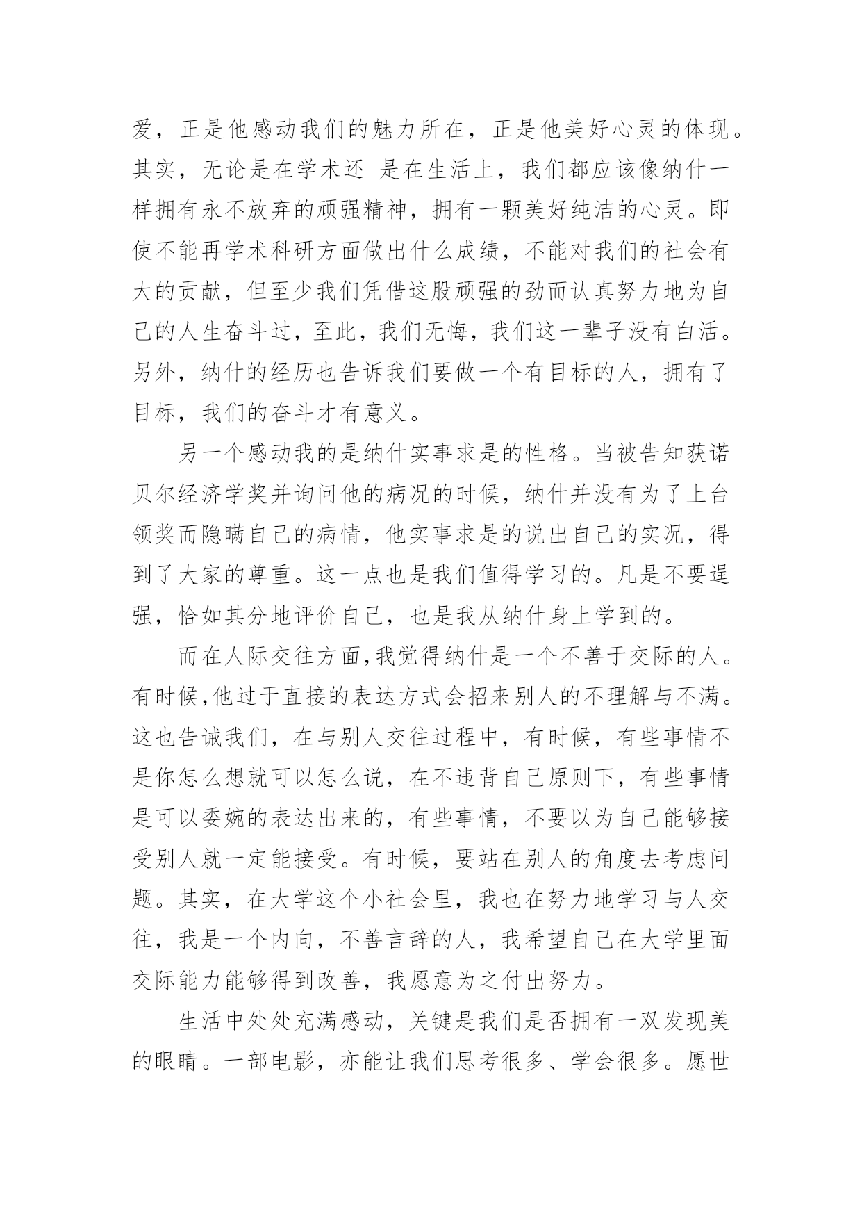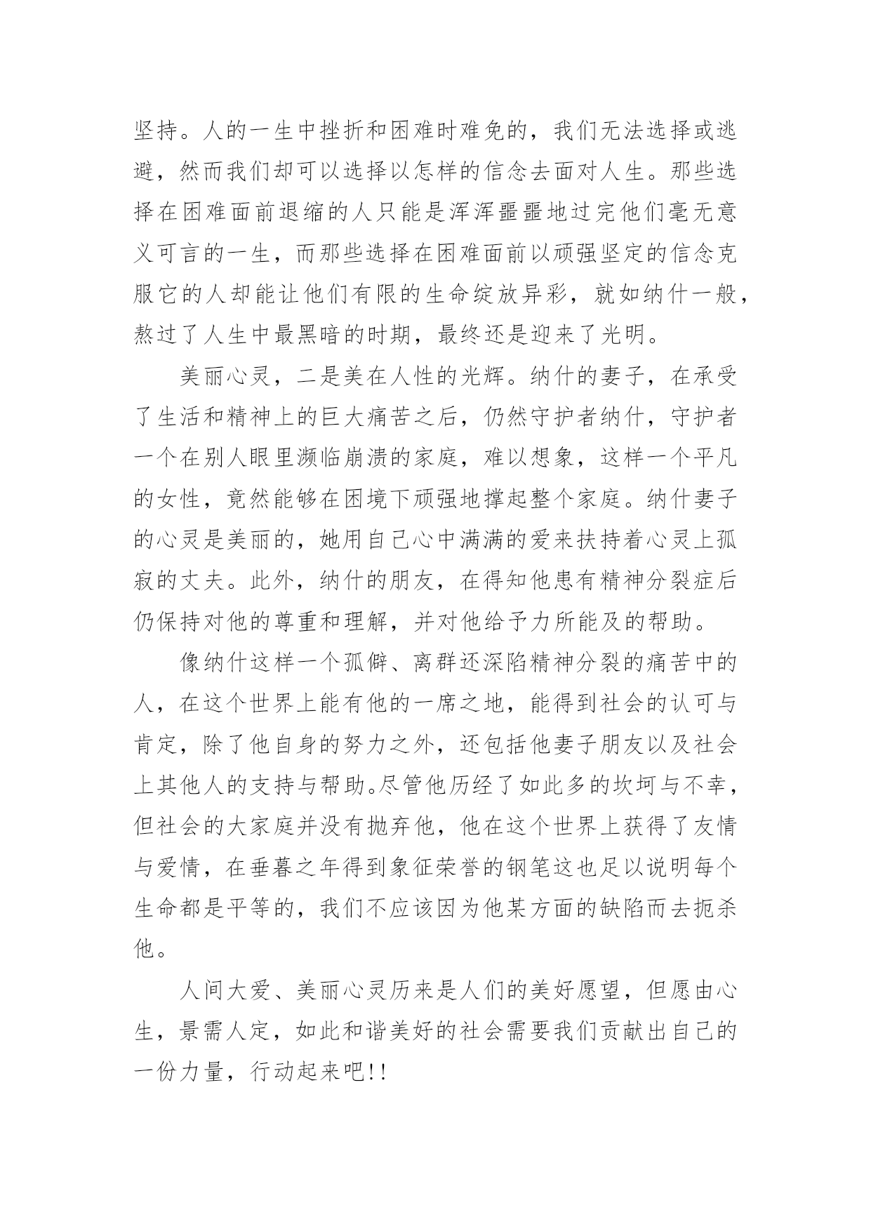 电影美丽心灵的观后感当品味完一部作品后,相信大家有很多值得分享的东西吧,观后感就是自己的一种思想感悟,观后感相当注重“感”,也就是从作品中领悟出的道理与思想。那么观后感到底应该怎么写呢?以下是小编帮大家整理的电影美丽心灵的观后感,欢迎大家分享。电影美丽心灵的观后感1在上形势与政策课的时候,老师给我们放了一电影――《美丽心灵》。那是第一次看,并没有思考这电影为什么叫《美丽心灵》;也没有仔细思考电影中的人物如何。只觉得其中的主人公是一个对学术的态度近似疯狂,但不善于与人交往的人,仅此而已。我第一次看这部片子纯粹也是娱乐性质的。回到家后,自己一个人静静地,又看了一遍。而后发现,这次再看却有不一样的收获,不一样的感受。我从这部片子中,得到了一定的启发,它激励着我去思考自己的人生,自己的目标;思考自己应该成为一个怎样的人,要怎样成为自己心目中的自己。电影的主人公纳什在学术上的近似疯狂真的让我佩服。电影一开始,并没有说纳什患有精神分裂症。那时我看到他在窗户上写的一条条我看都看不明的算数式子,连鸽子的活动的路径他都想研究出点什么来,我心中真的生出由衷的敬佩。自然界的一切事物,在我们看起来理所当然的事物,科学家们都想研究出点什么来,或许这就是严谨的科学精神,也正是很多人都缺少的精神。但这种精神,却正是我们现在学习可贵而必需的。扪心自问,我自己却是缺少这一精神。从小学到高中,或许多是活在升学的压力下而学习的,并不是为了获取知识而学习,而是为了获取高分而学习。其实现在回过头来看,真的觉得自己从小学到高中获取的东西真的少得可怜,除了课本还是课本。上到大学来回顾这些东西,发现自己的知识面真的是窄之又窄。我们是为了更好地生活而去获取知识,而不是为了其他。要想更好的活在这世上,就要拥有格物致知的精神,去考察我们的世界,我们的社会,我们的生活。如果认识到这一点然后再去学习,我相信,我们会学得更好。等电影说到纳什原来是个精神分裂病患者时,我顿时惊讶了。一个病患者竟然都能在博弈论和微分几何学领域做出如此大的贡献,真的不是我们所能想象的。在他背后支持他的,除了他的妻子,还有他自己顽强不屈的性格以及对科学的热爱。在病魔面前,有多少人会觉得自己无能为力,又有多少人甚至放弃自己的生命。而谦卑的纳什处在病魔的重压之下,仍然被那令人兴奋的数学理论所驱使着,他决心寻找自己的恢复常态的方法。绝对是通过意志的力量,他才一如既往地继续进行着他的工作,并于1994年获得了诺贝尔奖,与此同时,他在博弈论方面颇具前瞻性的工作成为20世纪最具影响力的理论。纳什顽强的意志以及他对科学的热爱,正是他感动我们的魅力所在,正是他美好心灵的体现。其实,无论是在学术还是在生活上,我们都应该像纳什一样拥有永不放弃的顽强精神,拥有一颗美好纯洁的心灵。即使不能再学术科研方面做出什么成绩,不能对我们的社会有大的贡献,但至少我们凭借这股顽强的劲而认真努力地为自己的人生奋斗过,至此,我们无悔,我们这一辈子没有白活。另外,纳什的经历也告诉我们要做一个有目标的人,拥有了目标,我们的奋斗才有意义。另一个感动我的是纳什实事求是的性格。当被告知获诺贝尔经济学奖并询问他的病况的时候,纳什并没有为了上台领奖而隐瞒自己的病情,他实事求是的说出自己的实况,得到了大家的尊重。这一点也是我们值得学习的。凡是不要逞强,恰如其分地评价自己,也是我从纳什身上学到的。而在人际交往方面,我觉得纳什是一个不善于交际的人。有时候,他过于直接的表达方式会招来别人的不理解与不满。这也告诫我们,在与别人交往过程中,有时候,有些事情不是你怎么想就可以怎么说,在不违背自己原则下,有些事情是可以委婉的表达出来的,有些事情,不要以为自己能够接受别人就一定能接受。有时候,要站在别人的角度去考虑问题。其实,在大学这个小社会里,我也在努力地学习与人交往,我是一个内向,不善言辞的人,我希望自己在大学里面交际能力能够得到改善,我愿意为之付出努力。生活中处处充满感动,关键是我们是否拥有一双发现美的眼睛。一部电影,亦能让我们思考很多、学会很多。愿世上每一个人都拥有一颗美丽的心灵,去找寻自己生命的轨迹,并为之奋斗。电影《美丽心灵》观后感在电影《美丽心灵》里,当约翰面临第二次回到精神病院的选择时,在约翰以为只有一个人留下来面对时,他的太太走进来和他沟通时,对他说:说不定能让你从梦中清醒的东西,并不在你的脑里,而是在心里。我也在定论女人的成长,力量,与社会交往的能力等等,都在心里。不是勾心斗角的心机。而是身心的合一,是我的一位老师说的感觉,一种被爱的感觉,内在也充满爱,有能力爱别人的“心”。另外一个就是“灵”,这个世界有太多的事情是无法用科学解释的。不是“信”什么,而是事实。当我们臣服宇宙空间能量时,我们是安全的。当我们认同我们的父母与祖先时,我们是喜悦的,轻松的。《美丽心灵