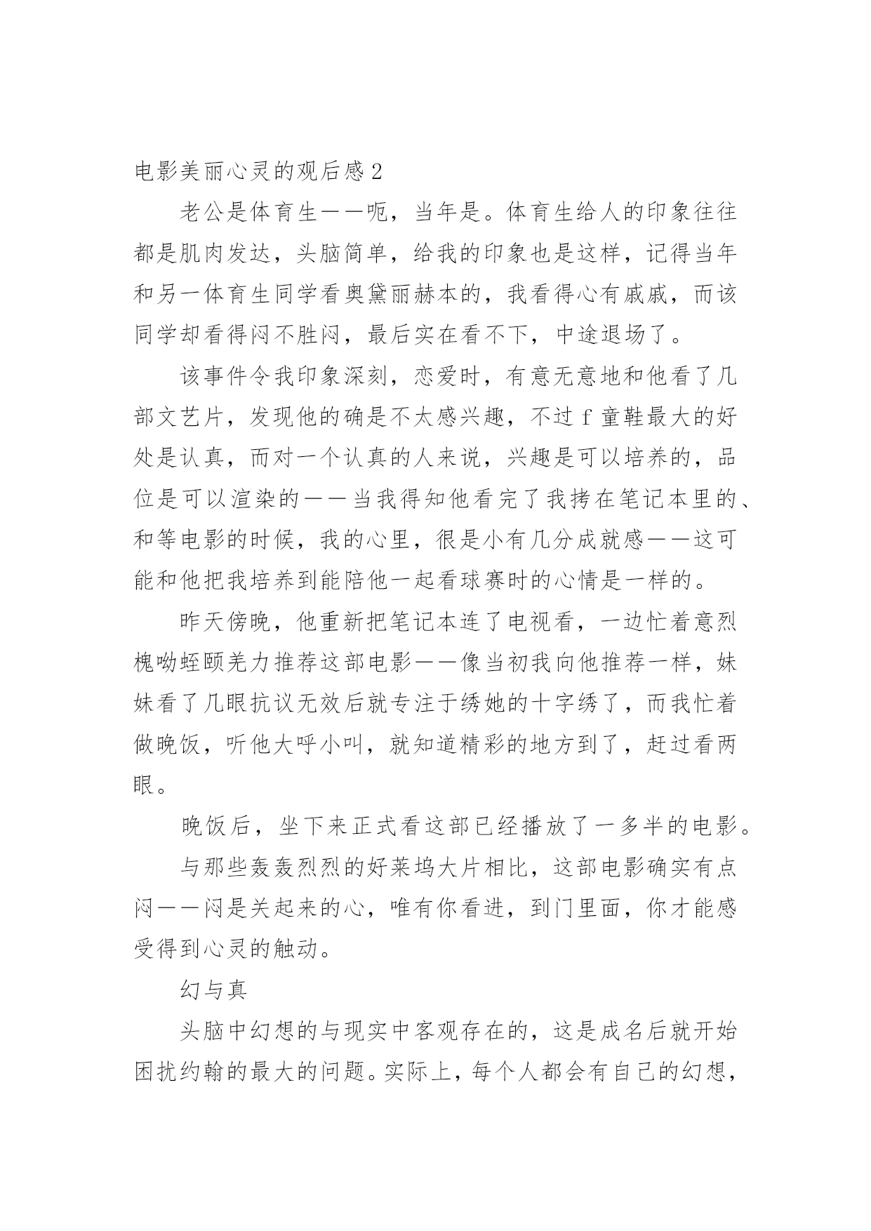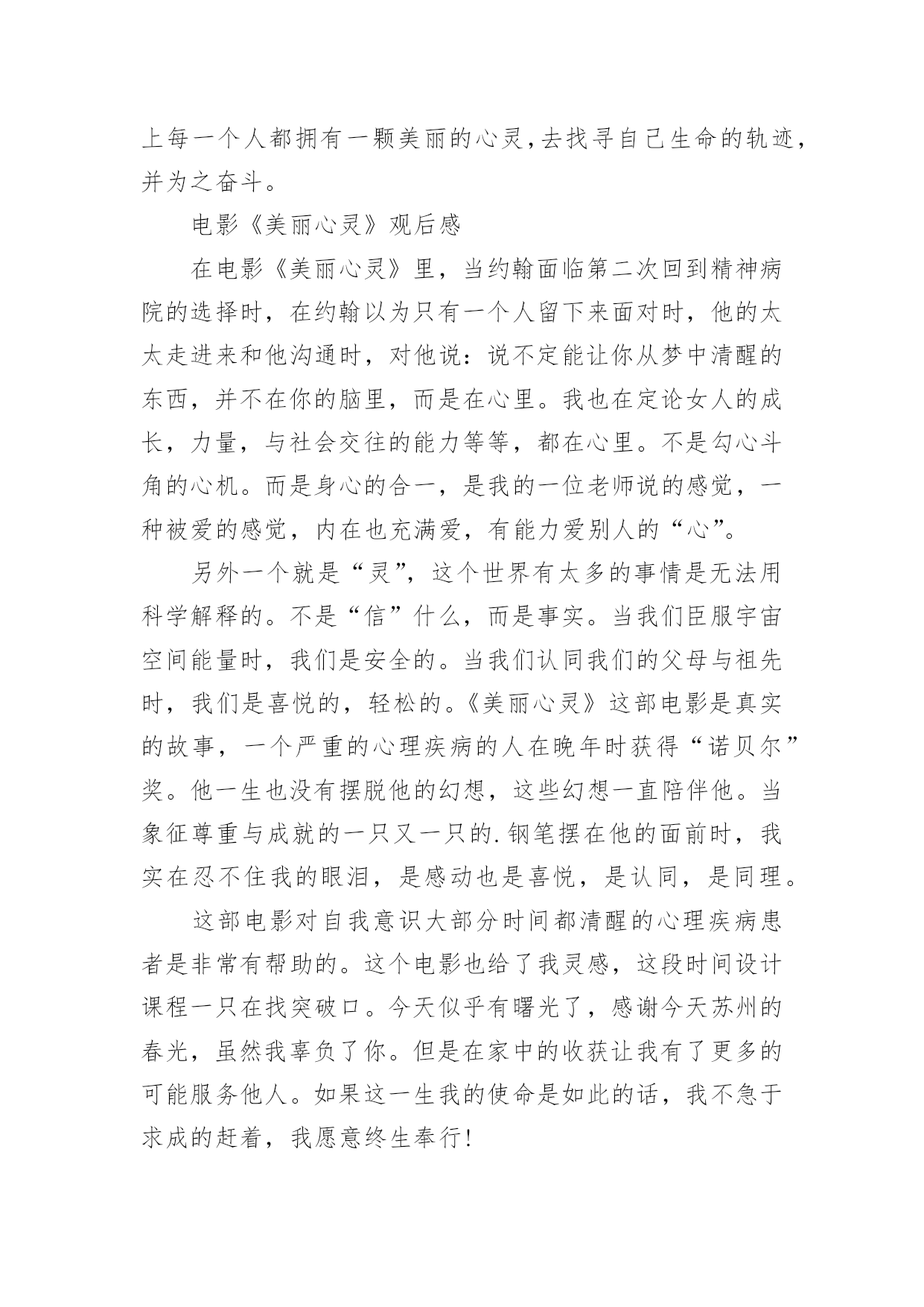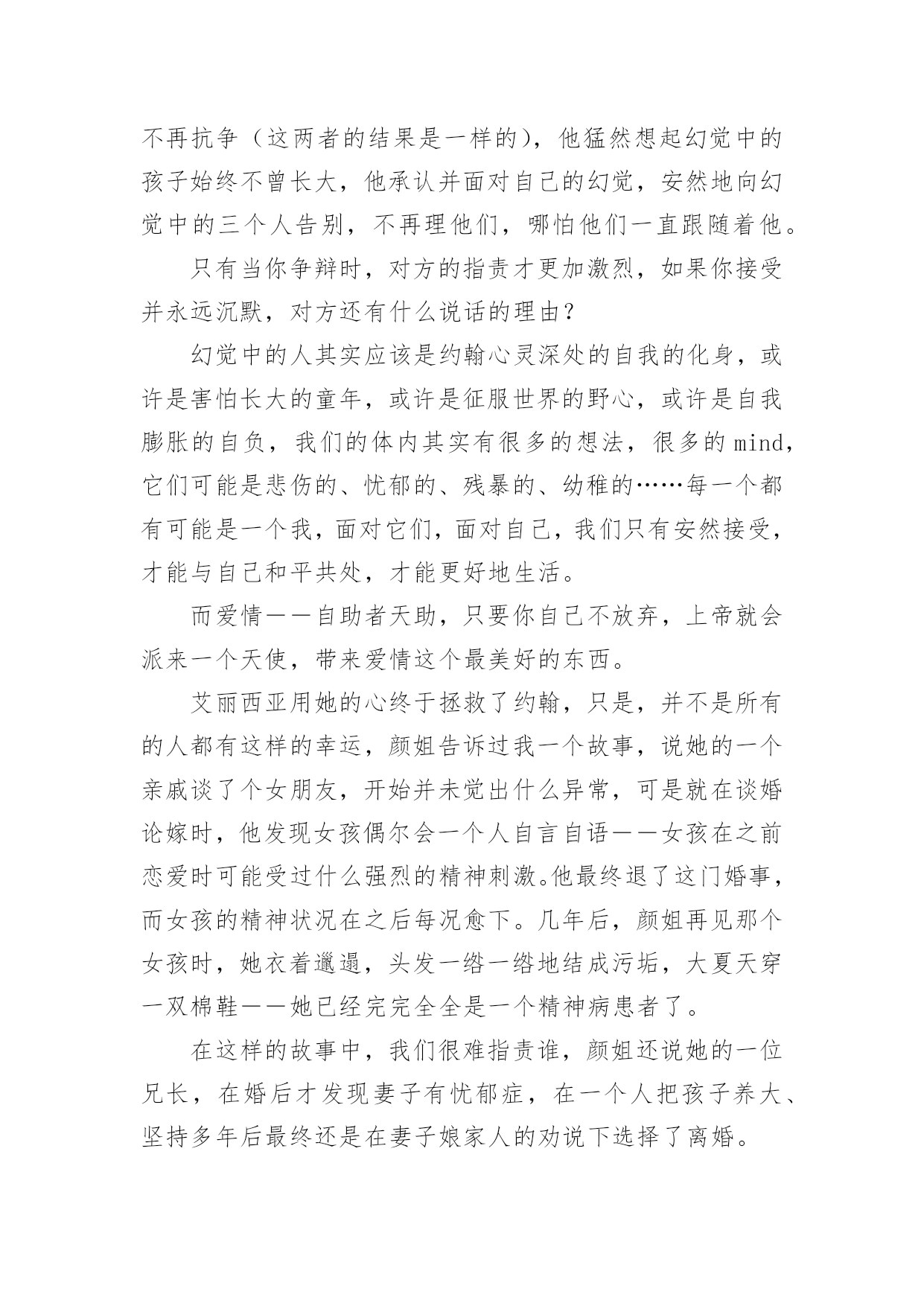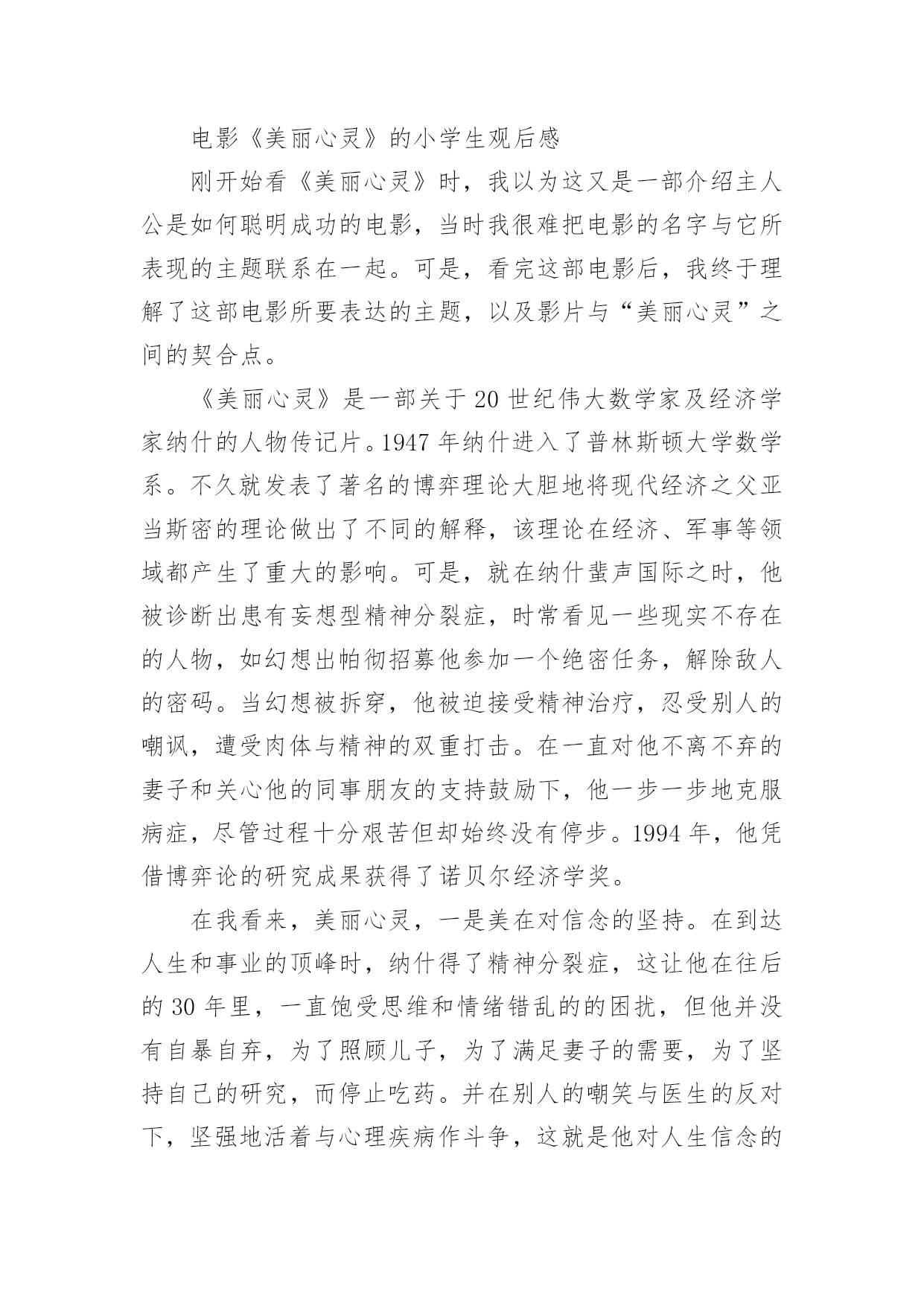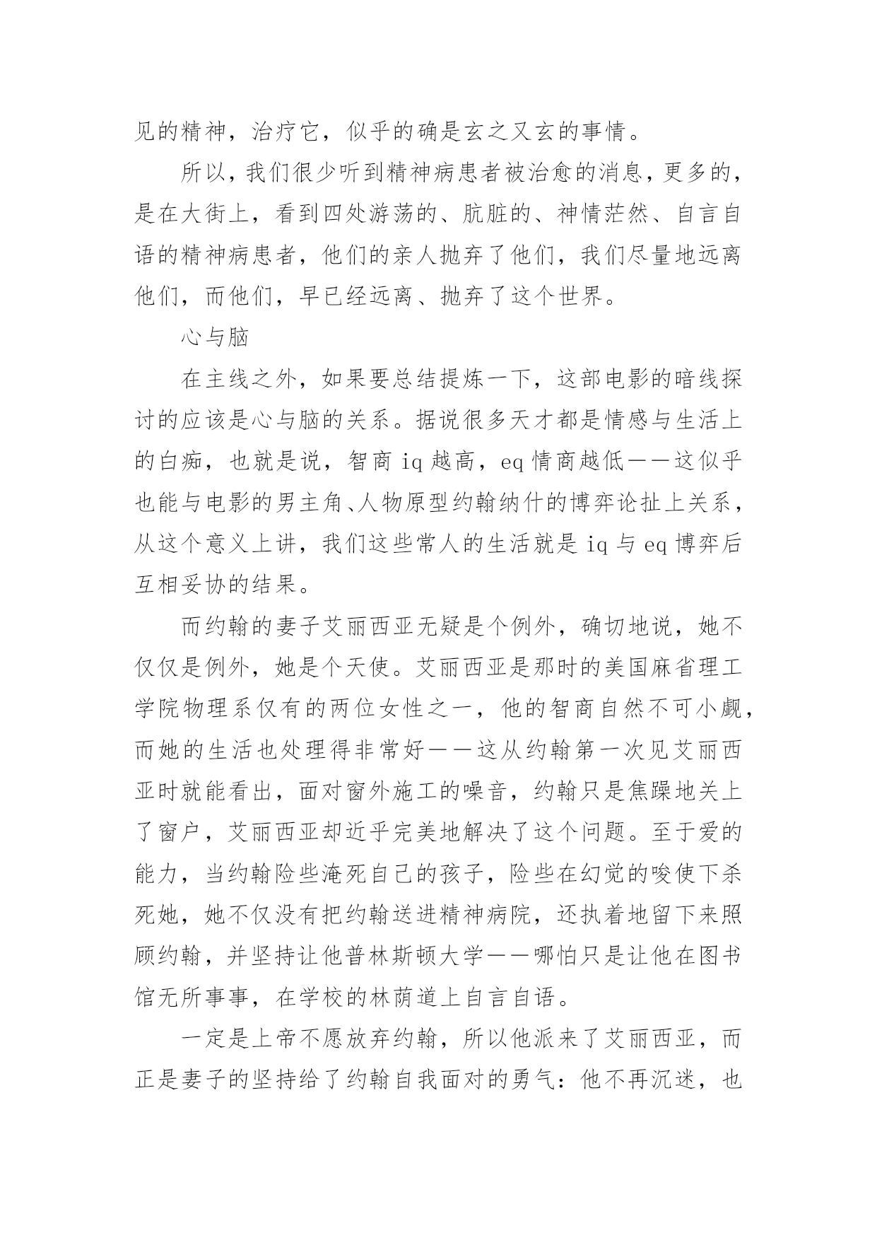 电影美丽心灵的观后感当品味完一部作品后,相信大家有很多值得分享的东西吧,观后感就是自己的一种思想感悟,观后感相当注重“感”,也就是从作品中领悟出的道理与思想。那么观后感到底应该怎么写呢?以下是小编帮大家整理的电影美丽心灵的观后感,欢迎大家分享。电影美丽心灵的观后感1在上形势与政策课的时候,老师给我们放了一电影――《美丽心灵》。那是第一次看,并没有思考这电影为什么叫《美丽心灵》;也没有仔细思考电影中的人物如何。只觉得其中的主人公是一个对学术的态度近似疯狂,但不善于与人交往的人,仅此而已。我第一次看这部片子纯粹也是娱乐性质的。回到家后,自己一个人静静地,又看了一遍。而后发现,这次再看却有不一样的收获,不一样的感受。我从这部片子中,得到了一定的启发,它激励着我去思考自己的人生,自己的目标;思考自己应该成为一个怎样的人,要怎样成为自己心目中的自己。电影的主人公纳什在学术上的近似疯狂真的让我佩服。电影一开始,并没有说纳什患有精神分裂症。那时我看到他在窗户上写的一条条我看都看不明的算数式子,连鸽子的活动的路径他都想研究出点什么来,我心中真的生出由衷的敬佩。自然界的一切事物,在我们看起来理所当然的事物,科学家们都想研究出点什么来,或许这就是严谨的科学精神,也正是很多人都缺少的精神。但这种精神,却正是我们现在学习可贵而必需的。扪心自问,我自己却是缺少这一精神。从小学到高中,或许多是活在升学的压力下而学习的,并不是为了获取知识而学习,而是为了获取高分而学习。其实现在回过头来看,真的觉得自己从小学到高中获取的东西真的少得可怜,除了课本还是课本。上到大学来回顾这些东西,发现自己的知识面真的是窄之又窄。我们是为了更好地生活而去获取知识,而不是为了其他。要想更好的活在这世上,就要拥有格物致知的精神,去考察我们的世界,我们的社会,我们的生活。如果认识到这一点然后再去学习,我相信,我们会学得更好。等电影说到纳什原来是个精神分裂病患者时,我顿时惊讶了。一个病患者竟然都能在博弈论和微分几何学领域做出如此大的贡献,真的不是我们所能想象的。在他背后支持他的,除了他的妻子,还有他自己顽强不屈的性格以及对科学的热爱。在病魔面前,有多少人会觉得自己无能为力,又有多少人甚至放弃自己的生命。而谦卑的纳什处在病魔的重压之下,仍然被那令人兴奋的数学理论所驱使着,他决心寻找自己的恢复常态的方法。绝对是通过意志的力量,他才一如既往地继续进行着他的工作,并于1994年获得了诺贝尔奖,与此同时,他在博弈论方面颇具前瞻性的工作成为20世纪最具影响力的理论。纳什顽强的意志以及他对科学的热爱,正是他感动我们的魅力所在,正是他美好心灵的体现。其实,无论是在学术还是在生活上,我们都应该像纳什一样拥有永不放弃的顽强精神,拥有一颗美好纯洁的心灵。即使不能再学术科研方面做出什么成绩,不能对我们的社会有大的贡献,但至少我们凭借这股顽强的劲而认真努力地为自己的人生奋斗过,至此,我们无悔,我们这一辈子没有白活。另外,纳什的经历也告诉我们要做一个有目标的人,拥有了目标,我们的奋斗才有意义。另一个感动我的是纳什实事求是的性格。当被告知获诺贝尔经济学奖并询问他的病况的时候,纳什并没有为了上台领奖而隐瞒自己的病情,他实事求是的说出自己的实况,得到了大家的尊重。这一点也是我们值得学习的。凡是不要逞强,恰如其分地评价自己,也是我从纳什身上学到的。而在人际交往方面,我觉得纳什是一个不善于交际的人。有时候,他过于直接的表达方式会招来别人的不理解与不满。这也告诫我们,在与别人交往过程中,有时候,有些事情不是你怎么想就可以怎么说,在不违背自己原则下,有些事情是可以委婉的表达出来的,有些事情,不要以为自己能够接受别人就一定能接受。有时候,要站在别人的角度去考虑问题。其实,在大学这个小社会里,我也在努力地学习与人交往,我是一个内向,不善言辞的人,我希望自己在大学里面交际能力能够得到改善,我愿意为之付出努力。生活中处处充满感动,关键是我们是否拥有一双发现美的眼睛。一部电影,亦能让我们思考很多、学会很多。愿世上每一个人都拥有一颗美丽的心灵,去找寻自己生命的轨迹,并为之奋斗。电影《美丽心灵》观后感在电影《美丽心灵》里,当约翰面临第二次回到精神病院的选择时,在约翰以为只有一个人留下来面对时,他的太太走进来和他沟通时,对他说:说不定能让你从梦中清醒的东西,并不在你的脑里,而是在心里。我也在定论女人的成长,力量,与社会交往的能力等等,都在心里。不是勾心斗角的心机。而是身心的合一,是我的一位老师说的感觉,一种被爱的感觉,内在也充满爱,有能力爱别人的“心”。另外一个就是“灵”,这个世界有太多的事情是无法用科学解释的。不是“信”什么,而是事实。当我们臣服宇宙空间能量时,我们是安全的。当我们认同我们的父母与祖先时,我们是喜悦的,轻松的。《美丽心灵