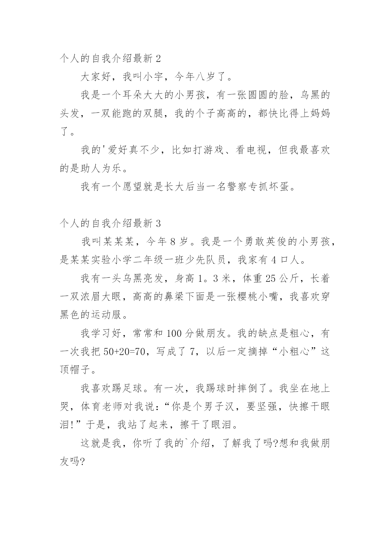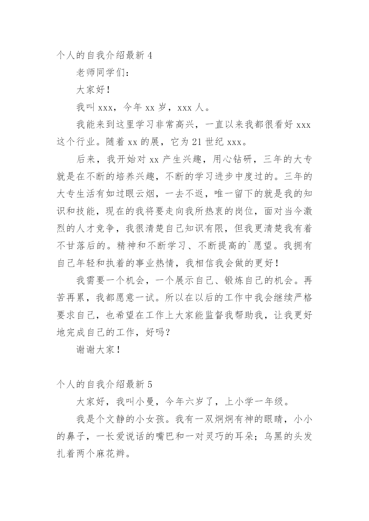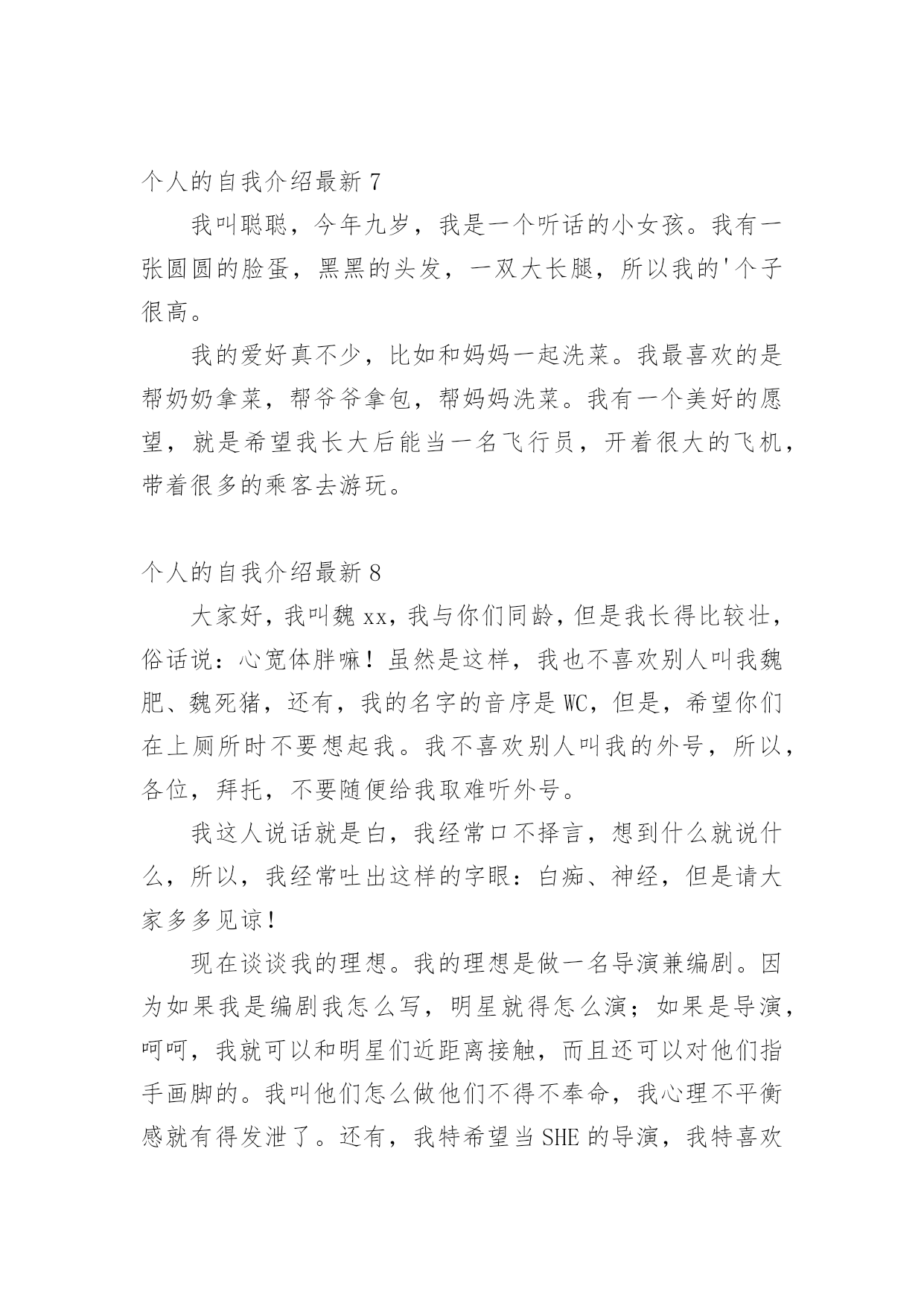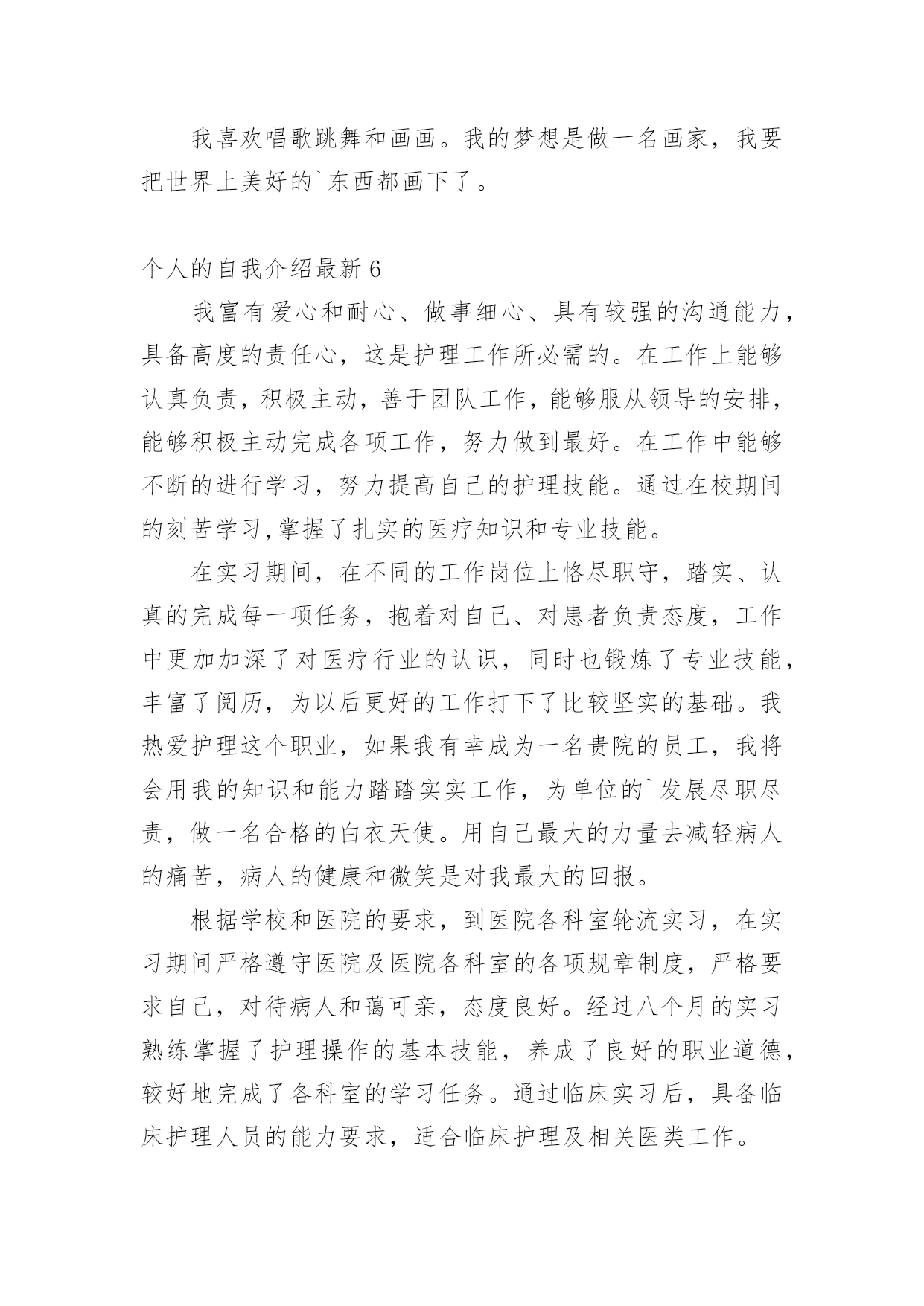 个人的自我介绍最新来到一个完全陌生的环境,需要我们进行自我介绍,自我介绍有助于自我宣传、自我展示。怎么写自我介绍才能避免踩雷呢?以下是小编精心整理的个人的自我介绍最新,欢迎阅读,希望大家能够喜欢。个人的自我介绍最新1尊敬的招聘主管:您好!下面我将通过简单的面试自我介绍让您来了解我。我是来自XX大学专业的XXX。我喜欢读书,因为它能丰富我的知识;我喜欢,因为它可以磨砺我的意志,我是一个活泼开朗、热情、执着、有坚强意志的人。在读书期间,我已经做过暑期工,是向用餐的客人推销啤酒。那时我则我认为,营销是一种服务。既然是一种服务,就应该做到让大家满意,用热情和真心去做。激情,工作中不可或缺的要素,是推动我们在工作中不断创新,全身心投入工作的.动力。激情加上挑战自我的意识,我相信我能胜任这份工作。我非常欣赏贵司:“诚信是我们合作的基础,双赢是我们共同的目标!”我愿与XX文化一起发展,一起创造辉煌的明天!个人的自我介绍最新2大家好,我叫小宇,今年八岁了。我是一个耳朵大大的小男孩,有一张圆圆的脸,乌黑的头发,一双能跑的双腿,我的个子高高的,都快比得上妈妈了。我的'爱好真不少,比如打游戏、看电视,但我最喜欢的是助人为乐。我有一个愿望就是长大后当一名警察专抓坏蛋。个人的自我介绍最新3我叫某某某,今年8岁。我是一个勇敢英俊的小男孩,是某某实验小学二年级一班少先队员,我家有4口人。我有一头乌黑亮发,身高1。3米,体重25公斤,长着一双浓眉大眼,高高的鼻梁下面是一张樱桃小嘴,我喜欢穿黑色的运动服。我学习好,常常和100分做朋友。我的缺点是粗心,有一次我把50+20=70,写成了7,以后一定摘掉“小粗心”这顶帽子。我喜欢踢足球。有一次,我踢球时摔倒了。我坐在地上哭,体育老师对我说:“你是个男子汉,要坚强,快擦干眼泪!”于是,我站了起来,擦干了眼泪。这就是我,你听了我的`介绍,了解我了吗?想和我做朋友吗?个人的自我介绍最新4老师同学们:大家好!我叫xxx,今年xx岁,xxx人。我能来到这里学习非常高兴,一直以来我都很看好xxx这个行业。随着xx的展,它为21世纪xxx。后来,我开始对xx产生兴趣,用心钻研,三年的大专就是在不断的培养兴趣,不断的学习进步中度过的。三年的大专生活有如过眼云烟,一去不返,唯一留下的就是我的知识和技能,现在的我将要走向我所热衷的岗位,面对当今激烈的人才竞争,我很清楚自己知识有限,但我更清楚我有着不甘落后的。精神和不断学习、不断提高的`愿望。我拥有自己年轻和执着的事业热情,我相信我会做的更好!我需要一个机会,一个展示自己、锻炼自己的机会。再苦再累,我都愿意一试。所以在以后的工作中我会继续严格要求自己,也希望在工作上大家能监督我帮助我,让我更好地完成自己的工作,好吗?谢谢大家!个人的自我介绍最新5大家好,我叫小曼,今年六岁了,上小学一年级。我是个文静的小女孩。我有一双炯炯有神的眼睛,小小的鼻子,一长爱说话的嘴巴和一对灵巧的耳朵;乌黑的头发扎着两个麻花辫。我喜欢唱歌跳舞和画画。我的梦想是做一名画家,我要把世界上美好的`东西都画下了。个人的自我介绍最新6我富有爱心和耐心、做事细心、具有较强的沟通能力,具备高度的责任心,这是护理工作所必需的。在工作上能够认真负责,积极主动,善于团队工作,能够服从领导的安排,能够积极主动完成各项工作,努力做到最好。在工作中能够不断的进行学习,努力提高自己的护理技能。通过在校期间的刻苦学习,掌握了扎实的医疗知识和专业技能。在实习期间,在不同的工作岗位上恪尽职守,踏实、认真的完成每一项任务,抱着对自己、对患者负责态度,工作中更加加深了对医疗行业的认识,同时也锻炼了专业技能,丰富了阅历,为以后更好的工作打下了比较坚实的基础。我热爱护理这个职业,如果我有幸成为一名贵院的员工,我将会用我的知识和能力踏踏实实工作,为单位的`发展尽职尽责,做一名合格的白衣天使。用自己最大的力量去减轻病人的痛苦,病人的健康和微笑是对我最大的回报。根据学校和医院的要求,到医院各科室轮流实习,在实习期间严格遵守医院及医院各科室的各项规章制度,严格要求自己,对待病人和蔼可亲,态度良好。经过八个月的实习熟练掌握了护理操作的基本技能,养成了良好的职业道德,较好地完成了各科室的学习任务。通过临床实习后,具备临床护理人员的能力要求,适合临床护理及相关医类工作。个人的自我介绍最新7我叫聪聪,今年九岁,我是一个听话的小女孩。我有一张圆圆的脸蛋,黑黑的头发,一双大长腿,所以我的'个子很高。我的爱好真不少,比如和妈妈一起洗菜。我最喜欢的是帮奶奶拿菜,帮爷爷拿包,帮妈妈洗菜。我有一个美好的愿望,就是希望我长大后能当一名飞行员,开着很大的飞机,带着很多的乘客去游玩。个人的自我介绍最新8大家好,我叫魏xx,我与你们同龄,但是我长得比较壮,俗话说:心宽体胖嘛!虽然是