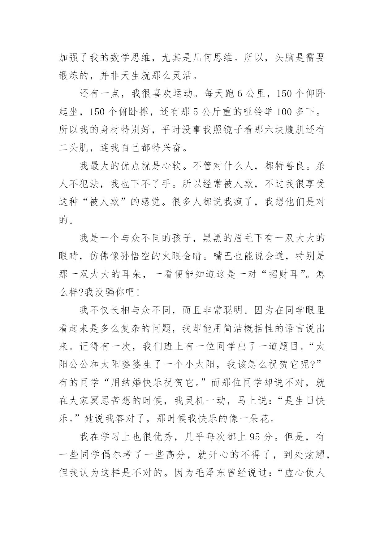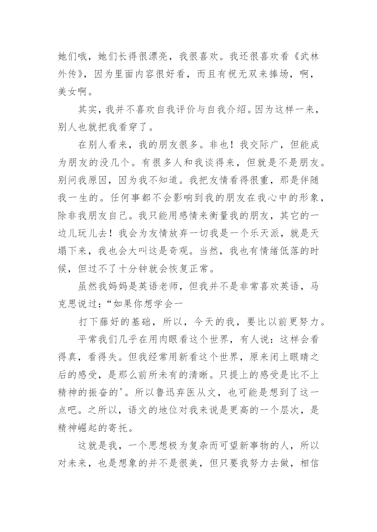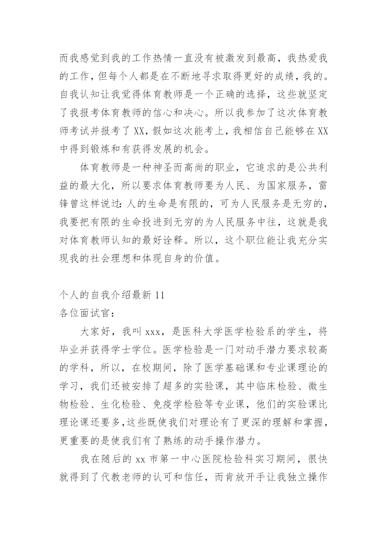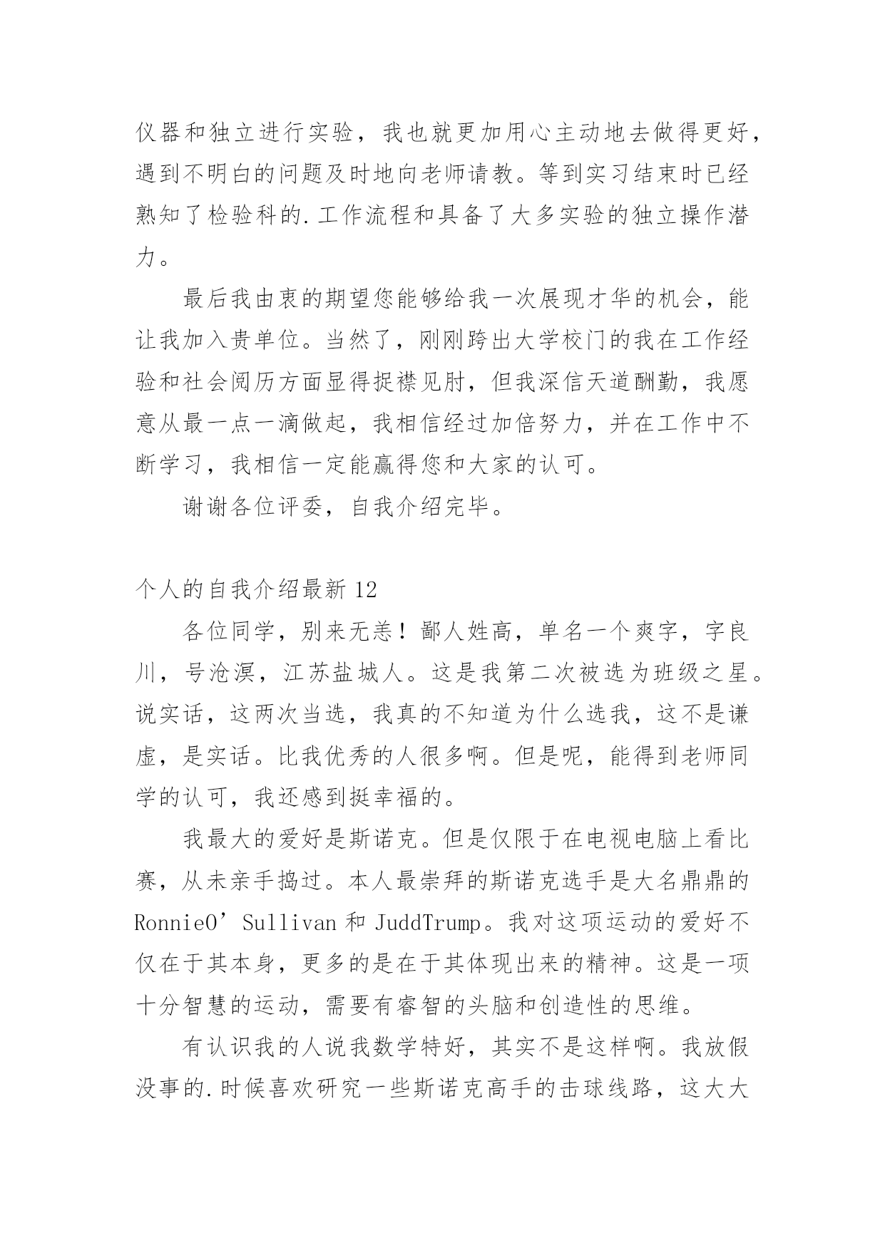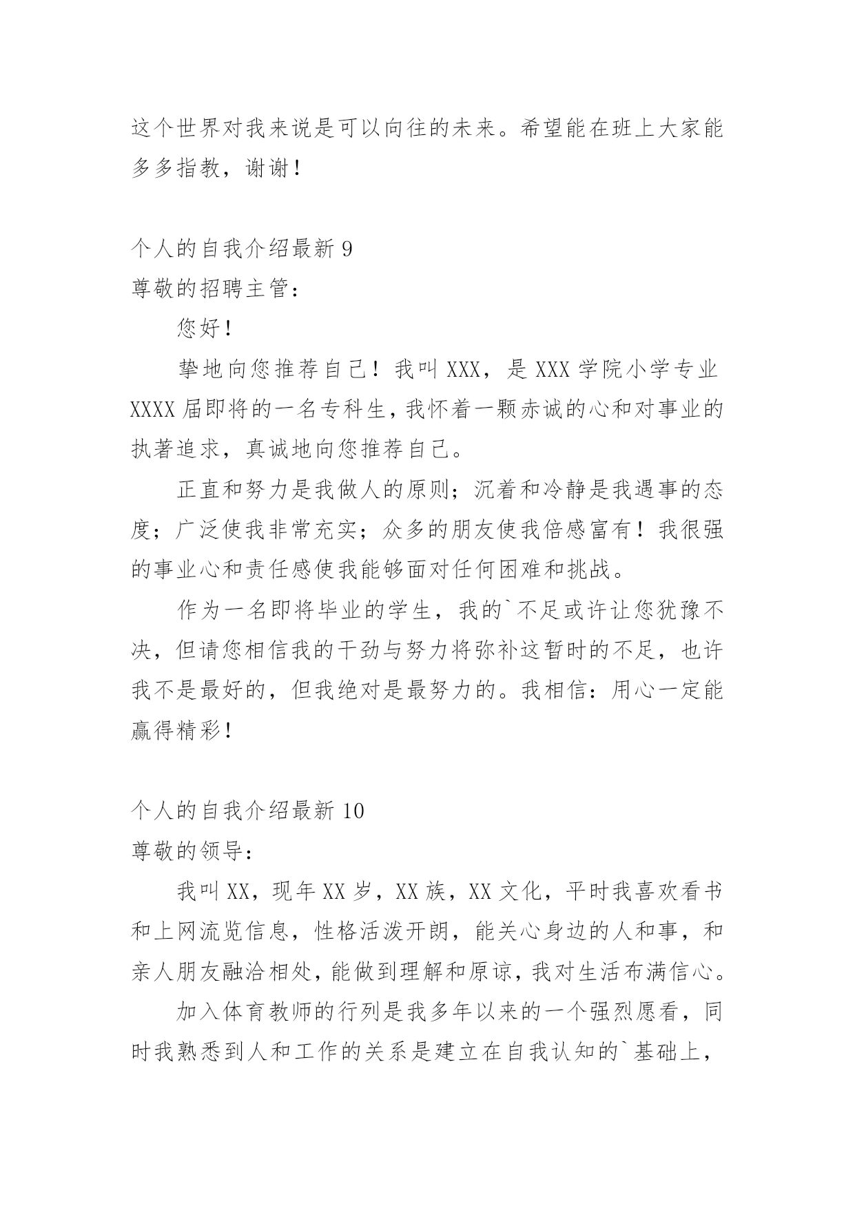 个人的自我介绍最新来到一个完全陌生的环境,需要我们进行自我介绍,自我介绍有助于自我宣传、自我展示。怎么写自我介绍才能避免踩雷呢?以下是小编精心整理的个人的自我介绍最新,欢迎阅读,希望大家能够喜欢。个人的自我介绍最新1尊敬的招聘主管:您好!下面我将通过简单的面试自我介绍让您来了解我。我是来自XX大学专业的XXX。我喜欢读书,因为它能丰富我的知识;我喜欢,因为它可以磨砺我的意志,我是一个活泼开朗、热情、执着、有坚强意志的人。在读书期间,我已经做过暑期工,是向用餐的客人推销啤酒。那时我则我认为,营销是一种服务。既然是一种服务,就应该做到让大家满意,用热情和真心去做。激情,工作中不可或缺的要素,是推动我们在工作中不断创新,全身心投入工作的.动力。激情加上挑战自我的意识,我相信我能胜任这份工作。我非常欣赏贵司:“诚信是我们合作的基础,双赢是我们共同的目标!”我愿与XX文化一起发展,一起创造辉煌的明天!个人的自我介绍最新2大家好,我叫小宇,今年八岁了。我是一个耳朵大大的小男孩,有一张圆圆的脸,乌黑的头发,一双能跑的双腿,我的个子高高的,都快比得上妈妈了。我的'爱好真不少,比如打游戏、看电视,但我最喜欢的是助人为乐。我有一个愿望就是长大后当一名警察专抓坏蛋。个人的自我介绍最新3我叫某某某,今年8岁。我是一个勇敢英俊的小男孩,是某某实验小学二年级一班少先队员,我家有4口人。我有一头乌黑亮发,身高1。3米,体重25公斤,长着一双浓眉大眼,高高的鼻梁下面是一张樱桃小嘴,我喜欢穿黑色的运动服。我学习好,常常和100分做朋友。我的缺点是粗心,有一次我把50+20=70,写成了7,以后一定摘掉“小粗心”这顶帽子。我喜欢踢足球。有一次,我踢球时摔倒了。我坐在地上哭,体育老师对我说:“你是个男子汉,要坚强,快擦干眼泪!”于是,我站了起来,擦干了眼泪。这就是我,你听了我的`介绍,了解我了吗?想和我做朋友吗?个人的自我介绍最新4老师同学们:大家好!我叫xxx,今年xx岁,xxx人。我能来到这里学习非常高兴,一直以来我都很看好xxx这个行业。随着xx的展,它为21世纪xxx。后来,我开始对xx产生兴趣,用心钻研,三年的大专就是在不断的培养兴趣,不断的学习进步中度过的。三年的大专生活有如过眼云烟,一去不返,唯一留下的就是我的知识和技能,现在的我将要走向我所热衷的岗位,面对当今激烈的人才竞争,我很清楚自己知识有限,但我更清楚我有着不甘落后的。精神和不断学习、不断提高的`愿望。我拥有自己年轻和执着的事业热情,我相信我会做的更好!我需要一个机会,一个展示自己、锻炼自己的机会。再苦再累,我都愿意一试。所以在以后的工作中我会继续严格要求自己,也希望在工作上大家能监督我帮助我,让我更好地完成自己的工作,好吗?谢谢大家!个人的自我介绍最新5大家好,我叫小曼,今年六岁了,上小学一年级。我是个文静的小女孩。我有一双炯炯有神的眼睛,小小的鼻子,一长爱说话的嘴巴和一对灵巧的耳朵;乌黑的头发扎着两个麻花辫。我喜欢唱歌跳舞和画画。我的梦想是做一名画家,我要把世界上美好的`东西都画下了。个人的自我介绍最新6我富有爱心和耐心、做事细心、具有较强的沟通能力,具备高度的责任心,这是护理工作所必需的。在工作上能够认真负责,积极主动,善于团队工作,能够服从领导的安排,能够积极主动完成各项工作,努力做到最好。在工作中能够不断的进行学习,努力提高自己的护理技能。通过在校期间的刻苦学习,掌握了扎实的医疗知识和专业技能。在实习期间,在不同的工作岗位上恪尽职守,踏实、认真的完成每一项任务,抱着对自己、对患者负责态度,工作中更加加深了对医疗行业的认识,同时也锻炼了专业技能,丰富了阅历,为以后更好的工作打下了比较坚实的基础。我热爱护理这个职业,如果我有幸成为一名贵院的员工,我将会用我的知识和能力踏踏实实工作,为单位的`发展尽职尽责,做一名合格的白衣天使。用自己最大的力量去减轻病人的痛苦,病人的健康和微笑是对我最大的回报。根据学校和医院的要求,到医院各科室轮流实习,在实习期间严格遵守医院及医院各科室的各项规章制度,严格要求自己,对待病人和蔼可亲,态度良好。经过八个月的实习熟练掌握了护理操作的基本技能,养成了良好的职业道德,较好地完成了各科室的学习任务。通过临床实习后,具备临床护理人员的能力要求,适合临床护理及相关医类工作。个人的自我介绍最新7我叫聪聪,今年九岁,我是一个听话的小女孩。我有一张圆圆的脸蛋,黑黑的头发,一双大长腿,所以我的'个子很高。我的爱好真不少,比如和妈妈一起洗菜。我最喜欢的是帮奶奶拿菜,帮爷爷拿包,帮妈妈洗菜。我有一个美好的愿望,就是希望我长大后能当一名飞行员,开着很大的飞机,带着很多的乘客去游玩。个人的自我介绍最新8大家好,我叫魏xx,我与你们同龄,但是我长得比较壮,俗话说:心宽体胖嘛!虽然是