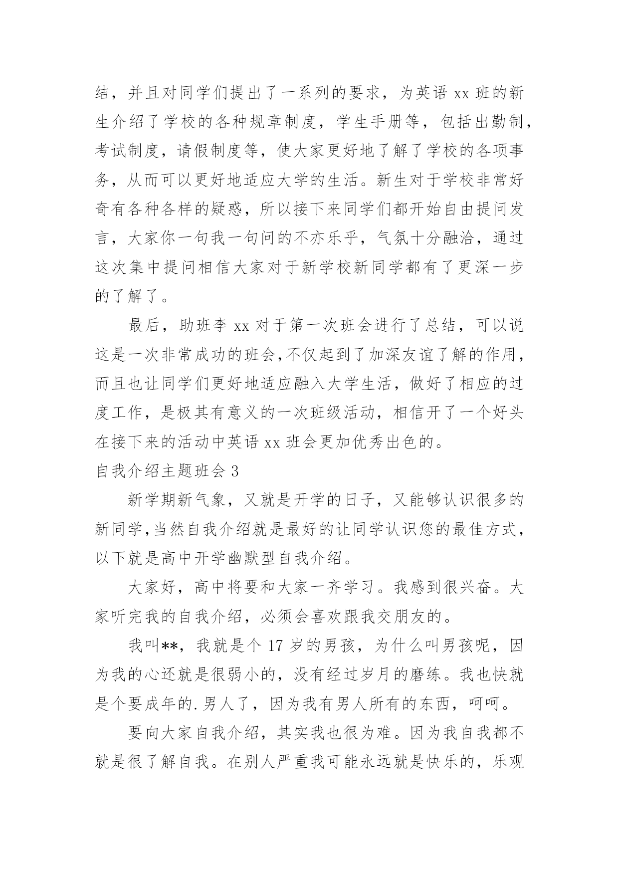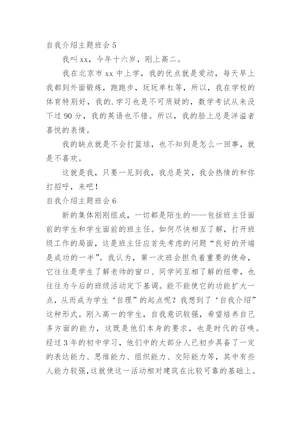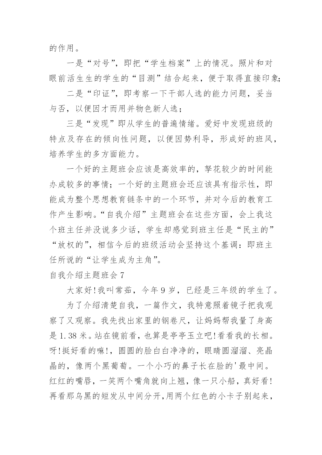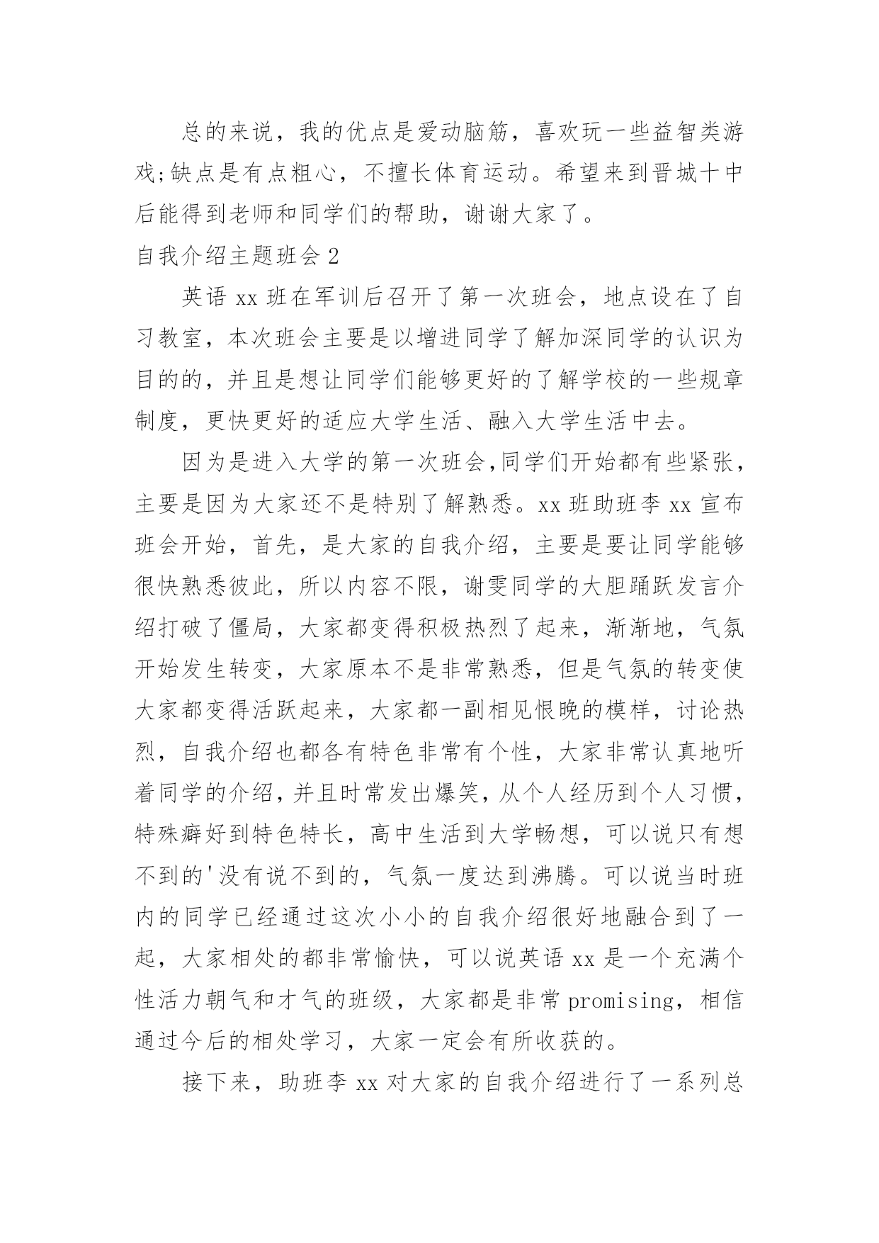 自我介绍主题班会自我介绍主题班会在我们平凡的学生生涯里,大家都接触过主题班会吧?主题班会形式活泼生动,安排紧凑,气氛和谐。那么问题来了,要如何准备一个主题班会呢?下面是小编精心整理的自我介绍主题班会,供大家参考借鉴,希望可以帮助到有需要的朋友。自我介绍主题班会1我叫郭少迟,今年12岁,从凤巢小学毕业。我家住在怡凤小区,我爸爸是江淮重工的一名工人,妈妈是一名会计。我这次毕业考试考得并不理想。尽管语文这次遇到的作文是妈妈让我背过的,我对自己还是比较满意的,考了92。5分,成绩还差不多,但是以后还要在阅读理解方面下功夫;数学考试因为粗心把一道大题的题目看错了,所以只考了87分。希望今后通过老师的帮助和自己的努力可以把粗心这个小坏蛋消灭掉;英语是因为有些题不会做,所以只考了85分,今后我要记更多的单词,背更多的句形,努力把成绩提上去。我喜欢下棋,最喜欢的`是围棋。在这个暑假里杨老师带我们参加了山西省少儿围棋锦标赛,在全省250多人中我名列第13名,顺利晋级到业余二段。我喜欢画画,从小就练习各种画,现在最喜欢的是国画,暑假期间还参加了五级升六级的画画考试。总的来说,我的优点是爱动脑筋,喜欢玩一些益智类游戏;缺点是有点粗心,不擅长体育运动。希望来到晋城十中后能得到老师和同学们的帮助,谢谢大家了。自我介绍主题班会2英语xx班在军训后召开了第一次班会,地点设在了自习教室,本次班会主要是以增进同学了解加深同学的认识为目的的,并且是想让同学们能够更好的了解学校的一些规章制度,更快更好的适应大学生活、融入大学生活中去。因为是进入大学的第一次班会,同学们开始都有些紧张,主要是因为大家还不是特别了解熟悉。xx班助班李xx宣布班会开始,首先,是大家的自我介绍,主要是要让同学能够很快熟悉彼此,所以内容不限,谢雯同学的大胆踊跃发言介绍打破了僵局,大家都变得积极热烈了起来,渐渐地,气氛开始发生转变,大家原本不是非常熟悉,但是气氛的转变使大家都变得活跃起来,大家都一副相见恨晚的模样,讨论热烈,自我介绍也都各有特色非常有个性,大家非常认真地听着同学的介绍,并且时常发出爆笑,从个人经历到个人习惯,特殊癖好到特色特长,高中生活到大学畅想,可以说只有想不到的'没有说不到的,气氛一度达到沸腾。可以说当时班内的同学已经通过这次小小的自我介绍很好地融合到了一起,大家相处的都非常愉快,可以说英语xx是一个充满个性活力朝气和才气的班级,大家都是非常promising,相信通过今后的相处学习,大家一定会有所收获的。接下来,助班李xx对大家的自我介绍进行了一系列总结,并且对同学们提出了一系列的要求,为英语xx班的新生介绍了学校的各种规章制度,学生手册等,包括出勤制,考试制度,请假制度等,使大家更好地了解了学校的各项事务,从而可以更好地适应大学的生活。新生对于学校非常好奇有各种各样的疑惑,所以接下来同学们都开始自由提问发言,大家你一句我一句问的不亦乐乎,气氛十分融洽,通过这次集中提问相信大家对于新学校新同学都有了更深一步的了解了。最后,助班李xx对于第一次班会进行了总结,可以说这是一次非常成功的班会,不仅起到了加深友谊了解的作用,而且也让同学们更好地适应融入大学生活,做好了相应的过度工作,是极其有意义的一次班级活动,相信开了一个好头在接下来的活动中英语xx班会更加优秀出色的。自我介绍主题班会3新学期新气象,又就是开学的日子,又能够认识很多的新同学,当然自我介绍就是最好的让同学认识您的最佳方式,以下就是高中开学幽默型自我介绍。大家好,高中将要和大家一齐学习。我感到很兴奋。大家听完我的自我介绍,必须会喜欢跟我交朋友的。我叫**,我就是个17岁的男孩,为什么叫男孩呢,因为我的心还就是很弱小的,没有经过岁月的磨练。我也快就是个要成年的.男人了,因为我有男人所有的东西,呵呵。要向大家自我介绍,其实我也很为难。因为我自我都不就是很了解自我。在别人严重我可能永远就是快乐的,乐观的,但就是我的内心深处却经常为一些事悲哀,焦虑,烦恼,甚至死心!我认为正式因为有痛苦才会有快乐,人生好比两杯酒,一杯苦酒,一杯甜酒。只就是看你先喝哪一杯。人生能够分为七个阶段吧,幼年、童年少年、青年、成年、中年、老年。我们处于青年,就是塑造我们人生价值关和目标的时候,我们以后将要成为一个怎样的人,主要的决定因素都会在接下来的高中三年中发生,所以我很期盼以后的高中生活。我喜欢回忆我的少年,回忆我的少年带给我的无数的快乐;而我更向往早点变成一个成年人,因为成年了就能做自我喜欢的事,不再受别人的牵制和约束。我的自我介绍比较简短,大家就是否想和我叫朋友呢?那就来认识认识我吧,我也很期望能和大家交朋友。自我介绍主题班会4大家好,我是xxx,是一个性格开朗的人,我很喜欢读书,我最喜欢外国文学书,因为(写上你对外国文学的认识),我还喜欢