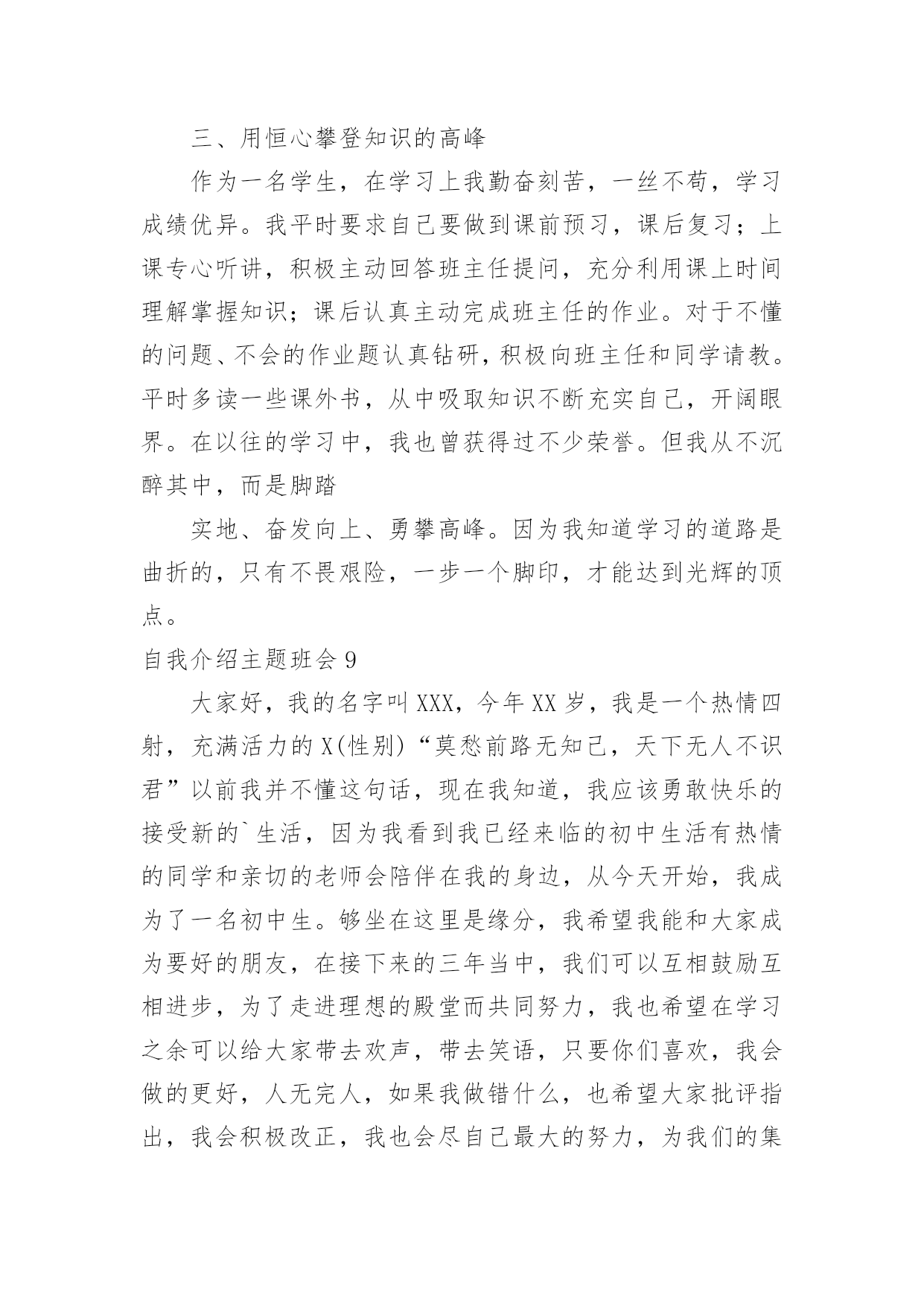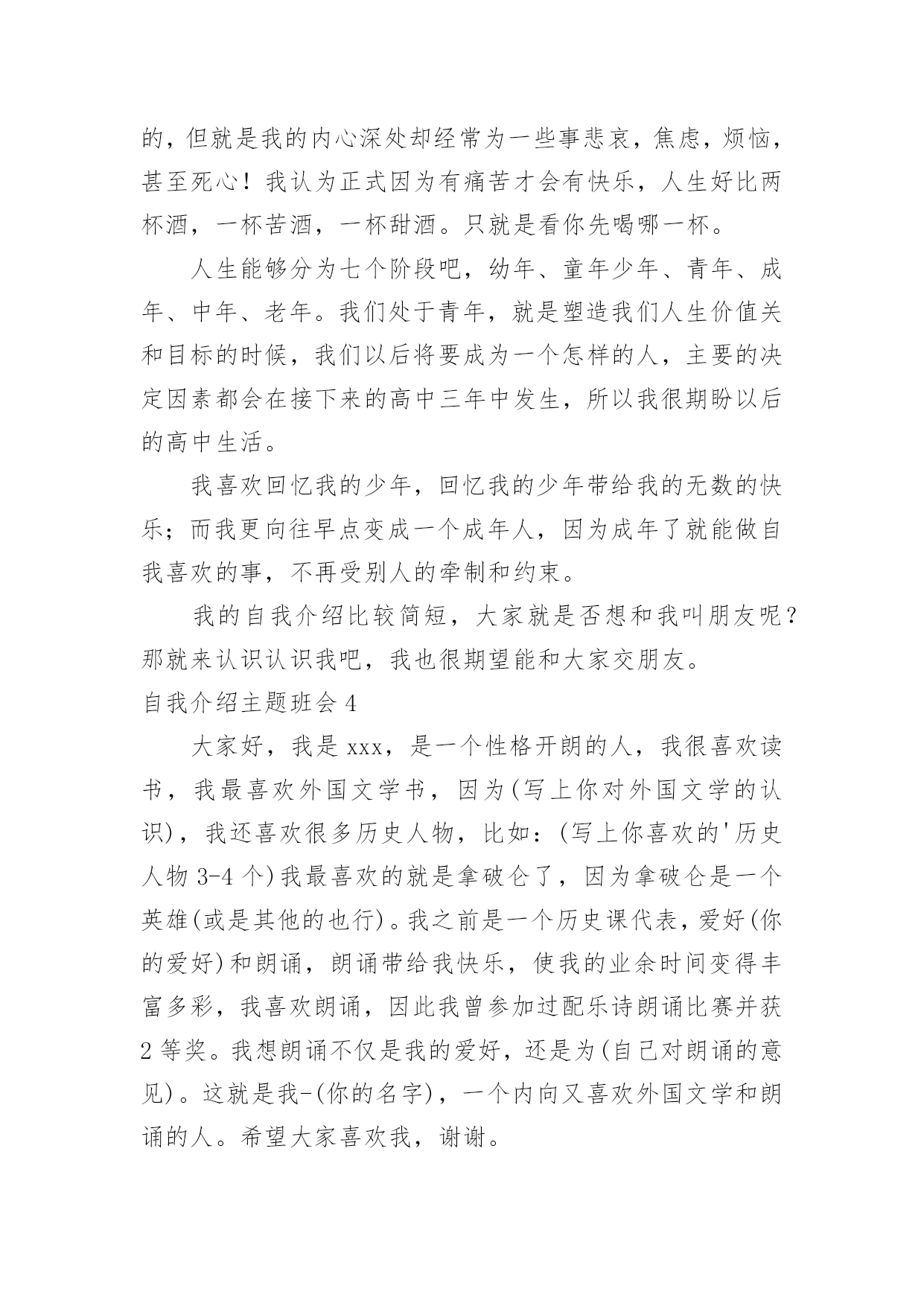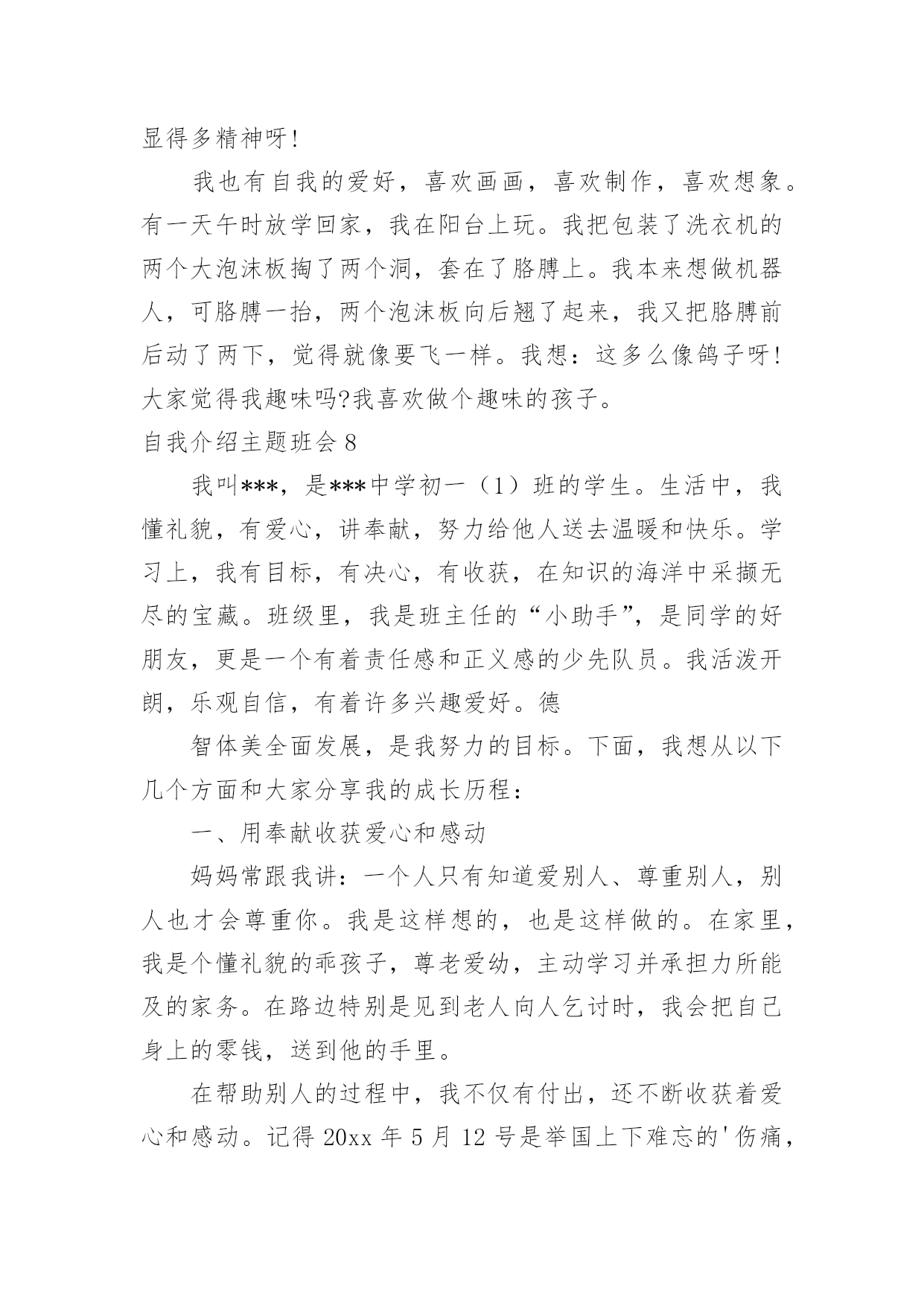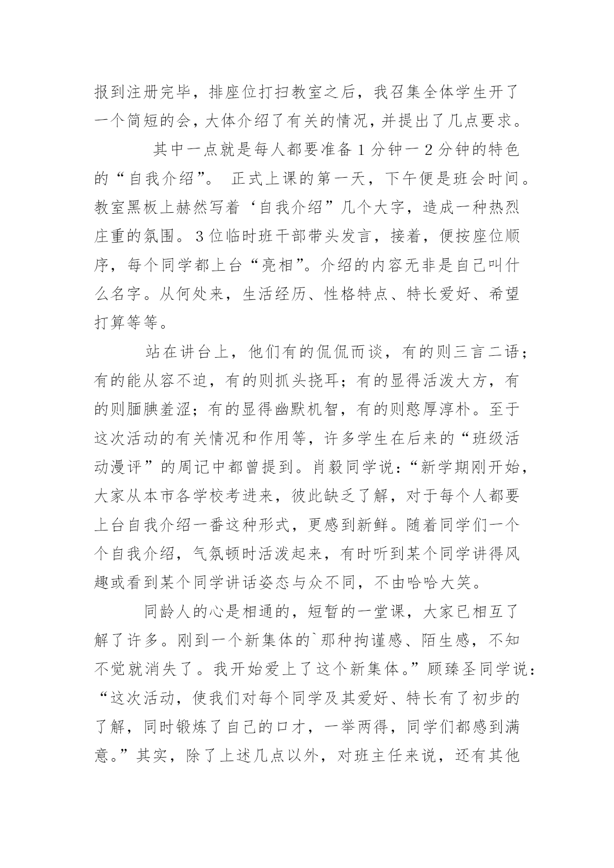 自我介绍主题班会自我介绍主题班会在我们平凡的学生生涯里,大家都接触过主题班会吧?主题班会形式活泼生动,安排紧凑,气氛和谐。那么问题来了,要如何准备一个主题班会呢?下面是小编精心整理的自我介绍主题班会,供大家参考借鉴,希望可以帮助到有需要的朋友。自我介绍主题班会1我叫郭少迟,今年12岁,从凤巢小学毕业。我家住在怡凤小区,我爸爸是江淮重工的一名工人,妈妈是一名会计。我这次毕业考试考得并不理想。尽管语文这次遇到的作文是妈妈让我背过的,我对自己还是比较满意的,考了92。5分,成绩还差不多,但是以后还要在阅读理解方面下功夫;数学考试因为粗心把一道大题的题目看错了,所以只考了87分。希望今后通过老师的帮助和自己的努力可以把粗心这个小坏蛋消灭掉;英语是因为有些题不会做,所以只考了85分,今后我要记更多的单词,背更多的句形,努力把成绩提上去。我喜欢下棋,最喜欢的`是围棋。在这个暑假里杨老师带我们参加了山西省少儿围棋锦标赛,在全省250多人中我名列第13名,顺利晋级到业余二段。我喜欢画画,从小就练习各种画,现在最喜欢的是国画,暑假期间还参加了五级升六级的画画考试。总的来说,我的优点是爱动脑筋,喜欢玩一些益智类游戏;缺点是有点粗心,不擅长体育运动。希望来到晋城十中后能得到老师和同学们的帮助,谢谢大家了。自我介绍主题班会2英语xx班在军训后召开了第一次班会,地点设在了自习教室,本次班会主要是以增进同学了解加深同学的认识为目的的,并且是想让同学们能够更好的了解学校的一些规章制度,更快更好的适应大学生活、融入大学生活中去。因为是进入大学的第一次班会,同学们开始都有些紧张,主要是因为大家还不是特别了解熟悉。xx班助班李xx宣布班会开始,首先,是大家的自我介绍,主要是要让同学能够很快熟悉彼此,所以内容不限,谢雯同学的大胆踊跃发言介绍打破了僵局,大家都变得积极热烈了起来,渐渐地,气氛开始发生转变,大家原本不是非常熟悉,但是气氛的转变使大家都变得活跃起来,大家都一副相见恨晚的模样,讨论热烈,自我介绍也都各有特色非常有个性,大家非常认真地听着同学的介绍,并且时常发出爆笑,从个人经历到个人习惯,特殊癖好到特色特长,高中生活到大学畅想,可以说只有想不到的'没有说不到的,气氛一度达到沸腾。可以说当时班内的同学已经通过这次小小的自我介绍很好地融合到了一起,大家相处的都非常愉快,可以说英语xx是一个充满个性活力朝气和才气的班级,大家都是非常promising,相信通过今后的相处学习,大家一定会有所收获的。接下来,助班李xx对大家的自我介绍进行了一系列总结,并且对同学们提出了一系列的要求,为英语xx班的新生介绍了学校的各种规章制度,学生手册等,包括出勤制,考试制度,请假制度等,使大家更好地了解了学校的各项事务,从而可以更好地适应大学的生活。新生对于学校非常好奇有各种各样的疑惑,所以接下来同学们都开始自由提问发言,大家你一句我一句问的不亦乐乎,气氛十分融洽,通过这次集中提问相信大家对于新学校新同学都有了更深一步的了解了。最后,助班李xx对于第一次班会进行了总结,可以说这是一次非常成功的班会,不仅起到了加深友谊了解的作用,而且也让同学们更好地适应融入大学生活,做好了相应的过度工作,是极其有意义的一次班级活动,相信开了一个好头在接下来的活动中英语xx班会更加优秀出色的。自我介绍主题班会3新学期新气象,又就是开学的日子,又能够认识很多的新同学,当然自我介绍就是最好的让同学认识您的最佳方式,以下就是高中开学幽默型自我介绍。大家好,高中将要和大家一齐学习。我感到很兴奋。大家听完我的自我介绍,必须会喜欢跟我交朋友的。我叫**,我就是个17岁的男孩,为什么叫男孩呢,因为我的心还就是很弱小的,没有经过岁月的磨练。我也快就是个要成年的.男人了,因为我有男人所有的东西,呵呵。要向大家自我介绍,其实我也很为难。因为我自我都不就是很了解自我。在别人严重我可能永远就是快乐的,乐观的,但就是我的内心深处却经常为一些事悲哀,焦虑,烦恼,甚至死心!我认为正式因为有痛苦才会有快乐,人生好比两杯酒,一杯苦酒,一杯甜酒。只就是看你先喝哪一杯。人生能够分为七个阶段吧,幼年、童年少年、青年、成年、中年、老年。我们处于青年,就是塑造我们人生价值关和目标的时候,我们以后将要成为一个怎样的人,主要的决定因素都会在接下来的高中三年中发生,所以我很期盼以后的高中生活。我喜欢回忆我的少年,回忆我的少年带给我的无数的快乐;而我更向往早点变成一个成年人,因为成年了就能做自我喜欢的事,不再受别人的牵制和约束。我的自我介绍比较简短,大家就是否想和我叫朋友呢?那就来认识认识我吧,我也很期望能和大家交朋友。自我介绍主题班会4大家好,我是xxx,是一个性格开朗的人,我很喜欢读书,我最喜欢外国文学书,因为(写上你对外国文学的认识),我还喜欢