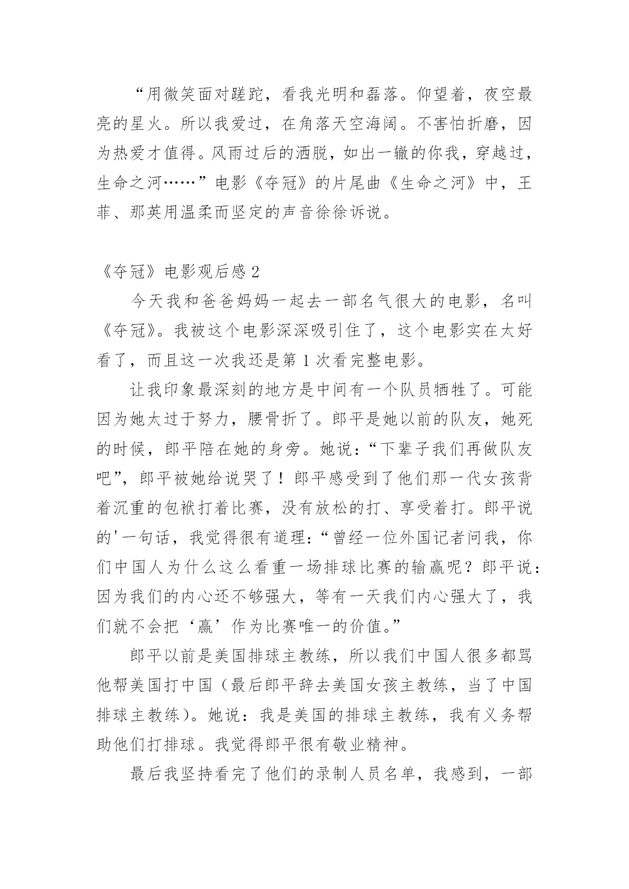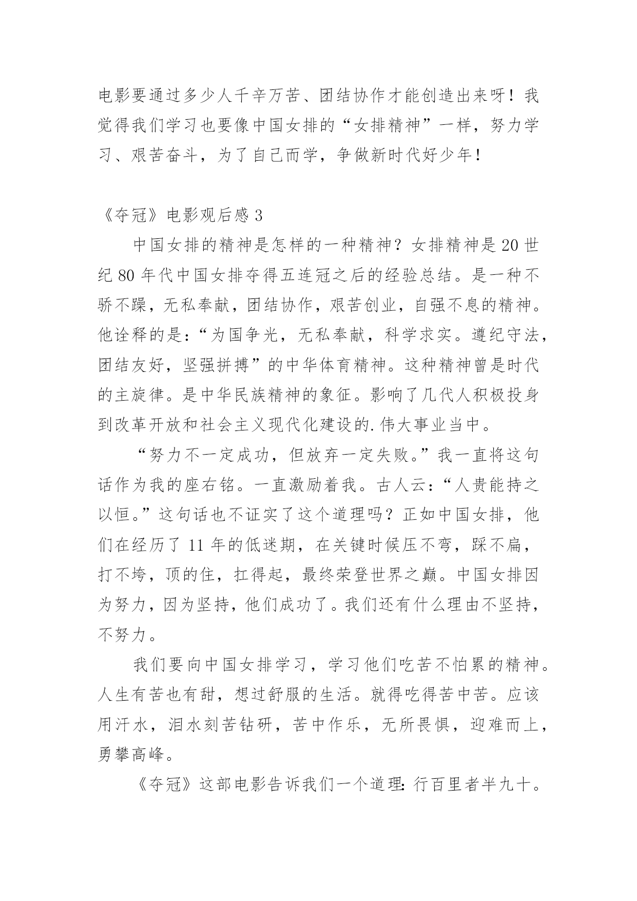 《夺冠》电影观后感看完一部影视作品以后,这次观看让你有什么体会呢?不妨坐下来好好写写观后感吧。你想知道观后感怎么写吗?以下是小编整理的《夺冠》电影观后感,仅供参考,大家一起来看看吧。《夺冠》电影观后感1坚不可摧的力量,就是“女排精神”。女排姑娘们即便是失败了,也没有意志消沉、“团队精神”依然存在,“军心”依然牢不可摧。女排姑娘们脚踏实地、年复一年、日复一日的“地狱式”训练,她们将最美年华奉献了出来,不攀美、不浓妆艳抹,整日身处“与世隔绝”的环境,用尽全力塑造了永不言败的斗志和“女排精神”。女排精神好似一颗火种,一代代人被她感召、受她鼓舞,激发出奋进的动力,这力量源源不断、薪火相传。这种精气神,不仅体现在历届女排教练员、队员身上,也展现在每一个被她感染、热爱她、传承她的`人身上。女排精神也走出国门,为世界人民认可、钦佩,成为中华民族精神的重要内涵之一。在2016年里约奥运会女排决赛现场,随着女排队长惠若琪一记利落的探头球,中国女排拿下夺冠的最后一分,英国BBC的解说员激动地说:“中国女排完美诠释了奥运精神!中国证明了,重要的不是如何开始,而是怎样结束。中国是本届奥运的冠军!”“用微笑面对蹉跎,看我光明和磊落。仰望着,夜空最亮的星火。所以我爱过,在角落天空海阔。不害怕折磨,因为热爱才值得。风雨过后的洒脱,如出一辙的你我,穿越过,生命之河……”电影《夺冠》的片尾曲《生命之河》中,王菲、那英用温柔而坚定的声音徐徐诉说。《夺冠》电影观后感2今天我和爸爸妈妈一起去一部名气很大的电影,名叫《夺冠》。我被这个电影深深吸引住了,这个电影实在太好看了,而且这一次我还是第1次看完整电影。让我印象最深刻的地方是中间有一个队员牺牲了。可能因为她太过于努力,腰骨折了。郎平是她以前的队友,她死的时候,郎平陪在她的身旁。她说:“下辈子我们再做队友吧”,郎平被她给说哭了!郎平感受到了他们那一代女孩背着沉重的包袱打着比赛,没有放松的打、享受着打。郎平说的'一句话,我觉得很有道理:“曾经一位外国记者问我,你们中国人为什么这么看重一场排球比赛的输赢呢?郎平说:因为我们的内心还不够强大,等有一天我们内心强大了,我们就不会把‘赢’作为比赛唯一的价值。”郎平以前是美国排球主教练,所以我们中国人很多都骂他帮美国打中国(最后郎平辞去美国女孩主教练,当了中国排球主教练)。她说:我是美国的排球主教练,我有义务帮助他们打排球。我觉得郎平很有敬业精神。最后我坚持看完了他们的录制人员名单,我感到,一部电影要通过多少人千辛万苦、团结协作才能创造出来呀!我觉得我们学习也要像中国女排的“女排精神”一样,努力学习、艰苦奋斗,为了自己而学,争做新时代好少年!《夺冠》电影观后感3中国女排的精神是怎样的一种精神?女排精神是20世纪80年代中国女排夺得五连冠之后的经验总结。是一种不骄不躁,无私奉献,团结协作,艰苦创业,自强不息的精神。他诠释的是:“为国争光,无私奉献,科学求实。遵纪守法,团结友好,坚强拼搏”的中华体育精神。这种精神曾是时代的主旋律。是中华民族精神的象征。影响了几代人积极投身到改革开放和社会主义现代化建设的.伟大事业当中。“努力不一定成功,但放弃一定失败。”我一直将这句话作为我的座右铭。一直激励着我。古人云:“人贵能持之以恒。”这句话也不证实了这个道理吗?正如中国女排,他们在经历了11年的低迷期,在关键时候压不弯,踩不扁,打不垮,顶的住,扛得起,最终荣登世界之巅。中国女排因为努力,因为坚持,他们成功了。我们还有什么理由不坚持,不努力。我们要向中国女排学习,学习他们吃苦不怕累的精神。人生有苦也有甜,想过舒服的生活。就得吃得苦中苦。应该用汗水,泪水刻苦钻研,苦中作乐,无所畏惧,迎难而上,勇攀高峰。《夺冠》这部电影告诉我们一个道理:行百里者半九十。我们应该不言辛苦,踏实肯干,勇于创造,奋力拼搏,铭记初心,牢记使命,将女排精神融入生活,融入学习,融入工作,融入人生。为祖国繁荣昌盛,实现伟大复兴,贡献自己的力量,创造更美好的未来。
