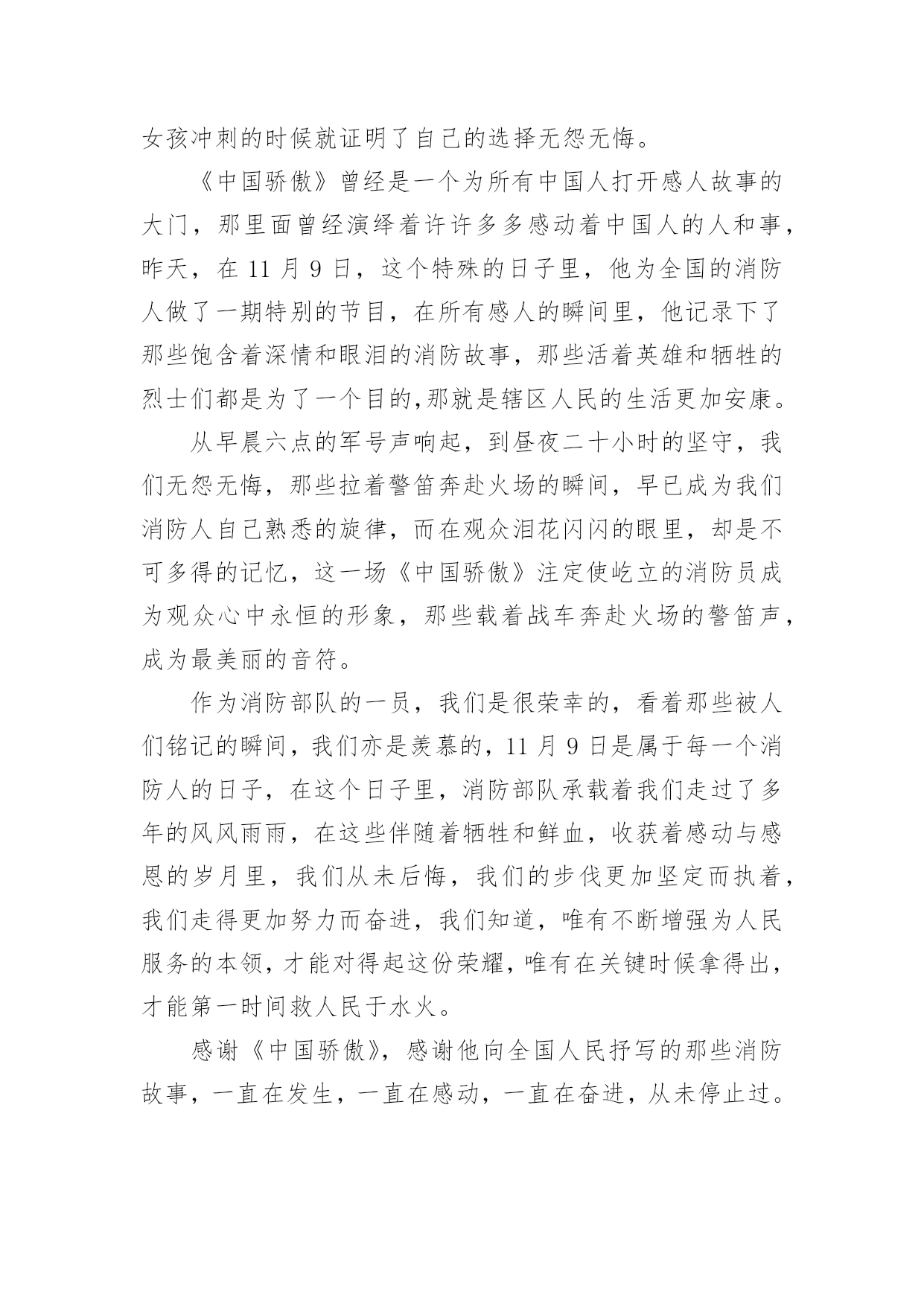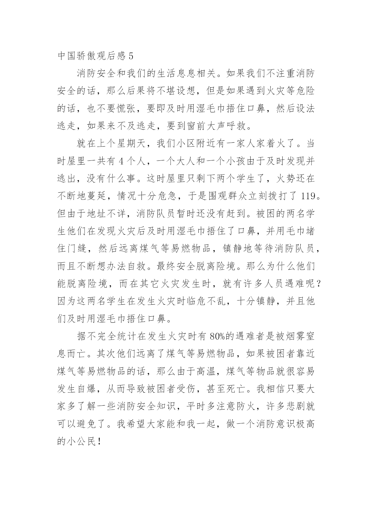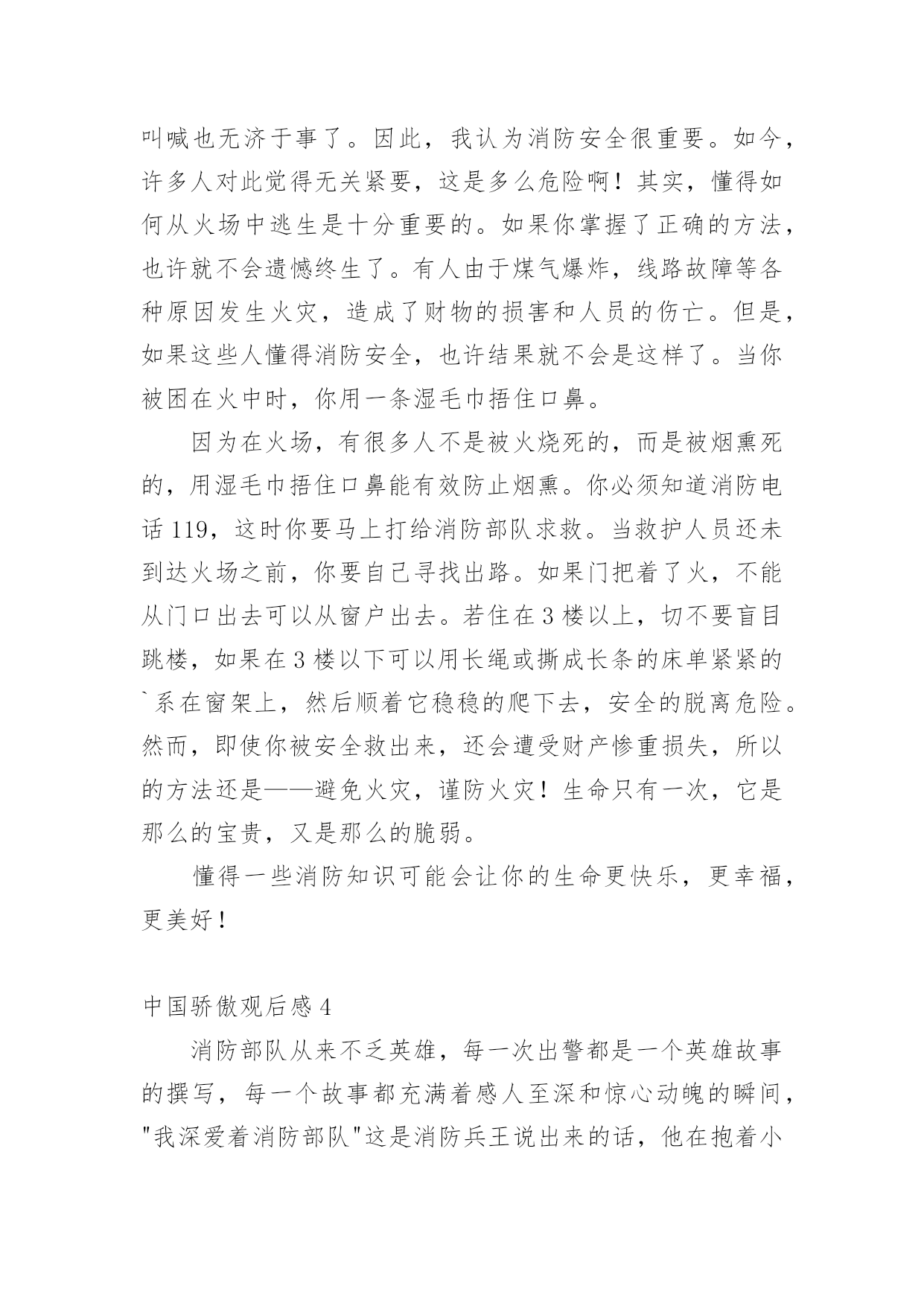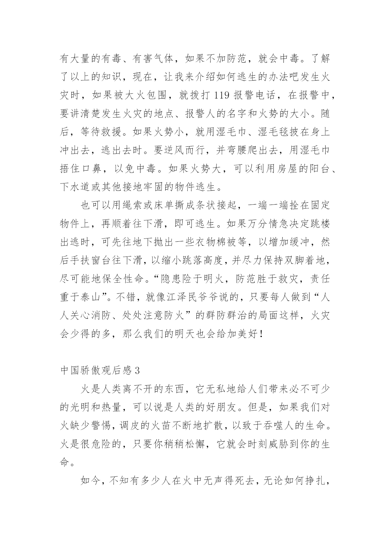 中国骄傲观后感中国骄傲观后感5篇当看完一部影视作品后,大家一定收获不少吧,让我们好好写份观后感,把你的收获感想写下来吧。可能你现在毫无头绪吧,以下是小编精心整理的中国骄傲观后感,供大家参考借鉴,希望可以帮助到有需要的朋友。中国骄傲观后感1自从盘古开天,火是人类最伟大的发明。我们的生活离不开火,但是如果用火不当,火就像一个恶魔,吞噬人类的生命和财产。所以说它就像一把“双刃剑”。我们在日常生活中应该小心谨慎地用火。只有这样,我们才能建造美好的家园。下面我来讲一个亲身经历的教训。还是我五岁那年。我一个人在房间里玩,无意之间看到了一个打火机,我学着爸爸的样子使劲按了几下,“咔嚓”一声,没想到竟然被我给点着了,差点烧到我的手,我非常害怕。便把燃烧着的打火机扔进了垃圾桶,没想到垃圾桶也烧起来了。我迅速把爸爸妈妈扯进房间。爸爸妈妈一进门便吓得目瞪口呆,立即拿来了一盆清水,把燃烧的垃圾桶扑灭了。这下我才松了口气,后来爸爸妈妈严肃地批评了我,告诉我:如果不及时扑灭的话,后果将不堪设想。因为,火不断地蔓延,会把整栋楼化为灰烬。并告诫我以后再也不能犯同样的错误了。从那一刻起我就明白了:不是任何东西都可以拿来玩,特别是火这一类危险物品,千万不能随便玩弄。否则,失去的将是宝贵的生命。随着年龄的慢慢增长,我了解了更多的消防知识,也更加明白了“水火无情”的道理。一但遇到着火,千万不要慌张,一定要保持冷静镇定,早报警,牢记火警电话“119”,报警时讲清楚地址。起火原因等;决不能贪恋财物。首先要逃跑或找大人;逃跑时应用湿毛巾捂住鼻子,以免中毒;同样也要严守秩序,不能争先恐后,互相拥挤,自相踩踏,以免发生不该发生的悲剧。每个人只有一次生命,我们要珍惜自己和他人宝贵的生命。同学们,让我们多了解消防常识,从小树立消防意识,争做消防安全小卫士。中国骄傲观后感2俗话说:水火无情,这一点也没错,因为,有多少例子可以证明,火灾是大多数在不经意的情况下就发生了。常说我们离不开火,无论是哪一样,烧开水,煮饭……都离不开火,或是两面派,有的时候,你不好好使用它,它也会有邪恶的一面,发生火灾事故,不仅影响大,而且损失也大,所以,作为一名热爱生活的小学生,就应该掌握一些消防知识,如:使用灭火器的只是,初期火灾扑救方法以及会报火警119。和火在一起做坏事的还有一个东西,是火的“铁哥们”——烟雾。可别小瞧它,许多人在火灾失去生命的“罪魁祸首”的也就是它,为什么它会让死亡率增高呢?那是因为烟雾中含有大量的有毒、有害气体,如果不加防范,就会中毒。了解了以上的知识,现在,让我来介绍如何逃生的办法吧发生火灾时,如果被大火包围,就拨打119报警电话,在报警中,要讲清楚发生火灾的地点、报警人的名字和火势的大小。随后,等待救援。如果火势小,就用湿毛巾、湿毛毯披在身上冲出去,逃出去时。要逆风而行,并弯腰爬出去,用湿毛巾捂住口鼻,以免中毒。如果火势大,可以利用房屋的阳台、下水道或其他接地牢固的物件逃生。也可以用绳索或床单撕成条状接起,一端一端拴在固定物件上,再顺着往下滑,即可逃生。如果万分情急决定跳楼出逃时,可先往地下抛出一些衣物棉被等,以增加缓冲,然后手扶窗台往下滑,以缩小跳落高度,并尽力保持双脚着地,尽可能地保全性命。“隐患险于明火,防范胜于救灾,责任重于泰山”。不错,就像江泽民爷爷说的,只要每人做到“人人关心消防、处处注意防火”的群防群治的局面这样,火灾会少得的多,那么我们的明天也会给加美好!中国骄傲观后感3火是人类离不开的东西,它无私地给人们带来必不可少的光明和热量,可以说是人类的好朋友。但是,如果我们对火缺少警惕,调皮的火苗不断地扩散,以致于吞噬人的生命。火是很危险的,只要你稍稍松懈,它就会时刻威胁到你的生命。如今,不知有多少人在火中无声得死去,无论如何挣扎,叫喊也无济于事了。因此,我认为消防安全很重要。如今,许多人对此觉得无关紧要,这是多么危险啊!其实,懂得如何从火场中逃生是十分重要的。如果你掌握了正确的方法,也许就不会遗憾终生了。有人由于煤气爆炸,线路故障等各种原因发生火灾,造成了财物的损害和人员的伤亡。但是,如果这些人懂得消防安全,也许结果就不会是这样了。当你被困在火中时,你用一条湿毛巾捂住口鼻。因为在火场,有很多人不是被火烧死的,而是被烟熏死的,用湿毛巾捂住口鼻能有效防止烟熏。你必须知道消防电话119,这时你要马上打给消防部队求救。当救护人员还未到达火场之前,你要自己寻找出路。如果门把着了火,不能从门口出去可以从窗户出去。若住在3楼以上,切不要盲目跳楼,如果在3楼以下可以用长绳或撕成长条的床单紧紧的`系在窗架上,然后顺着它稳稳的爬下去,安全的脱离危险。然而,即使你被安全救出来,还会遭受财产惨重损失,所以的方法还是——避免火灾,谨防火灾!生命只有一次,它是那么的宝贵,又是那么的脆弱。懂
