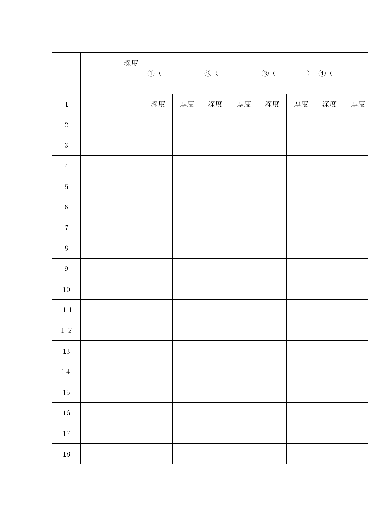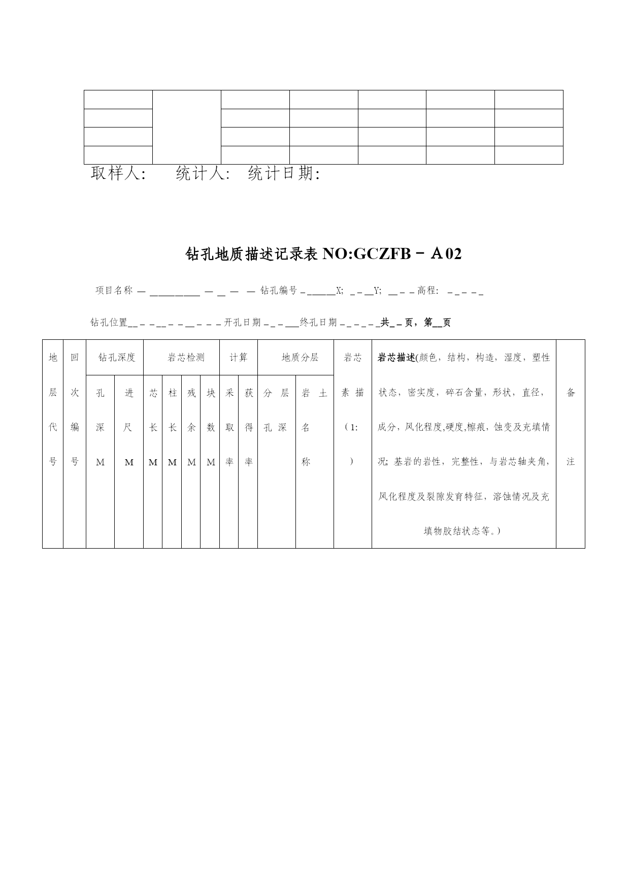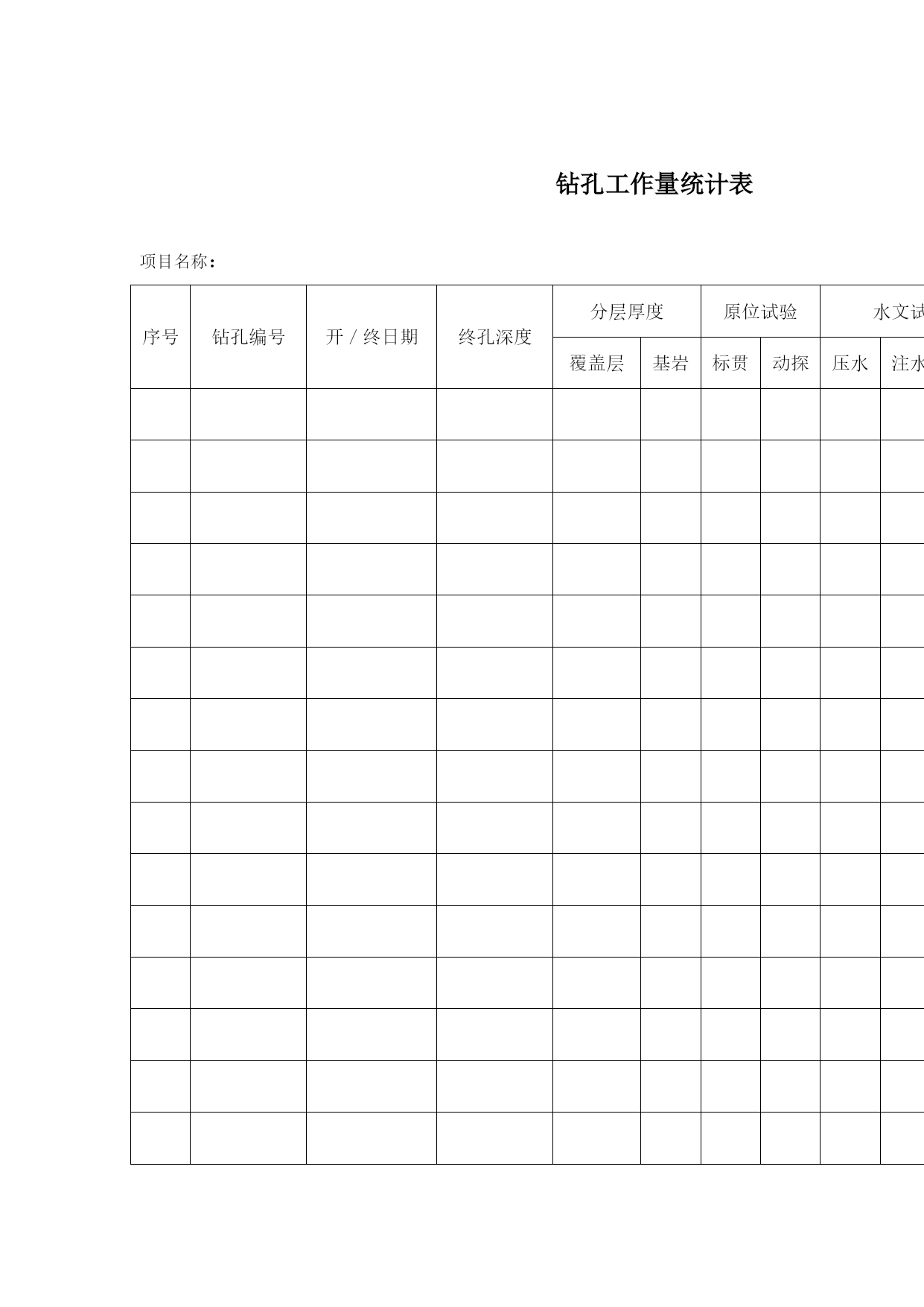 地质勘探原始记录表格(完整资料)(可以直接使用,可编辑优秀版资料,欢迎下载)地质勘探原始记录表格岩土样品统计单项目名称:NO:GCZFB—C3钻孔编号样品类别样品编号岩土名称取样深度样品长度取样日期取样人:统计人:统计日期:钻孔地质描述记录表NO:GCZFB-A02项目名称___________钻孔编号_______X;____Y;____高程:_____钻孔位置_____________开孔日期______终孔日期______共__页,第__页地层代号回次编号钻孔深度岩芯检测计算地质分层岩芯素描(1:)岩芯描述(颜色,结构,构造,湿度,塑性状态,密实度,碎石含量,形状,直径,成分,风化程度,硬度,檫痕,蚀变及充填情况;基岩的岩性,完整性,与岩芯轴夹角,风化程度及裂隙发育特征,溶蚀情况及充填物胶结状态等。)备注孔深M进尺M芯长M柱长M残余M块数M采取率获得率分层孔深岩土名称编录员________________年___月___日钻孔工作量统计表项目名称:NO:GCZFB-C01序号钻孔编号开/终日期终孔深度分层厚度原位试验水文试验取样覆盖层基岩标贯动探压水注水抽水土样砂样岩样统计人:统计日期:钻孔稳定水位综合记录表项目名称:NO:GCZFB-C02序号钻孔编号高程H开/终孔日期终孔深度观测日期稳定水位深度水位高程观测人:钻孔岩土分层统计表项目名称:NOGCZFB-C4序号钻孔编号终孔深度分层情况①()②()③()④()1深度厚度深度厚度深度厚度深度厚度23456789101112131415161718192021222324252627282930统计人:统计日期:钻孔注水试验原始记录表NO:GCZFB—BO9项目名称试验编号钻孔深度钻孔编号试验类型稳定水位试验前稳定水位观测记录表正式注水试验记录表观测时间h/min间隔时间min水位深度M水位变化CM试验装置示意图(比例:1:)试验时间h/min间隔时间min注水量水位情况流量表读数L注入量L流量变化水位深度水位变化试验装置说明钻孔深度试验深度试验段长套管深度注水方式测水方法试段孔径试验说明计算水位观测日期_________试验日期________观测者____试验者____记录者____检测者____钻孔地下水位观测记录表NO:GCZFB-B08项目名称__________________观测类型________共__页钻孔编号__________________孔口高程________第__页观测日期观测时间间隔时间回次钻孔深度套管深度孔内水位水位变化水位高程高程变化备注观测者______记录者______审核______观测时间________钻孔压水试验记录表NO:GCZFB-B08项目名称钻孔编号试验编号试段长度试验深度至工作管长度表口距离稳定水位钻孔深度试验日期压力阶段表头压力MPa阶段总压力MPa时间分析流量分析试验统计与计算试验前水位观测记录表时间h:min间隔时间min流量表读数L/min流量L/min观测时间h间隔时间min水位深度m水位变化cm试验装备压水器类型流量表型号压力表型号水位仪型号记时器型号钻杆内径止水方式计算总压力试验段长稳定流量压力损失LU值分析曲线类型P—Q曲线分析表PQ试验说明试验者钻孔动力触探原始记录表NO:GCZFB-B11项目名称________________钻孔编号_______共__页,第__页触探类型落距动探头长度触探锤重量落锤方式动探头锥度试段编号预备动力触探试验正式动力触探试验预击深度M锤击数序号击入深度M触探杆长度M锤击数N修正系数修正后击数N备注自m至m计m自m至m计m试验者_____记录者_____审核者_____试验日期_________钻孔抽水试验观测记录表NO:GCZFB—B15项目名称______钻孔编号___试验编号___孔口高程___共_页试验方法______试段深度___套管深度___稳定水位___第_页观测时间流量观测水位观测温度试验装置说明及其它情况说明.日期时间(h/min/s)间隔时间流量表读数(L)流量(L)每秒流量(L)流量变化水位水位降深水温气温机台编号______机长_____班长____观测员____记录员____钻孔抽水试验原始记录表NO:GCZFB-B10共页,第页项目名称试验编号稳定水位钻孔编号试验孔深抽水设备试验前水位观测记录表钻孔抽水试验现场记录表时间水位试验装置说明时间分析抽水流量计算水位温度时间间隔时间水位深度水位变化时间间隔时间流量表读数L流量L流量变化L/s平均流量水位埋深水位变化地面气温地下水温观测者____
