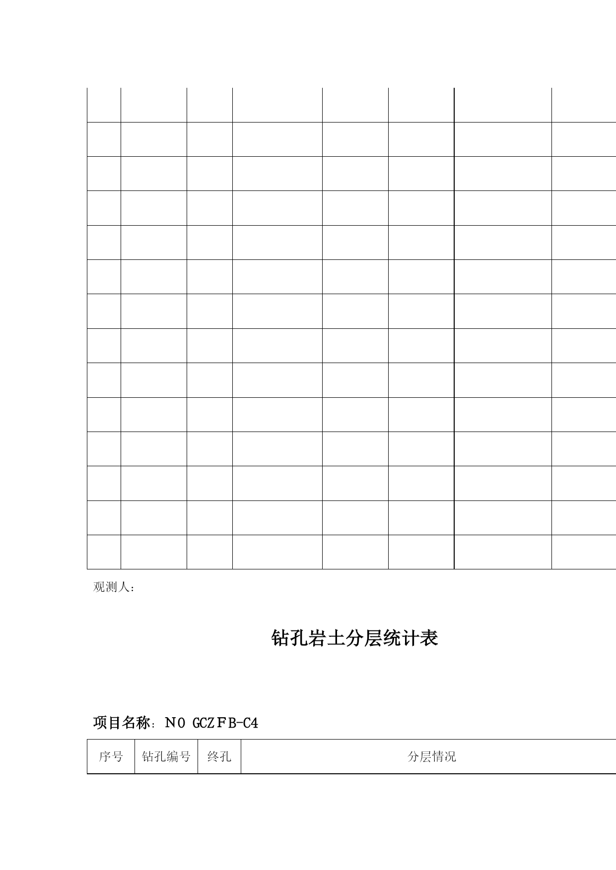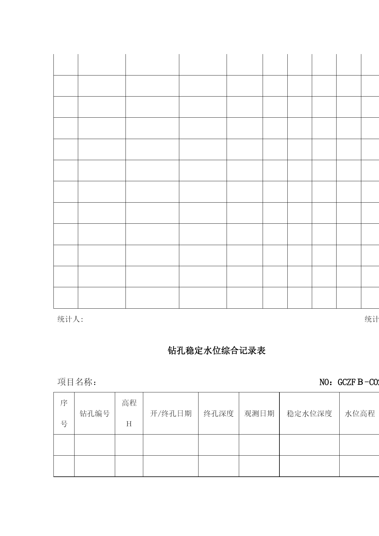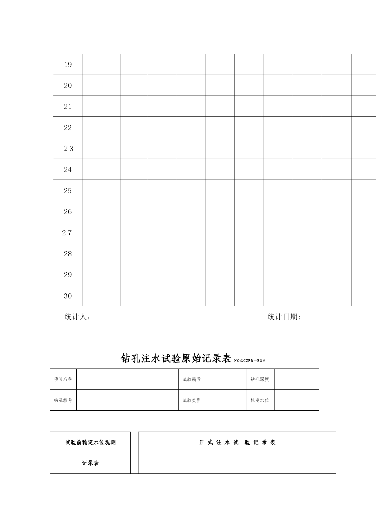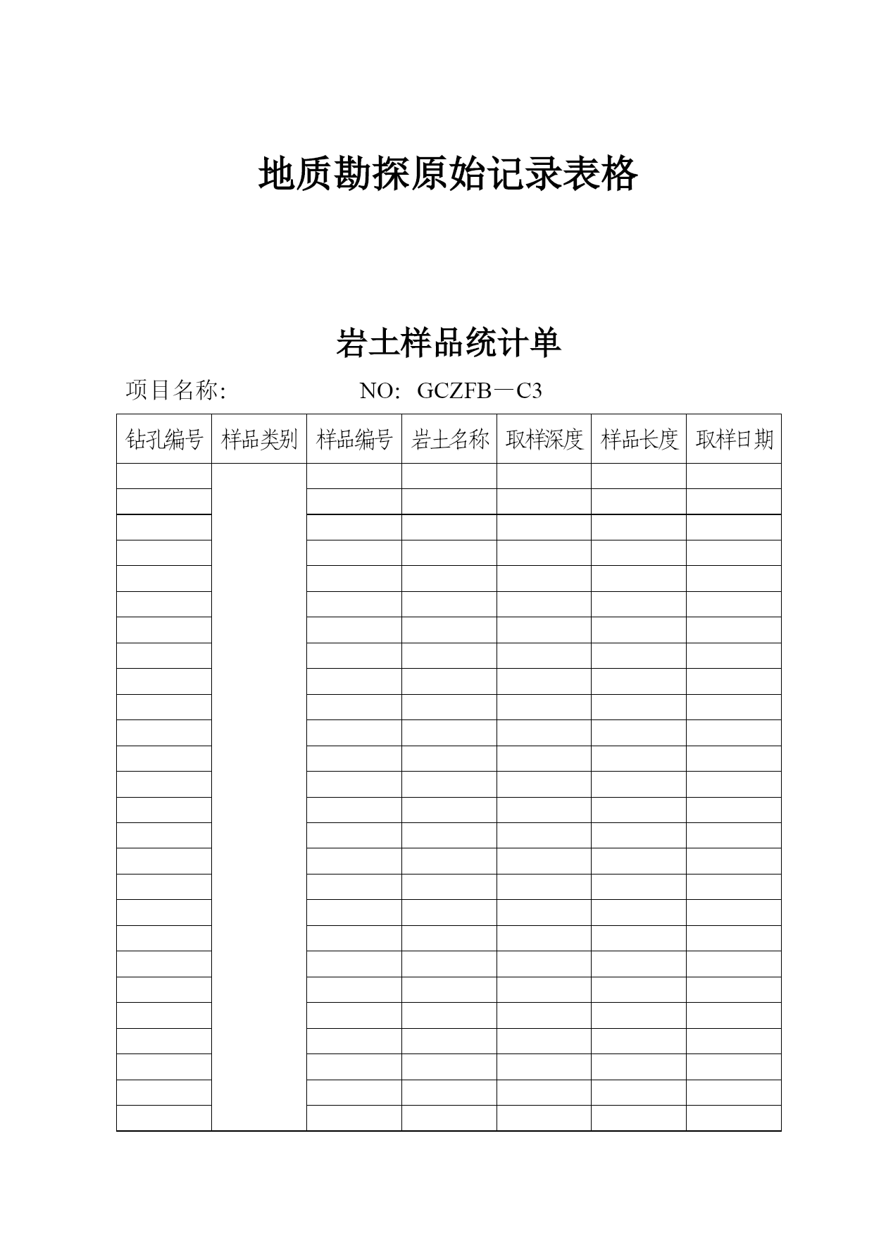 地质勘探原始记录表格(完整资料)(可以直接使用,可编辑优秀版资料,欢迎下载)地质勘探原始记录表格岩土样品统计单项目名称:NO:GCZFB—C3钻孔编号样品类别样品编号岩土名称取样深度样品长度取样日期取样人:统计人:统计日期:钻孔地质描述记录表NO:GCZFB-A02项目名称___________钻孔编号_______X;____Y;____高程:_____钻孔位置_____________开孔日期______终孔日期______共__页,第__页地层代号回次编号钻孔深度岩芯检测计算地质分层岩芯素描(1:)岩芯描述(颜色,结构,构造,湿度,塑性状态,密实度,碎石含量,形状,直径,成分,风化程度,硬度,檫痕,蚀变及充填情况;基岩的岩性,完整性,与岩芯轴夹角,风化程度及裂隙发育特征,溶蚀情况及充填物胶结状态等。)备注孔深M进尺M芯长M柱长M残余M块数M采取率获得率分层孔深岩土名称编录员________________年___月___日钻孔工作量统计表项目名称:NO:GCZFB-C01序号钻孔编号开/终日期终孔深度分层厚度原位试验水文试验取样覆盖层基岩标贯动探压水注水抽水土样砂样岩样统计人:统计日期:钻孔稳定水位综合记录表项目名称:NO:GCZFB-C02序号钻孔编号高程H开/终孔日期终孔深度观测日期稳定水位深度水位高程观测人:钻孔岩土分层统计表项目名称:NOGCZFB-C4序号钻孔编号终孔深度分层情况①()②()③()④()1深度厚度深度厚度深度厚度深度厚度23456789101112131415161718192021222324252627282930统计人:统计日期:钻孔注水试验原始记录表NO:GCZFB—BO9项目名称试验编号钻孔深度钻孔编号试验类型稳定水位试验前稳定水位观测记录表正式注水试验记录表观测时间h/min间隔时间min水位深度M水位变化CM试验装置示意图(比例:1:)试验时间h/min间隔时间min注水量水位情况流量表读数L注入量L流量变化水位深度水位变化试验装置说明钻孔深度试验深度试验段长套管深度注水方式测水方法试段孔径试验说明计算水位观测日期_________试验日期________观测者____试验者____记录者____检测者____钻孔地下水位观测记录表NO:GCZFB-B08项目名称__________________观测类型________共__页钻孔编号__________________孔口高程________第__页观测日期观测时间间隔时间回次钻孔深度套管深度孔内水位水位变化水位高程高程变化备注观测者______记录者______审核______观测时间________钻孔压水试验记录表NO:GCZFB-B08项目名称钻孔编号试验编号试段长度试验深度至工作管长度表口距离稳定水位钻孔深度试验日期压力阶段表头压力MPa阶段总压力MPa时间分析流量分析试验统计与计算试验前水位观测记录表时间h:min间隔时间min流量表读数L/min流量L/min观测时间h间隔时间min水位深度m水位变化cm试验装备压水器类型流量表型号压力表型号水位仪型号记时器型号钻杆内径止水方式计算总压力试验段长稳定流量压力损失LU值分析曲线类型P—Q曲线分析表PQ试验说明试验者钻孔动力触探原始记录表NO:GCZFB-B11项目名称________________钻孔编号_______共__页,第__页触探类型落距动探头长度触探锤重量落锤方式动探头锥度试段编号预备动力触探试验正式动力触探试验预击深度M锤击数序号击入深度M触探杆长度M锤击数N修正系数修正后击数N备注自m至m计m自m至m计m试验者_____记录者_____审核者_____试验日期_________钻孔抽水试验观测记录表NO:GCZFB—B15项目名称______钻孔编号___试验编号___孔口高程___共_页试验方法______试段深度___套管深度___稳定水位___第_页观测时间流量观测水位观测温度试验装置说明及其它情况说明.日期时间(h/min/s)间隔时间流量表读数(L)流量(L)每秒流量(L)流量变化水位水位降深水温气温机台编号______机长_____班长____观测员____记录员____钻孔抽水试验原始记录表NO:GCZFB-B10共页,第页项目名称试验编号稳定水位钻孔编号试验孔深抽水设备试验前水位观测记录表钻孔抽水试验现场记录表时间水位试验装置说明时间分析抽水流量计算水位温度时间间隔时间水位深度水位变化时间间隔时间流量表读数L流量L流量变化L/s平均流量水位埋深水位变化地面气温地下水温观测者____