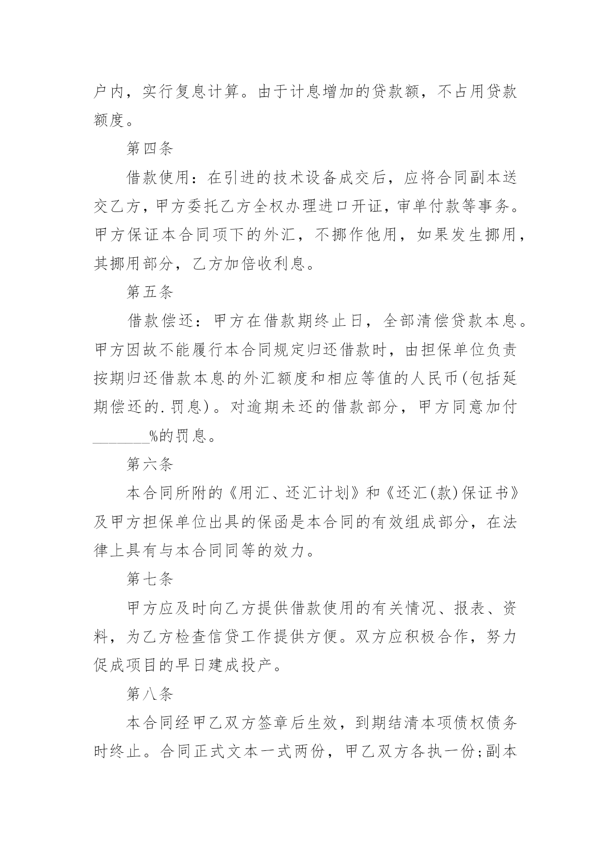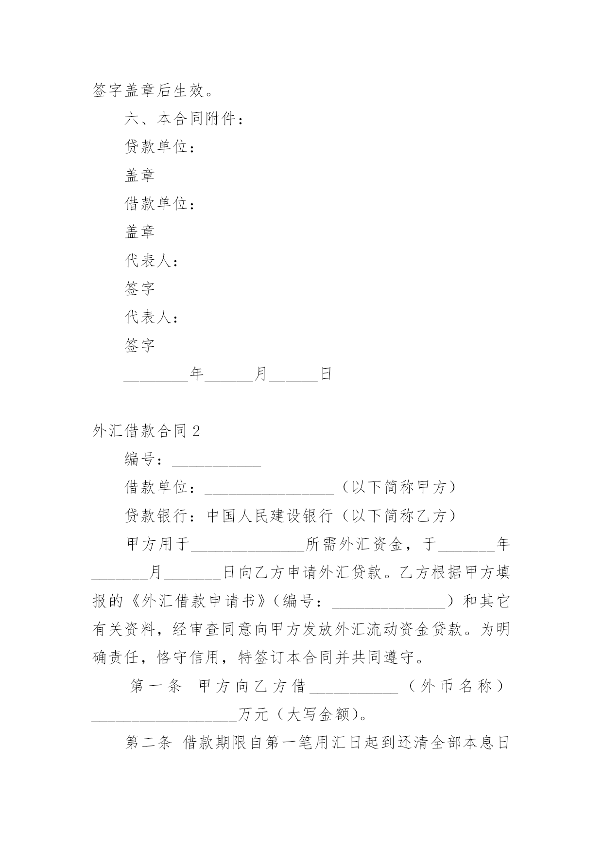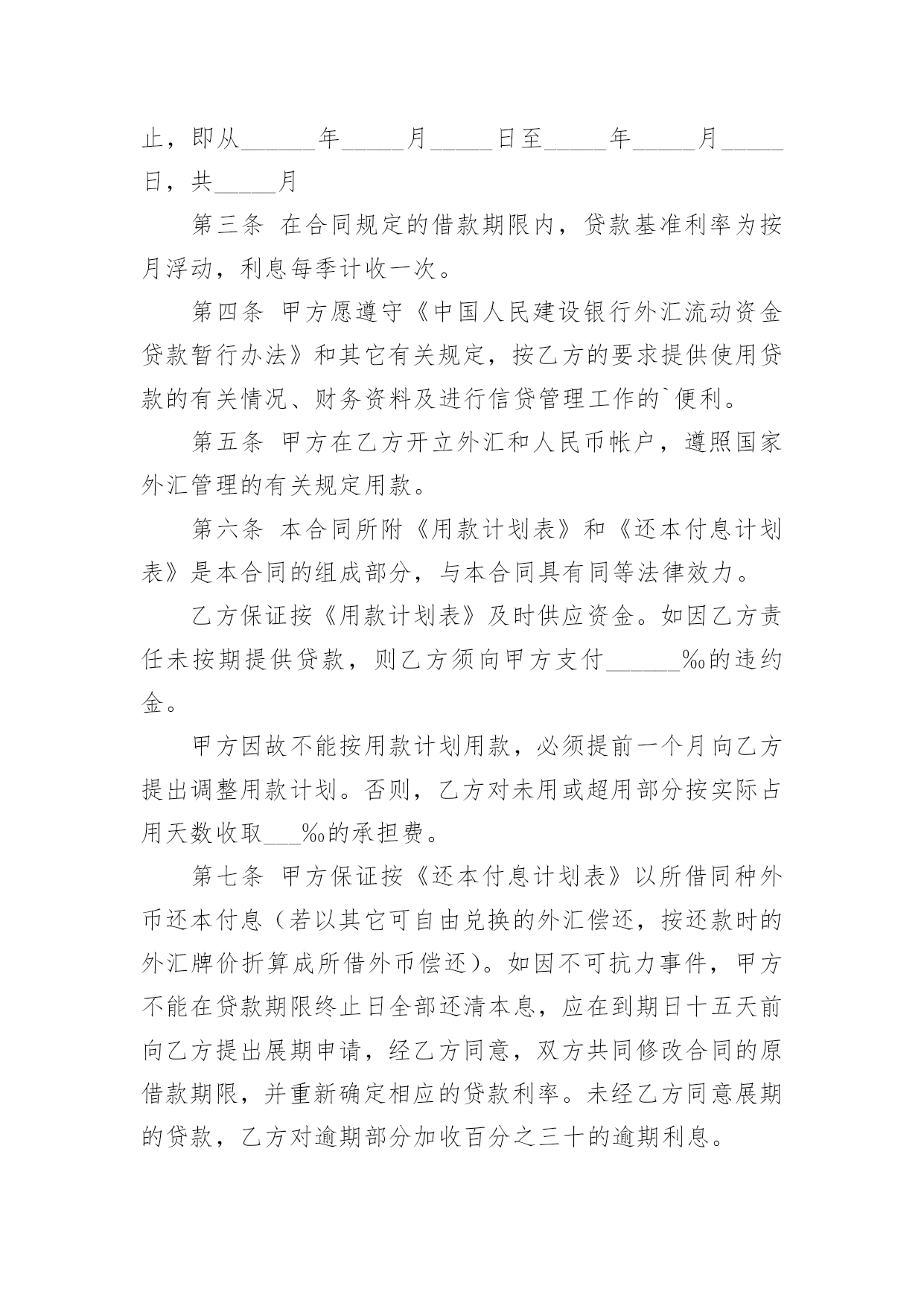 外汇借款合同【热】外汇借款合同现今很多公民的维权意识在不断增强,越来越多事情需要用到合同,合同的签订是对双方之间权利义务的最好规范。那么一般合同是怎么起草的呢?下面是小编收集整理的外汇借款合同,仅供参考,希望能够帮助到大家。外汇借款合同1借方根据_______________号文件,(项目)_______________所需资金向贷方提出申请,经贷方审查同意发放贷款。双方经协商签订本合同,共同遵守。第一条:借款金额(大写)外汇_____________万美元配套人民币__________万元第二条:借款用途外汇贷款用于______________配套人民币贷款用于___________第三条:借款利率外汇贷款年率为%,配套人民币贷款年率为%,贷方按季收取利息,如借方未能按期付息,则转入贷款本金计收复息。在合同履行期间,如遇国家调整利率或变更计息办法,按中国工商银行总行的规定执行。第四条:借款期限外汇贷款自第一笔用汇之日起,在___个月内还清全部贷款本息,配套人民币贷款自第一笔用款之日起,在____个月内还清全部贷款本息。第五条:借款使用本合同自签订之日起___天内,借方应提出订货卡片。提出订货卡片日起___天内应对外签订定货合同。定货合同副本和用汇计划送交贷方,经贷方审查同意后对外开证、付汇。如遇特殊情况需延期用汇,借方应事先征得贷方同意并及时调整用汇计划,以作为本合同的补充条款。第六条:借款偿还借方偿还本息所用货币与所借币种必须相同,并保证在借款期限内按还款计划归还。还款计划如下。外汇贷款自第一笔用汇后第____个月开始偿还,共分______次还清,每次________万美元。配套人民币____年____月归还____万元____年____月归还____万元如因特殊原因,借方不能按期归还贷款本息,应在到期前两周内向贷方提出书面展期申请,经贷方审查同意修改原借款期限,重订利率。第七条:还款担保本合同项下的借款本息由________作为借方的担保单位,并按贷方的要求出具担保书。一旦借方未按期归还贷款本息,由担保单位承担偿还全部贷款本息的责任。第八条:违约责任一、借方未按规定的用款计划用款,造成未用或超用部分须向贷方支付%的承担费。贷方因本身责任未按用款计划提供贷款,应向借方支付%的违约金。二、借方未按合同规定使用贷款,贷方有权停止或收回全部或部分贷款,如发生挪用贷款,借方除在限期内纠正外,对贷款挪用部分在原贷款利率的基础上加付50%的罚息。三、借方未按期归还贷款,贷方有权从借方的其它帐户中扣收,并对逾期部分从逾期之日起加收%的`利息。第九条:其它一、发生下列情况之一时,贷方有权停止发放贷款并立即或限期收回已发放的贷款。(一)贷方收到借方提供不真实的情况、报表和资料。(二)借方由于各种原因造成无力偿还贷款本息,资产总额又不足以抵偿其负债总额。(三)借方的保证人已失去保证书中规定的能力。二、贷方有权按合同规定检查、监督贷款的使用情况。借方应向贷方提供有关报表和资料。三、借方所提供的借款申请书、凭证、留成外汇申请书、用款和还款计划及有关其它书面材料,均作为本合同的组成部分,具有同等法律效力。四、双方议定的其它条款五、本合同一式___份,经借、贷双方及保证方共同签字盖章后生效。六、本合同附件:贷款单位:盖章借款单位:盖章代表人:签字代表人:签字____年___月___日外汇借款合同2编号:___________借款单位:________________(以下简称甲方)贷款银行:中国人民建设银行(以下简称乙方)甲方用于______________所需外汇资金,于_______年_______月_______日向乙方申请外汇贷款。乙方根据甲方填报的《外汇借款申请书》(编号:______________)和其它有关资料,经审查同意向甲方发放外汇流动资金贷款。为明确责任,恪守信用,特签订本合同并共同遵守。第一条甲方向乙方借___________(外币名称)__________________万元(大写金额)。第二条借款期限自第一笔用汇日起到还清全部本息日止,即从______年_____月_____日至_____年_____月_____日,共_____月第三条在合同规定的借款期限内,贷款基准利率为按月浮动,利息每季计收一次。第四条甲方愿遵守《中国人民建设银行外汇流动资金贷款暂行办法》和其它有关规定,按乙方的要求提供使用贷款的有关情况、财务资料及进行信贷管理工作的`便利。第五条甲方在乙方开立外汇和人民币帐户,遵照国家外汇管理的有关规定用款。第六条本合同所附《用款计划表》和《还本付息计划表》是本合同的组成部分,与本合同具有同等法律效力。乙方保证按《用款计划表》及时供应资金。如因乙方责任未按期提供贷款,则乙方须向甲方支付______‰的违约金。甲方