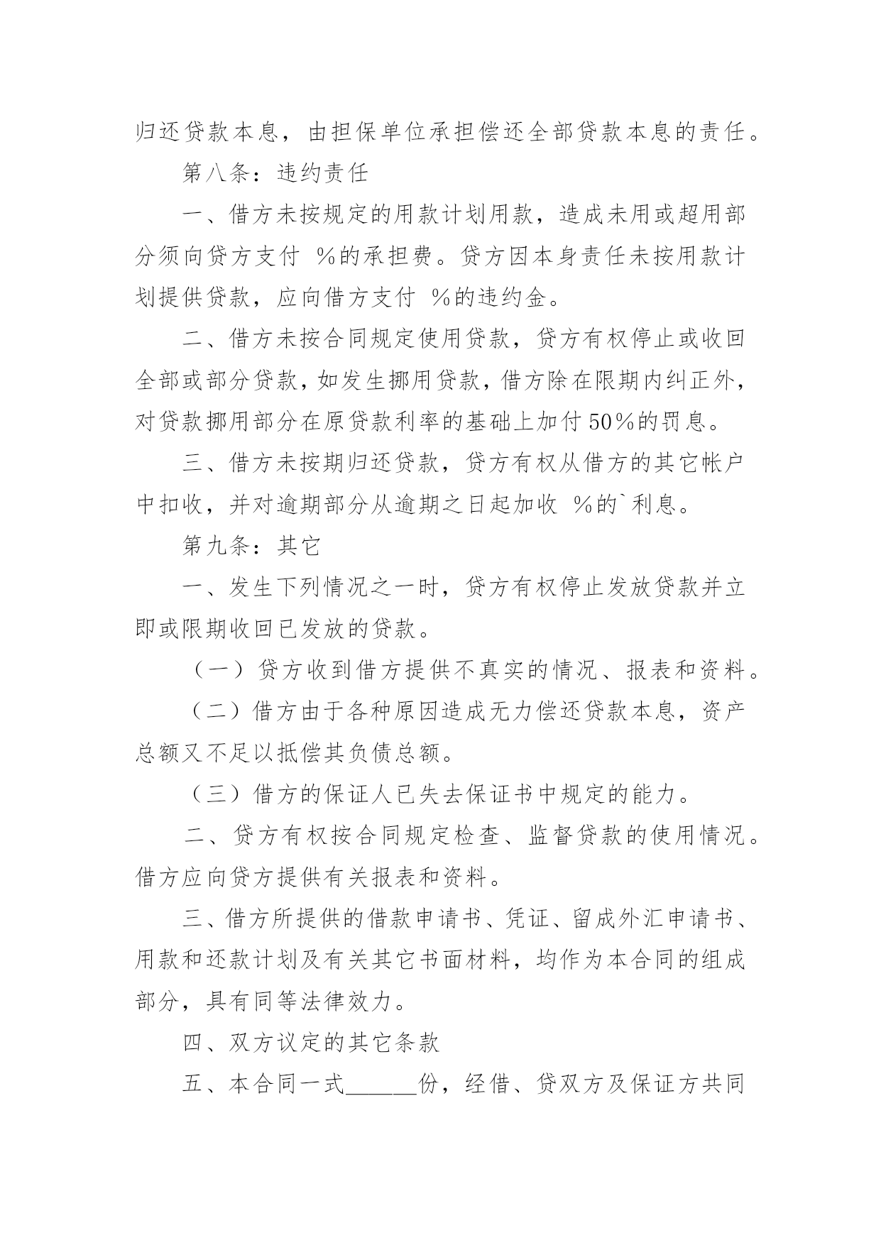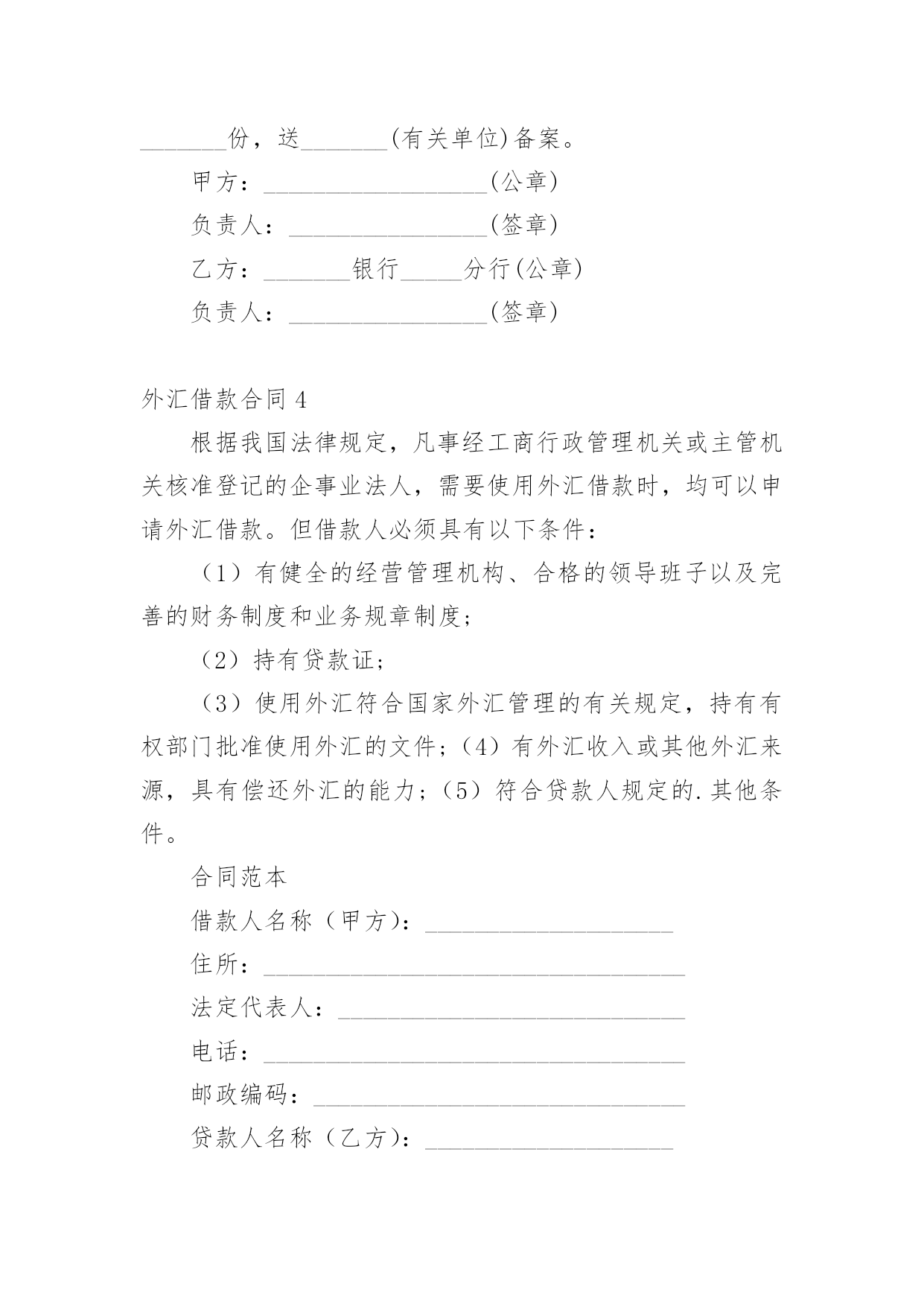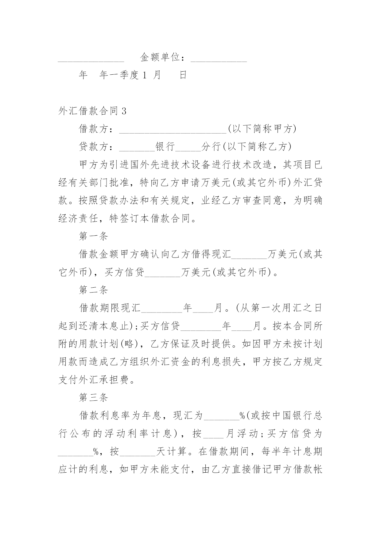 外汇借款合同【热】外汇借款合同现今很多公民的维权意识在不断增强,越来越多事情需要用到合同,合同的签订是对双方之间权利义务的最好规范。那么一般合同是怎么起草的呢?下面是小编收集整理的外汇借款合同,仅供参考,希望能够帮助到大家。外汇借款合同1借方根据_______________号文件,(项目)_______________所需资金向贷方提出申请,经贷方审查同意发放贷款。双方经协商签订本合同,共同遵守。第一条:借款金额(大写)外汇_____________万美元配套人民币__________万元第二条:借款用途外汇贷款用于______________配套人民币贷款用于___________第三条:借款利率外汇贷款年率为%,配套人民币贷款年率为%,贷方按季收取利息,如借方未能按期付息,则转入贷款本金计收复息。在合同履行期间,如遇国家调整利率或变更计息办法,按中国工商银行总行的规定执行。第四条:借款期限外汇贷款自第一笔用汇之日起,在___个月内还清全部贷款本息,配套人民币贷款自第一笔用款之日起,在____个月内还清全部贷款本息。第五条:借款使用本合同自签订之日起___天内,借方应提出订货卡片。提出订货卡片日起___天内应对外签订定货合同。定货合同副本和用汇计划送交贷方,经贷方审查同意后对外开证、付汇。如遇特殊情况需延期用汇,借方应事先征得贷方同意并及时调整用汇计划,以作为本合同的补充条款。第六条:借款偿还借方偿还本息所用货币与所借币种必须相同,并保证在借款期限内按还款计划归还。还款计划如下。外汇贷款自第一笔用汇后第____个月开始偿还,共分______次还清,每次________万美元。配套人民币____年____月归还____万元____年____月归还____万元如因特殊原因,借方不能按期归还贷款本息,应在到期前两周内向贷方提出书面展期申请,经贷方审查同意修改原借款期限,重订利率。第七条:还款担保本合同项下的借款本息由________作为借方的担保单位,并按贷方的要求出具担保书。一旦借方未按期归还贷款本息,由担保单位承担偿还全部贷款本息的责任。第八条:违约责任一、借方未按规定的用款计划用款,造成未用或超用部分须向贷方支付%的承担费。贷方因本身责任未按用款计划提供贷款,应向借方支付%的违约金。二、借方未按合同规定使用贷款,贷方有权停止或收回全部或部分贷款,如发生挪用贷款,借方除在限期内纠正外,对贷款挪用部分在原贷款利率的基础上加付50%的罚息。三、借方未按期归还贷款,贷方有权从借方的其它帐户中扣收,并对逾期部分从逾期之日起加收%的`利息。第九条:其它一、发生下列情况之一时,贷方有权停止发放贷款并立即或限期收回已发放的贷款。(一)贷方收到借方提供不真实的情况、报表和资料。(二)借方由于各种原因造成无力偿还贷款本息,资产总额又不足以抵偿其负债总额。(三)借方的保证人已失去保证书中规定的能力。二、贷方有权按合同规定检查、监督贷款的使用情况。借方应向贷方提供有关报表和资料。三、借方所提供的借款申请书、凭证、留成外汇申请书、用款和还款计划及有关其它书面材料,均作为本合同的组成部分,具有同等法律效力。四、双方议定的其它条款五、本合同一式___份,经借、贷双方及保证方共同签字盖章后生效。六、本合同附件:贷款单位:盖章借款单位:盖章代表人:签字代表人:签字____年___月___日外汇借款合同2编号:___________借款单位:________________(以下简称甲方)贷款银行:中国人民建设银行(以下简称乙方)甲方用于______________所需外汇资金,于_______年_______月_______日向乙方申请外汇贷款。乙方根据甲方填报的《外汇借款申请书》(编号:______________)和其它有关资料,经审查同意向甲方发放外汇流动资金贷款。为明确责任,恪守信用,特签订本合同并共同遵守。第一条甲方向乙方借___________(外币名称)__________________万元(大写金额)。第二条借款期限自第一笔用汇日起到还清全部本息日止,即从______年_____月_____日至_____年_____月_____日,共_____月第三条在合同规定的借款期限内,贷款基准利率为按月浮动,利息每季计收一次。第四条甲方愿遵守《中国人民建设银行外汇流动资金贷款暂行办法》和其它有关规定,按乙方的要求提供使用贷款的有关情况、财务资料及进行信贷管理工作的`便利。第五条甲方在乙方开立外汇和人民币帐户,遵照国家外汇管理的有关规定用款。第六条本合同所附《用款计划表》和《还本付息计划表》是本合同的组成部分,与本合同具有同等法律效力。乙方保证按《用款计划表》及时供应资金。如因乙方责任未按期提供贷款,则乙方须向甲方支付______‰的违约金。甲方