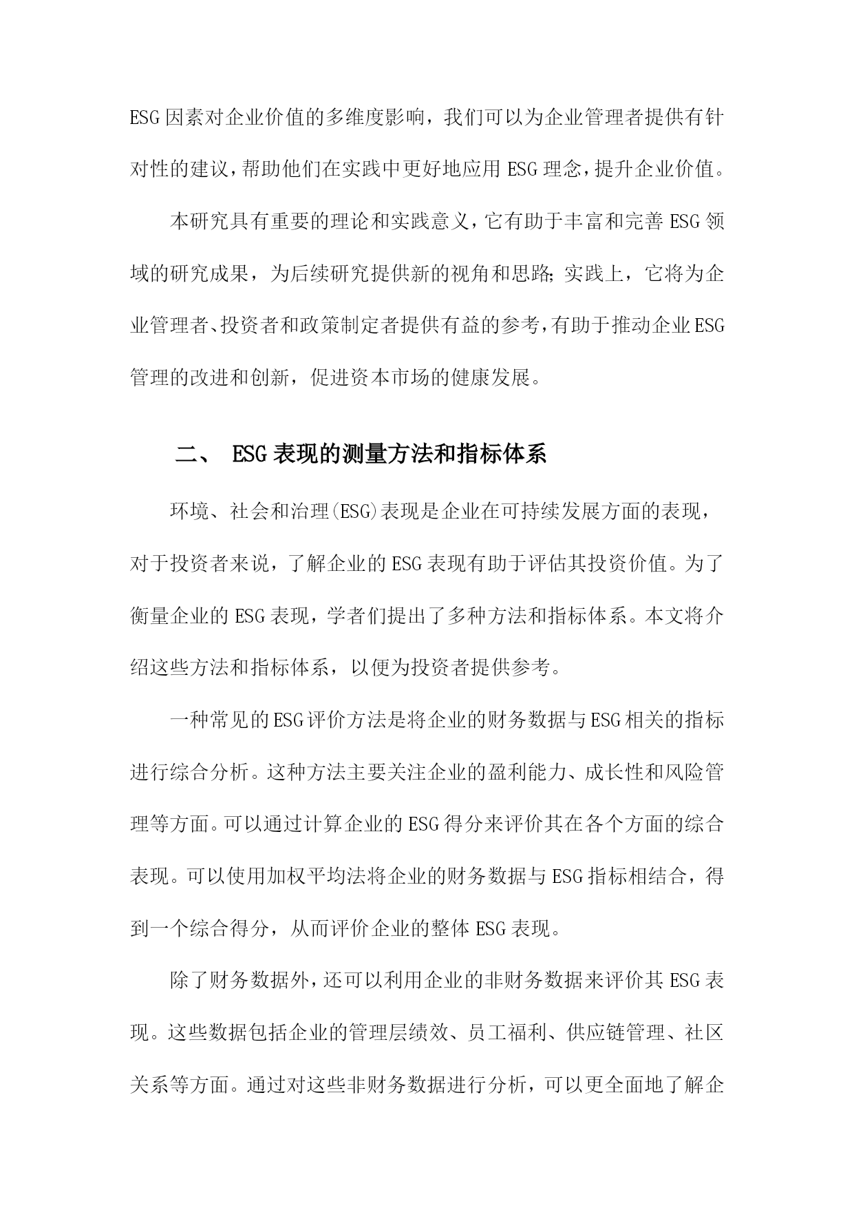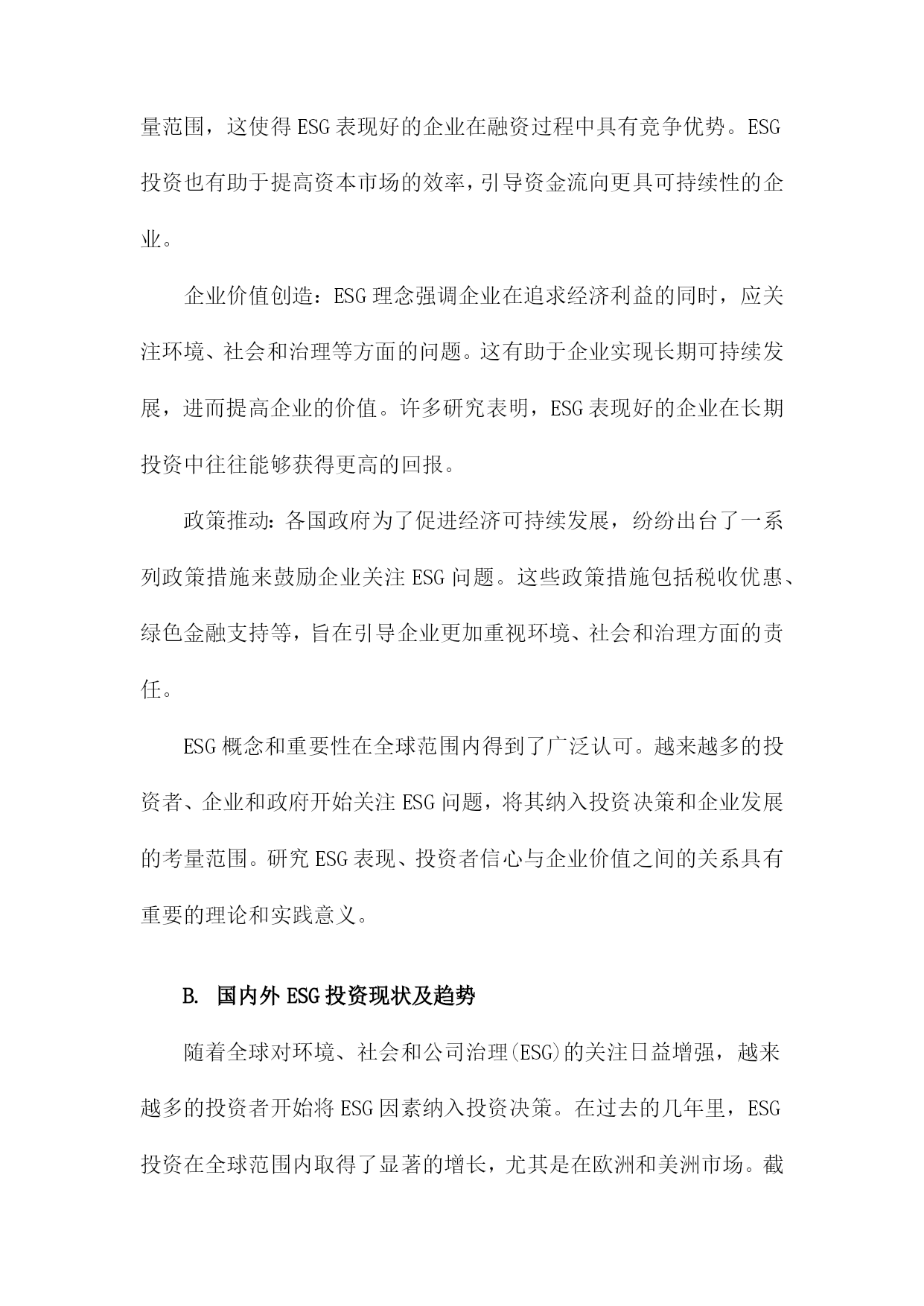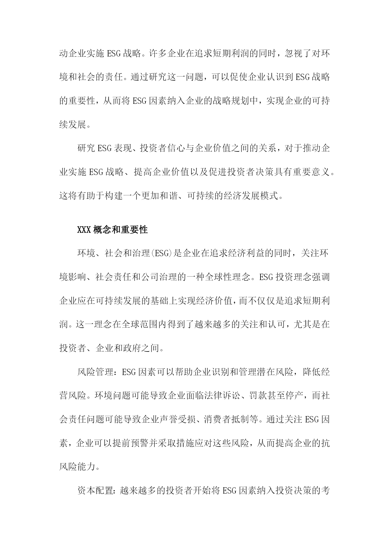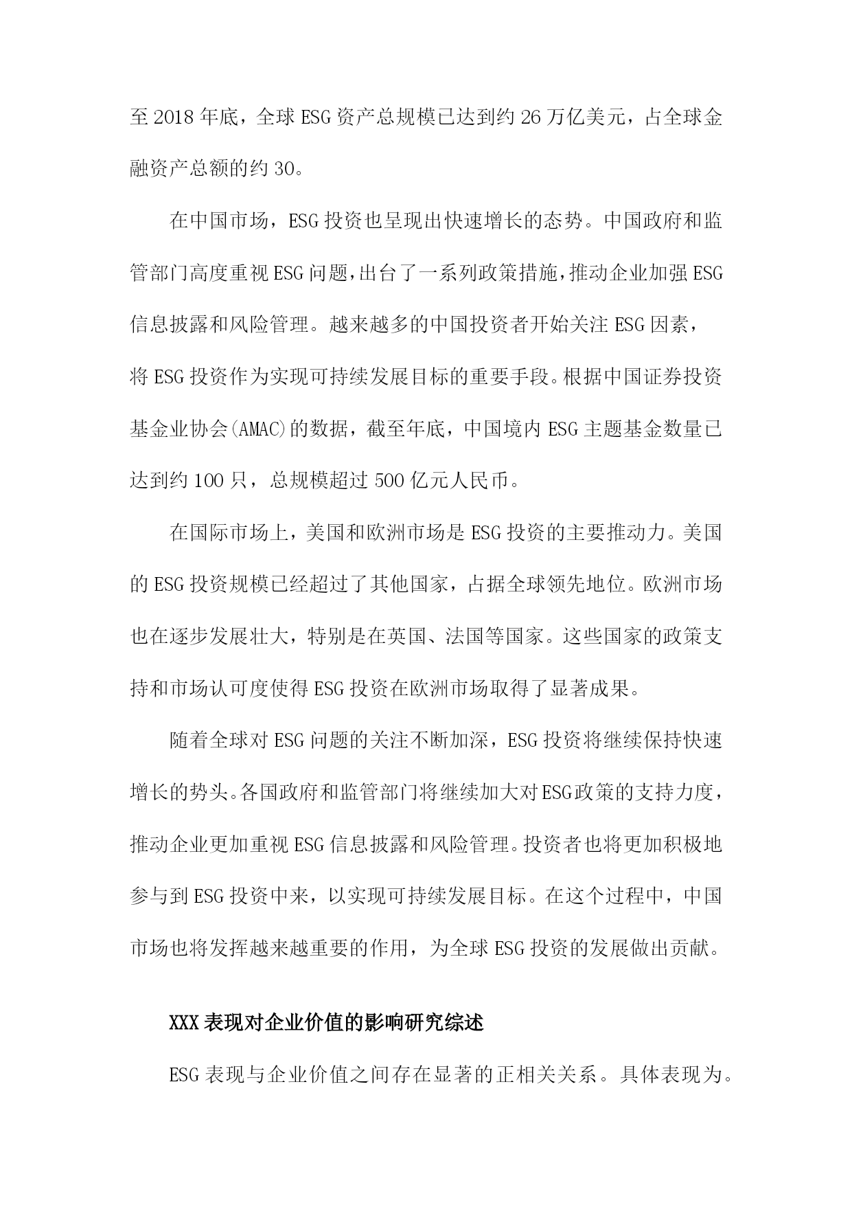 ESG表现、投资者信心与企业价值研究一、研究背景和意义随着全球经济的快速发展,企业社会责任(ESG)已经成为投资者、企业和政府关注的焦点。环境、社会和治理(ESG)因素对企业的价值创造和可持续发展具有重要影响。越来越多的证据表明,ESG表现与企业价值之间存在正相关关系。研究ESG表现、投资者信心与企业价值之间的关系,对于推动企业实施ESG战略、提高企业价值以及促进投资者决策具有重要意义。研究ESG表现与企业价值之间的关系有助于揭示企业经营活动中的关键因素。通过分析企业的环境、社会和治理表现,可以发现哪些因素对企业价值的提升最为关键,从而为企业制定更加有效的战略提供依据。研究投资者对ESG表现的关注程度及其对企业价值的影响,有助于提高投资者对企业价值的判断能力。投资者在进行投资决策时,往往会受到ESG因素的影响。通过深入研究这些因素对企业价值的影响机制,可以帮助投资者更好地评估企业的潜在价值,从而做出更加明智的投资选择。研究ESG表现、投资者信心与企业价值之间的关系,还有助于推动企业实施ESG战略。许多企业在追求短期利润的同时,忽视了对环境和社会的责任。通过研究这一问题,可以促使企业认识到ESG战略的重要性,从而将ESG因素纳入企业的战略规划中,实现企业的可持续发展。研究ESG表现、投资者信心与企业价值之间的关系,对于推动企业实施ESG战略、提高企业价值以及促进投资者决策具有重要意义。这将有助于构建一个更加和谐、可持续的经济发展模式。XXX概念和重要性环境、社会和治理(ESG)是企业在追求经济利益的同时,关注环境影响、社会责任和公司治理的一种全球性理念。ESG投资理念强调企业应在可持续发展的基础上实现经济价值,而不仅仅是追求短期利润。这一理念在全球范围内得到了越来越多的关注和认可,尤其是在投资者、企业和政府之间。风险管理:ESG因素可以帮助企业识别和管理潜在风险,降低经营风险。环境问题可能导致企业面临法律诉讼、罚款甚至停产,而社会责任问题可能导致企业声誉受损、消费者抵制等。通过关注ESG因素,企业可以提前预警并采取措施应对这些风险,从而提高企业的抗风险能力。资本配置:越来越多的投资者开始将ESG因素纳入投资决策的考量范围,这使得ESG表现好的企业在融资过程中具有竞争优势。ESG投资也有助于提高资本市场的效率,引导资金流向更具可持续性的企业。企业价值创造:ESG理念强调企业在追求经济利益的同时,应关注环境、社会和治理等方面的问题。这有助于企业实现长期可持续发展,进而提高企业的价值。许多研究表明,ESG表现好的企业在长期投资中往往能够获得更高的回报。政策推动:各国政府为了促进经济可持续发展,纷纷出台了一系列政策措施来鼓励企业关注ESG问题。这些政策措施包括税收优惠、绿色金融支持等,旨在引导企业更加重视环境、社会和治理方面的责任。ESG概念和重要性在全球范围内得到了广泛认可。越来越多的投资者、企业和政府开始关注ESG问题,将其纳入投资决策和企业发展的考量范围。研究ESG表现、投资者信心与企业价值之间的关系具有重要的理论和实践意义。B.国内外ESG投资现状及趋势随着全球对环境、社会和公司治理(ESG)的关注日益增强,越来越多的投资者开始将ESG因素纳入投资决策。在过去的几年里,ESG投资在全球范围内取得了显著的增长,尤其是在欧洲和美洲市场。截至2018年底,全球ESG资产总规模已达到约26万亿美元,占全球金融资产总额的约30。在中国市场,ESG投资也呈现出快速增长的态势。中国政府和监管部门高度重视ESG问题,出台了一系列政策措施,推动企业加强ESG信息披露和风险管理。越来越多的中国投资者开始关注ESG因素,将ESG投资作为实现可持续发展目标的重要手段。根据中国证券投资基金业协会(AMAC)的数据,截至年底,中国境内ESG主题基金数量已达到约100只,总规模超过500亿元人民币。在国际市场上,美国和欧洲市场是ESG投资的主要推动力。美国的ESG投资规模已经超过了其他国家,占据全球领先地位。欧洲市场也在逐步发展壮大,特别是在英国、法国等国家。这些国家的政策支持和市场认可度使得ESG投资在欧洲市场取得了显著成果。随着全球对ESG问题的关注不断加深,ESG投资将继续保持快速增长的势头。各国政府和监管部门将继续加大对ESG政策的支持力度,推动企业更加重视ESG信息披露和风险管理。投资者也将更加积极地参与到ESG投资中来,以实现可持续发展目标。在这个过程中,中国市场也将发挥越来越重要的作用,为全球ESG投资的发展做出贡献。XXX表现对企业价值的影响研究综述ESG表现与企业价值之间存在显著的正相关关系。具体表现为。这一结论得到了多个国内外研究的一致支持。ESG表现对企业价值的驱动机制主要体现在以下几个方面:一