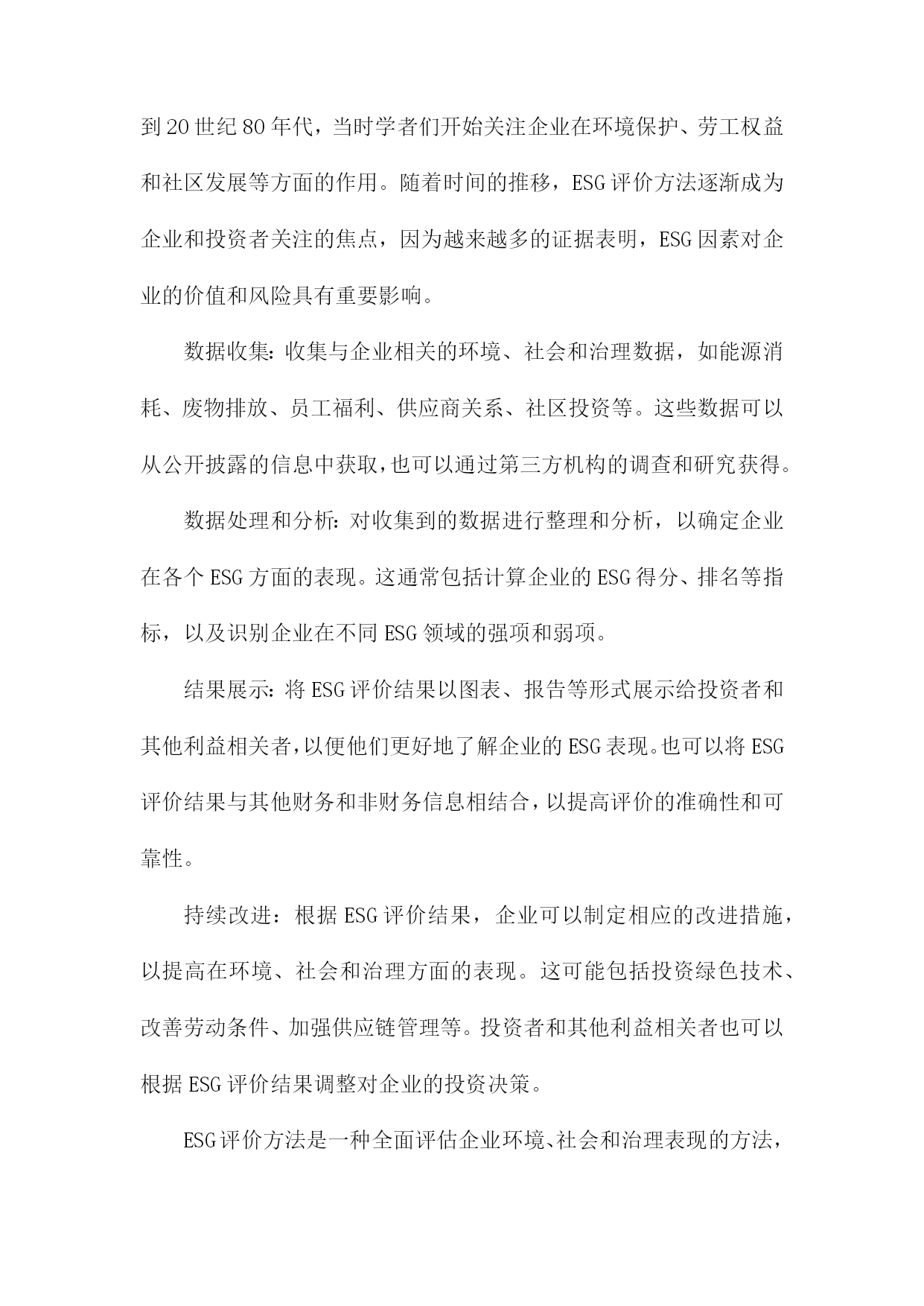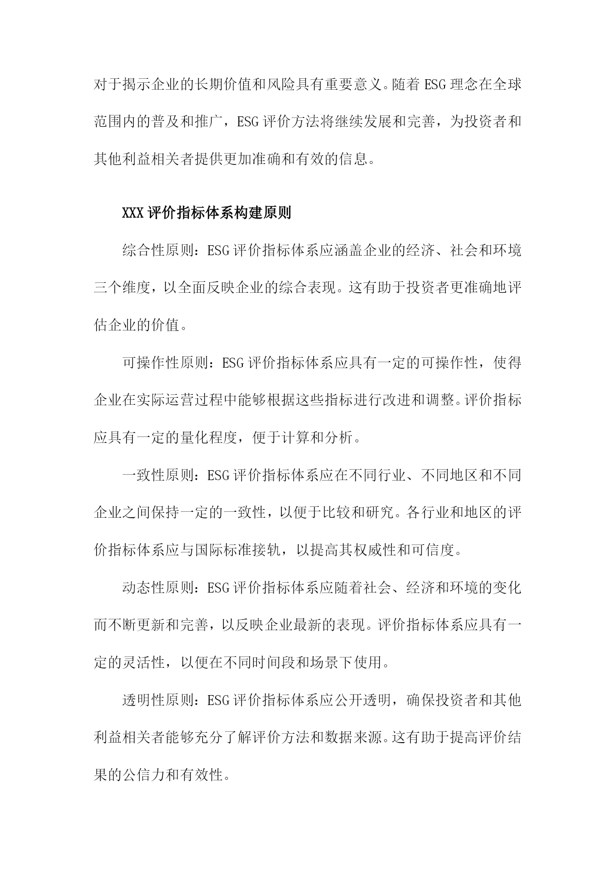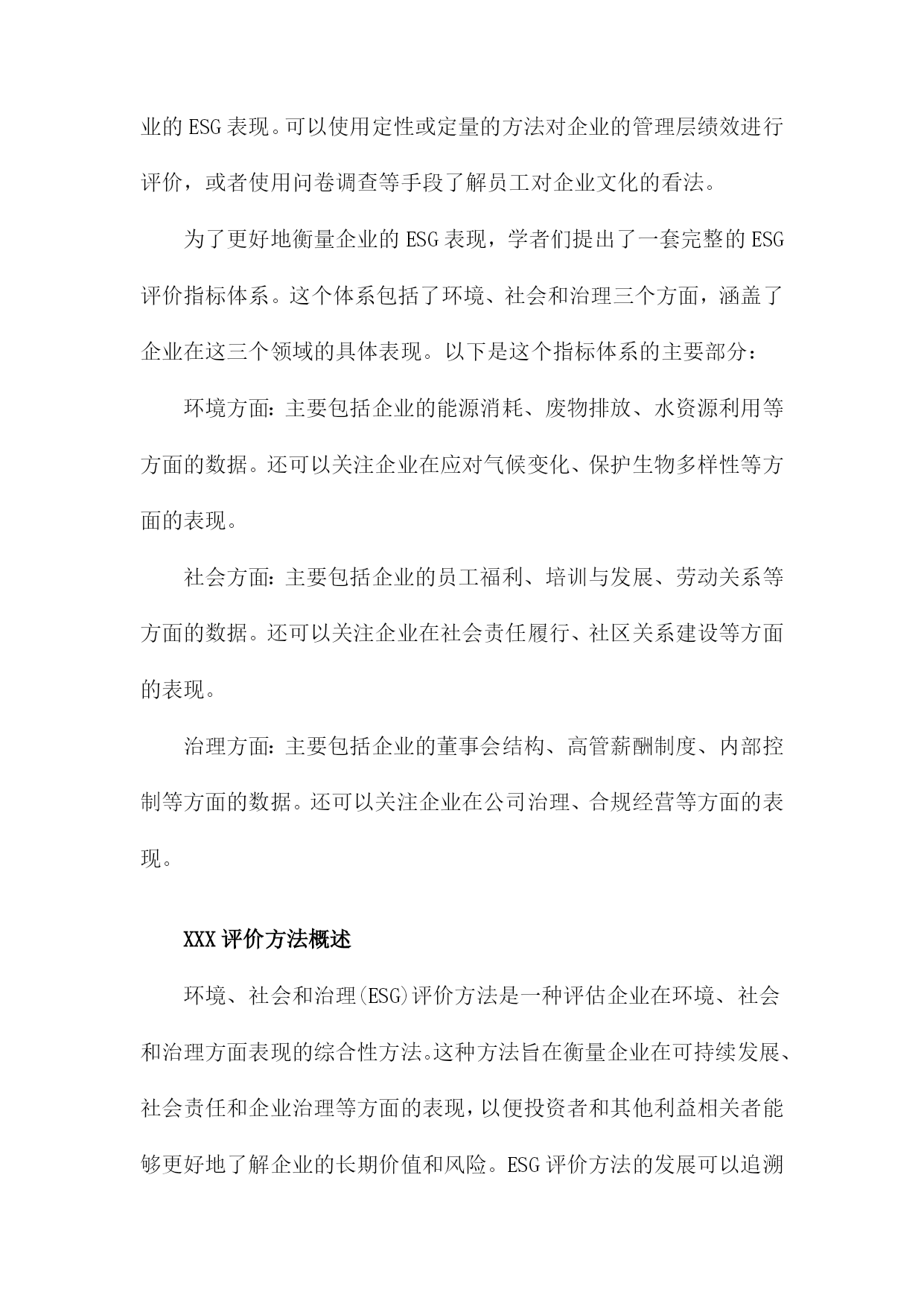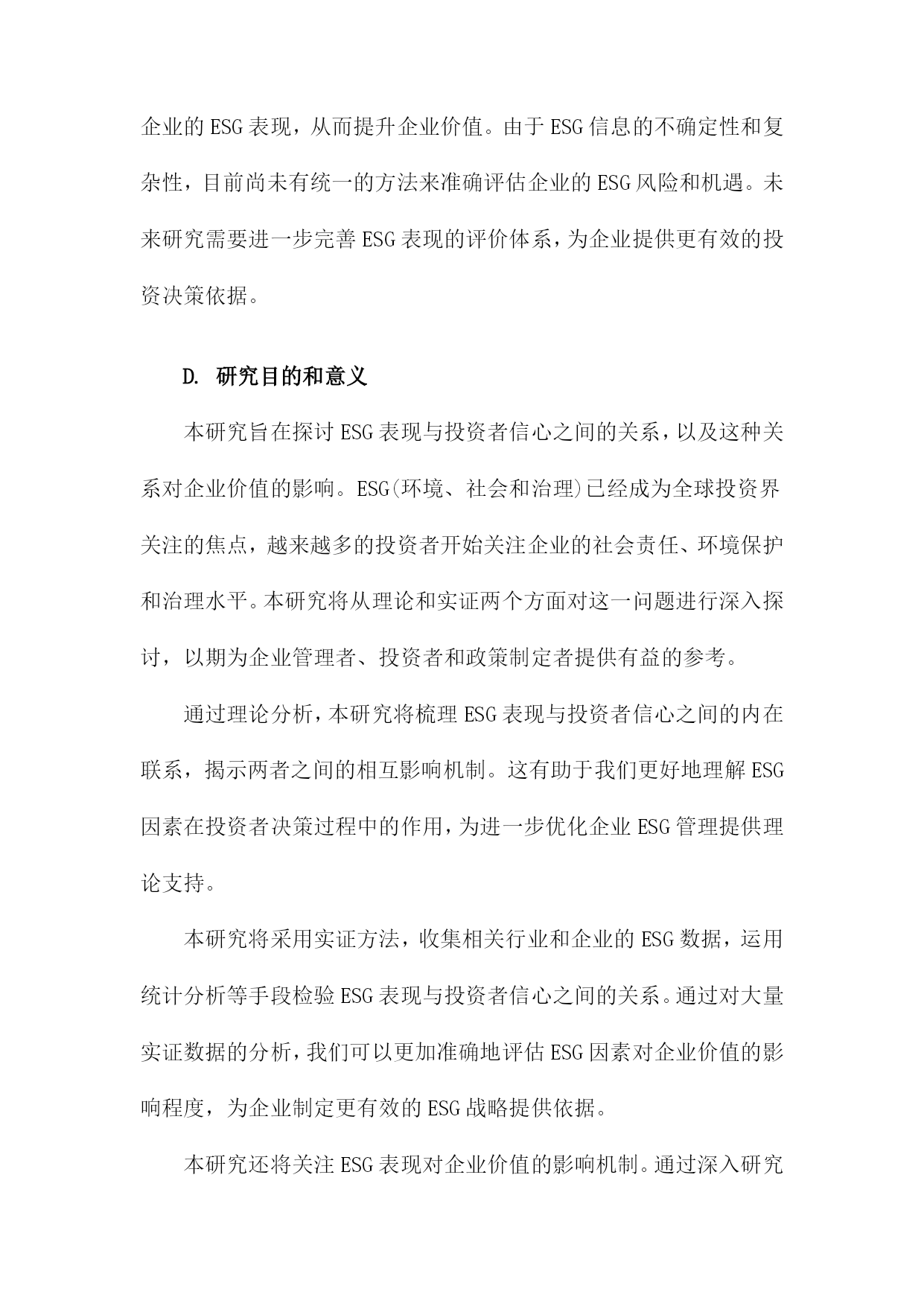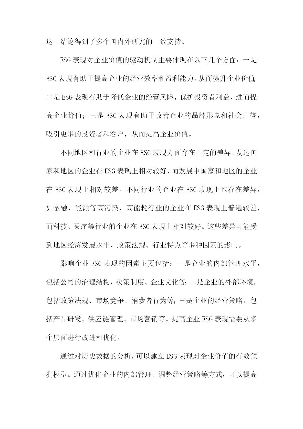 ESG表现、投资者信心与企业价值研究一、研究背景和意义随着全球经济的快速发展,企业社会责任(ESG)已经成为投资者、企业和政府关注的焦点。环境、社会和治理(ESG)因素对企业的价值创造和可持续发展具有重要影响。越来越多的证据表明,ESG表现与企业价值之间存在正相关关系。研究ESG表现、投资者信心与企业价值之间的关系,对于推动企业实施ESG战略、提高企业价值以及促进投资者决策具有重要意义。研究ESG表现与企业价值之间的关系有助于揭示企业经营活动中的关键因素。通过分析企业的环境、社会和治理表现,可以发现哪些因素对企业价值的提升最为关键,从而为企业制定更加有效的战略提供依据。研究投资者对ESG表现的关注程度及其对企业价值的影响,有助于提高投资者对企业价值的判断能力。投资者在进行投资决策时,往往会受到ESG因素的影响。通过深入研究这些因素对企业价值的影响机制,可以帮助投资者更好地评估企业的潜在价值,从而做出更加明智的投资选择。研究ESG表现、投资者信心与企业价值之间的关系,还有助于推动企业实施ESG战略。许多企业在追求短期利润的同时,忽视了对环境和社会的责任。通过研究这一问题,可以促使企业认识到ESG战略的重要性,从而将ESG因素纳入企业的战略规划中,实现企业的可持续发展。研究ESG表现、投资者信心与企业价值之间的关系,对于推动企业实施ESG战略、提高企业价值以及促进投资者决策具有重要意义。这将有助于构建一个更加和谐、可持续的经济发展模式。XXX概念和重要性环境、社会和治理(ESG)是企业在追求经济利益的同时,关注环境影响、社会责任和公司治理的一种全球性理念。ESG投资理念强调企业应在可持续发展的基础上实现经济价值,而不仅仅是追求短期利润。这一理念在全球范围内得到了越来越多的关注和认可,尤其是在投资者、企业和政府之间。风险管理:ESG因素可以帮助企业识别和管理潜在风险,降低经营风险。环境问题可能导致企业面临法律诉讼、罚款甚至停产,而社会责任问题可能导致企业声誉受损、消费者抵制等。通过关注ESG因素,企业可以提前预警并采取措施应对这些风险,从而提高企业的抗风险能力。资本配置:越来越多的投资者开始将ESG因素纳入投资决策的考量范围,这使得ESG表现好的企业在融资过程中具有竞争优势。ESG投资也有助于提高资本市场的效率,引导资金流向更具可持续性的企业。企业价值创造:ESG理念强调企业在追求经济利益的同时,应关注环境、社会和治理等方面的问题。这有助于企业实现长期可持续发展,进而提高企业的价值。许多研究表明,ESG表现好的企业在长期投资中往往能够获得更高的回报。政策推动:各国政府为了促进经济可持续发展,纷纷出台了一系列政策措施来鼓励企业关注ESG问题。这些政策措施包括税收优惠、绿色金融支持等,旨在引导企业更加重视环境、社会和治理方面的责任。ESG概念和重要性在全球范围内得到了广泛认可。越来越多的投资者、企业和政府开始关注ESG问题,将其纳入投资决策和企业发展的考量范围。研究ESG表现、投资者信心与企业价值之间的关系具有重要的理论和实践意义。B.国内外ESG投资现状及趋势随着全球对环境、社会和公司治理(ESG)的关注日益增强,越来越多的投资者开始将ESG因素纳入投资决策。在过去的几年里,ESG投资在全球范围内取得了显著的增长,尤其是在欧洲和美洲市场。截至2018年底,全球ESG资产总规模已达到约26万亿美元,占全球金融资产总额的约30。在中国市场,ESG投资也呈现出快速增长的态势。中国政府和监管部门高度重视ESG问题,出台了一系列政策措施,推动企业加强ESG信息披露和风险管理。越来越多的中国投资者开始关注ESG因素,将ESG投资作为实现可持续发展目标的重要手段。根据中国证券投资基金业协会(AMAC)的数据,截至年底,中国境内ESG主题基金数量已达到约100只,总规模超过500亿元人民币。在国际市场上,美国和欧洲市场是ESG投资的主要推动力。美国的ESG投资规模已经超过了其他国家,占据全球领先地位。欧洲市场也在逐步发展壮大,特别是在英国、法国等国家。这些国家的政策支持和市场认可度使得ESG投资在欧洲市场取得了显著成果。随着全球对ESG问题的关注不断加深,ESG投资将继续保持快速增长的势头。各国政府和监管部门将继续加大对ESG政策的支持力度,推动企业更加重视ESG信息披露和风险管理。投资者也将更加积极地参与到ESG投资中来,以实现可持续发展目标。在这个过程中,中国市场也将发挥越来越重要的作用,为全球ESG投资的发展做出贡献。XXX表现对企业价值的影响研究综述ESG表现与企业价值之间存在显著的正相关关系。具体表现为。这一结论得到了多个国内外研究的一致支持。ESG表现对企业价值的驱动机制主要体现在以下几个方面:一