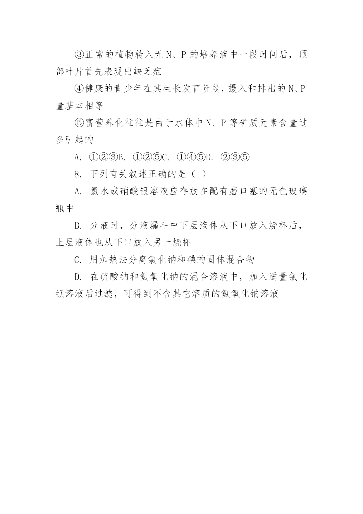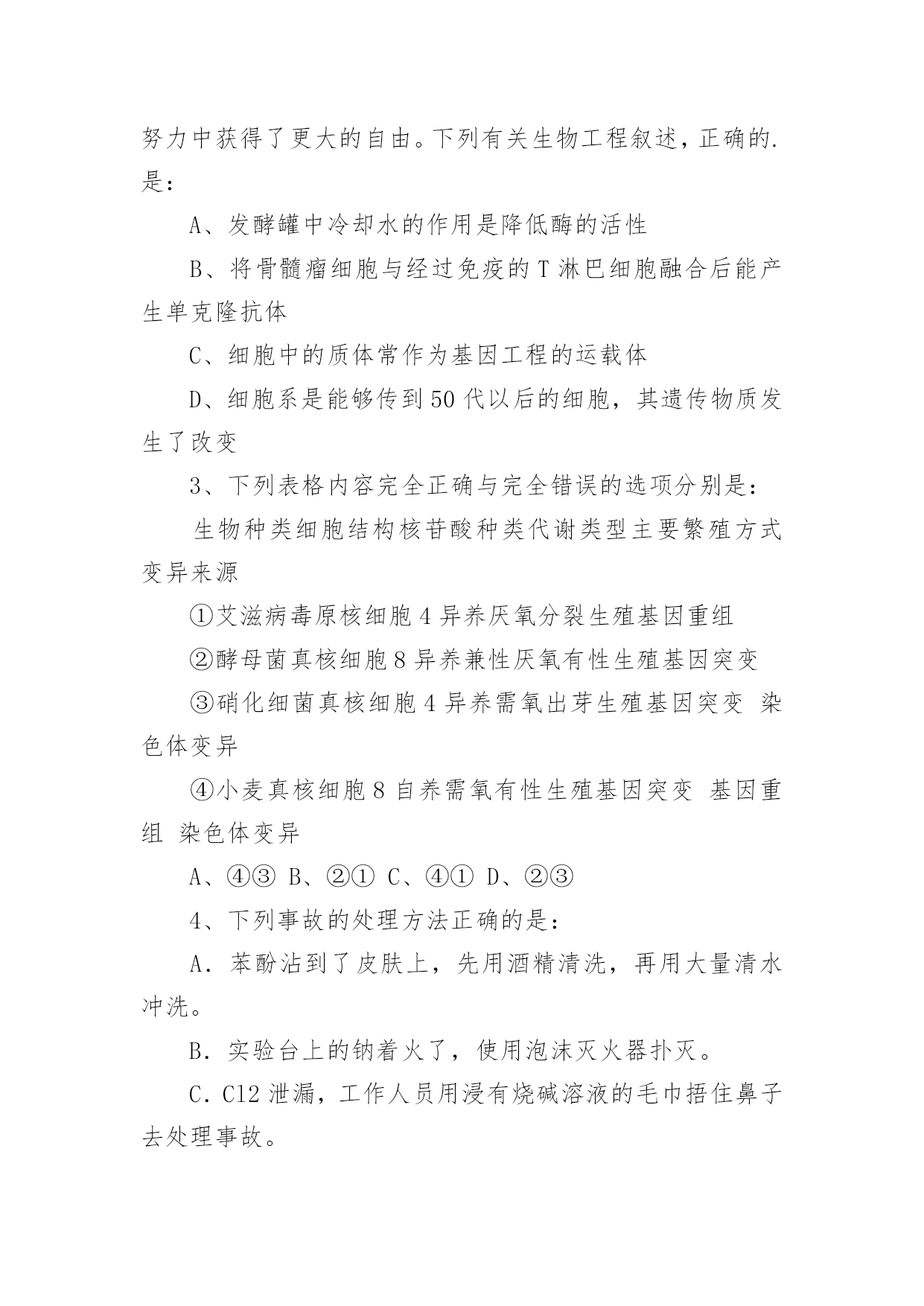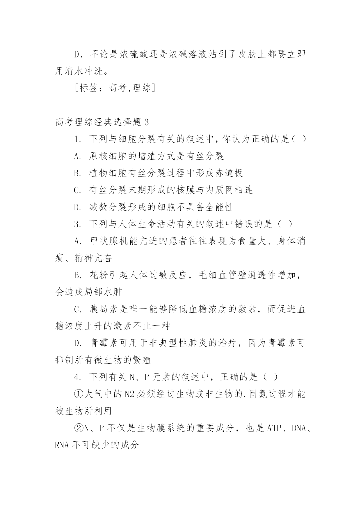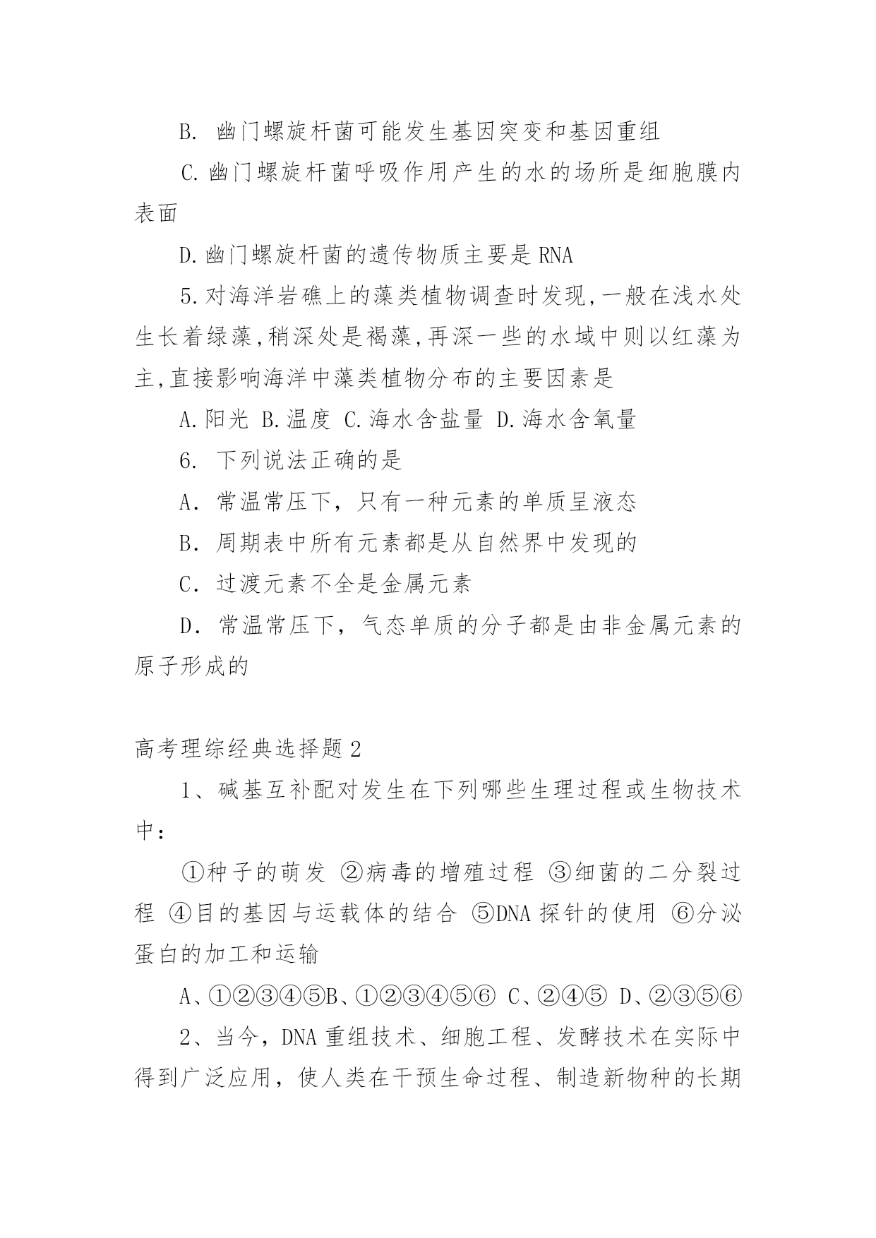 高考理综经典选择题高考理综经典选择题11.20xx年世界杯足球赛将在德国举行,球员踢球瞬间,神经冲动在神经纤维上的传导形式是A静息电位B动作电位C突触传导D反射弧2.下列关于叶绿体色素提取和分离的实验描述中,不属于实验要求的是A.提取高等植物叶绿体中的色素B.用纸层析法分离色素C.了解各种色素的吸收光谱D.验证叶绿体中所含色素的种类3.番茄高茎(T)对矮茎(t)为显性,圆形果实(S)对梨形果实(s)为显性(这两对基因位于非同源染色体上)。现将两个纯合亲本杂交后得到的F1与表现型为高茎梨形果的`植株杂交,其杂交后代的性状及植株数分别为高茎圆形果120株,高茎梨形果128株,矮茎圆形果42株,矮茎梨形果38株。这杂交组合的两个亲本的基因型是A.TTSSttSSB.TTssttssC.TTSsttssD.TTssttSS4.20xx年诺贝尔生理学或医学奖授予澳大利亚学者巴里o马歇尔和罗宾o沃伦以表彰他们在幽门螺旋杆菌研究中作出的杰出贡献。下列关于幽门螺旋杆菌的叙述中,正确的是A.幽门螺旋杆菌的遗传物质在染色体和质粒上B.幽门螺旋杆菌可能发生基因突变和基因重组C.幽门螺旋杆菌呼吸作用产生的水的场所是细胞膜内表面D.幽门螺旋杆菌的遗传物质主要是RNA5.对海洋岩礁上的藻类植物调查时发现,一般在浅水处生长着绿藻,稍深处是褐藻,再深一些的水域中则以红藻为主,直接影响海洋中藻类植物分布的主要因素是A.阳光B.温度C.海水含盐量D.海水含氧量6.下列说法正确的是A.常温常压下,只有一种元素的单质呈液态B.周期表中所有元素都是从自然界中发现的C.过渡元素不全是金属元素D.常温常压下,气态单质的分子都是由非金属元素的原子形成的高考理综经典选择题21、碱基互补配对发生在下列哪些生理过程或生物技术中:①种子的萌发②病毒的增殖过程③细菌的二分裂过程④目的基因与运载体的结合⑤DNA探针的使用⑥分泌蛋白的加工和运输A、①②③④⑤B、①②③④⑤⑥C、②④⑤D、②③⑤⑥2、当今,DNA重组技术、细胞工程、发酵技术在实际中得到广泛应用,使人类在干预生命过程、制造新物种的长期努力中获得了更大的自由。下列有关生物工程叙述,正确的.是:A、发酵罐中冷却水的作用是降低酶的活性B、将骨髓瘤细胞与经过免疫的T淋巴细胞融合后能产生单克隆抗体C、细胞中的质体常作为基因工程的运载体D、细胞系是能够传到50代以后的细胞,其遗传物质发生了改变3、下列表格内容完全正确与完全错误的选项分别是:生物种类细胞结构核苷酸种类代谢类型主要繁殖方式变异来源①艾滋病毒原核细胞4异养厌氧分裂生殖基因重组②酵母菌真核细胞8异养兼性厌氧有性生殖基因突变③硝化细菌真核细胞4异养需氧出芽生殖基因突变染色体变异④小麦真核细胞8自养需氧有性生殖基因突变基因重组染色体变异A、④③B、②①C、④①D、②③4、下列事故的处理方法正确的是:A.苯酚沾到了皮肤上,先用酒精清洗,再用大量清水冲洗。B.实验台上的钠着火了,使用泡沫灭火器扑灭。C.Cl2泄漏,工作人员用浸有烧碱溶液的毛巾捂住鼻子去处理事故。D.不论是浓硫酸还是浓碱溶液沾到了皮肤上都要立即用清水冲洗。[标签:高考,理综]高考理综经典选择题31.下列与细胞分裂有关的叙述中,你认为正确的是()A.原核细胞的增殖方式是有丝分裂B.植物细胞有丝分裂过程中形成赤道板C.有丝分裂末期形成的核膜与内质网相连D.减数分裂形成的细胞不具备全能性3.下列与人体生命活动有关的叙述中错误的是()A.甲状腺机能亢进的患者往往表现为食量大、身体消瘦、精神亢奋B.花粉引起人体过敏反应,毛细血管壁通透性增加,会造成局部水肿C.胰岛素是唯一能够降低血糖浓度的激素,而促进血糖浓度上升的激素不止一种D.青霉素可用于非典型性肺炎的治疗,因为青霉素可抑制所有微生物的繁殖4.下列有关N、P元素的叙述中,正确的是()①大气中的N2必须经过生物或非生物的.固氮过程才能被生物所利用②N、P不仅是生物膜系统的重要成分,也是ATP、DNA、RNA不可缺少的成分③正常的植物转入无N、P的培养液中一段时间后,顶部叶片首先表现出缺乏症④健康的青少年在其生长发育阶段,摄入和排出的N、P量基本相等⑤富营养化往往是由于水体中N、P等矿质元素含量过多引起的A.①②③B.①②⑤C.①④⑤D.②③⑤8.下列有关叙述正确的是()A.氯水或硝酸银溶液应存放在配有磨口塞的无色玻璃瓶中B.分液时,分液漏斗中下层液体从下口放入烧杯后,上层液体也从下口放入另一烧杯C.用加热法分离氯化钠和碘的固体混合物D.在硫酸钠和氢氧化钠的混合溶液中,加入适量氯化钡溶液后过滤,可得到不含其它溶质的氢氧化钠溶液