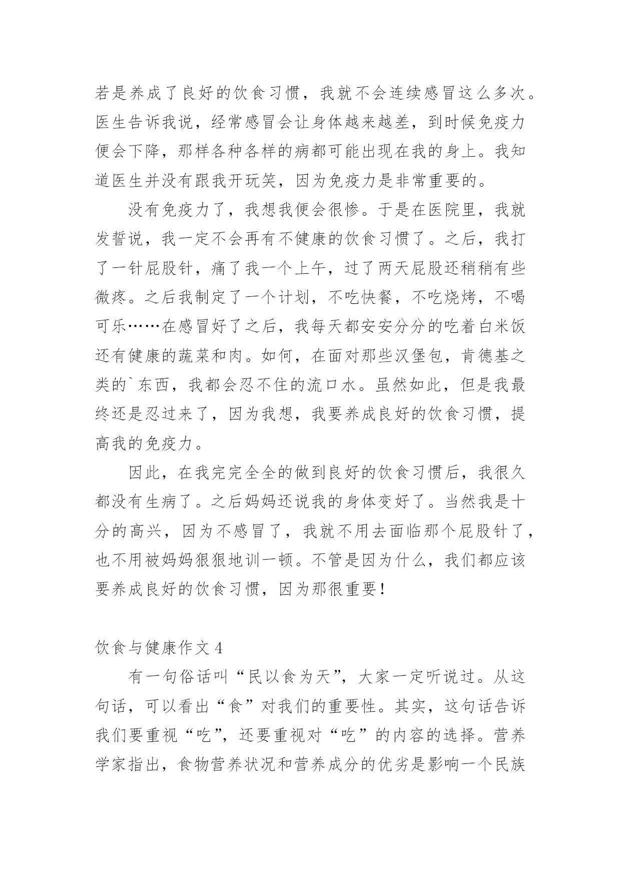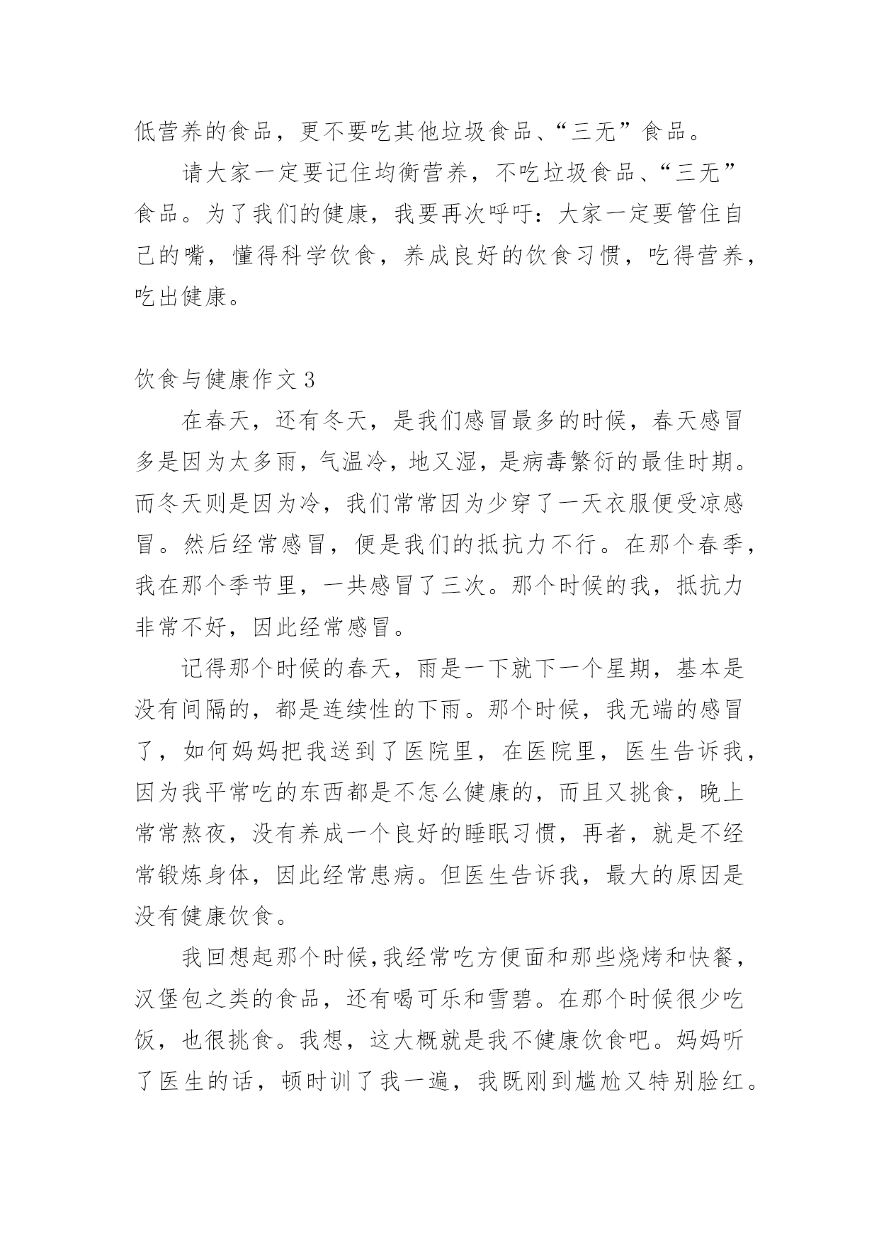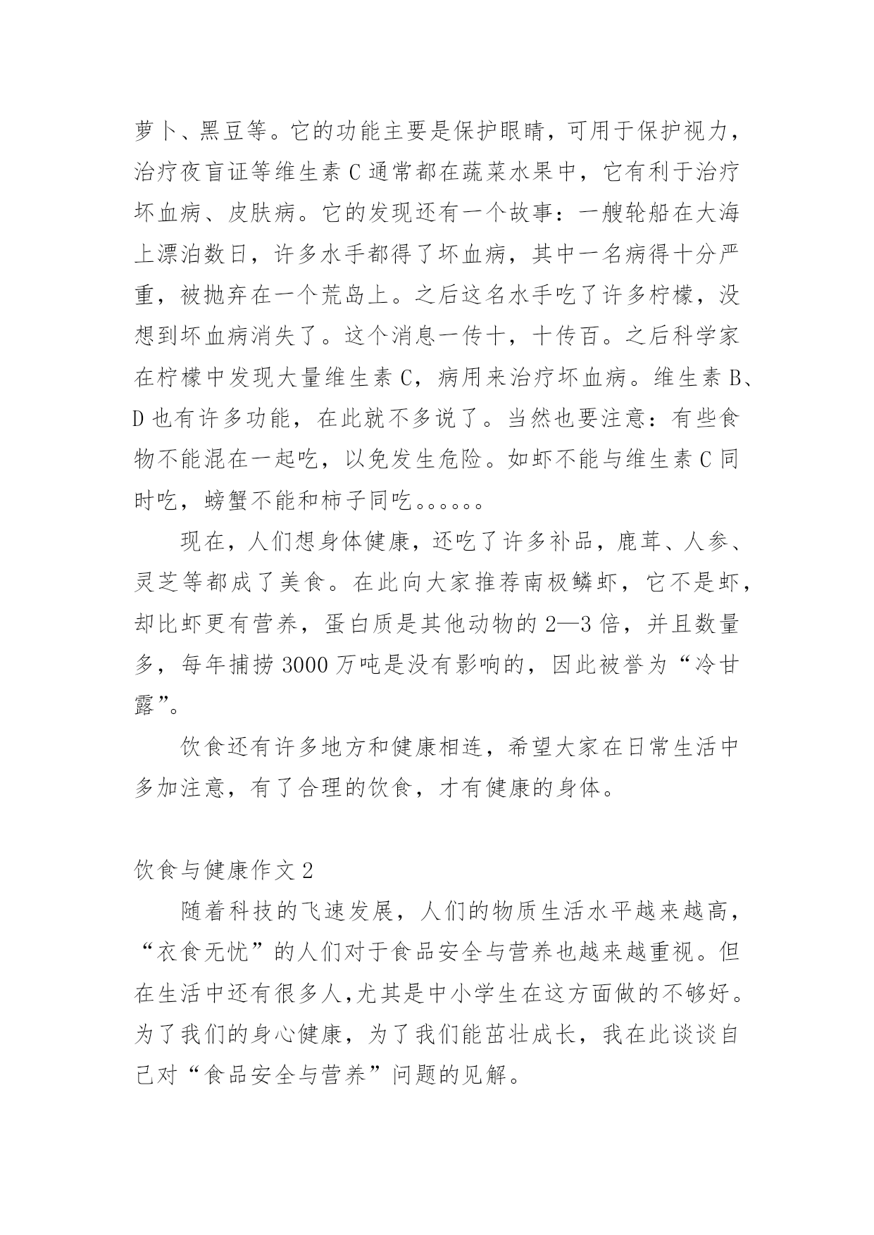 饮食与健康作文无论在学习、工作或是生活中,许多人都有过写作文的经历,对作文都不陌生吧,作文是从内部言语向外部言语的过渡,即从经过压缩的简要的、自己能明白的语言,向开展的、具有规范语法结构的、能为他人所理解的外部语言形式的转化。那么,怎么去写作文呢?下面是小编整理的饮食与健康作文,仅供参考,大家一起来看看吧。饮食与健康作文1俗话说:“民以食为天。”当今社会上,许多饭店拔地而起,各种菜系蜂拥而来,中有闽菜、川菜、粤菜、鲁菜。。。。。。外有意大利菜、法国菜、日本料理、韩国菜等等。我们都知道,健康是做任何事的本钱,健康又是与食物紧紧相连的。今天,我们就来看看餐桌上的食物吧。食物分为许多种,有蔬果类、豆类、肉类、谷类、奶制品类、脂肪类等。这几类组合成了一个食物金字塔,处处影响着我们的健康。所以,在用餐时要做到合理搭配,多蔬菜、水果,少肉类、脂肪类。谷物类为主食,可适当增加豆类、奶制品类,并且要记住,吃饭只吃八分饱,不可挑食厌食,也不可暴饮暴食,吃干净食物最为重要。在食物中,都含有一种对人们的健康起重要作用的.元素——维生素。维生素又分为A、B、C、D。不同的维生素有不同的作用。维生素A通常在红、黑色的食物中较多,如胡萝卜、黑豆等。它的功能主要是保护眼睛,可用于保护视力,治疗夜盲证等维生素C通常都在蔬菜水果中,它有利于治疗坏血病、皮肤病。它的发现还有一个故事:一艘轮船在大海上漂泊数日,许多水手都得了坏血病,其中一名病得十分严重,被抛弃在一个荒岛上。之后这名水手吃了许多柠檬,没想到坏血病消失了。这个消息一传十,十传百。之后科学家在柠檬中发现大量维生素C,病用来治疗坏血病。维生素B、D也有许多功能,在此就不多说了。当然也要注意:有些食物不能混在一起吃,以免发生危险。如虾不能与维生素C同时吃,螃蟹不能和柿子同吃。。。。。。现在,人们想身体健康,还吃了许多补品,鹿茸、人参、灵芝等都成了美食。在此向大家推荐南极鳞虾,它不是虾,却比虾更有营养,蛋白质是其他动物的2—3倍,并且数量多,每年捕捞3000万吨是没有影响的,因此被誉为“冷甘露”。饮食还有许多地方和健康相连,希望大家在日常生活中多加注意,有了合理的饮食,才有健康的身体。饮食与健康作文2随着科技的飞速发展,人们的物质生活水平越来越高,“衣食无忧”的人们对于食品安全与营养也越来越重视。但在生活中还有很多人,尤其是中小学生在这方面做的不够好。为了我们的身心健康,为了我们能茁壮成长,我在此谈谈自己对“食品安全与营养”问题的见解。随着物质生活的改善,很多家庭把鸡、鸭、鱼、肉??等荤菜当成主食。虽然说荤菜能够给我们补充蛋白质、脂肪等人类所需求的物质,但是光吃荤菜是不行的,君不见,现实生活中的“大肥头”和“小胖墩”越来越多了。萝卜白菜等素菜虽价廉但物美,它含有维生素等对人体有益的物质,对我们身体起着至关重要的作用。因此,我们不仅要吃荤菜,还应该多吃素菜。只有荤素搭配着吃,才能有益我们的健康。我们小学生,正处于长身体的阶段,更不能挑食。荤素搭配,更利健康。再就是我们在吃饭时,不能见到可口的.饭菜就“大开吃戒”,暴食暴饮,这样做对我们的身体是有害的。不仅仅是营养均衡问题,中小学生的食品安全问题也很严峻。现在的周围,小摊点上垃圾食品、“三无”食品比比皆是。我们说的垃圾食品指的是方便面、火腿肠等高热量、低营养的食品;“三无”食品是指无产品名称、无厂名厂址、无生产日期和保质期的食品。中小学生食品安全意识薄弱,自我约束能力太差,把垃圾食品、“三无”食品当零食已是司空见惯的现象。每天放学,学生们都蜂拥而上,争先恐后地买那些垃圾食品、“三无”食品。这些食品不但缺少营养,而且含有激素,不符合卫生标准,食用后会对身体造成伤害。美国曾经有人做过一次实验,连续30天只吃麦当劳的食物,只喝麦当劳的饮料,结果原本健康的他,体重急剧下降,肝、肾等器官也受到损伤。这个实验进一步说明了吃垃圾食品的危害性。在此,我劝告大家不要三天两头地去麦当劳、肯德基快餐店里大饱口福,吃那些高热量、低营养的食品,更不要吃其他垃圾食品、“三无”食品。请大家一定要记住均衡营养,不吃垃圾食品、“三无”食品。为了我们的健康,我要再次呼吁:大家一定要管住自己的嘴,懂得科学饮食,养成良好的饮食习惯,吃得营养,吃出健康。饮食与健康作文3在春天,还有冬天,是我们感冒最多的时候,春天感冒多是因为太多雨,气温冷,地又湿,是病毒繁衍的最佳时期。而冬天则是因为冷,我们常常因为少穿了一天衣服便受凉感冒。然后经常感冒,便是我们的抵抗力不行。在那个春季,我在那个季节里,一共感冒了三次。那个时候的我,抵抗力非常不好,因此经常感冒。记得那个时候的春天,雨是一下就下一个星期,基本是没有间隔的,都是连续性的下雨。那个时候,我无端的感冒了,如何妈妈把我送到了医院里,在医院里,医生告诉我,因为我