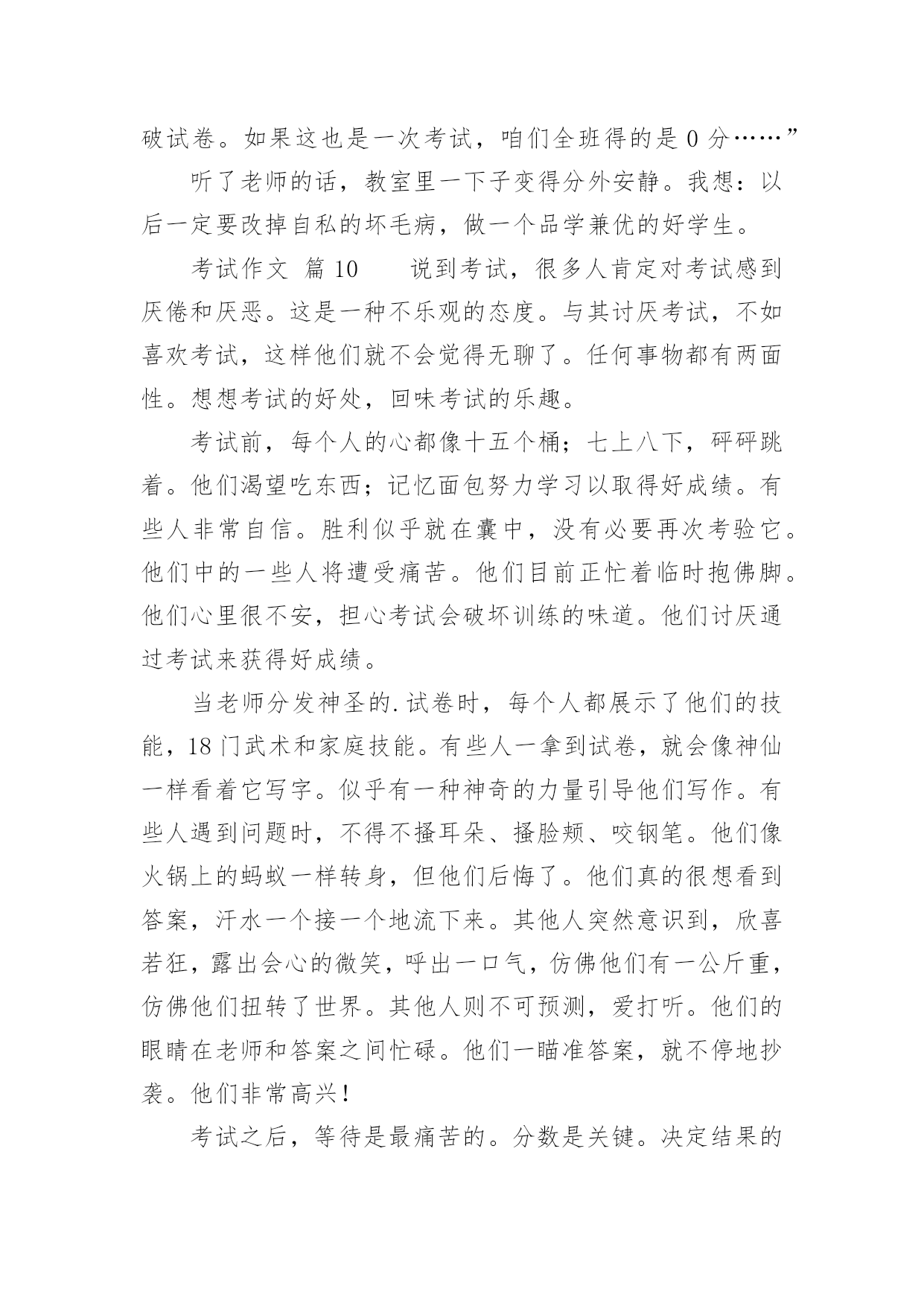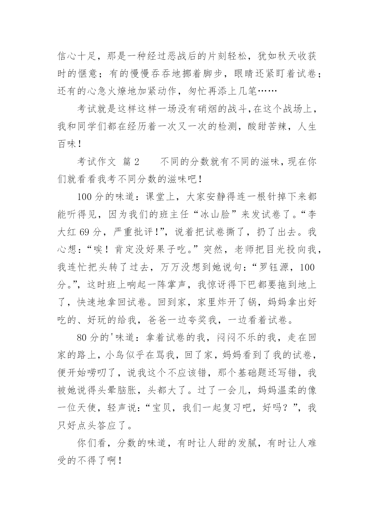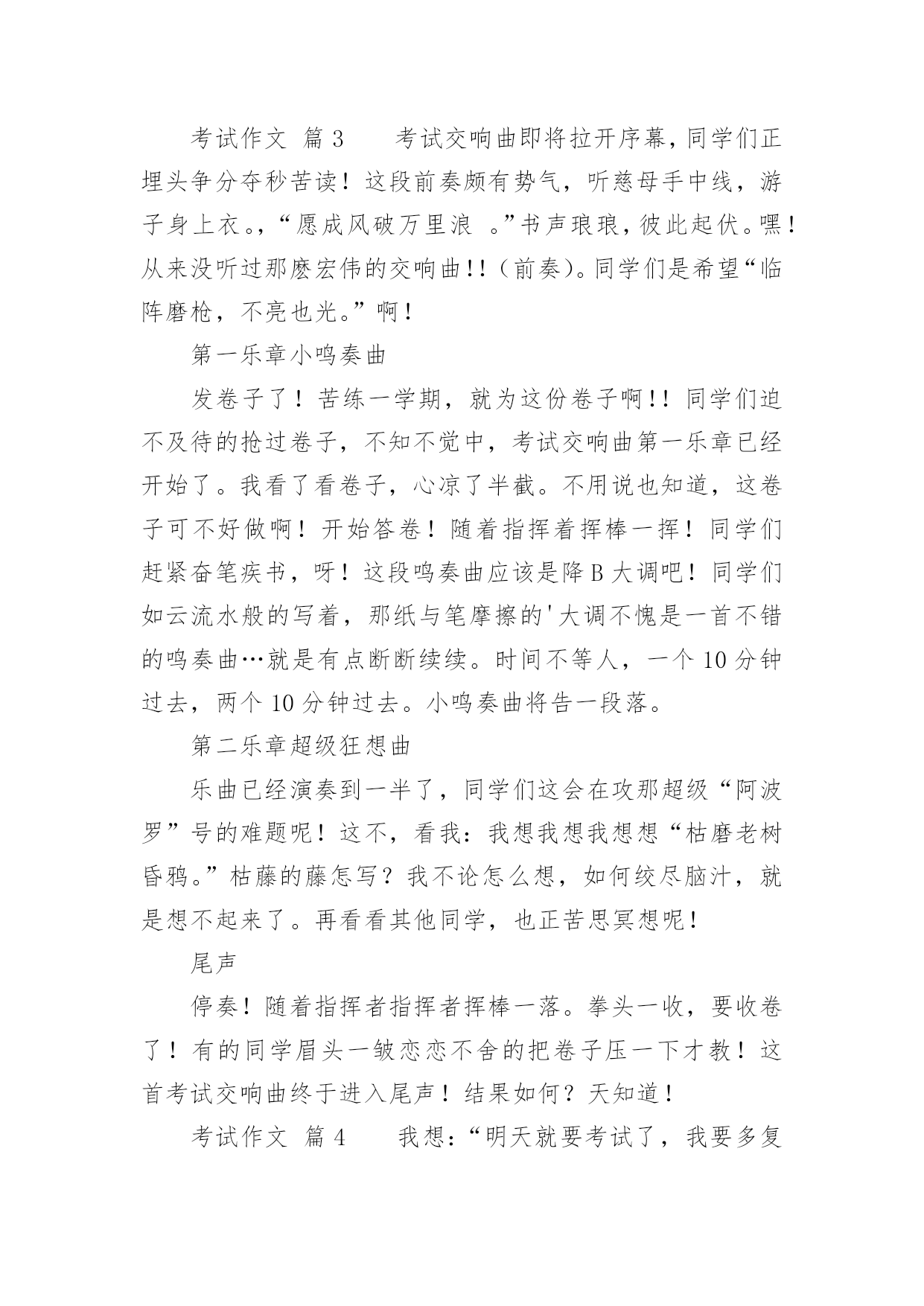 考试作文【必备】考试作文(通用20篇)在学习、工作、生活中,许多人都有过写作文的经历,对作文都不陌生吧,作文是人们把记忆中所存储的有关知识、经验和思想用书面形式表达出来的记叙方式。相信许多人会觉得作文很难写吧,以下是小编为大家整理的考试作文,欢迎阅读与收藏。考试作文篇1愉快的学习生活中,有一个沉重的符号——考试。有的同学害怕考试,因为考试让自己的马虎学习暴露无遗;有的同学盼望考试,因为考试让自己的勤奋付出收获喜悦;还有的同学难忘考试,因为考试让自己的人生经历更加丰富……瞧!试卷刚发下来,教室里敲桌声,跺脚声便一时齐发。大家先是深吸一口气,好让自己轻松点,然后就埋下头做题。环顾四周,同学们的表情那叫一个“多姿多彩”呀:这一位一会儿捏捏“感冒”的.鼻子,一会儿掏掏“发痒”的耳朵,再过一会儿又开始揉揉“疲劳”的眼睛;那一位突然停下了运笔如飞的手,用力地咬着笔头,忽然眉开眼笑,飞快地写起试卷来,脸上得意的表情似乎在说:“哈哈,真是天助我也!”还有一位一直手托下巴,作“冥思苦想”状,似乎绞尽脑汁也是无力回天了,只好望“卷”兴叹:“完了,完了,彻底完了!”交卷时间到了,有的同学潇洒地走出去,显得信心十足,那是一种经过恶战后的片刻轻松,犹如秋天收获时的惬意;有的慢慢吞吞地挪着脚步,眼睛还紧盯着试卷;还有的心急火燎地加紧动作,匆忙再添上几笔……考试就是这样这样一场没有硝烟的战斗,在这个战场上,我和同学们都在经历着一次又一次的检测,酸甜苦辣,人生百味!考试作文篇2不同的分数就有不同的滋味,现在你们就看看我考不同分数的滋味吧!100分的味道:课堂上,大家安静得连一根针掉下来都能听得见,因为我们的班主任“冰山脸”来发试卷了。“李大红69分,严重批评!”,说着把试卷撕了,扔了出去。我心想:“唉!肯定没好果子吃。”突然,老师把目光投向我,我连忙把头转了过去,万万没想到她说句:“罗钰源,100分。”,这时班上响起一阵掌声,我惊讶得下巴都要拖到地上了,快速地拿回试卷。回到家,家里炸开了锅,妈妈拿出好吃的、好玩的给我,爸爸一边夸奖我,一边看着试卷。80分的'味道:拿着试卷的我,闷闷不乐的我,走在回家的路上,小鸟似乎在骂我,回了家,妈妈看到了我的试卷,便开始唠叨了,说我这个不应该错,那个基础题还写错,我被她说得头晕脑胀,头都大了。过了一会儿,妈妈温柔的像一位天使,轻声说:“宝贝,我们一起复习吧,好吗?”,我只好点头答应了。你们看,分数的味道,有时让人甜的发腻,有时让人难受的不得了啊!考试作文篇3考试交响曲即将拉开序幕,同学们正埋头争分夺秒苦读!这段前奏颇有势气,听慈母手中线,游子身上衣。,“愿成风破万里浪。”书声琅琅,彼此起伏。嘿!从来没听过那麽宏伟的交响曲!!(前奏)。同学们是希望“临阵磨枪,不亮也光。”啊!第一乐章小鸣奏曲发卷子了!苦练一学期,就为这份卷子啊!!同学们迫不及待的抢过卷子,不知不觉中,考试交响曲第一乐章已经开始了。我看了看卷子,心凉了半截。不用说也知道,这卷子可不好做啊!开始答卷!随着指挥着挥棒一挥!同学们赶紧奋笔疾书,呀!这段鸣奏曲应该是降B大调吧!同学们如云流水般的写着,那纸与笔摩擦的'大调不愧是一首不错的鸣奏曲…就是有点断断续续。时间不等人,一个10分钟过去,两个10分钟过去。小鸣奏曲将告一段落。第二乐章超级狂想曲乐曲已经演奏到一半了,同学们这会在攻那超级“阿波罗”号的难题呢!这不,看我:我想我想我想想“枯磨老树昏鸦。”枯藤的藤怎写?我不论怎么想,如何绞尽脑汁,就是想不起来了。再看看其他同学,也正苦思冥想呢!尾声停奏!随着指挥者指挥者挥棒一落。拳头一收,要收卷了!有的同学眉头一皱恋恋不舍的把卷子压一下才教!这首考试交响曲终于进入尾声!结果如何?天知道!考试作文篇4我想:“明天就要考试了,我要多复习,到明天考个好成绩。”吃完晚饭,我把书和习题册都拿出来,我从第一课读到最后一课,刚要看一看生字,就听到有人敲门,原来是我的`几个小伙伴来叫我出去玩,我问:“你们几个不知道明天要考试了吗?”凤梅说:“不着急,玩一会再复习。”文诤说:“再说了,考试前也要放松放松吗!”我呢!还是拒绝了他们,我关上门,开始复习了,我看完了生字,又默写一遍;我正在默写,天色渐暗,不能看书,我就打开灯,我读来读去,写来写去,忽然灯灭了,没电了,我怎么复习呢?我急得满头大汗,眼前浮现出老师带病为我们上课时那疲惫的身影,我如果考不好……我不敢往下想。对了,我可以用蜡烛,于是我找出蜡烛、拿出火柴、点燃蜡烛。唉yao,我不自觉地叫了一声,原来我的手被烧了一下,顿时起了个小白泡,我疼得不得了,可是我心里还是那么的高兴,因为我能够继续学习了,明天一定考个好成绩!考试作文篇5政治与历史两门学科从这个学期开始,就要闭卷考试了。这对我们来说,无疑是件爆炸性的事件。但是闭卷考试这两门学科