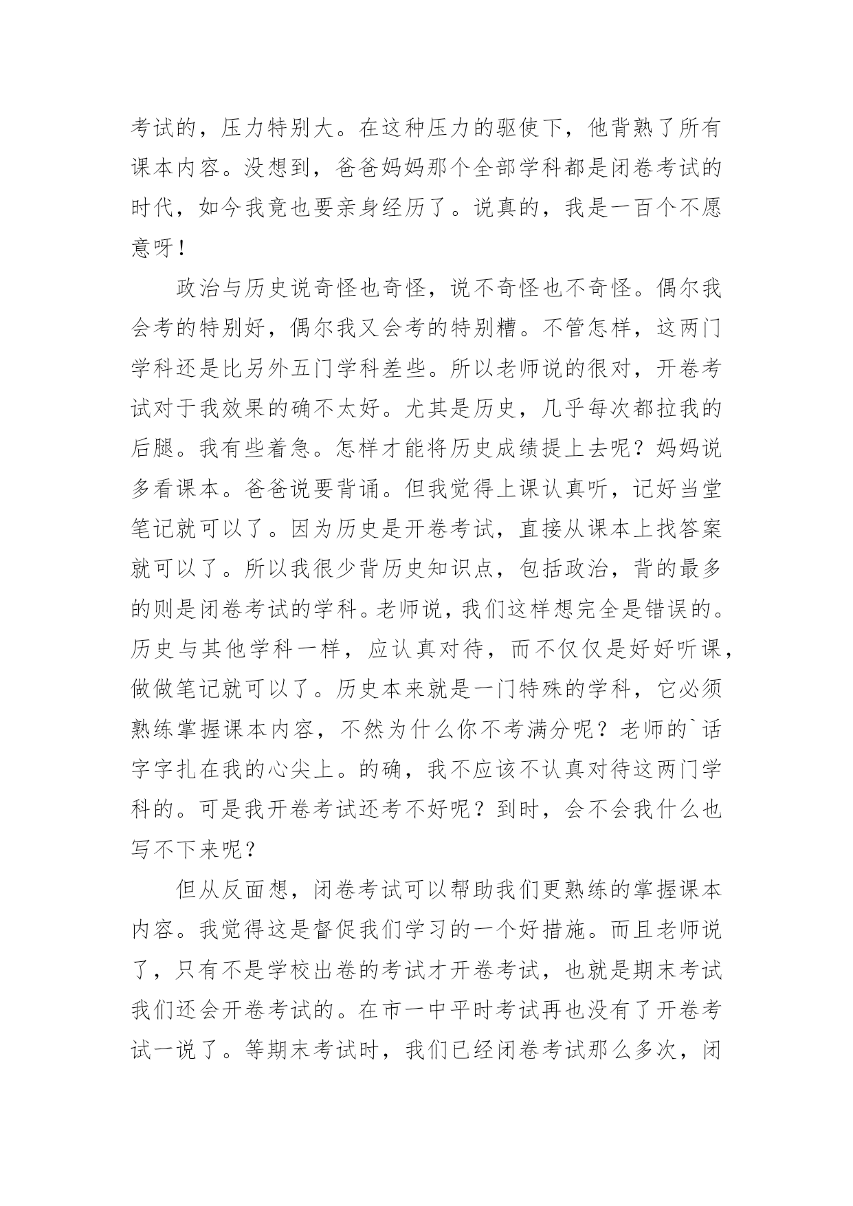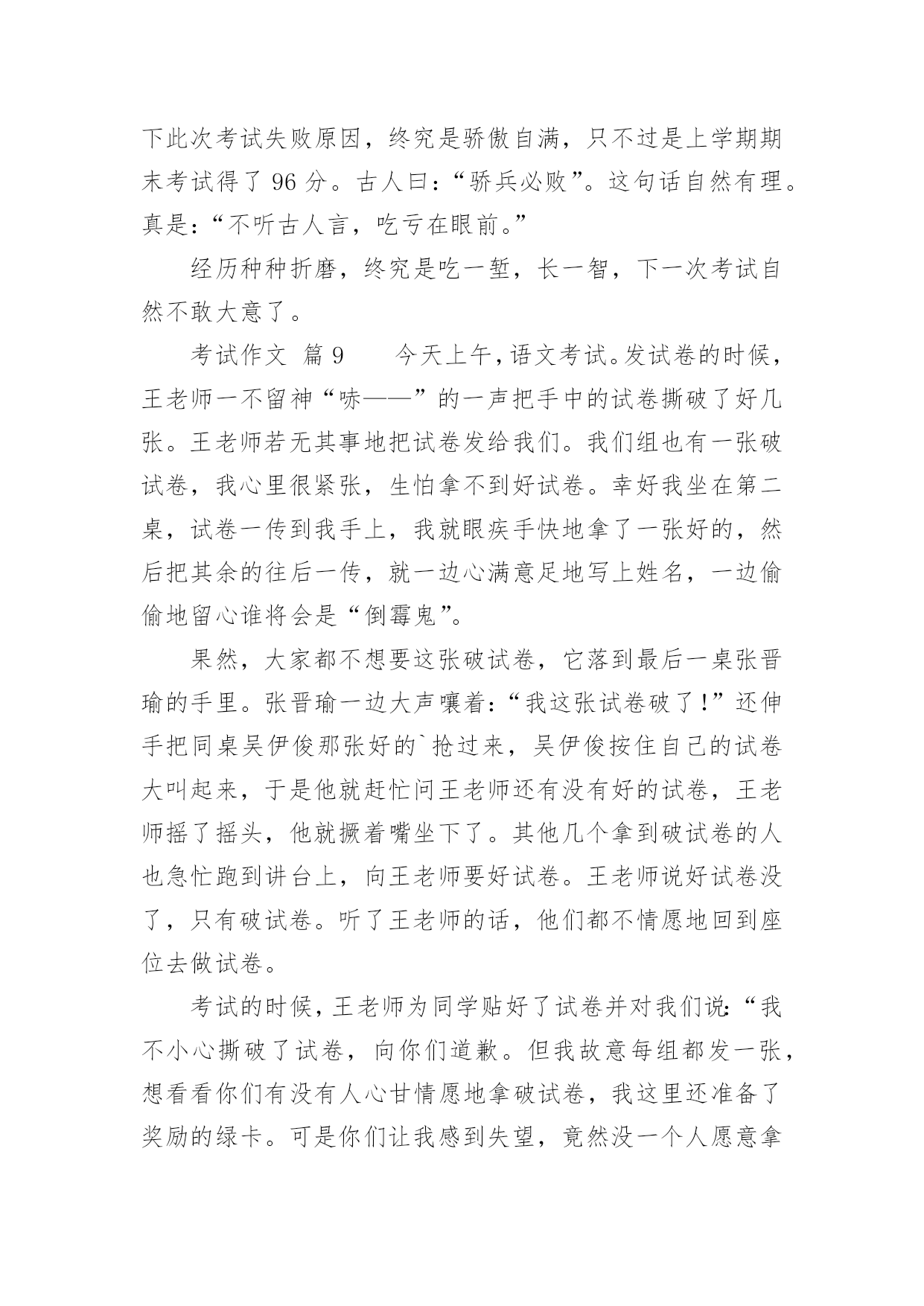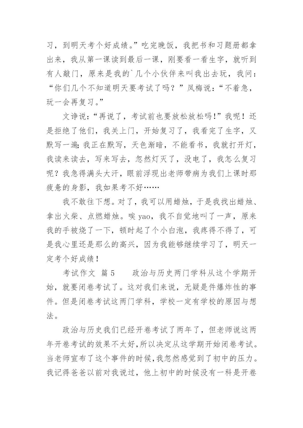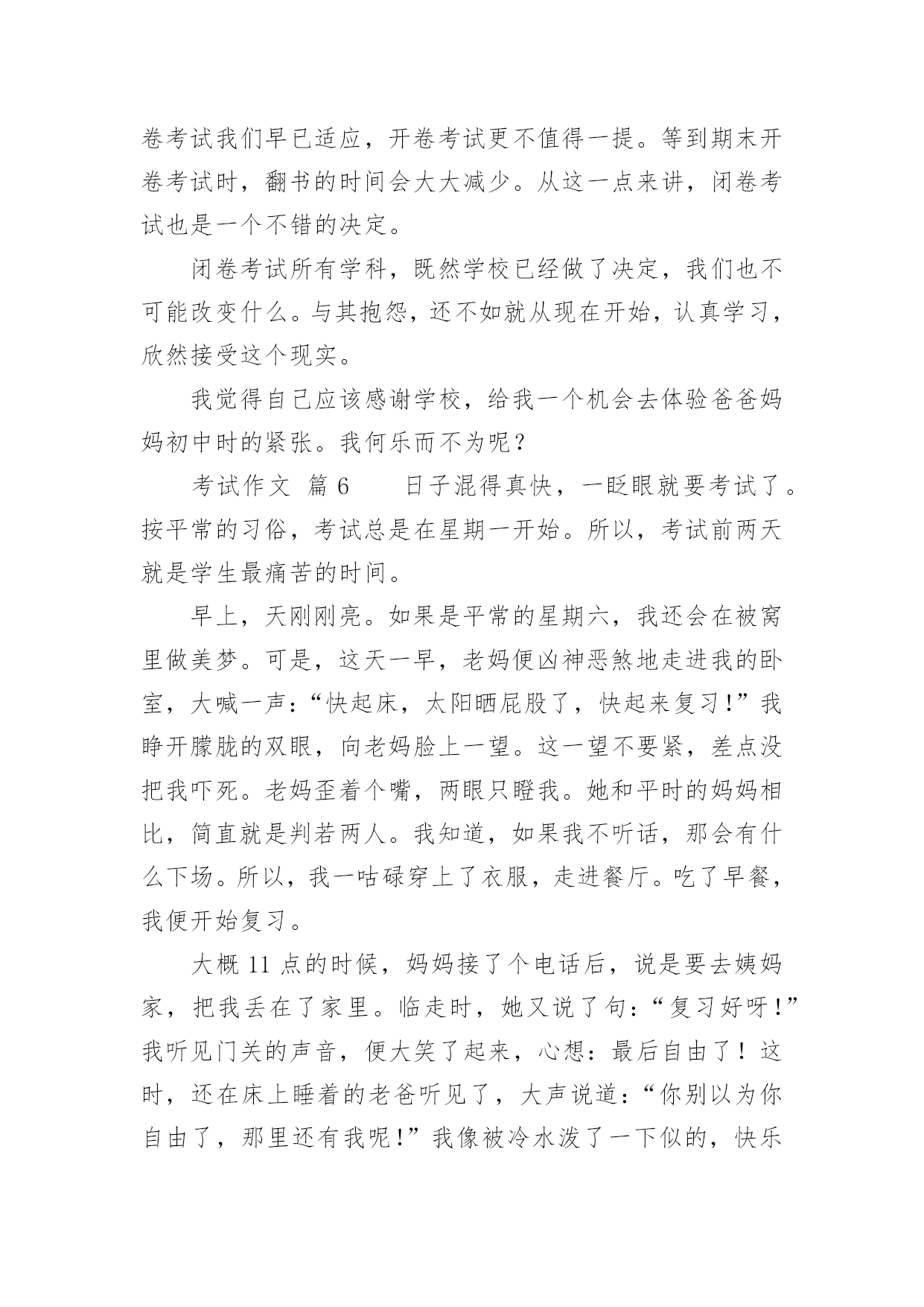 考试作文【必备】考试作文(通用20篇)在学习、工作、生活中,许多人都有过写作文的经历,对作文都不陌生吧,作文是人们把记忆中所存储的有关知识、经验和思想用书面形式表达出来的记叙方式。相信许多人会觉得作文很难写吧,以下是小编为大家整理的考试作文,欢迎阅读与收藏。考试作文篇1愉快的学习生活中,有一个沉重的符号——考试。有的同学害怕考试,因为考试让自己的马虎学习暴露无遗;有的同学盼望考试,因为考试让自己的勤奋付出收获喜悦;还有的同学难忘考试,因为考试让自己的人生经历更加丰富……瞧!试卷刚发下来,教室里敲桌声,跺脚声便一时齐发。大家先是深吸一口气,好让自己轻松点,然后就埋下头做题。环顾四周,同学们的表情那叫一个“多姿多彩”呀:这一位一会儿捏捏“感冒”的.鼻子,一会儿掏掏“发痒”的耳朵,再过一会儿又开始揉揉“疲劳”的眼睛;那一位突然停下了运笔如飞的手,用力地咬着笔头,忽然眉开眼笑,飞快地写起试卷来,脸上得意的表情似乎在说:“哈哈,真是天助我也!”还有一位一直手托下巴,作“冥思苦想”状,似乎绞尽脑汁也是无力回天了,只好望“卷”兴叹:“完了,完了,彻底完了!”交卷时间到了,有的同学潇洒地走出去,显得信心十足,那是一种经过恶战后的片刻轻松,犹如秋天收获时的惬意;有的慢慢吞吞地挪着脚步,眼睛还紧盯着试卷;还有的心急火燎地加紧动作,匆忙再添上几笔……考试就是这样这样一场没有硝烟的战斗,在这个战场上,我和同学们都在经历着一次又一次的检测,酸甜苦辣,人生百味!考试作文篇2不同的分数就有不同的滋味,现在你们就看看我考不同分数的滋味吧!100分的味道:课堂上,大家安静得连一根针掉下来都能听得见,因为我们的班主任“冰山脸”来发试卷了。“李大红69分,严重批评!”,说着把试卷撕了,扔了出去。我心想:“唉!肯定没好果子吃。”突然,老师把目光投向我,我连忙把头转了过去,万万没想到她说句:“罗钰源,100分。”,这时班上响起一阵掌声,我惊讶得下巴都要拖到地上了,快速地拿回试卷。回到家,家里炸开了锅,妈妈拿出好吃的、好玩的给我,爸爸一边夸奖我,一边看着试卷。80分的'味道:拿着试卷的我,闷闷不乐的我,走在回家的路上,小鸟似乎在骂我,回了家,妈妈看到了我的试卷,便开始唠叨了,说我这个不应该错,那个基础题还写错,我被她说得头晕脑胀,头都大了。过了一会儿,妈妈温柔的像一位天使,轻声说:“宝贝,我们一起复习吧,好吗?”,我只好点头答应了。你们看,分数的味道,有时让人甜的发腻,有时让人难受的不得了啊!考试作文篇3考试交响曲即将拉开序幕,同学们正埋头争分夺秒苦读!这段前奏颇有势气,听慈母手中线,游子身上衣。,“愿成风破万里浪。”书声琅琅,彼此起伏。嘿!从来没听过那麽宏伟的交响曲!!(前奏)。同学们是希望“临阵磨枪,不亮也光。”啊!第一乐章小鸣奏曲发卷子了!苦练一学期,就为这份卷子啊!!同学们迫不及待的抢过卷子,不知不觉中,考试交响曲第一乐章已经开始了。我看了看卷子,心凉了半截。不用说也知道,这卷子可不好做啊!开始答卷!随着指挥着挥棒一挥!同学们赶紧奋笔疾书,呀!这段鸣奏曲应该是降B大调吧!同学们如云流水般的写着,那纸与笔摩擦的'大调不愧是一首不错的鸣奏曲…就是有点断断续续。时间不等人,一个10分钟过去,两个10分钟过去。小鸣奏曲将告一段落。第二乐章超级狂想曲乐曲已经演奏到一半了,同学们这会在攻那超级“阿波罗”号的难题呢!这不,看我:我想我想我想想“枯磨老树昏鸦。”枯藤的藤怎写?我不论怎么想,如何绞尽脑汁,就是想不起来了。再看看其他同学,也正苦思冥想呢!尾声停奏!随着指挥者指挥者挥棒一落。拳头一收,要收卷了!有的同学眉头一皱恋恋不舍的把卷子压一下才教!这首考试交响曲终于进入尾声!结果如何?天知道!考试作文篇4我想:“明天就要考试了,我要多复习,到明天考个好成绩。”吃完晚饭,我把书和习题册都拿出来,我从第一课读到最后一课,刚要看一看生字,就听到有人敲门,原来是我的`几个小伙伴来叫我出去玩,我问:“你们几个不知道明天要考试了吗?”凤梅说:“不着急,玩一会再复习。”文诤说:“再说了,考试前也要放松放松吗!”我呢!还是拒绝了他们,我关上门,开始复习了,我看完了生字,又默写一遍;我正在默写,天色渐暗,不能看书,我就打开灯,我读来读去,写来写去,忽然灯灭了,没电了,我怎么复习呢?我急得满头大汗,眼前浮现出老师带病为我们上课时那疲惫的身影,我如果考不好……我不敢往下想。对了,我可以用蜡烛,于是我找出蜡烛、拿出火柴、点燃蜡烛。唉yao,我不自觉地叫了一声,原来我的手被烧了一下,顿时起了个小白泡,我疼得不得了,可是我心里还是那么的高兴,因为我能够继续学习了,明天一定考个好成绩!考试作文篇5政治与历史两门学科从这个学期开始,就要闭卷考试了。这对我们来说,无疑是件爆炸性的事件。但是闭卷考试这两门学科