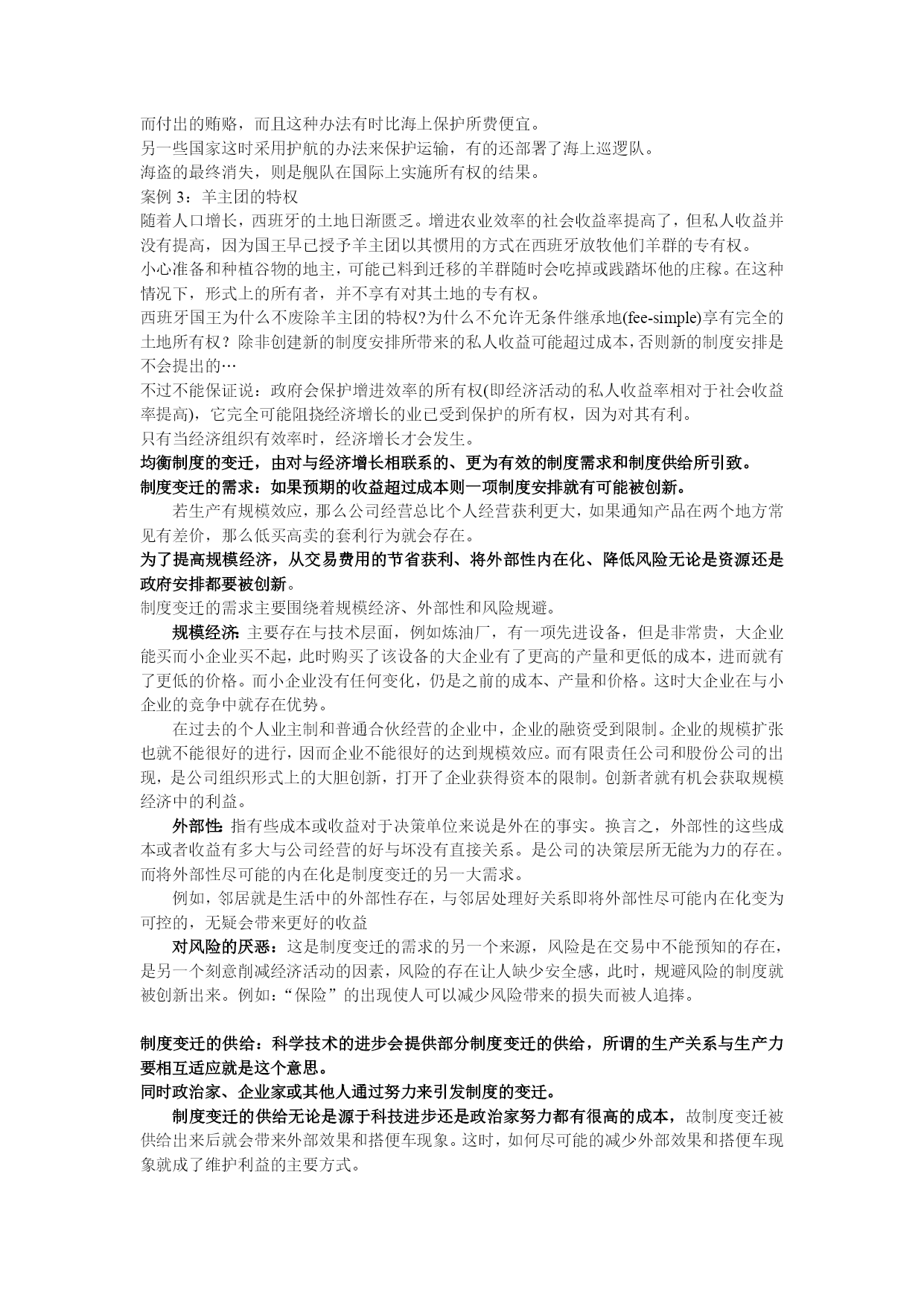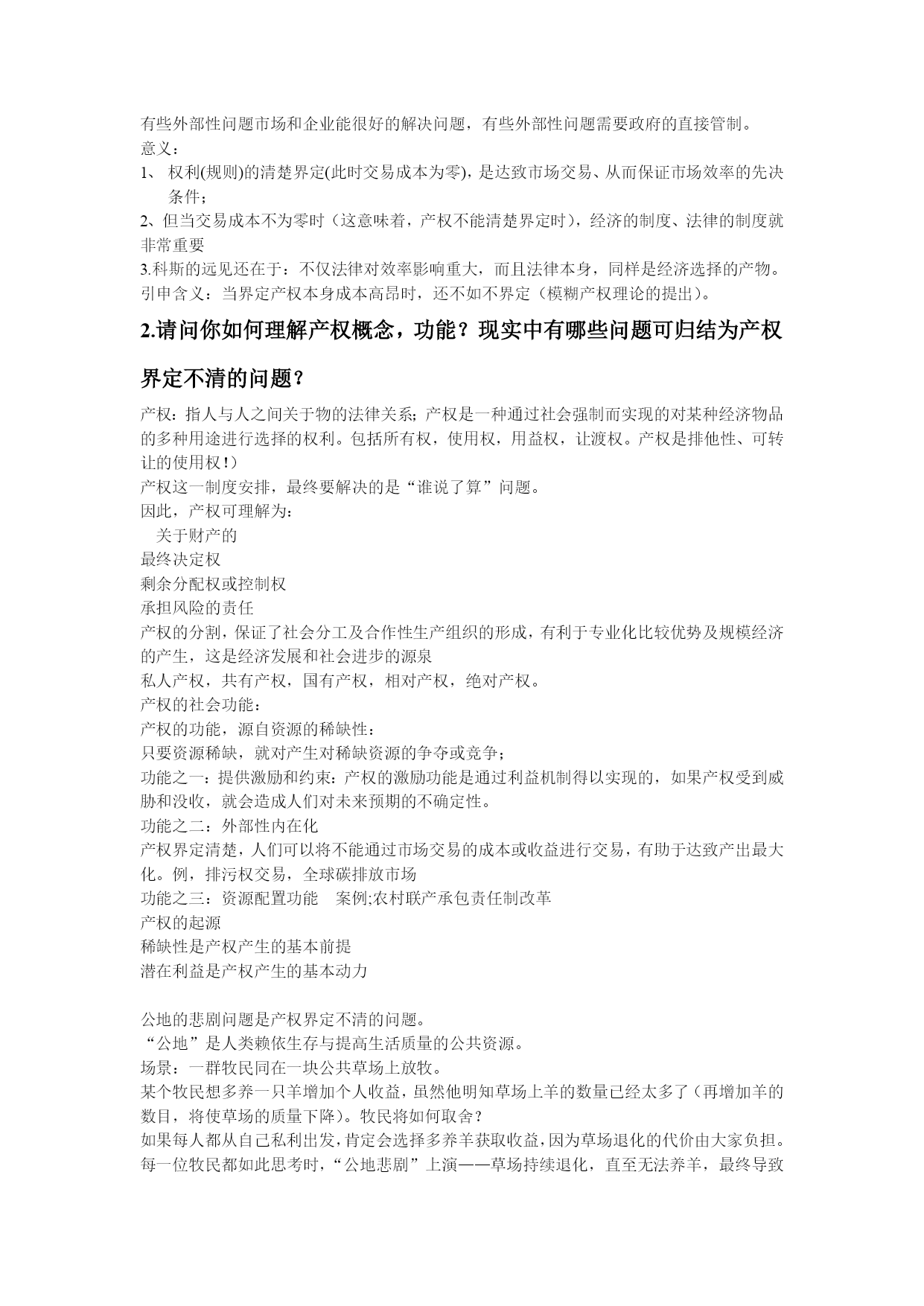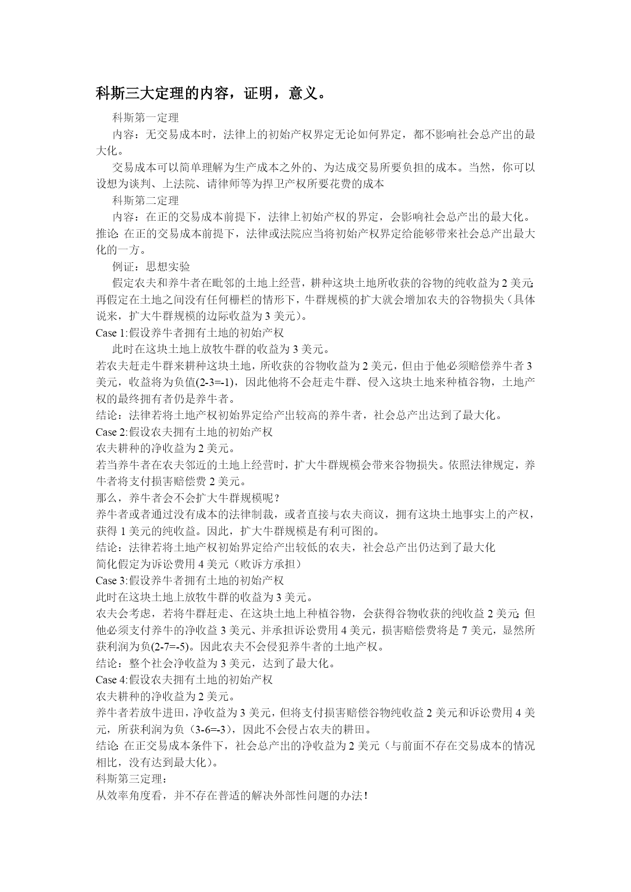 制度经济学重点整理最新文档(可以直接使用,可编辑最新文档,欢迎下载)科斯三大定理的内容,证明,意义。科斯第一定理内容:无交易成本时,法律上的初始产权界定无论如何界定,都不影响社会总产出的最大化。交易成本可以简单理解为生产成本之外的、为达成交易所要负担的成本。当然,你可以设想为谈判、上法院、请律师等为捍卫产权所要花费的成本科斯第二定理内容:在正的交易成本前提下,法律上初始产权的界定,会影响社会总产出的最大化。推论:在正的交易成本前提下,法律或法院应当将初始产权界定给能够带来社会总产出最大化的一方。例证:思想实验假定农夫和养牛者在毗邻的土地上经营,耕种这块土地所收获的谷物的纯收益为2美元;再假定在土地之间没有任何栅栏的情形下,牛群规模的扩大就会增加农夫的谷物损失(具体说来,扩大牛群规模的边际收益为3美元)。Case1:假设养牛者拥有土地的初始产权此时在这块土地上放牧牛群的收益为3美元。若农夫赶走牛群来耕种这块土地,所收获的谷物收益为2美元,但由于他必须赔偿养牛者3美元,收益将为负值(2-3=-1),因此他将不会赶走牛群、侵入这块土地来种植谷物,土地产权的最终拥有者仍是养牛者。结论:法律若将土地产权初始界定给产出较高的养牛者,社会总产出达到了最大化。Case2:假设农夫拥有土地的初始产权农夫耕种的净收益为2美元。若当养牛者在农夫邻近的土地上经营时,扩大牛群规模会带来谷物损失。依照法律规定,养牛者将支付损害赔偿费2美元。那么,养牛者会不会扩大牛群规模呢?养牛者或者通过没有成本的法律制裁,或者直接与农夫商议,拥有这块土地事实上的产权,获得1美元的纯收益。因此,扩大牛群规模是有利可图的。结论:法律若将土地产权初始界定给产出较低的农夫,社会总产出仍达到了最大化简化假定为诉讼费用4美元(败诉方承担)Case3:假设养牛者拥有土地的初始产权此时在这块土地上放牧牛群的收益为3美元。农夫会考虑,若将牛群赶走、在这块土地上种植谷物,会获得谷物收获的纯收益2美元;但他必须支付养牛的净收益3美元、并承担诉讼费用4美元,损害赔偿费将是7美元,显然所获利润为负(2-7=-5)。因此农夫不会侵犯养牛者的土地产权。结论:整个社会净收益为3美元,达到了最大化。Case4:假设农夫拥有土地的初始产权农夫耕种的净收益为2美元。养牛者若放牛进田,净收益为3美元,但将支付损害赔偿谷物纯收益2美元和诉讼费用4美元,所获利润为负(3-6=-3),因此不会侵占农夫的耕田。结论:在正交易成本条件下,社会总产出的净收益为2美元(与前面不存在交易成本的情况相比,没有达到最大化)。科斯第三定理:从效率角度看,并不存在普适的解决外部性问题的办法!有些外部性问题市场和企业能很好的解决问题,有些外部性问题需要政府的直接管制。意义:权利(规则)的清楚界定(此时交易成本为零),是达致市场交易、从而保证市场效率的先决条件;2、但当交易成本不为零时(这意味着,产权不能清楚界定时),经济的制度、法律的制度就非常重要3.科斯的远见还在于:不仅法律对效率影响重大,而且法律本身,同样是经济选择的产物。引申含义:当界定产权本身成本高昂时,还不如不界定(模糊产权理论的提出)。2.请问你如何理解产权概念,功能?现实中有哪些问题可归结为产权界定不清的问题?产权:指人与人之间关于物的法律关系;产权是一种通过社会强制而实现的对某种经济物品的多种用途进行选择的权利。包括所有权,使用权,用益权,让渡权。产权是排他性、可转让的使用权!)产权这一制度安排,最终要解决的是“谁说了算”问题。因此,产权可理解为:关于财产的最终决定权剩余分配权或控制权承担风险的责任产权的分割,保证了社会分工及合作性生产组织的形成,有利于专业化比较优势及规模经济的产生,这是经济发展和社会进步的源泉私人产权,共有产权,国有产权,相对产权,绝对产权。产权的社会功能:产权的功能,源自资源的稀缺性:只要资源稀缺,就对产生对稀缺资源的争夺或竞争;功能之一:提供激励和约束:产权的激励功能是通过利益机制得以实现的,如果产权受到威胁和没收,就会造成人们对未来预期的不确定性。功能之二:外部性内在化产权界定清楚,人们可以将不能通过市场交易的成本或收益进行交易,有助于达致产出最大化。例,排污权交易,全球碳排放市场功能之三:资源配置功能案例;农村联产承包责任制改革产权的起源稀缺性是产权产生的基本前提潜在利益是产权产生的基本动力公地的悲剧问题是产权界定不清的问题。“公地”是人类赖依生存与提高生活质量的公共资源。场景:一群牧民同在一块公共草场上放牧。某个牧民想多养一只羊增加个人收益,虽然他明知草场上羊的数量已经太多了(再增加羊的数目,将使草场的质量下降