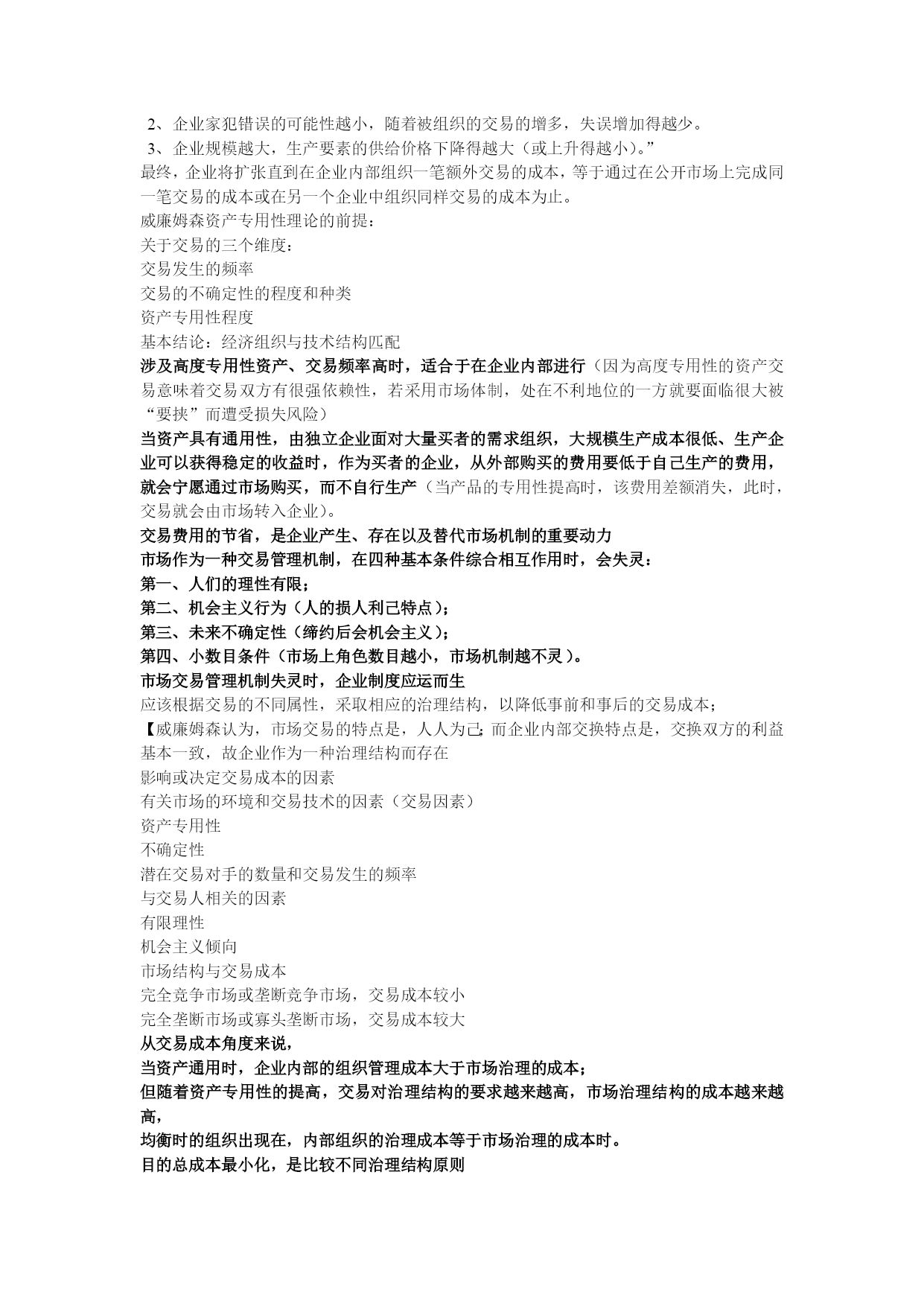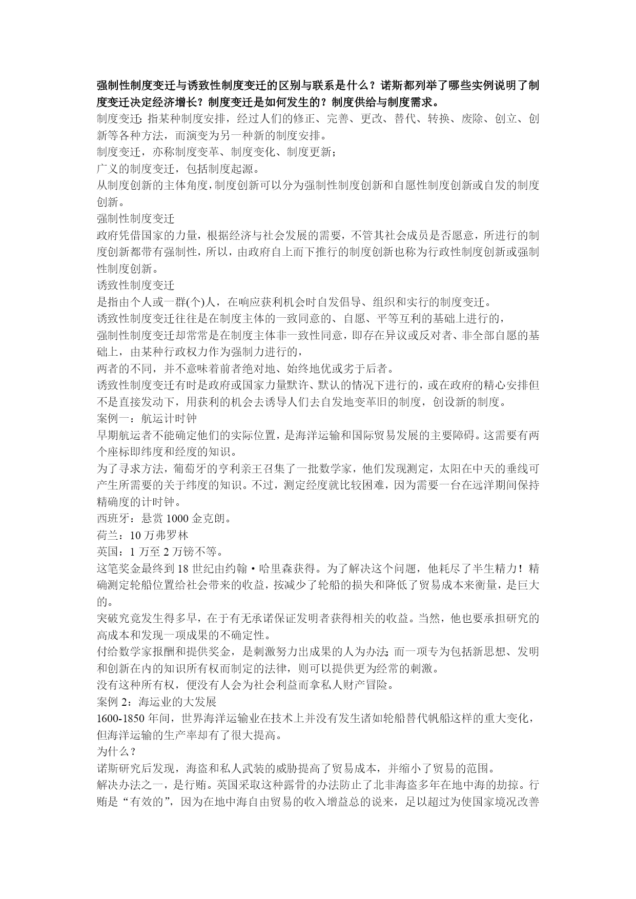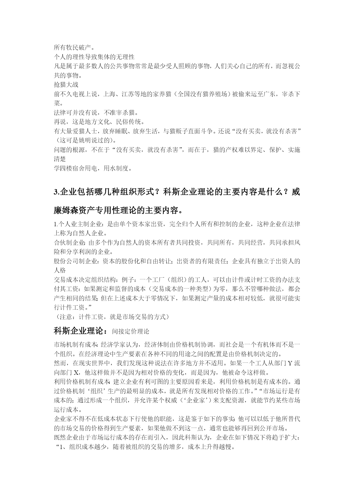 制度经济学重点整理最新文档(可以直接使用,可编辑最新文档,欢迎下载)科斯三大定理的内容,证明,意义。科斯第一定理内容:无交易成本时,法律上的初始产权界定无论如何界定,都不影响社会总产出的最大化。交易成本可以简单理解为生产成本之外的、为达成交易所要负担的成本。当然,你可以设想为谈判、上法院、请律师等为捍卫产权所要花费的成本科斯第二定理内容:在正的交易成本前提下,法律上初始产权的界定,会影响社会总产出的最大化。推论:在正的交易成本前提下,法律或法院应当将初始产权界定给能够带来社会总产出最大化的一方。例证:思想实验假定农夫和养牛者在毗邻的土地上经营,耕种这块土地所收获的谷物的纯收益为2美元;再假定在土地之间没有任何栅栏的情形下,牛群规模的扩大就会增加农夫的谷物损失(具体说来,扩大牛群规模的边际收益为3美元)。Case1:假设养牛者拥有土地的初始产权此时在这块土地上放牧牛群的收益为3美元。若农夫赶走牛群来耕种这块土地,所收获的谷物收益为2美元,但由于他必须赔偿养牛者3美元,收益将为负值(2-3=-1),因此他将不会赶走牛群、侵入这块土地来种植谷物,土地产权的最终拥有者仍是养牛者。结论:法律若将土地产权初始界定给产出较高的养牛者,社会总产出达到了最大化。Case2:假设农夫拥有土地的初始产权农夫耕种的净收益为2美元。若当养牛者在农夫邻近的土地上经营时,扩大牛群规模会带来谷物损失。依照法律规定,养牛者将支付损害赔偿费2美元。那么,养牛者会不会扩大牛群规模呢?养牛者或者通过没有成本的法律制裁,或者直接与农夫商议,拥有这块土地事实上的产权,获得1美元的纯收益。因此,扩大牛群规模是有利可图的。结论:法律若将土地产权初始界定给产出较低的农夫,社会总产出仍达到了最大化简化假定为诉讼费用4美元(败诉方承担)Case3:假设养牛者拥有土地的初始产权此时在这块土地上放牧牛群的收益为3美元。农夫会考虑,若将牛群赶走、在这块土地上种植谷物,会获得谷物收获的纯收益2美元;但他必须支付养牛的净收益3美元、并承担诉讼费用4美元,损害赔偿费将是7美元,显然所获利润为负(2-7=-5)。因此农夫不会侵犯养牛者的土地产权。结论:整个社会净收益为3美元,达到了最大化。Case4:假设农夫拥有土地的初始产权农夫耕种的净收益为2美元。养牛者若放牛进田,净收益为3美元,但将支付损害赔偿谷物纯收益2美元和诉讼费用4美元,所获利润为负(3-6=-3),因此不会侵占农夫的耕田。结论:在正交易成本条件下,社会总产出的净收益为2美元(与前面不存在交易成本的情况相比,没有达到最大化)。科斯第三定理:从效率角度看,并不存在普适的解决外部性问题的办法!有些外部性问题市场和企业能很好的解决问题,有些外部性问题需要政府的直接管制。意义:权利(规则)的清楚界定(此时交易成本为零),是达致市场交易、从而保证市场效率的先决条件;2、但当交易成本不为零时(这意味着,产权不能清楚界定时),经济的制度、法律的制度就非常重要3.科斯的远见还在于:不仅法律对效率影响重大,而且法律本身,同样是经济选择的产物。引申含义:当界定产权本身成本高昂时,还不如不界定(模糊产权理论的提出)。2.请问你如何理解产权概念,功能?现实中有哪些问题可归结为产权界定不清的问题?产权:指人与人之间关于物的法律关系;产权是一种通过社会强制而实现的对某种经济物品的多种用途进行选择的权利。包括所有权,使用权,用益权,让渡权。产权是排他性、可转让的使用权!)产权这一制度安排,最终要解决的是“谁说了算”问题。因此,产权可理解为:关于财产的最终决定权剩余分配权或控制权承担风险的责任产权的分割,保证了社会分工及合作性生产组织的形成,有利于专业化比较优势及规模经济的产生,这是经济发展和社会进步的源泉私人产权,共有产权,国有产权,相对产权,绝对产权。产权的社会功能:产权的功能,源自资源的稀缺性:只要资源稀缺,就对产生对稀缺资源的争夺或竞争;功能之一:提供激励和约束:产权的激励功能是通过利益机制得以实现的,如果产权受到威胁和没收,就会造成人们对未来预期的不确定性。功能之二:外部性内在化产权界定清楚,人们可以将不能通过市场交易的成本或收益进行交易,有助于达致产出最大化。例,排污权交易,全球碳排放市场功能之三:资源配置功能案例;农村联产承包责任制改革产权的起源稀缺性是产权产生的基本前提潜在利益是产权产生的基本动力公地的悲剧问题是产权界定不清的问题。“公地”是人类赖依生存与提高生活质量的公共资源。场景:一群牧民同在一块公共草场上放牧。某个牧民想多养一只羊增加个人收益,虽然他明知草场上羊的数量已经太多了(再增加羊的数目,将使草场的质量下降