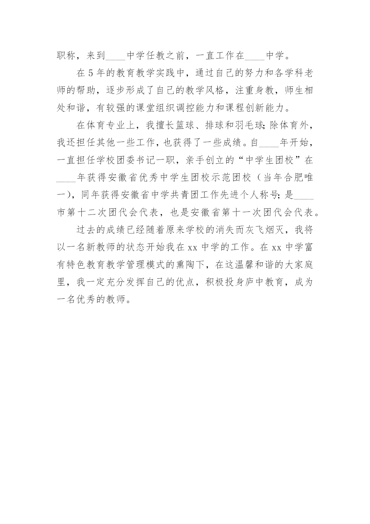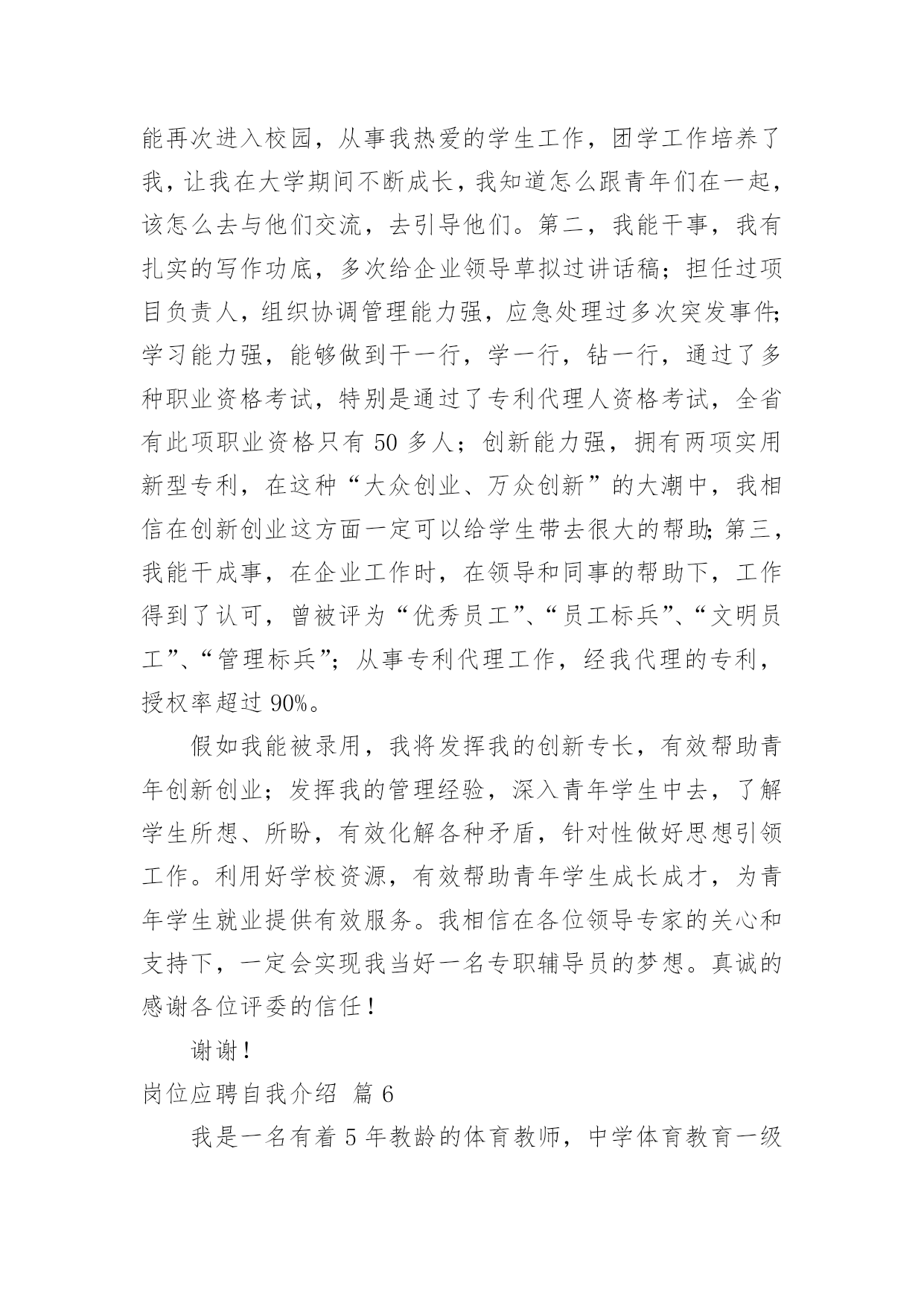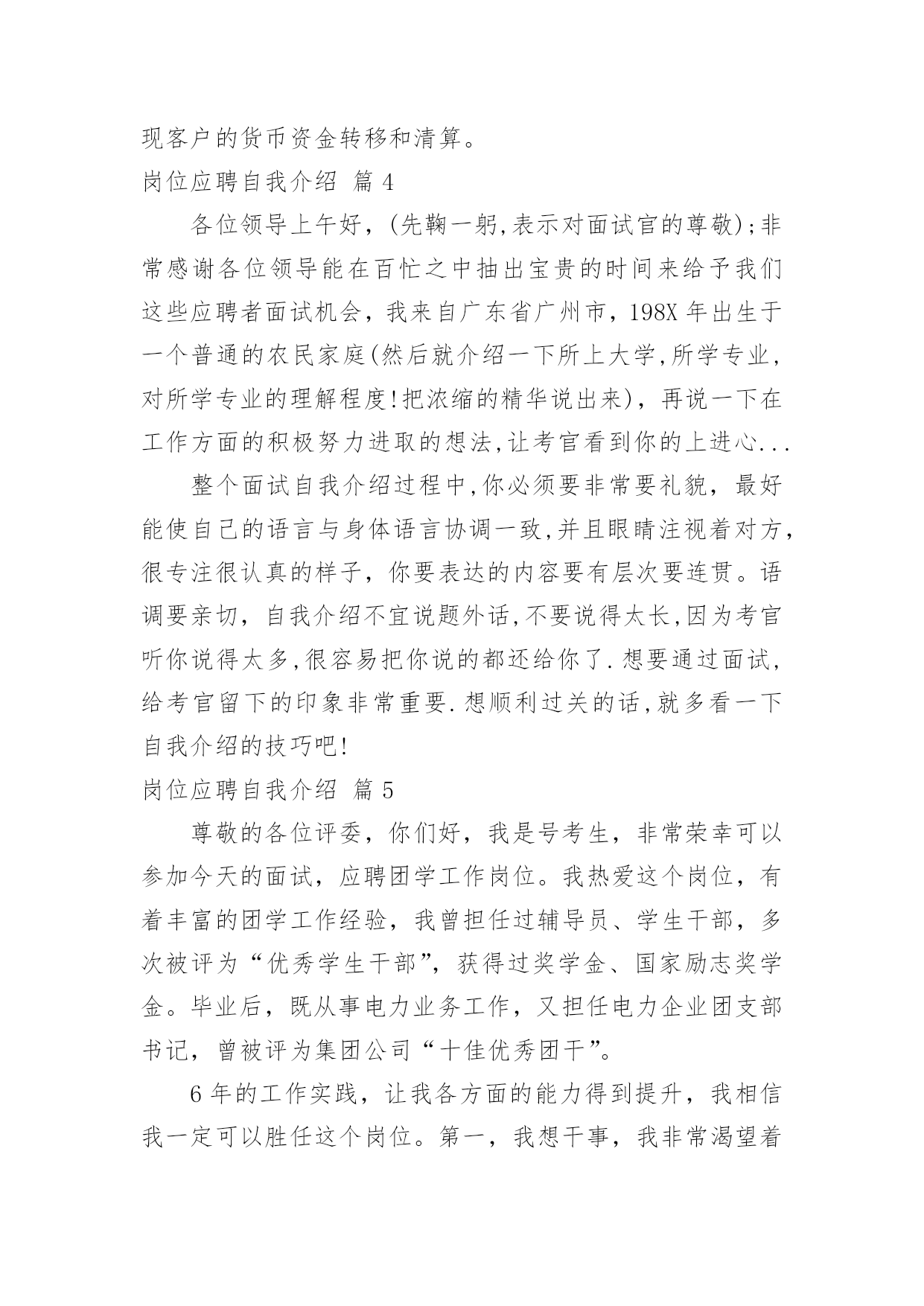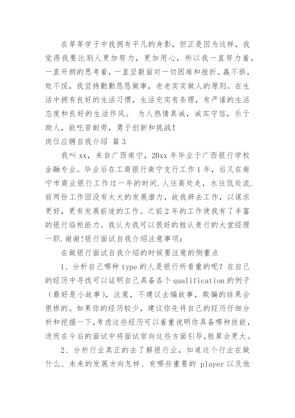 岗位应聘自我介绍岗位应聘自我介绍汇编6篇当碰到不熟悉的人时,时常需要我们进行一个自我介绍,自我介绍可以唤起他人对我们的兴趣。现在你是否对自我介绍一筹莫展呢?下面是小编精心整理的岗位应聘自我介绍6篇,仅供参考,希望能够帮助到大家。岗位应聘自我介绍篇1尊敬的各位考官:你们好!今天能够在这里参加xx招聘教师的面试,我感到非常高兴,首先请允许我做一个简短的自我介绍。我是xx号考生,xx专业硕士研究生毕业。从小我就对教师这个职业有着深深的向往,但我深知要成为一名合格的人民教师,不仅要有丰富的知识,还要有出众的能力。于是,在x年的大学生活中,我始终努力学习专业课程,不断钻研专业知识,同时非常注重培养自己作为一个教师所必备的专业技能。我顺利通过了教师课堂技能测试和普通话测试,并获取了教师资格证书,具备了一个教师所需要的基本条件。此外我还利用课余时间在xx教学机构、xx教育集团等兼职中小学xx课程课外辅导工作,这些社会经历使我的课堂教学能力得到很好的提升,尤其xx年xx月在xx学校的教学实习,更增加了我对教师工作的热爱。此外,我性格沉稳,心地善良又不缺乏爱心,我相信自己一定能够胜任教师这个职位。今天站在这里,我恳请各位考官能够给我一次成为教师的机会,或许我不是令您满意的,但我相信依靠努力,我将成为最合适的;或许我不是最优秀的,但我知道经过磨练,我一定是有潜力的。如果我能有幸成为一名人民教师,我将全力以赴,以自己的爱心,热心和敬业之心去实现我儿时的梦想;我将挥洒汗水,用我的激情,热情和感恩之情去延续今生的奋斗目标。我的介绍完毕。谢谢大家。岗位应聘自我介绍篇2我是一个性格开朗、乐于助人的人。对于工作能够细心有耐性,自学能力强,有责任心,具备良好的团队合作精神,踏实肯干,积极上进。能够虚心向他人学习,有较强的组织及领导策划的能力。在学校的两年光阴岁月里,我惜时如金,不断从各方面严格要求自己。除了完成学校的教学大纲要求,我还大量涉猎各方面的知识,并努力提高自身学历(专升本)。通过看报、听广播、看电视、上网、与老师、同学讨论等等,不仅扩大自己的知识面、增长见识,而且帮助自己正确地树立了人生观、价值观:对社会做出自己的贡献!作为正要跨出校门,迈向社会的职校生,我以满腔的热情与信心去迎接这一切。我希望将自己在校所学所知用于实际,发挥自己所长。希望可以给我这次机会。正所谓士为知已者死,我相信自己的饱满的工作热情以及认真好学的态度完全可以胜任这项工作。在莘莘学子中我拥有平凡的身影,但正是因为这样,我觉得我要比别人更加努力,更加用心,所以我一直努力着,一直开朗的思考着,一直坚毅面对一切困难和挫折。赢不骄,败不馁,我坚持勤勤恳恳做事,老老实实做人的原则。在生活中拥有良好的生活习惯,生活充实有条理,有严谨的生活态度和良好的生活作风。为人热情真诚,诚实守信,乐于助人,能吃苦耐劳,勇于创新和挑战!岗位应聘自我介绍篇3我叫xx,来自广西南宁,20xx年毕业于广西银行学校金融专业。毕业后在工商银行南宁支行工作1年,后又在南宁市商业银行工作过一年的时间.人往高处走,水往低处流.前两份工作因没有太大的发展潜力,故我辞去工作,以谋求更好,更有发展前途的工作。之前2年的工作使我有了丰富的银行临柜能力。我认为我可以很好的胜认贵行的大堂经理一职.谢谢!银行面试自我介绍注意事项:在做银行面试自我介绍的时候要注意的侧重点1、分析自己哪种type的人是银行所看重的呢?在自己的经历中寻找可以证明自己具备各个qualification的例子(最好是小故事),注意,不建议去编故事,欺骗的结果会很惨的。如果你的经历较少,建议你先将自己的经历仔细分析和挖掘一下,考虑这些经历可以着重说明你具备哪种技能,进而在今后的面试中将面试官向这些方面引导,胜算会更大。2、分析行业真正的去了解银行业,知道这个行业在做什么、未来的发展方向怎样、有哪些重要的player以及他们之间的核心竞争力差异等等(在中国活跃的投行有那么几家,在管理运作和优势劣势方面仍有一定的不同,要通过新闻等各种渠道了解它们)。3、分析目标公司知道这个公司的优势在哪里(去网站上仔细看看吧),曾经做过哪些deal和拥有的大客户(特别是在亚太市场上,做一个newsrun),他们的文化(如果可以说明你的性格适合这种文化就更好了,如goldman的teamplayer文化)等等。4、分析你要申请的部门和职位投行有很多部门,工作性质差异非常大,对每个人的要求也就不太一样。而且,在列举公司业绩的时候也要有的放矢。举个例子,qfii就不是ibd的业务,不良资产处置在goldman里也不是ibd的业务。在面试ibd的时候强调这些,并不一定能够有效的刺激面试官的神经。5、熟悉求职简历上写的都是自己曾经做过的事情,没有理由不知道具体的内容。投行里的人喜欢看细节、刨
