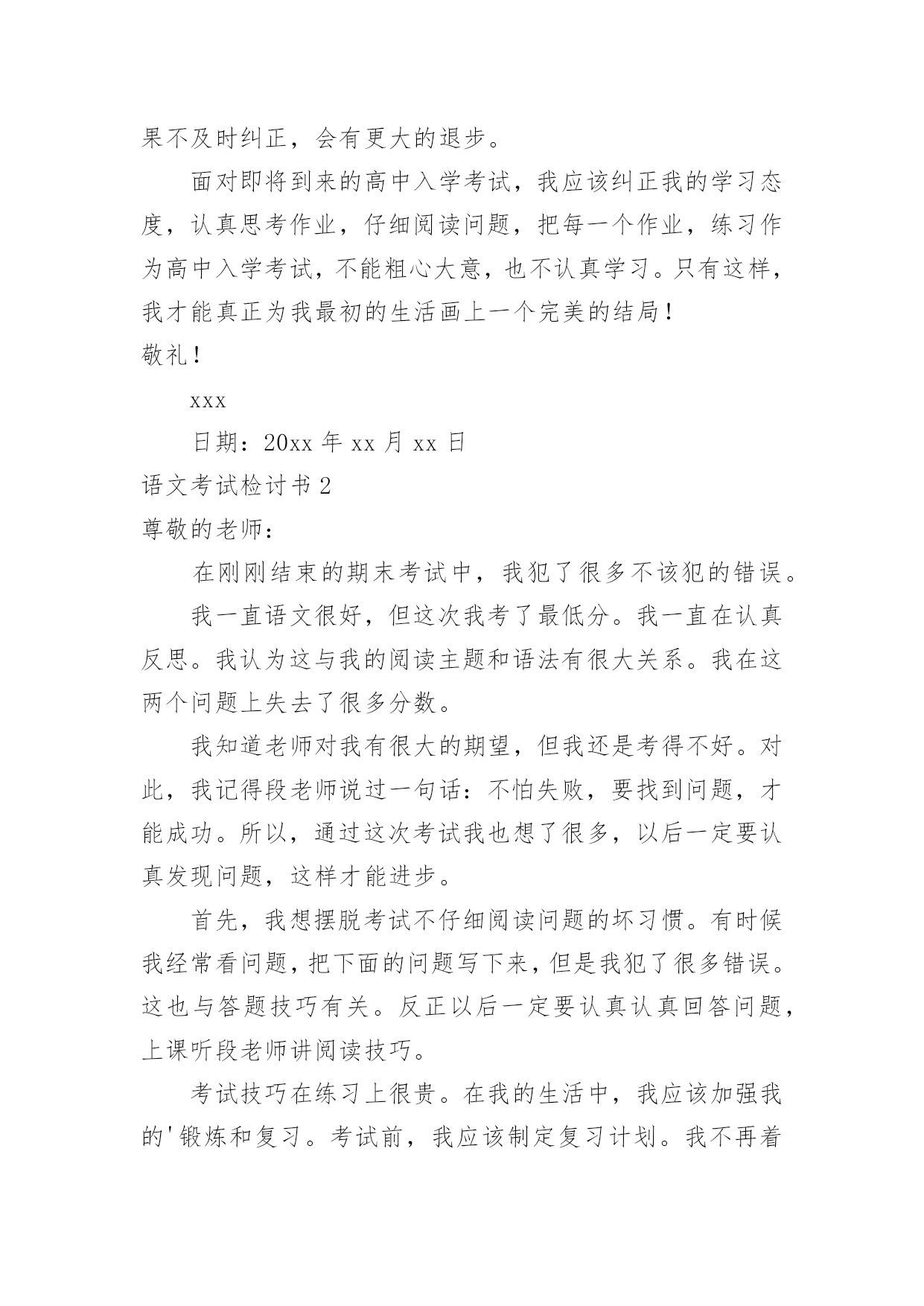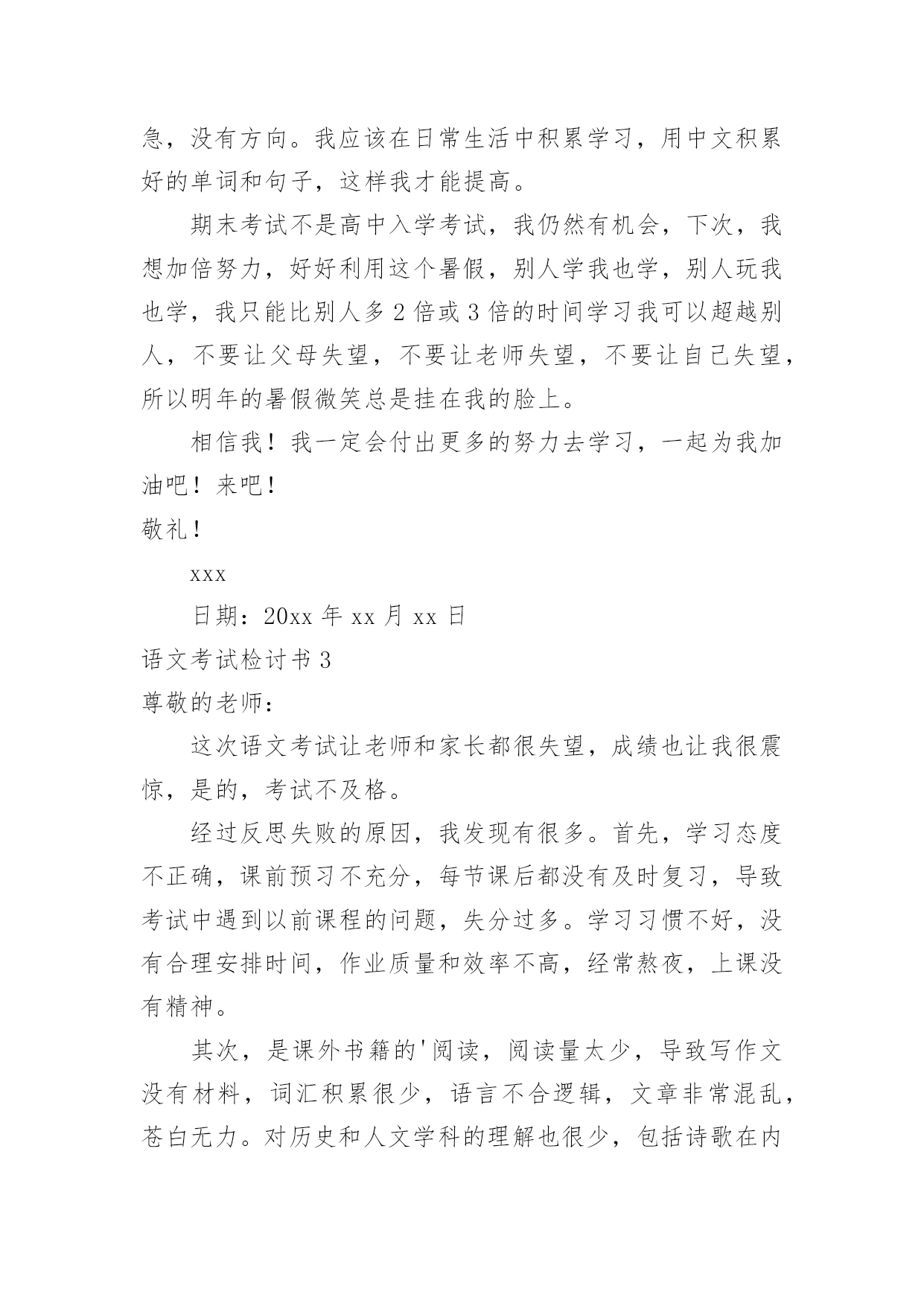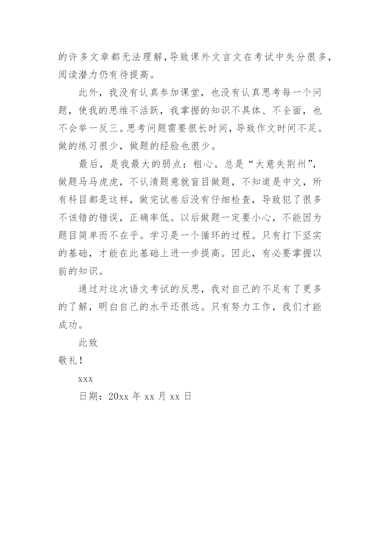 语文考试检讨书语文考试检讨书在有过错的情况下,为了避免今后再出现此类事件,往往要写检讨书来自我悔悟,请注意写检讨要把原因讲清楚。什么样的检讨书才是好的检讨书呢?以下是小编整理的语文考试检讨书,仅供参考,希望能够帮助到大家。语文考试检讨书1尊敬的老师:这是三年级第一次重要考试,但当结果发布时,我对自己的结果非常不满意。这次的总分不是很高,比以前退步了很多。因为这次用的是答题卡,所以我去学校的语文老师重新判断。最后,看着被重新判断的试卷,总结出来的问题是:平时不注意细节,对考试不够重视。语文基础错误太多,改错别字和选择错误。以分数的形式向我反映了我平时不认真积累,不知道如何关注小节的问题。还有这篇作文,不是特别难写的题目,但是因为没有充分的准备,不得不写一篇平时没有特色的作文。对于这个大退步,我也在反思自己的学习习惯和态度。从初三开始,本该紧张努力的阶段,但学习态度不是很端正。总是马马虎虎地做题,完成作业,不认真做论文,总是马马虎虎,看完题就急着做。这些都是我学习中的`大问题。如果不及时纠正,会有更大的退步。面对即将到来的高中入学考试,我应该纠正我的学习态度,认真思考作业,仔细阅读问题,把每一个作业,练习作为高中入学考试,不能粗心大意,也不认真学习。只有这样,我才能真正为我最初的生活画上一个完美的结局!敬礼!xxx日期:20xx年xx月xx日语文考试检讨书2尊敬的老师:在刚刚结束的期末考试中,我犯了很多不该犯的错误。我一直语文很好,但这次我考了最低分。我一直在认真反思。我认为这与我的阅读主题和语法有很大关系。我在这两个问题上失去了很多分数。我知道老师对我有很大的期望,但我还是考得不好。对此,我记得段老师说过一句话:不怕失败,要找到问题,才能成功。所以,通过这次考试我也想了很多,以后一定要认真发现问题,这样才能进步。首先,我想摆脱考试不仔细阅读问题的坏习惯。有时候我经常看问题,把下面的问题写下来,但是我犯了很多错误。这也与答题技巧有关。反正以后一定要认真认真回答问题,上课听段老师讲阅读技巧。考试技巧在练习上很贵。在我的生活中,我应该加强我的'锻炼和复习。考试前,我应该制定复习计划。我不再着急,没有方向。我应该在日常生活中积累学习,用中文积累好的单词和句子,这样我才能提高。期末考试不是高中入学考试,我仍然有机会,下次,我想加倍努力,好好利用这个暑假,别人学我也学,别人玩我也学,我只能比别人多2倍或3倍的时间学习我可以超越别人,不要让父母失望,不要让老师失望,不要让自己失望,所以明年的暑假微笑总是挂在我的脸上。相信我!我一定会付出更多的努力去学习,一起为我加油吧!来吧!敬礼!xxx日期:20xx年xx月xx日语文考试检讨书3尊敬的老师:这次语文考试让老师和家长都很失望,成绩也让我很震惊,是的,考试不及格。经过反思失败的原因,我发现有很多。首先,学习态度不正确,课前预习不充分,每节课后都没有及时复习,导致考试中遇到以前课程的问题,失分过多。学习习惯不好,没有合理安排时间,作业质量和效率不高,经常熬夜,上课没有精神。其次,是课外书籍的'阅读,阅读量太少,导致写作文没有材料,词汇积累很少,语言不合逻辑,文章非常混乱,苍白无力。对历史和人文学科的理解也很少,包括诗歌在内的许多文章都无法理解,导致课外文言文在考试中失分很多,阅读潜力仍有待提高。此外,我没有认真参加课堂,也没有认真思考每一个问题,使我的思维不活跃,我掌握的知识不具体、不全面,也不会举一反三。思考问题需要很长时间,导致作文时间不足。做的练习很少,做题的经验也很少。最后,是我最大的弱点:粗心。总是“大意失荆州”,做题马马虎虎,不认清题意就盲目做题,不知道是中文,所有科目都是这样,做完试卷后没有仔细检查,导致犯了很多不该错的错误,正确率低。以后做题一定要小心,不能因为题目简单而不在乎。学习是一个循环的过程。只有打下坚实的基础,才能在此基础上进一步提高。因此,有必要掌握以前的知识。通过对这次语文考试的反思,我对自己的不足有了更多的了解,明白自己的水平还很远。只有努力工作,我们才能成功。此致敬礼!xxx日期:20xx年xx月xx日