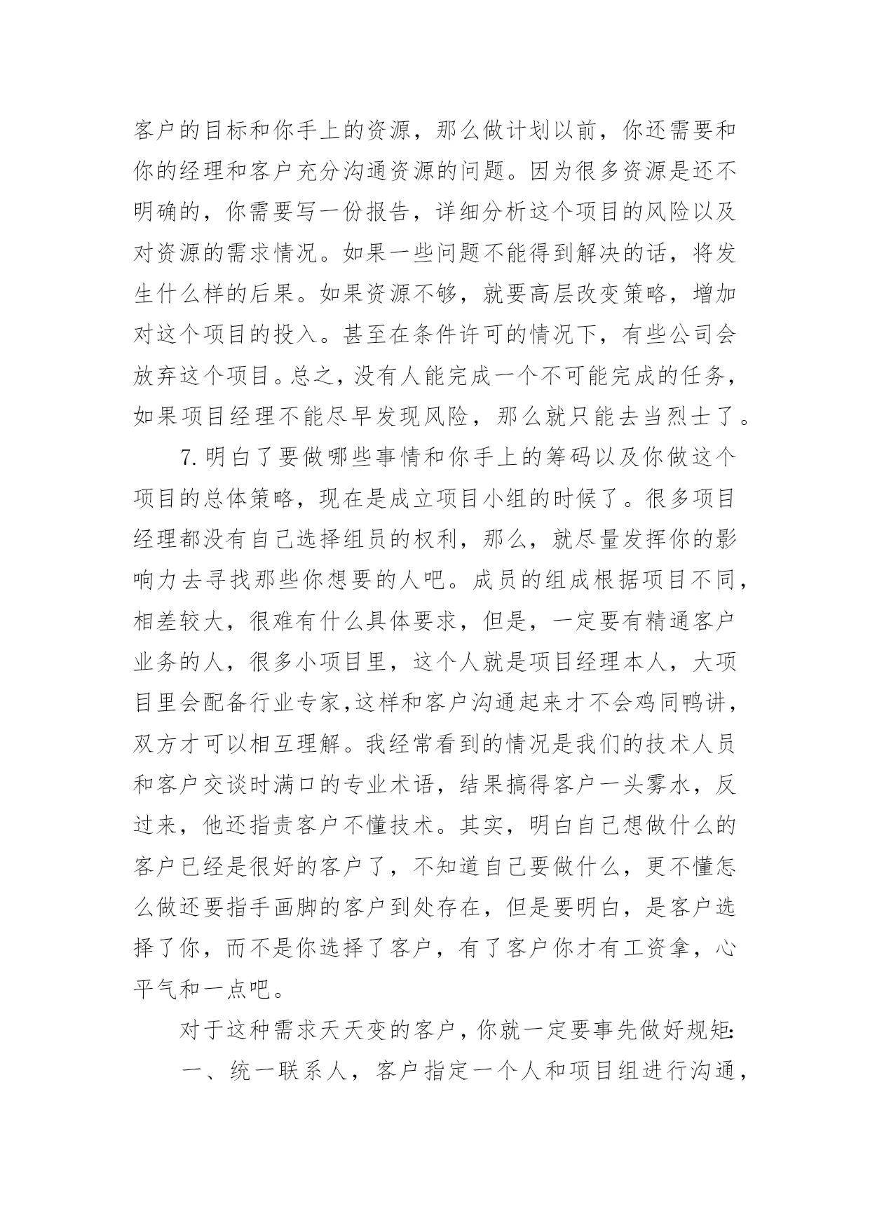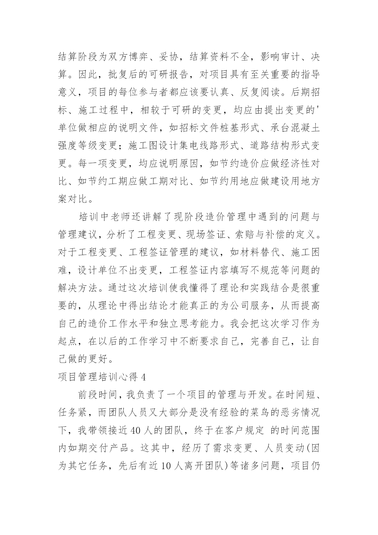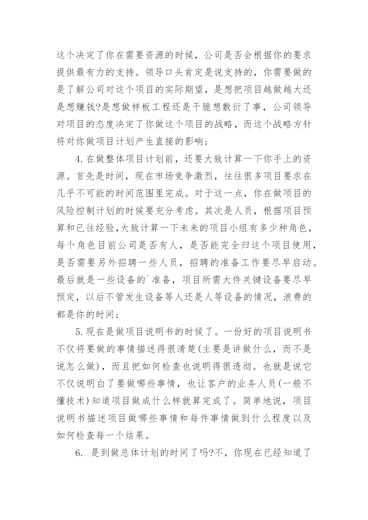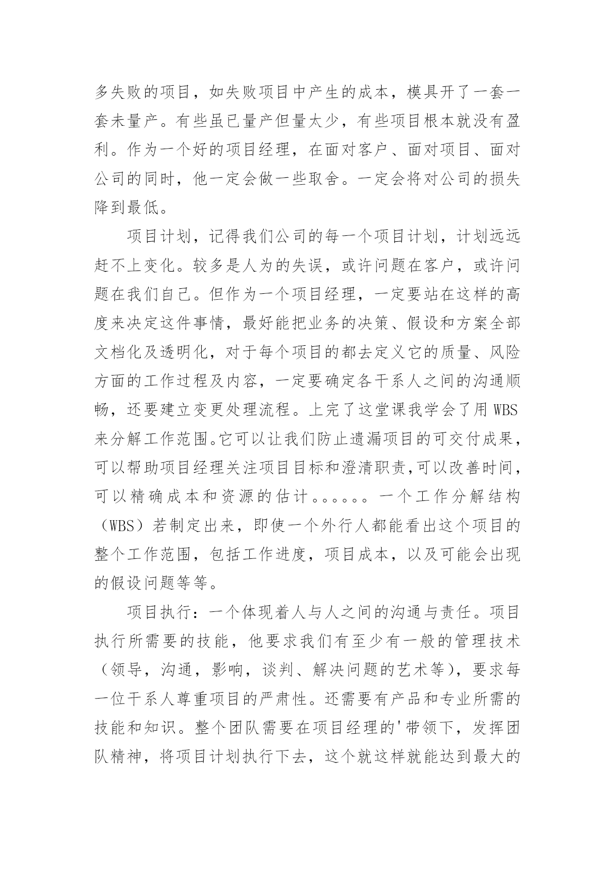 项目管理培训心得项目管理培训心得当我们心中积累了不少感想和见解时,有这样的时机,要好好记录下来,这样我们可以养成良好的总结方法。怎样写好心得体会呢?以下是小编为大家收集的项目管理培训心得,供大家参考借鉴,希望可以帮助到有需要的朋友。项目管理培训心得1非常感谢公司给我这次项目管理的培训、提升自我的机会。这次培训使我增加了许多知识的同时,更及时发现了自已的不足。深刻体会到项目管理的重要性。更对咱们维拉通信的企业文化有了更深层次的认识。这次培训让我深刻检查和审视自己知识经验,也培养了我在学习创新,应变,沟通,团队的建设;在每个项目中的计划和预算、实施+控制、协调+整合、以及如何能让客户满意等等方面得到充足的外界空气吸入,充实了自己。提升阿拉的思维能力,帮助我培育机遇,加强辩识能力,提高判断能力,掌握管理能力和组织战略推进能力等等。不会选择项目不是一个好的项目经理,以前在工作中只是因为SALES取得了项目不易就一定要完成,出无法判别项目的优劣,抱着上面都同意了,我们执行人还能有什么意见的心理,正因为这种心理却遗留了很多历史问题:导致了较多失败的项目,如失败项目中产生的成本,模具开了一套一套未量产。有些虽已量产但量太少,有些项目根本就没有盈利。作为一个好的项目经理,在面对客户、面对项目、面对公司的同时,他一定会做一些取舍。一定会将对公司的损失降到最低。项目计划,记得我们公司的每一个项目计划,计划远远赶不上变化。较多是人为的失误,或许问题在客户,或许问题在我们自己。但作为一个项目经理,一定要站在这样的高度来决定这件事情,最好能把业务的决策、假设和方案全部文档化及透明化,对于每个项目的都去定义它的质量、风险方面的工作过程及内容,一定要确定各干系人之间的沟通顺畅,还要建立变更处理流程。上完了这堂课我学会了用WBS来分解工作范围。它可以让我们防止遗漏项目的可交付成果,可以帮助项目经理关注项目目标和澄清职责,可以改善时间,可以精确成本和资源的估计。。。。。。一个工作分解结构(WBS)若制定出来,即使一个外行人都能看出这个项目的整个工作范围,包括工作进度,项目成本,以及可能会出现的假设问题等等。项目执行:一个体现着人与人之间的沟通与责任。项目执行所需要的技能,他要求我们有至少有一般的管理技术(领导,沟通,影响,谈判、解决问题的艺术等),要求每一位干系人尊重项目的严肃性。还需要有产品和专业所需的技能和知识。整个团队需要在项目经理的'带领下,发挥团队精神,将项目计划执行下去,这个就这样就能达到最大的收益和最好的结果。项目控制:一个体现了项目的管理计划和项目范围说明所确定的绩效目标的过程,我们要对范围变更,进度变更,成本,质量,绩效报告与审查,风险监督与控制等等方面来管控。项目收尾:是正式结束一个项目或阶段的所有活动,将完成的产品移交他人,或者中止一个被取消的项目所进行的系列过程。在这个过程中对每一步都不能含糊,如:验收,清理,及时对供应商进行验收和结算,保证项目的记录完整,并且总结经验教训。积累流程资产,最好实现知识管理……项目的失败的原因有很多种,大多数项目的失败原因,可能缺乏客户参与,管理层的支持不充分,没有执行力,拙劣的计划,恶性资源冲突,项目经理的错误任命,不合适的项目组织形式……所以做好一个项目经理要不断地去充实自己,不断的严格要求自己,不断的展现你的人格魅力……希望每一个项目领导者用你领导的艺术去影响您的整个团队。以达到双赢的效果。真心希望下次有继续培训的机会。项目管理培训心得2本人做项目经理工作多年,感到做这个工作最要紧的就是要明白什么是因地制宜、因势利导,只有最合适的,没有什么叫对的,什么叫错的,项目经理最忌讳的就是完美主义倾向,尤其是做技术人员出身的,喜欢寻找标准答案,耽误了工作进度,也迷茫了自己。以下是本人一些做项目的个人体会,写出来供大家指点,在讨论过程中共同提高水平。项目开始阶段是一个最重要的阶段。项目经理在接手一个新项目的时候,首先要尽可能地多从各个方面了解项目的情况,如:1.这个项目是什么项目,具体大概做什么事情,是谁提出来的,目的是解决什么问题。在国内很多客户都很不成熟的情况下,千万不要根据项目的名称望文生义地去想象项目的目标。一个名为“办公自动化”的项目很有可能在你进场以后一个月才发现客户其实需要的是一个计算机生产管理辅助信息系统系统。前期了解情况的工作越详细,后面的惊讶就越少,项目的风险就越小。2.这个项目里牵涉哪些方面的人,如投资方、具体业务干系方、项目建成后的运营方、技术监督方等等,很多项目里除了业主单位的结构很复杂以外,还有一些其他单位也会牵涉进来,如项目监理公司、业主的行业主管机构等。项目经理需要了解每个方面的人对这个项目的看法和期望是什么。事先了解各个方面的看法和期望,可以让你在做项目碰到问题的时候,就每
