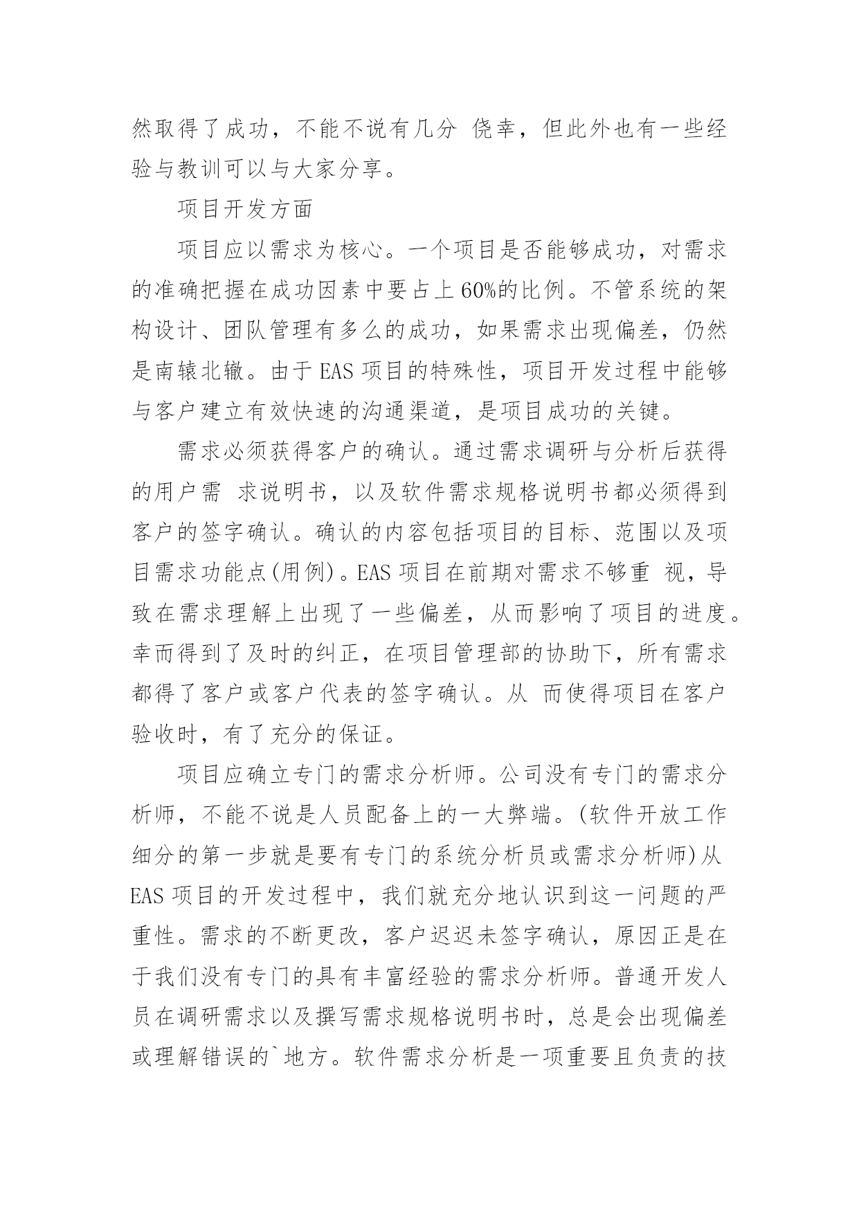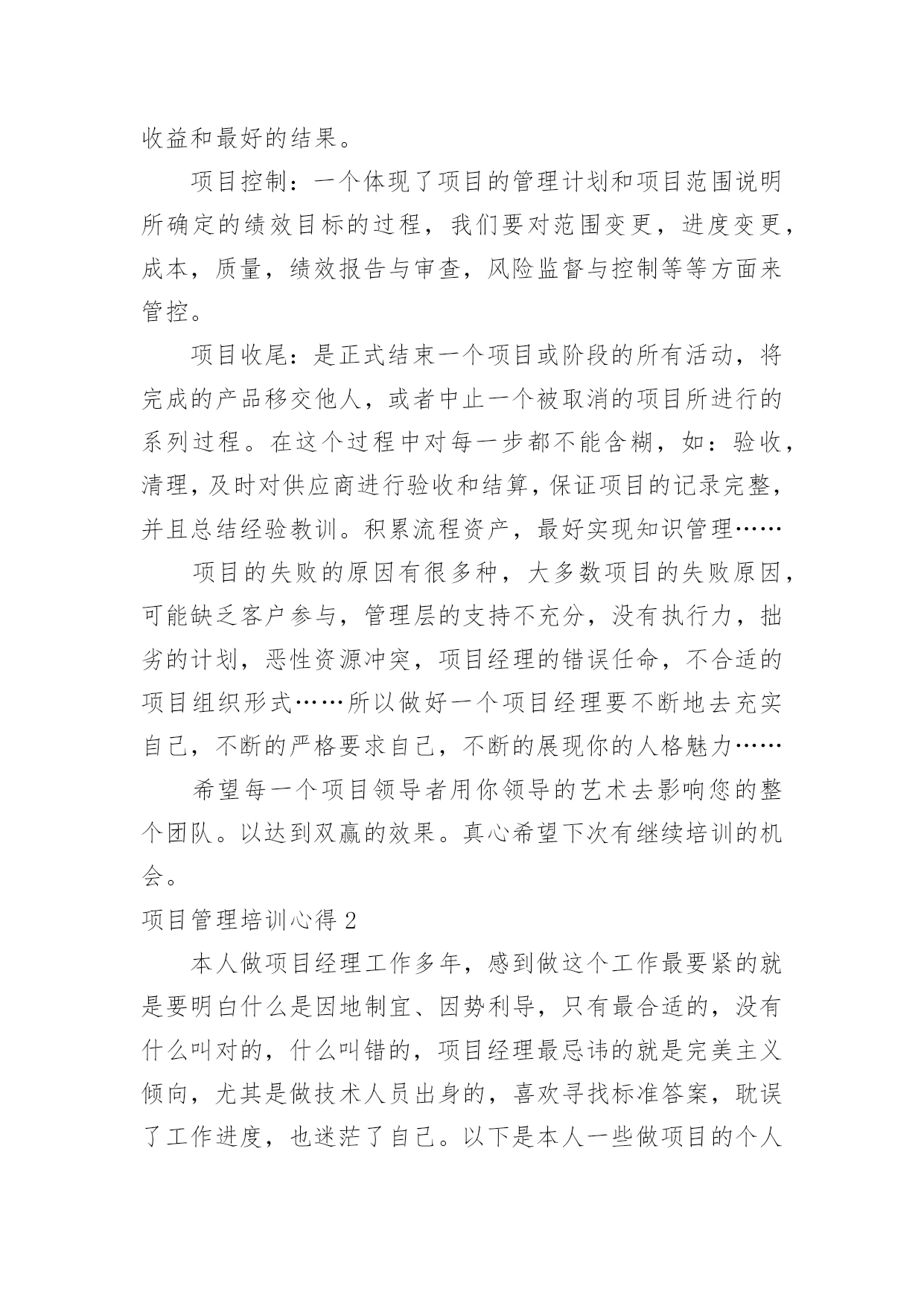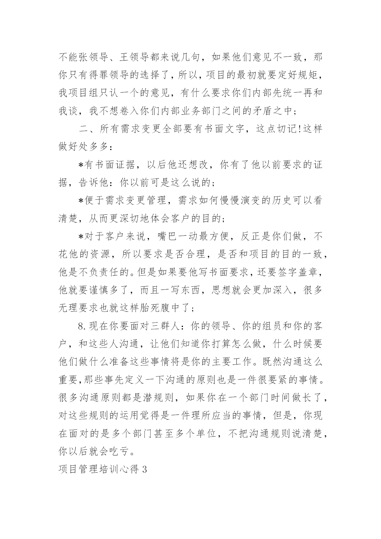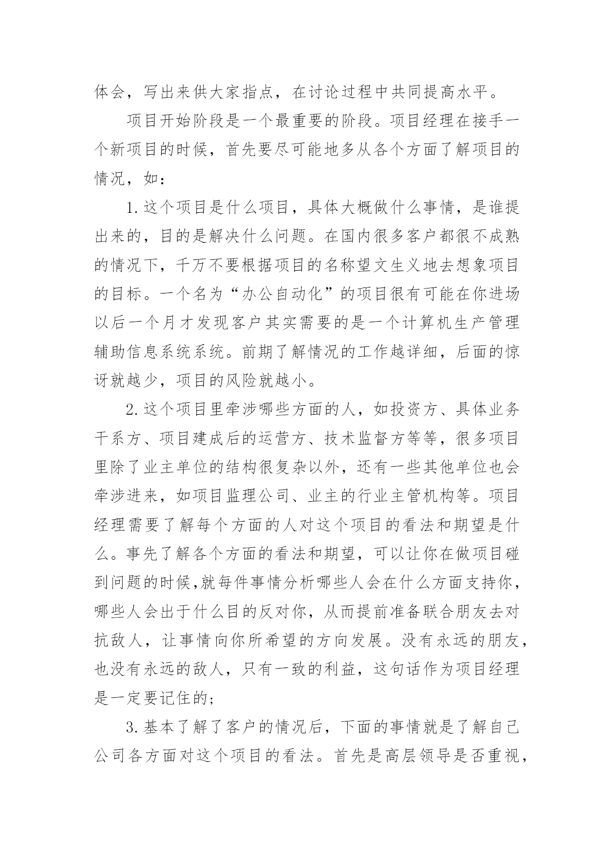 项目管理培训心得项目管理培训心得当我们心中积累了不少感想和见解时,有这样的时机,要好好记录下来,这样我们可以养成良好的总结方法。怎样写好心得体会呢?以下是小编为大家收集的项目管理培训心得,供大家参考借鉴,希望可以帮助到有需要的朋友。项目管理培训心得1非常感谢公司给我这次项目管理的培训、提升自我的机会。这次培训使我增加了许多知识的同时,更及时发现了自已的不足。深刻体会到项目管理的重要性。更对咱们维拉通信的企业文化有了更深层次的认识。这次培训让我深刻检查和审视自己知识经验,也培养了我在学习创新,应变,沟通,团队的建设;在每个项目中的计划和预算、实施+控制、协调+整合、以及如何能让客户满意等等方面得到充足的外界空气吸入,充实了自己。提升阿拉的思维能力,帮助我培育机遇,加强辩识能力,提高判断能力,掌握管理能力和组织战略推进能力等等。不会选择项目不是一个好的项目经理,以前在工作中只是因为SALES取得了项目不易就一定要完成,出无法判别项目的优劣,抱着上面都同意了,我们执行人还能有什么意见的心理,正因为这种心理却遗留了很多历史问题:导致了较多失败的项目,如失败项目中产生的成本,模具开了一套一套未量产。有些虽已量产但量太少,有些项目根本就没有盈利。作为一个好的项目经理,在面对客户、面对项目、面对公司的同时,他一定会做一些取舍。一定会将对公司的损失降到最低。项目计划,记得我们公司的每一个项目计划,计划远远赶不上变化。较多是人为的失误,或许问题在客户,或许问题在我们自己。但作为一个项目经理,一定要站在这样的高度来决定这件事情,最好能把业务的决策、假设和方案全部文档化及透明化,对于每个项目的都去定义它的质量、风险方面的工作过程及内容,一定要确定各干系人之间的沟通顺畅,还要建立变更处理流程。上完了这堂课我学会了用WBS来分解工作范围。它可以让我们防止遗漏项目的可交付成果,可以帮助项目经理关注项目目标和澄清职责,可以改善时间,可以精确成本和资源的估计。。。。。。一个工作分解结构(WBS)若制定出来,即使一个外行人都能看出这个项目的整个工作范围,包括工作进度,项目成本,以及可能会出现的假设问题等等。项目执行:一个体现着人与人之间的沟通与责任。项目执行所需要的技能,他要求我们有至少有一般的管理技术(领导,沟通,影响,谈判、解决问题的艺术等),要求每一位干系人尊重项目的严肃性。还需要有产品和专业所需的技能和知识。整个团队需要在项目经理的'带领下,发挥团队精神,将项目计划执行下去,这个就这样就能达到最大的收益和最好的结果。项目控制:一个体现了项目的管理计划和项目范围说明所确定的绩效目标的过程,我们要对范围变更,进度变更,成本,质量,绩效报告与审查,风险监督与控制等等方面来管控。项目收尾:是正式结束一个项目或阶段的所有活动,将完成的产品移交他人,或者中止一个被取消的项目所进行的系列过程。在这个过程中对每一步都不能含糊,如:验收,清理,及时对供应商进行验收和结算,保证项目的记录完整,并且总结经验教训。积累流程资产,最好实现知识管理……项目的失败的原因有很多种,大多数项目的失败原因,可能缺乏客户参与,管理层的支持不充分,没有执行力,拙劣的计划,恶性资源冲突,项目经理的错误任命,不合适的项目组织形式……所以做好一个项目经理要不断地去充实自己,不断的严格要求自己,不断的展现你的人格魅力……希望每一个项目领导者用你领导的艺术去影响您的整个团队。以达到双赢的效果。真心希望下次有继续培训的机会。项目管理培训心得2本人做项目经理工作多年,感到做这个工作最要紧的就是要明白什么是因地制宜、因势利导,只有最合适的,没有什么叫对的,什么叫错的,项目经理最忌讳的就是完美主义倾向,尤其是做技术人员出身的,喜欢寻找标准答案,耽误了工作进度,也迷茫了自己。以下是本人一些做项目的个人体会,写出来供大家指点,在讨论过程中共同提高水平。项目开始阶段是一个最重要的阶段。项目经理在接手一个新项目的时候,首先要尽可能地多从各个方面了解项目的情况,如:1.这个项目是什么项目,具体大概做什么事情,是谁提出来的,目的是解决什么问题。在国内很多客户都很不成熟的情况下,千万不要根据项目的名称望文生义地去想象项目的目标。一个名为“办公自动化”的项目很有可能在你进场以后一个月才发现客户其实需要的是一个计算机生产管理辅助信息系统系统。前期了解情况的工作越详细,后面的惊讶就越少,项目的风险就越小。2.这个项目里牵涉哪些方面的人,如投资方、具体业务干系方、项目建成后的运营方、技术监督方等等,很多项目里除了业主单位的结构很复杂以外,还有一些其他单位也会牵涉进来,如项目监理公司、业主的行业主管机构等。项目经理需要了解每个方面的人对这个项目的看法和期望是什么。事先了解各个方面的看法和期望,可以让你在做项目碰到问题的时候,就每