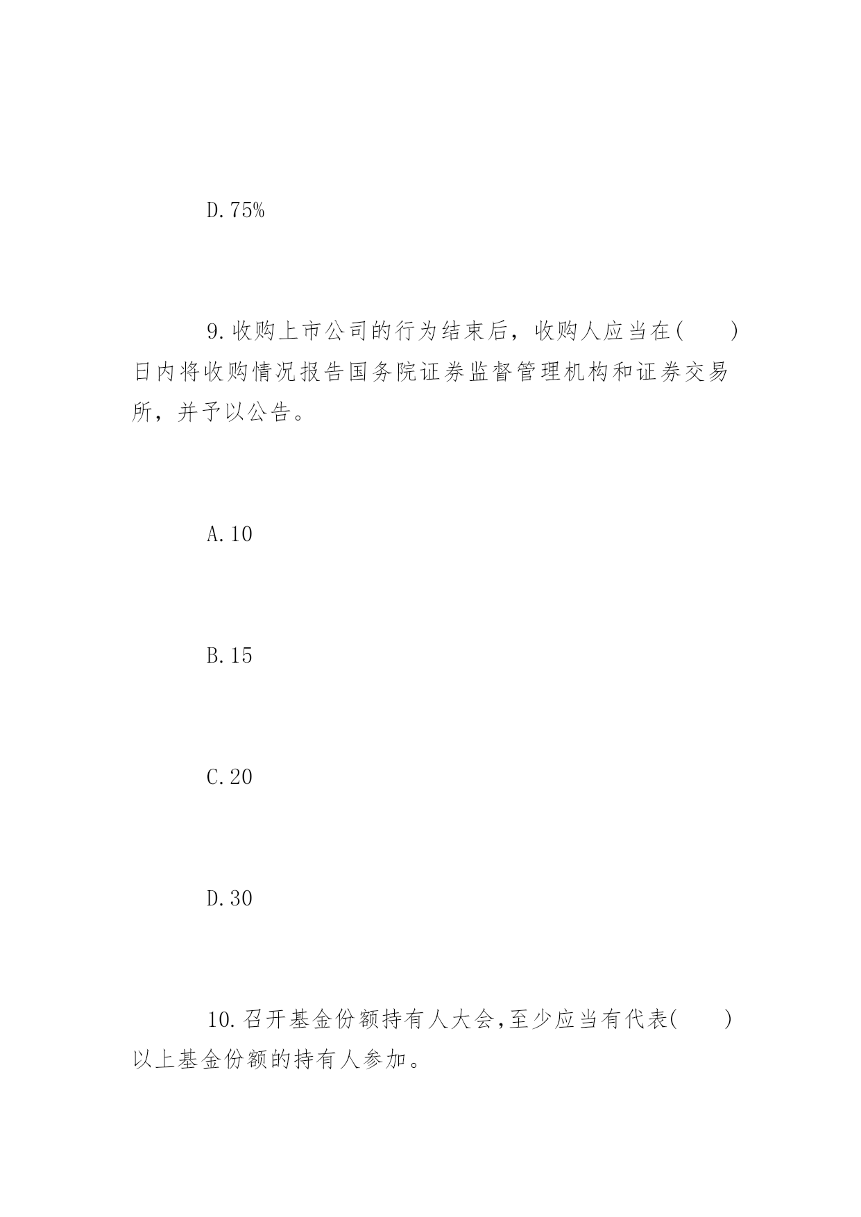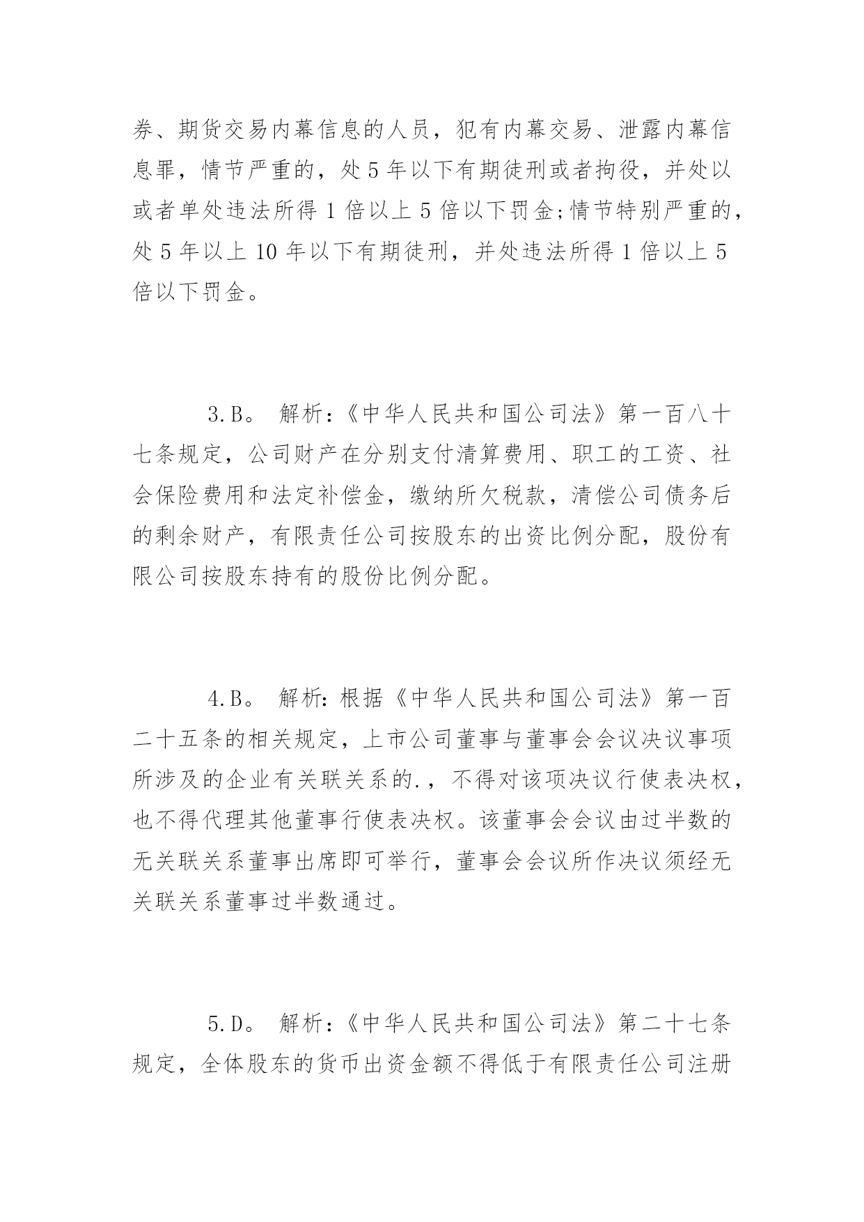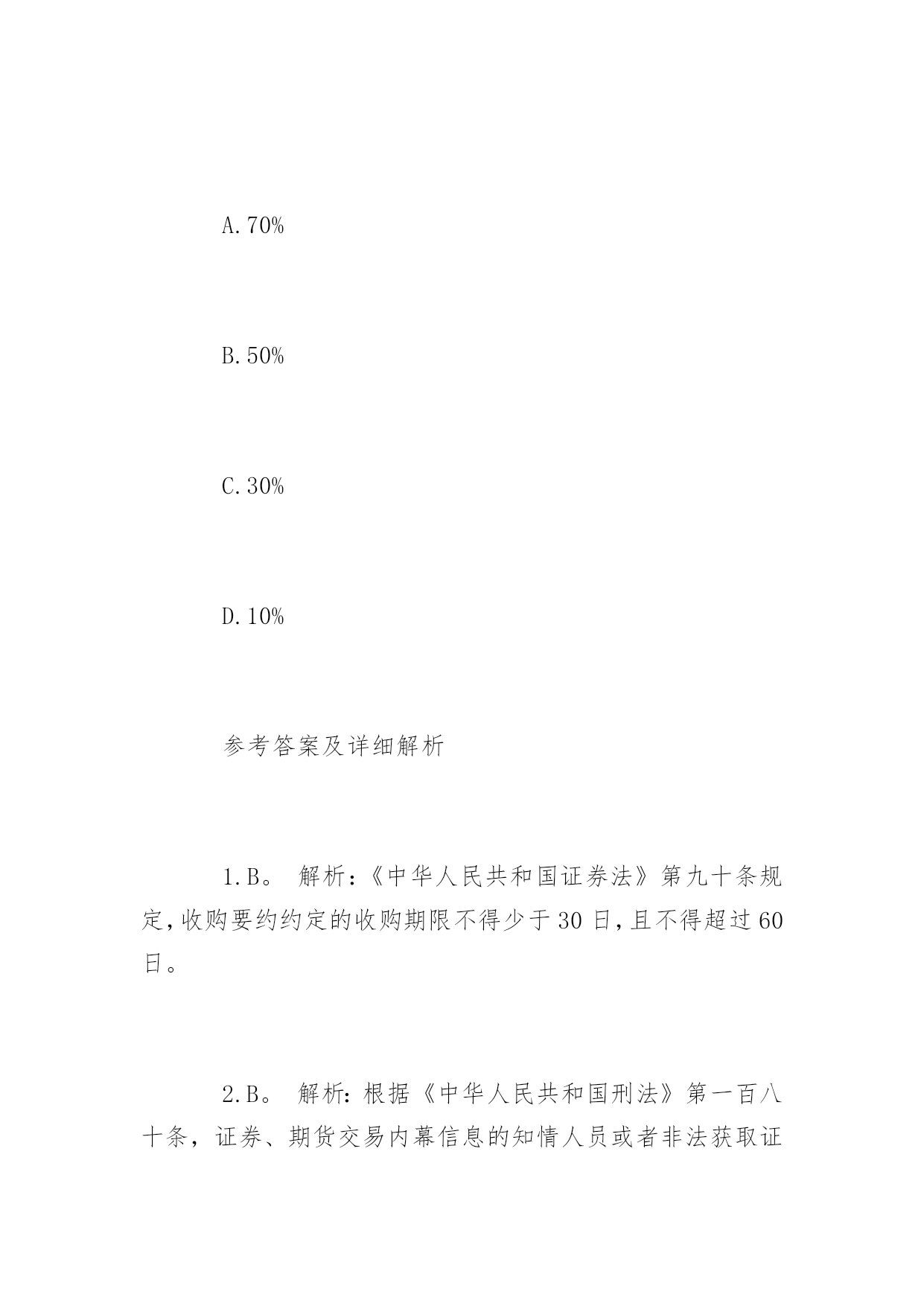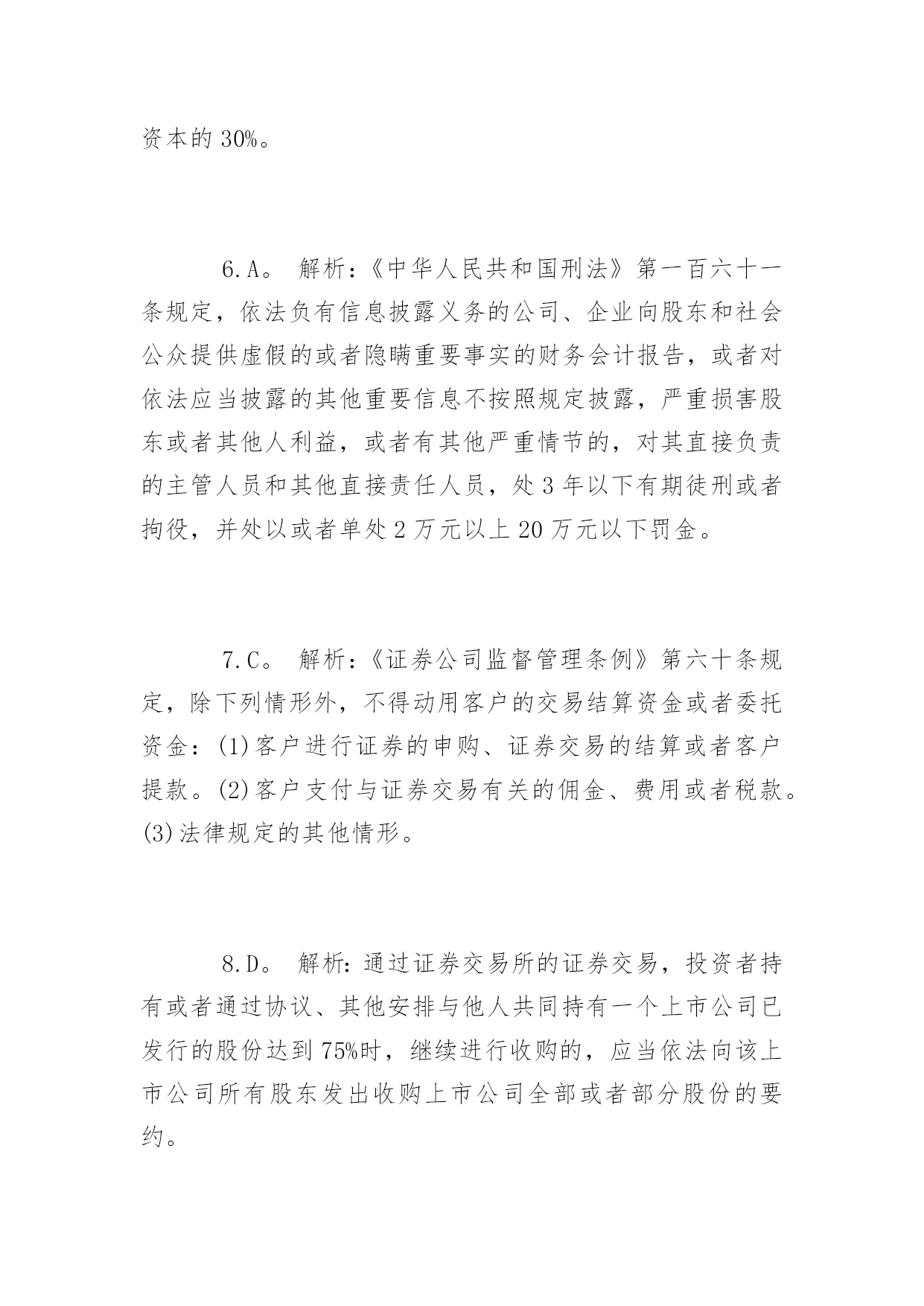 证券从业《投资分析》提分模拟试题附答案2017证券从业《投资分析》提分模拟试题(附答案)一、单项选择题1.收购要约的期限为()。A.30~45日B.30~60日C.30~75日D.60~90日2.犯有内幕交易、泄露内幕信息罪,情节严重的,处5年以下有期徒刑或者拘役,并处以或者单处违法所得()罚金。A.1倍以上3倍以下B.1倍以上5倍以下C.2倍以上4倍以下D.3倍以上10倍以下3.股份公司在清算过程中,若公司财产能够清偿公司债券,则按下列()顺序进行分配。①支付职工工资和劳动保险费用;②支付清算费用;③缴纳所欠税款;④清偿公司债务;⑤按股东持股比例分配剩余资产。A.①②③④⑤B.②①③④⑤C.③②①④⑤D.③①②④⑤4.上市公司董事与董事会会议决议事项所涉及的企业有关联关系的,不得对该项决议行使表决权,也不得代理其他董事行使表决权。该董事会会议由()的无关联关系董事出席即可举行。A.1/3B.过半数C.2/3D.全体5.《中华人民共和国公司法》规定,有限责任公司全体股东的货币出资金额不得低于公司注册资本的()。A.60%B.50%C.40%D.30%6.公司犯提供虚假财务会计报告罪,对公司直接负责的主管人员和其他直接责任人员,处()有期徒刑或者拘役。A.3年以下B.3年以上C.5年以下D.5年以上7.在下列()情形下,证券公司不得动用客户的交易结算资金或者委托资金。A.客户进行证券的申购、证券交易的结算或者客户提款B.客户支付与证券交易有关的佣金、费用或者税款C.证券公司借用客户资金30日内还清D.法律规定的其他情形8.通过证券交易所的证券交易,投资者持有或者通过协议、其他安排与他人共同持有一个上市公司已发行的股份达到()时,继续进行收购的,应当依法向该上市公司所有股东发出收购上市公司全部或者部分股份的要约。A.25%B.30%C.35%D.75%9.收购上市公司的行为结束后,收购人应当在()日内将收购情况报告国务院证券监督管理机构和证券交易所,并予以公告。A.10B.15C.20D.3010.召开基金份额持有人大会,至少应当有代表()以上基金份额的持有人参加。A.70%B.50%C.30%D.10%参考答案及详细解析1.B。解析:《中华人民共和国证券法》第九十条规定,收购要约约定的收购期限不得少于30日,且不得超过60日。2.B。解析:根据《中华人民共和国刑法》第一百八十条,证券、期货交易内幕信息的知情人员或者非法获取证券、期货交易内幕信息的人员,犯有内幕交易、泄露内幕信息罪,情节严重的,处5年以下有期徒刑或者拘役,并处以或者单处违法所得1倍以上5倍以下罚金;情节特别严重的,处5年以上10年以下有期徒刑,并处违法所得1倍以上5倍以下罚金。3.B。解析:《中华人民共和国公司法》第一百八十七条规定,公司财产在分别支付清算费用、职工的工资、社会保险费用和法定补偿金,缴纳所欠税款,清偿公司债务后的剩余财产,有限责任公司按股东的出资比例分配,股份有限公司按股东持有的股份比例分配。4.B。解析:根据《中华人民共和国公司法》第一百二十五条的相关规定,上市公司董事与董事会会议决议事项所涉及的企业有关联关系的.,不得对该项决议行使表决权,也不得代理其他董事行使表决权。该董事会会议由过半数的无关联关系董事出席即可举行,董事会会议所作决议须经无关联关系董事过半数通过。5.D。解析:《中华人民共和国公司法》第二十七条规定,全体股东的货币出资金额不得低于有限责任公司注册资本的30%。6.A。解析:《中华人民共和国刑法》第一百六十一条规定,依法负有信息披露义务的公司、企业向股东和社会公众提供虚假的或者隐瞒重要事实的财务会计报告,或者对依法应当披露的其他重要信息不按照规定披露,严重损害股东或者其他人利益,或者有其他严重情节的,对其直接负责的主管人员和其他直接责任人员,处3年以下有期徒刑或者拘役,并处以或者单处2万元以上20万元以下罚金。7.C。解析:《证券公司监督管理条例》第六十条规定,除下列情形外,不得动用客户的交易结算资金或者委托资金:(1)客户进行证券的申购、证券交易的结算或者客户提款。(2)客户支付与证券交易有关的佣金、费用或者税款。(3)法律规定的其他情形。8.D。解析:通过证券交易所的证券交易,投资者持有或者通过协议、其他安排与他人共同持有一个上市公司已发行的股份达到75%时,继续进行收购的,应当依法向该上市公司所有股东发出收购上市公司全部或者部分股份的要约。9.B。解析:《中华人民共和国证券法》第一百条规定,收购上市公司的行为完成后,收购人应当在15日内将收购情况报告国务院证券监督管理机构和证券交易所,并予公告。