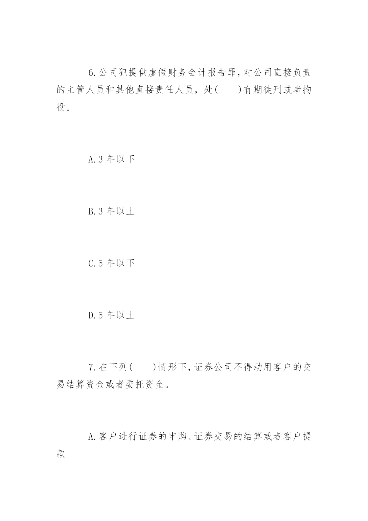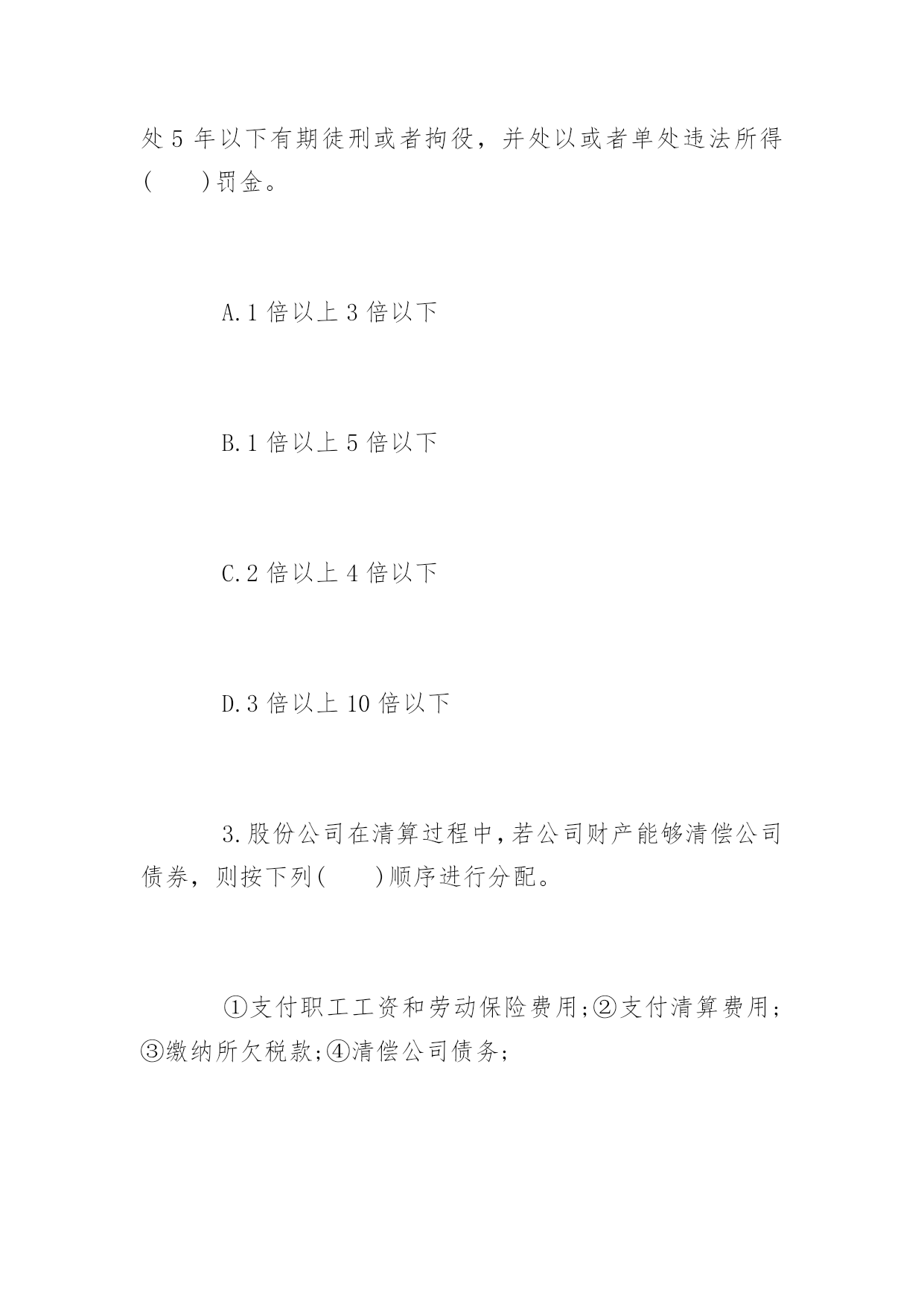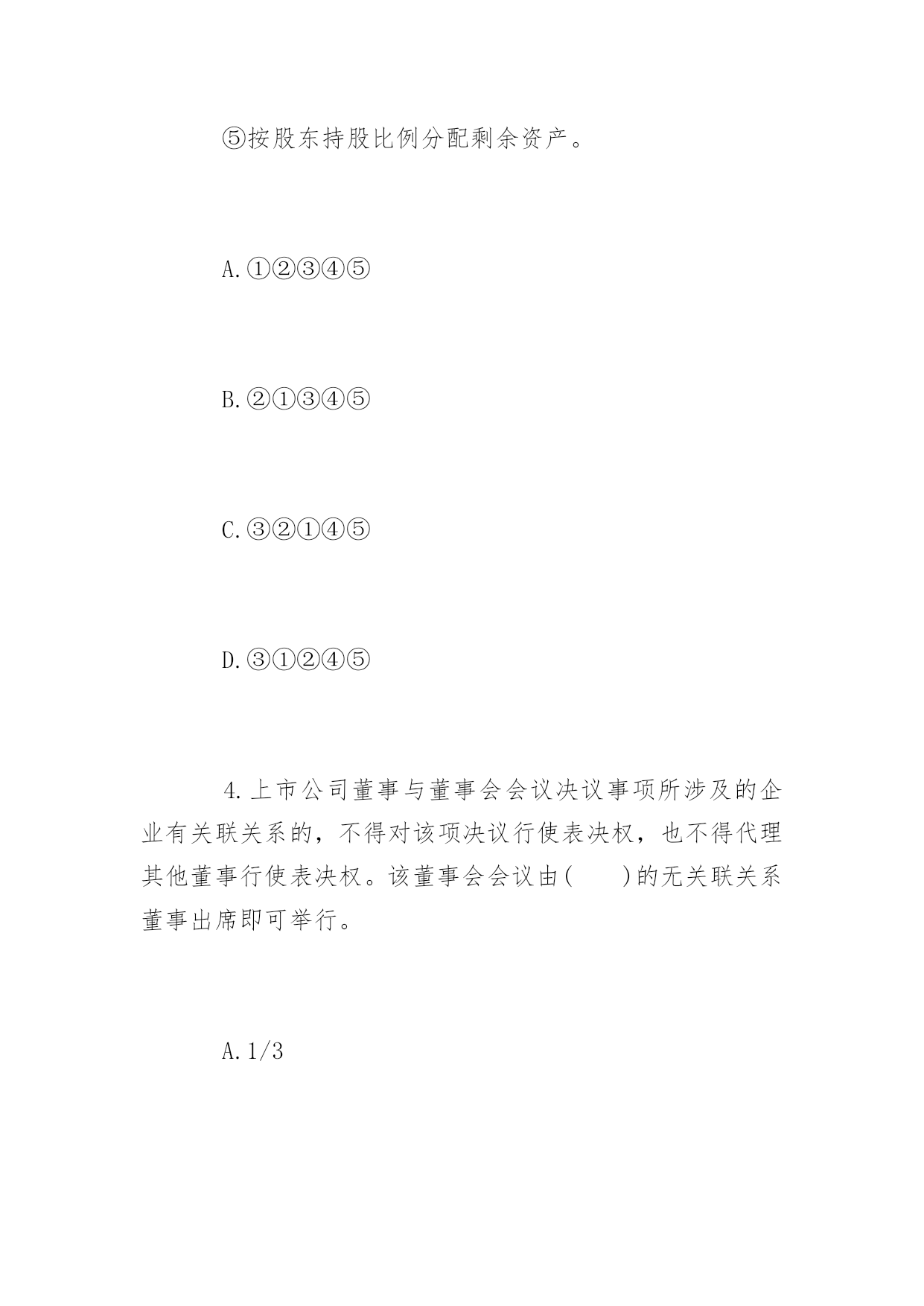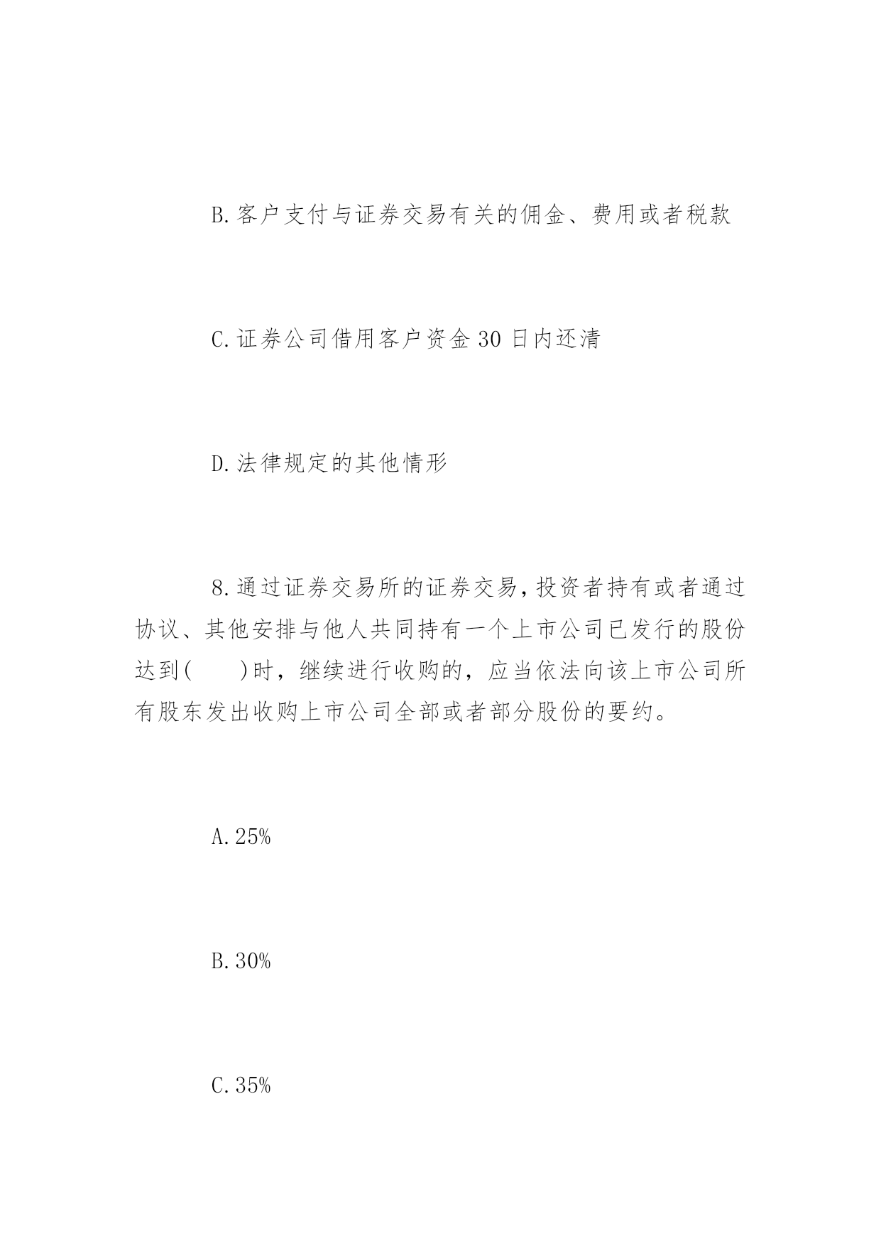 证券从业《投资分析》提分模拟试题附答案2017证券从业《投资分析》提分模拟试题(附答案)一、单项选择题1.收购要约的期限为()。A.30~45日B.30~60日C.30~75日D.60~90日2.犯有内幕交易、泄露内幕信息罪,情节严重的,处5年以下有期徒刑或者拘役,并处以或者单处违法所得()罚金。A.1倍以上3倍以下B.1倍以上5倍以下C.2倍以上4倍以下D.3倍以上10倍以下3.股份公司在清算过程中,若公司财产能够清偿公司债券,则按下列()顺序进行分配。①支付职工工资和劳动保险费用;②支付清算费用;③缴纳所欠税款;④清偿公司债务;⑤按股东持股比例分配剩余资产。A.①②③④⑤B.②①③④⑤C.③②①④⑤D.③①②④⑤4.上市公司董事与董事会会议决议事项所涉及的企业有关联关系的,不得对该项决议行使表决权,也不得代理其他董事行使表决权。该董事会会议由()的无关联关系董事出席即可举行。A.1/3B.过半数C.2/3D.全体5.《中华人民共和国公司法》规定,有限责任公司全体股东的货币出资金额不得低于公司注册资本的()。A.60%B.50%C.40%D.30%6.公司犯提供虚假财务会计报告罪,对公司直接负责的主管人员和其他直接责任人员,处()有期徒刑或者拘役。A.3年以下B.3年以上C.5年以下D.5年以上7.在下列()情形下,证券公司不得动用客户的交易结算资金或者委托资金。A.客户进行证券的申购、证券交易的结算或者客户提款B.客户支付与证券交易有关的佣金、费用或者税款C.证券公司借用客户资金30日内还清D.法律规定的其他情形8.通过证券交易所的证券交易,投资者持有或者通过协议、其他安排与他人共同持有一个上市公司已发行的股份达到()时,继续进行收购的,应当依法向该上市公司所有股东发出收购上市公司全部或者部分股份的要约。A.25%B.30%C.35%D.75%9.收购上市公司的行为结束后,收购人应当在()日内将收购情况报告国务院证券监督管理机构和证券交易所,并予以公告。A.10B.15C.20D.3010.召开基金份额持有人大会,至少应当有代表()以上基金份额的持有人参加。A.70%B.50%C.30%D.10%参考答案及详细解析1.B。解析:《中华人民共和国证券法》第九十条规定,收购要约约定的收购期限不得少于30日,且不得超过60日。2.B。解析:根据《中华人民共和国刑法》第一百八十条,证券、期货交易内幕信息的知情人员或者非法获取证券、期货交易内幕信息的人员,犯有内幕交易、泄露内幕信息罪,情节严重的,处5年以下有期徒刑或者拘役,并处以或者单处违法所得1倍以上5倍以下罚金;情节特别严重的,处5年以上10年以下有期徒刑,并处违法所得1倍以上5倍以下罚金。3.B。解析:《中华人民共和国公司法》第一百八十七条规定,公司财产在分别支付清算费用、职工的工资、社会保险费用和法定补偿金,缴纳所欠税款,清偿公司债务后的剩余财产,有限责任公司按股东的出资比例分配,股份有限公司按股东持有的股份比例分配。4.B。解析:根据《中华人民共和国公司法》第一百二十五条的相关规定,上市公司董事与董事会会议决议事项所涉及的企业有关联关系的.,不得对该项决议行使表决权,也不得代理其他董事行使表决权。该董事会会议由过半数的无关联关系董事出席即可举行,董事会会议所作决议须经无关联关系董事过半数通过。5.D。解析:《中华人民共和国公司法》第二十七条规定,全体股东的货币出资金额不得低于有限责任公司注册资本的30%。6.A。解析:《中华人民共和国刑法》第一百六十一条规定,依法负有信息披露义务的公司、企业向股东和社会公众提供虚假的或者隐瞒重要事实的财务会计报告,或者对依法应当披露的其他重要信息不按照规定披露,严重损害股东或者其他人利益,或者有其他严重情节的,对其直接负责的主管人员和其他直接责任人员,处3年以下有期徒刑或者拘役,并处以或者单处2万元以上20万元以下罚金。7.C。解析:《证券公司监督管理条例》第六十条规定,除下列情形外,不得动用客户的交易结算资金或者委托资金:(1)客户进行证券的申购、证券交易的结算或者客户提款。(2)客户支付与证券交易有关的佣金、费用或者税款。(3)法律规定的其他情形。8.D。解析:通过证券交易所的证券交易,投资者持有或者通过协议、其他安排与他人共同持有一个上市公司已发行的股份达到75%时,继续进行收购的,应当依法向该上市公司所有股东发出收购上市公司全部或者部分股份的要约。9.B。解析:《中华人民共和国证券法》第一百条规定,收购上市公司的行为完成后,收购人应当在15日内将收购情况报告国务院证券监督管理机构和证券交易所,并予公告。