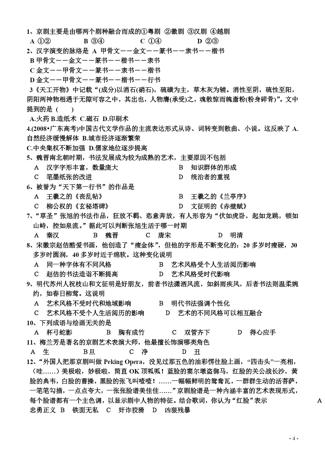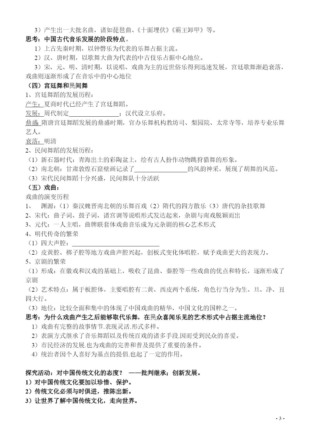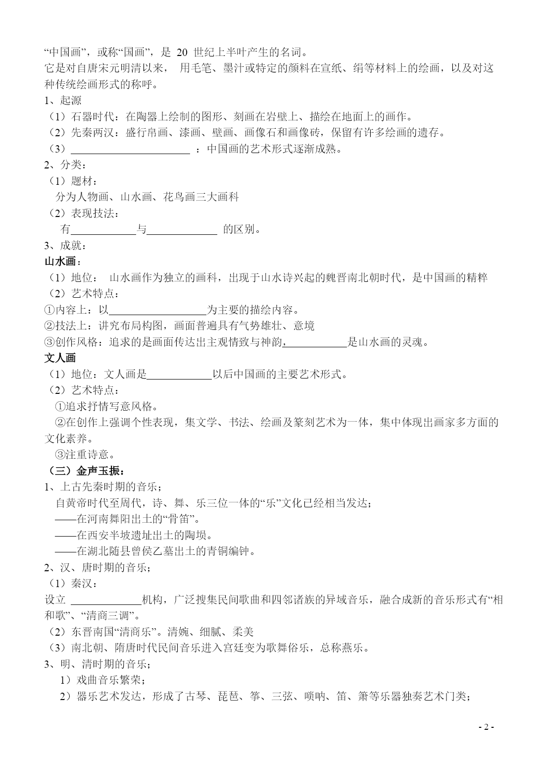 PAGEPAGE-4-专题二第二节中国古代的艺术课标内容1、概述汉字、绘画起源、演变的过程,了解中国书画的基本特征和发展脉络。2、了解京剧等剧种产生和发展的历程,说明其艺术成就古代艺术发展的原因1)政治:国家的长期统一、政策的宽松、统治者享受生活的追求。2)经济:封建经济的发展,尤其是的发展。3)教育:教育的发展,人才的培养。4)民族关系:民族融合,彼此之间的文化交流。5)对外关系:中外之间的文化交流。(一)、“出鬼入神”的书法艺术;中国汉字是怎样起源的?(了解一下)起源于绘画,早在六千多年前,原始社会晚期,汉民族先民在各种器物上刻画的符号,渐渐演变成为汉字,称为“文字图画”。1、含义与特点;(1)含义:中国的书法艺术是以中国汉字的文义为内容,以某种字体的书写为形式的独特艺术。(2)特点:汉字书法是线的艺术,它以自由多样的线的曲直运动和空间构造,表现感情、气势和意境,具有特殊的审美价值。2、汉字形体的演变及五种主要书法字体;(1)甲骨文一一篆书一一草书—楷书—。(2)篆书、隶书、楷书、行书、草书拓展:其演变规律?——3、书法的主要字体及特点;篆书——创始于秦代。隶书——始于秦朝,成熟并通行于时。楷书——形成于汉末。行书——开始盛行于晋代。草书——起源于,成熟于东晋。4、中国古代著名的书法家;秦代——李斯;东晋——王羲之;唐代——欧阳询、、、怀素、张旭;北宋——苏轼、黄庭坚、米芾、蔡襄;元代——赵孟頫;明代——文征明、董其昌;思考:中国书法艺术发展的两个阶段1)自发阶段:(魏晋以前)人们注重书法的实用功能,很少追求书法的审美功能。2)自觉阶段:(魏晋以后)书法的审美功能超过实用功能。(二)画中有诗;“中国画”,或称“国画”,是20世纪上半叶产生的名词。它是对自唐宋元明清以来,用毛笔、墨汁或特定的颜料在宣纸、绢等材料上的绘画,以及对这种传统绘画形式的称呼。1、起源(1)石器时代:在陶器上绘制的图形、刻画在岩壁上、描绘在地面上的画作。(2)先秦两汉:盛行帛画、漆画、壁画、画像石和画像砖,保留有许多绘画的遗存。(3):中国画的艺术形式逐渐成熟。2、分类:(1)题材:分为人物画、山水画、花鸟画三大画科(2)表现技法:有与的区别。3、成就:山水画:(1)地位:山水画作为独立的画科,出现于山水诗兴起的魏晋南北朝时代,是中国画的精粹(2)艺术特点:①内容上:以为主要的描绘内容。②技法上:讲究布局构图,画面普遍具有气势雄壮、意境③创作风格:追求的是画面传达出主观情致与神韵,是山水画的灵魂。文人画(1)地位:文人画是以后中国画的主要艺术形式。(2)艺术特点:①追求抒情写意风格。②在创作上强调个性表现,集文学、书法、绘画及篆刻艺术为一体,集中体现出画家多方面的文化素养。③注重诗意。(三)金声玉振:1、上古先秦时期的音乐;自黄帝时代至周代,诗、舞、乐三位一体的“乐”文化已经相当发达;——在河南舞阳出土的“骨笛”。——在西安半坡遗址出土的陶埙。——在湖北随县曾侯乙墓出土的青铜编钟。2、汉、唐时期的音乐;(1)秦汉:设立机构,广泛搜集民间歌曲和四邻诸族的异域音乐,融合成新的音乐形式有“相和歌”、“清商三调”。(2)东晋南国“清商乐”。清婉、细腻、柔美(3)南北朝、隋唐时代民间音乐进入宫廷变为歌舞俗乐,总称燕乐。3、明、清时期的音乐;1)戏曲音乐繁荣;2)器乐艺术发达,形成了古琴、琵琶、筝、三弦、唢呐、笛、箫等乐器独奏艺术门类;3)产生出一大批名曲,诸如琵琶曲、《十面埋伏》《霸王卸甲》等。思考:中国古代音乐发展的阶段特点。1)上古先秦时期,以钟磬乐为代表的乐舞占据主流。2)汉、唐时期,以歌舞大曲为代表的中古伎乐占据中心地位。3)宋、元、明、清时期,以说唱、戏曲为主的近世俗乐得到迅速发展,宫廷歌舞渐趋衰落,戏曲则逐渐形成了在音乐中的中心地位(四)宫廷舞和民间舞1、宫廷舞蹈的发展历程:产生:夏商时代已经产生了宫廷舞蹈。发展:周代制定;汉代设立乐府。鼎盛:隋唐宫廷舞蹈发展的鼎盛时期,官办乐舞机构教坊司、梨园院、太常寺等,培养专业乐舞艺人。衰落:明清2、民间舞蹈的发展历程:(1)新石器时代:青海出土的彩陶盆上,绘有古人扮作动物跳狩猎舞的形象。(2)南北朝:甘肃敦煌石窟壁画记录了的风韵神采,展现了胡舞的风范。(3)宋代民间舞蹈十分兴盛,民间舞队十分活跃(五)戏曲:戏曲的演变历程1、渊源:(1)秦汉魏晋南北朝的乐舞百戏(2)隋代的四方散乐(3)唐代的杂技歌舞2、宋代:曲子词、鼓子词、诸宫调等说唱形式发达起来,杂剧与南戏脱颖而出3、元代:一人主唱,曲牌联套体戏曲