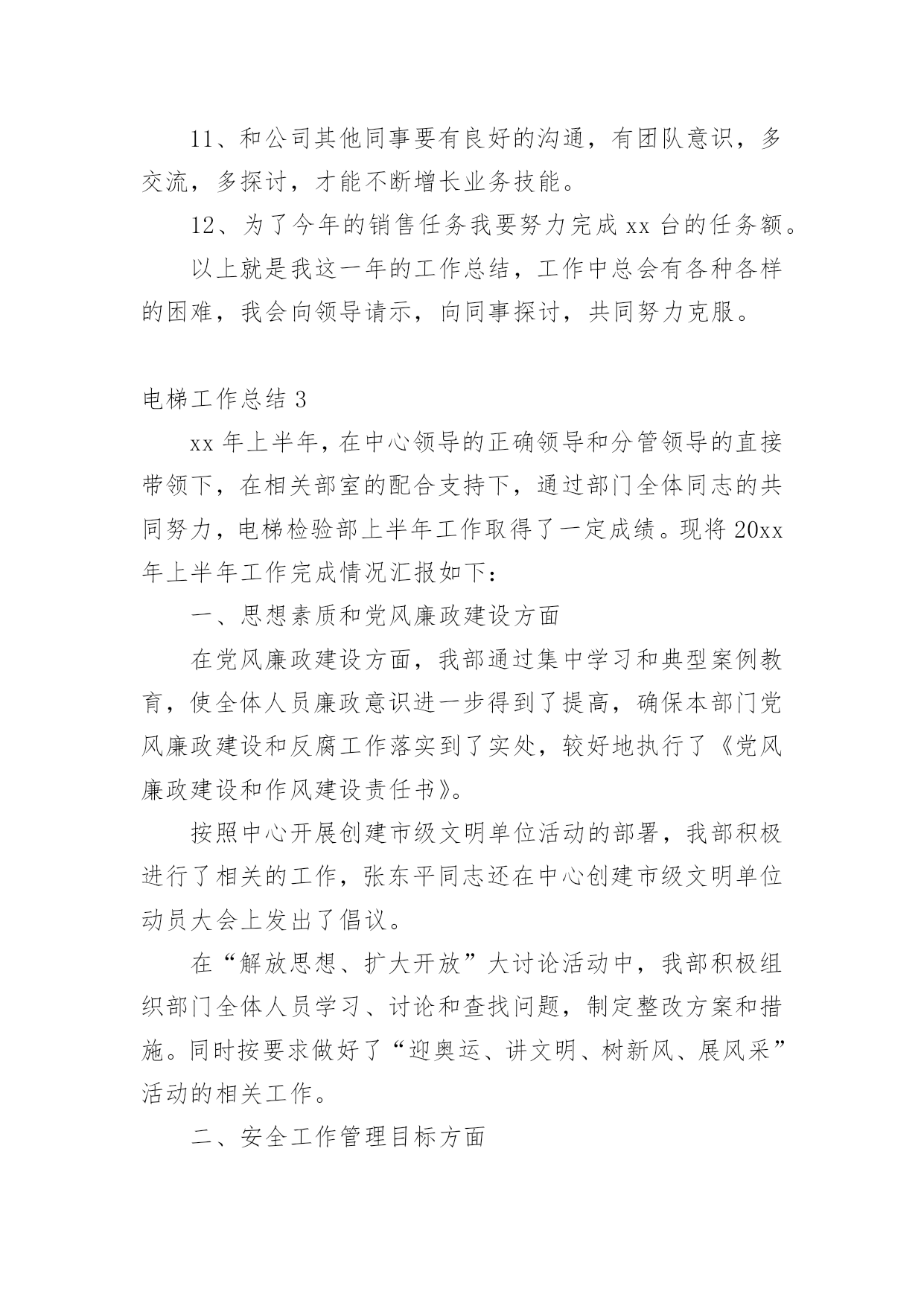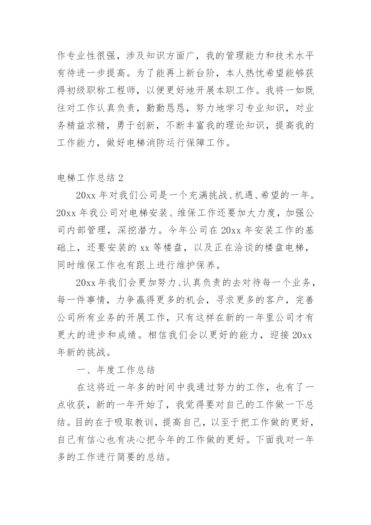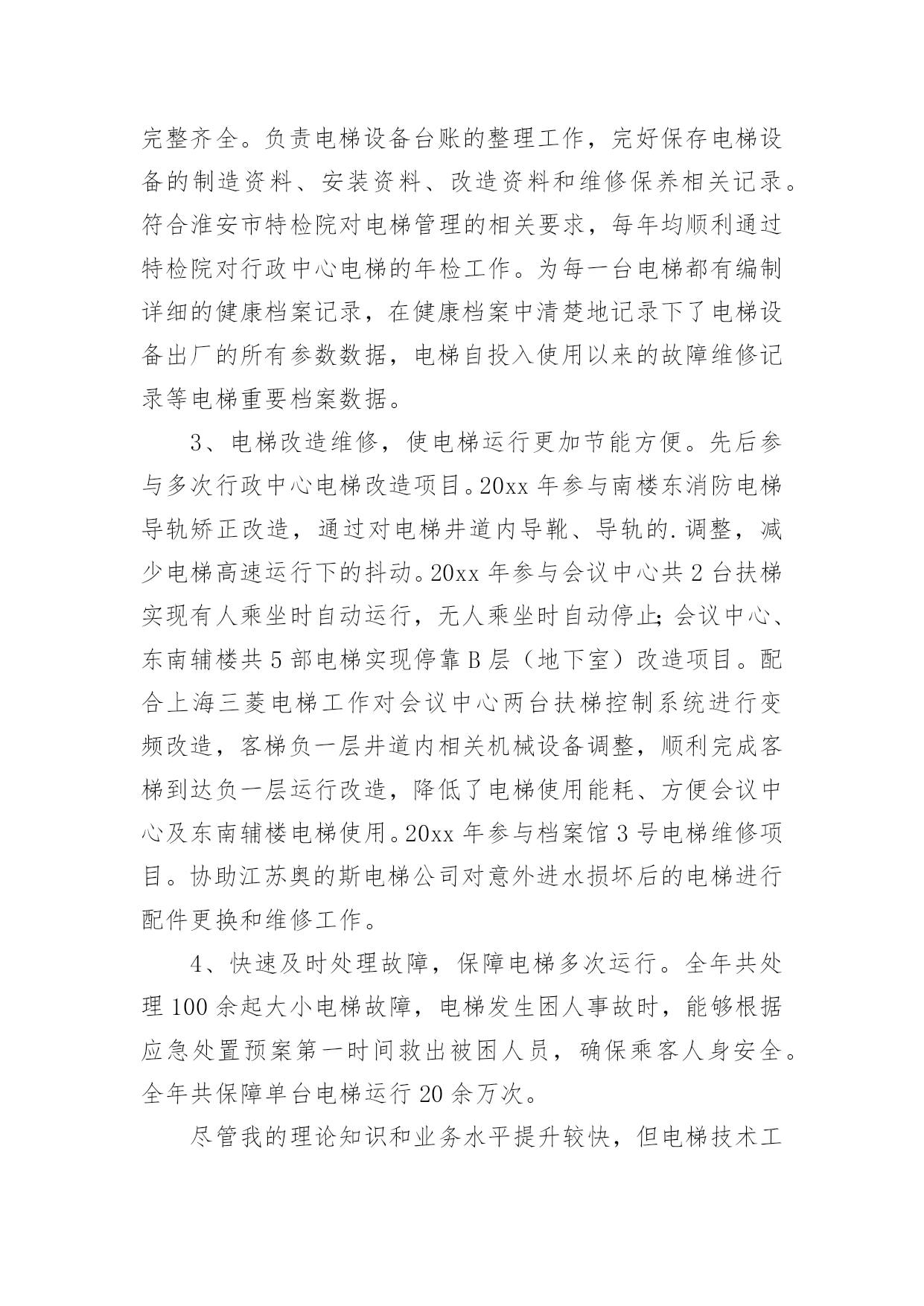 电梯工作总结电梯工作总结15篇总结是对某一特定时间段内的学习和工作生活等表现情况加以回顾和分析的一种书面材料,它能帮我们理顺知识结构,突出重点,突破难点,是时候写一份总结了。你所见过的总结应该是什么样的?下面是小编整理的电梯工作总结,欢迎大家借鉴与参考,希望对大家有所帮助。电梯工作总结1一、学习专业知识,提高岗位技能:本人于20xx年4月正式参加工作,工作伊始,我发现学校里学到的专业知识同实际工作有很大的不同和差距,为了尽快转变角色,适应工作的要求,我努力学习消防电梯方面的专业知识,努力提高自己的岗位技能。先后前往淮安市消防支队和淮安市特检院进行专业知识的学习,在短短的半年内,我通过自己的努力及同事的帮助,能比较熟练地进行设备管理的日常事务工作。清楚了解电梯安全管理人员理论知识,熟练掌握相关实际操作技能。取得了建构筑物初级消防员证和电梯安全管理员证。二、政治思想方面:在政治上,我对自己严格要求,积极参加各项政治活动,自觉学习政治理论,努力提高自己的政治理论修养,具有较强的大局意识和组织观念。工作上以事业为重,不计个人得失,在新的岗位上摆正位置,把保障消防电梯设备正常运行放在首位,努力实践全心全意为人民服务的根本宗旨。在工作中做到公平公正、公道正派,具有较强的敬业精神和奉献精神,工作中吃苦耐劳,积极主动,作风踏实,不推诿扯皮,讲求效率。工作中注意调查研究,勤于思考,工作思路清晰,能把理论同实际相结合。三、组织协调方面:在实际工作中,努力学会运用马克思主义的立场、观点和方法去分析、研究、解决问题,有一定的组织协调能力和科学决策水平。注意学习现代管理知识,较好地掌握了人文社科管理的一般规律。能协助部门负责人做好职工的思想政治工作,为部门工作的有效开展提供了保障。四、工作开展方面:1、做好电梯日常巡查维保工作,及时发现隐患。在日常工作中,负责保障淮安市行政中心内34台电梯的正常运行。日常巡查过程中对机房和井道的相关设备、轿厢与对重、轿门与层门及底坑等具体细节内容,进行逐一的测试和检验。根据国家特种设备安全法的要求,保证行政中心电梯至少每15天进行一次保养。参与制定行政中心消防、电梯设备应急处置预案、行政中心电梯维保人员岗位职责制和维保单位考评制度等相关管理保障制度。2、认真管理电梯档案资料,做到数据真实可靠,资料完整齐全。负责电梯设备台账的整理工作,完好保存电梯设备的制造资料、安装资料、改造资料和维修保养相关记录。符合淮安市特检院对电梯管理的相关要求,每年均顺利通过特检院对行政中心电梯的年检工作。为每一台电梯都有编制详细的健康档案记录,在健康档案中清楚地记录下了电梯设备出厂的所有参数数据,电梯自投入使用以来的故障维修记录等电梯重要档案数据。3、电梯改造维修,使电梯运行更加节能方便。先后参与多次行政中心电梯改造项目。20xx年参与南楼东消防电梯导轨矫正改造,通过对电梯井道内导靴、导轨的.调整,减少电梯高速运行下的抖动。20xx年参与会议中心共2台扶梯实现有人乘坐时自动运行,无人乘坐时自动停止;会议中心、东南辅楼共5部电梯实现停靠B层(地下室)改造项目。配合上海三菱电梯工作对会议中心两台扶梯控制系统进行变频改造,客梯负一层井道内相关机械设备调整,顺利完成客梯到达负一层运行改造,降低了电梯使用能耗、方便会议中心及东南辅楼电梯使用。20xx年参与档案馆3号电梯维修项目。协助江苏奥的斯电梯公司对意外进水损坏后的电梯进行配件更换和维修工作。4、快速及时处理故障,保障电梯多次运行。全年共处理100余起大小电梯故障,电梯发生困人事故时,能够根据应急处置预案第一时间救出被困人员,确保乘客人身安全。全年共保障单台电梯运行20余万次。尽管我的理论知识和业务水平提升较快,但电梯技术工作专业性很强,涉及知识方面广,我的管理能力和技术水平有待进一步提高。为了能再上新台阶,本人热忱希望能够获得初级职称工程师,以便更好地开展本职工作。我将一如既往对工作认真负责,勤勤恳恳,努力地学习专业知识,对业务精益求精,勇于创新,不断丰富我的理论知识,提高我的工作能力,做好电梯消防运行保障工作。电梯工作总结220xx年对我们公司是一个充满挑战、机遇、希望的一年。20xx年我公司对电梯安装、维保工作还要加大力度,加强公司内部管理,深挖潜力。今年公司在20xx年安装工作的基础上,还要安装的xx等楼盘,以及正在洽谈的楼盘电梯,同时维保工作也有跟上进行维护保养。20xx年我们会更加努力、认真负责的去对待每一个业务,每一件事情,力争赢得更多的机会,寻求更多的客户,完善公司所有业务的开展工作,只有这样在新的一年里公司才有更大的进步和成绩。相信我们会以更好的能力,迎接20xx年新的挑战。一、年度工作总结在这将近一年多的时间中我通过努力的工作,也有了一点收获,新的一年开始了,我觉得要对自己的