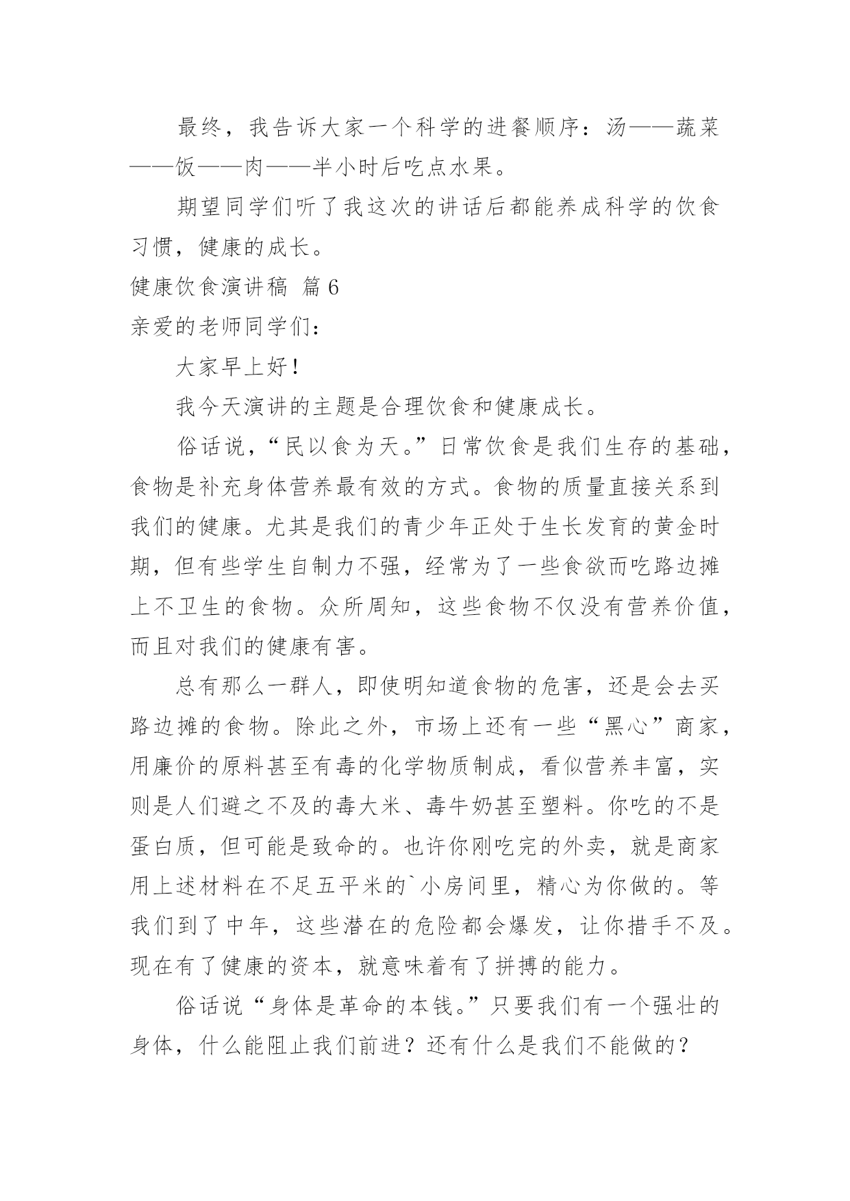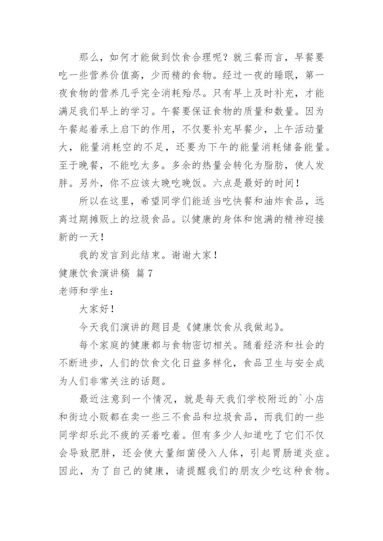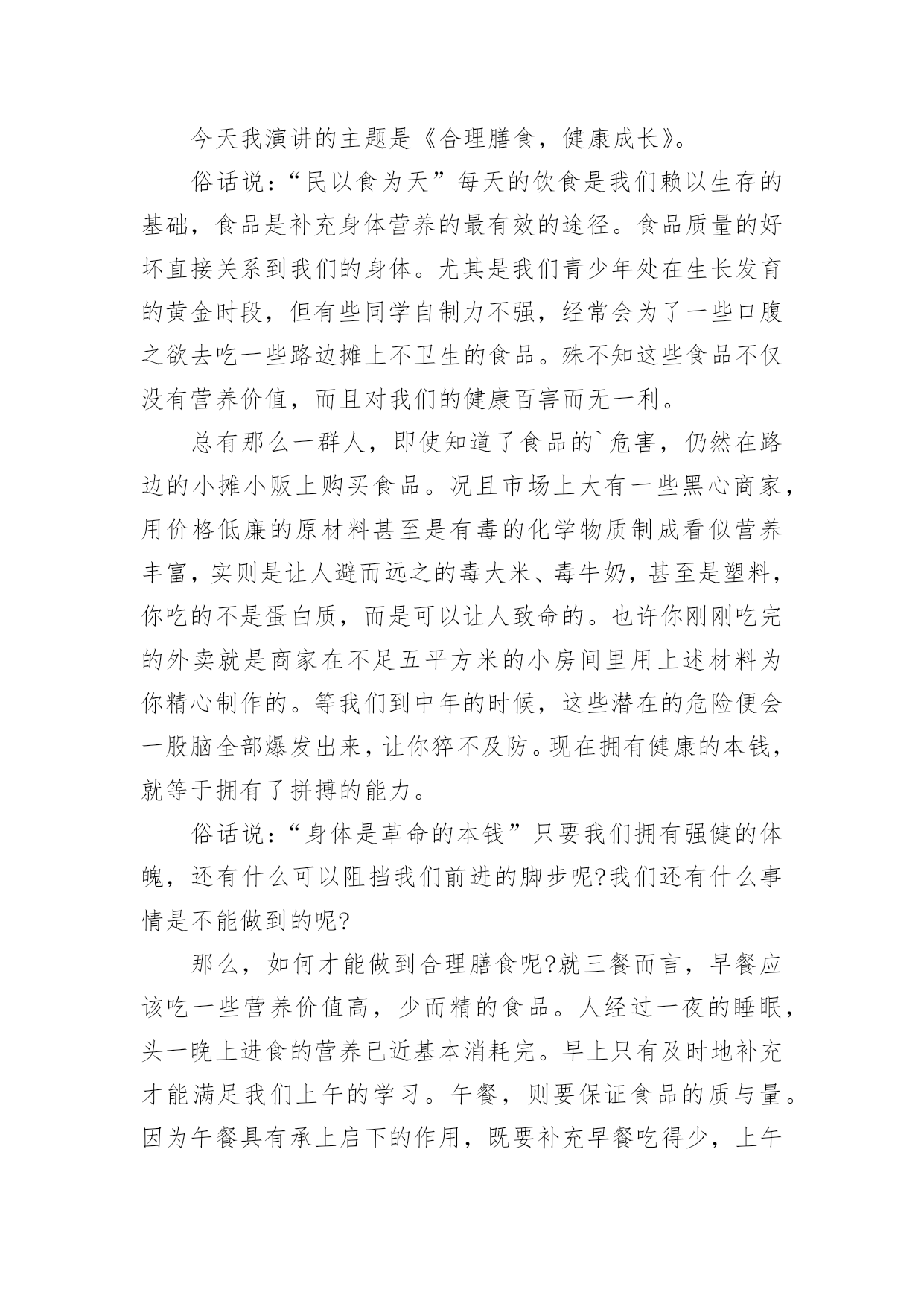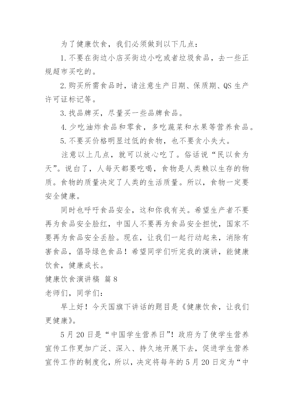健康饮食演讲稿健康饮食演讲稿常用(27篇)演讲稿要求内容充实,条理清楚,重点突出。在社会发展不断提速的今天,我们使用上演讲稿的情况与日俱增,你写演讲稿时总是没有新意?以下是小编为大家收集的健康饮食演讲稿,仅供参考,希望能够帮助到大家。健康饮食演讲稿篇1老师们,同学们:大家好!今天我国旗下演讲的题目是《健康饮食从我做起》。每一家的健康与食品息息相关,随着经济社会不断进步,人们饮食文化日益多样化,食品卫生与安全成为备受关注的话题。最近,我注意到一个情况,就是每天都能看到我们学校旁的小商店和地摊小贩在卖一些三无食品和垃圾食品,而我们的一些同学却买得乐此不彼,吃得津津有味。可又有多少人知道,吃了它们不仅会导致肥胖,更严重的会使大量细菌侵入人体,造成胃肠炎症。所以,请警告广大朋友为了自己的健康而少吃这类食品。要健康饮食,就要做到以下几点:1、不购买街边小吃或街边小店的'垃圾食品,去一些正规超市购买食物。2、买所需食品时,要注意生产日期、保质期、QS生产许可标志等等。3、认准品牌购买,尽量买一些有品牌的食品。4、少吃油炸食品及零食,多吃蔬菜水果等有营养的食品。5、不买价格明显过低的食品,不要贪小失大。注意以上几点,就大致能做到安全饮食了。俗话说:“民以食为天”。说得通俗一点就是人们每天要吃和喝,食物是人类赖以生存的物质。食品的质量决定了人类生命的质量。因此,食品必须是安全的并且有益健康的。同时,也呼吁食品安全,关系你我他,但愿生产者不再为食品安全脸红,国人不再为食品安全担心,国家不再为食品安全丢脸。现在,让我们一起行动起来,杜绝有害食品,倡导绿色食品!希望同学们听了我这次的讲话后都健康饮食,健康地成长。健康饮食演讲稿篇2尊敬的老师同学们:上午好!我是高二五的xx。今天我讲话的题目是《合理饮食,促进健康》。近代文学家梁启超先生曾说过:“少年进步则国进步,少年强则国强中华民族的腾飞正在吾辈。”同学们,我们肩负着中华崛起的重任,我们青少年素质的高低关系着祖国的未来,我们必须体魄健壮,意志坚强,品质高尚,志向远大!如今中我们的饮食健康情况非常令人担忧,有一些同学营养不均衡,有时还会不吃早饭、在进餐时,只挑选自己喜欢的吃,比如有的同学把肉吃完,就结束了用餐;有的同学只吃蔬菜。这些都是不正确的,是挑食偏食的不好的习惯,一旦有偏食,挑食的习惯了,很容易出现营养失调,抗病能力低下的问题,影响我们的健康。还有的同学吃饭没胃口,却非常爱吃路边摊的油炸小吃。然而这些街头的美味却隐藏着很大的健康威胁:油炸过很多次后会产生大量致癌物质,对我们的身体造成很坏的影响。在日常生活中要多吃水果蔬菜,养成不挑食,不偏食的习惯。从今天起,我希望同学们能够改正这样的习惯!饮食健康不只是注重饮食的卫生,还要注重食物的合理搭配,我们处在生长发育的飞跃期,是一生中长身体、长知识的重要时期,在此阶段的生长是速度最快的.,所以我们必须注重合理膳食。健康是人能享受到的最幸福的事情。只有拥有了健康,其他的一切追求才成为可能。健康不仅是生存的理由,更是生活的乐趣。缺少健康的人生黯淡无光,于人于己都是一种莫大的痛苦。健康让人生充满安宁与快乐,最简单、最平淡,但却最珍贵。同学们,有健康才有幸福的未来,我们胸怀壮志要大展鸿图,身体是我们宝贵的财富,希望大家热爱生命,拥抱健康,共同祝福明天,创造美好的人生!我的演讲完毕,谢谢大家!健康饮食演讲稿篇3尊敬的老师,亲爱的同学们:大家早上好!今天我演讲的主题是《合理膳食,健康成长》。俗话说:“民以食为天”每天的饮食是我们赖以生存的基础,食品是补充身体营养的最有效的途径。食品质量的好坏直接关系到我们的身体。尤其是我们青少年处在生长发育的黄金时段,但有些同学自制力不强,经常会为了一些口腹之欲去吃一些路边摊上不卫生的食品。殊不知这些食品不仅没有营养价值,而且对我们的健康百害而无一利。总有那么一群人,即使知道了食品的`危害,仍然在路边的小摊小贩上购买食品。况且市场上大有一些黑心商家,用价格低廉的原材料甚至是有毒的化学物质制成看似营养丰富,实则是让人避而远之的毒大米、毒牛奶,甚至是塑料,你吃的不是蛋白质,而是可以让人致命的。也许你刚刚吃完的外卖就是商家在不足五平方米的小房间里用上述材料为你精心制作的。等我们到中年的时候,这些潜在的危险便会一股脑全部爆发出来,让你猝不及防。现在拥有健康的本钱,就等于拥有了拼搏的能力。俗话说:“身体是革命的本钱”只要我们拥有强健的体魄,还有什么可以阻挡我们前进的脚步呢?我们还有什么事情是不能做到的呢?那么,如何才能做到合理膳食呢?就三餐而言,早餐应该吃一些营养价值高,少而精的食品。人经过一夜的睡眠,头一晚上进食的营养已近基本消耗完。早上只有及时地补充才能满足我们上午的学习。午餐,则要保证食品的质与量。因为午餐具有承上启下的作用,既要补