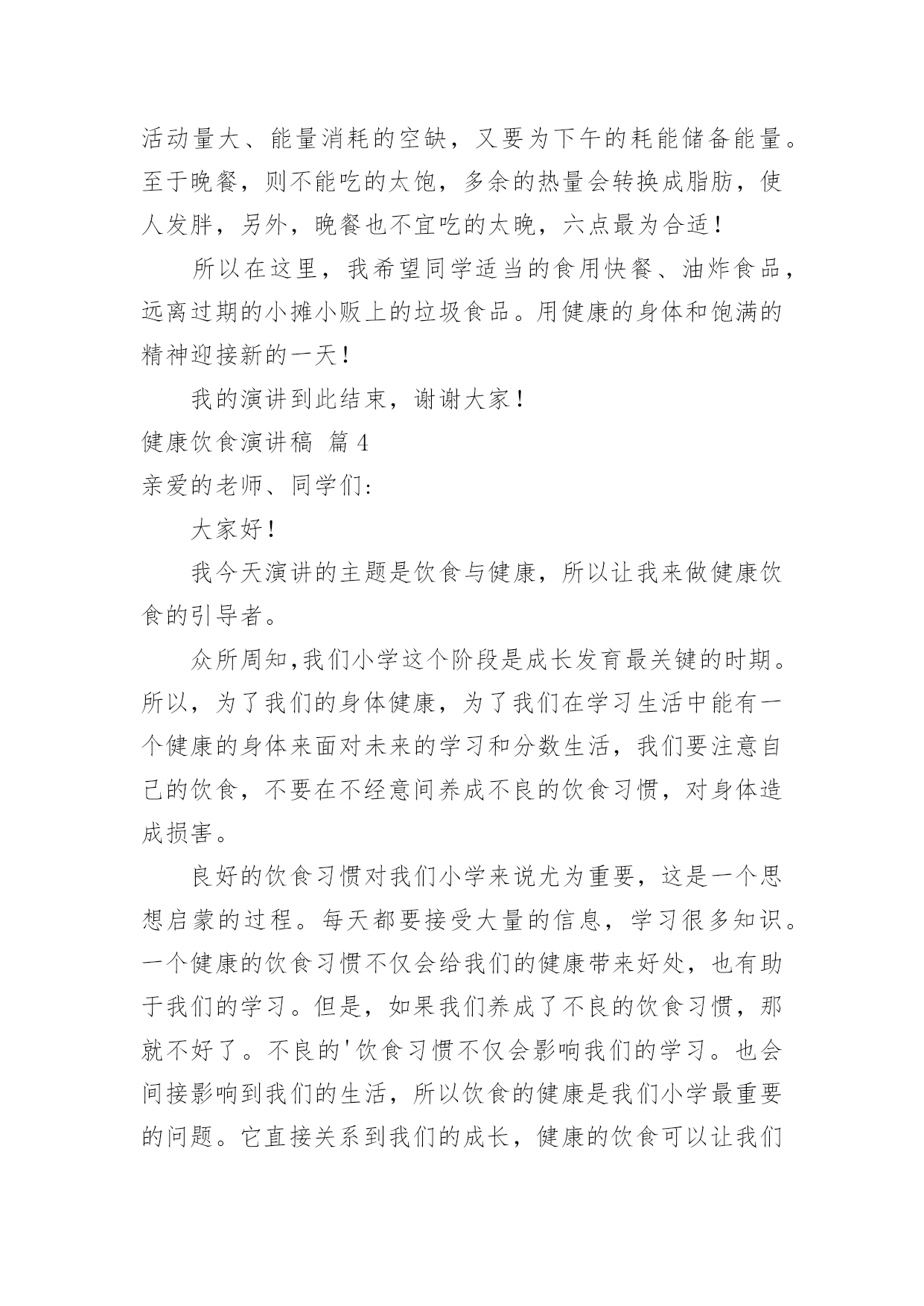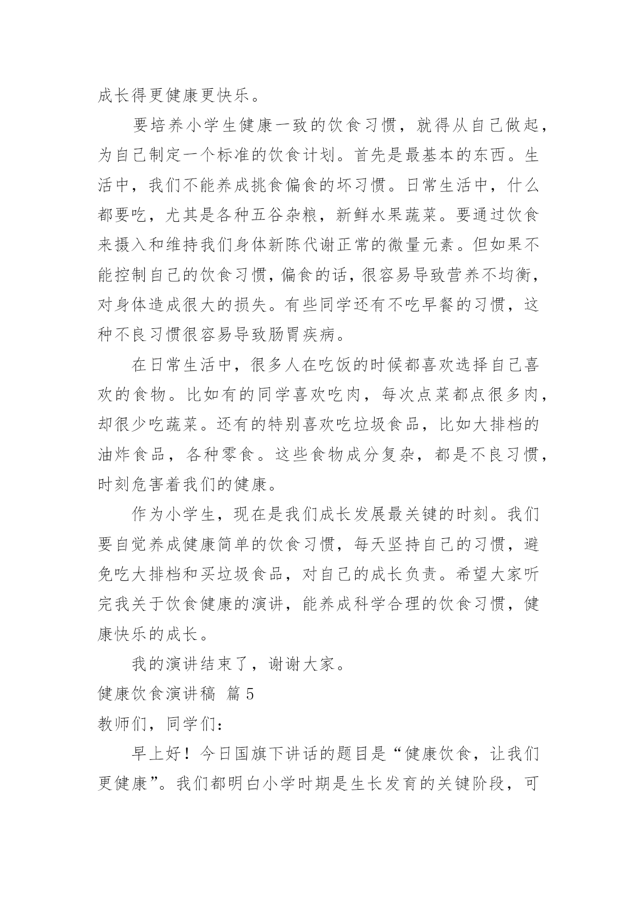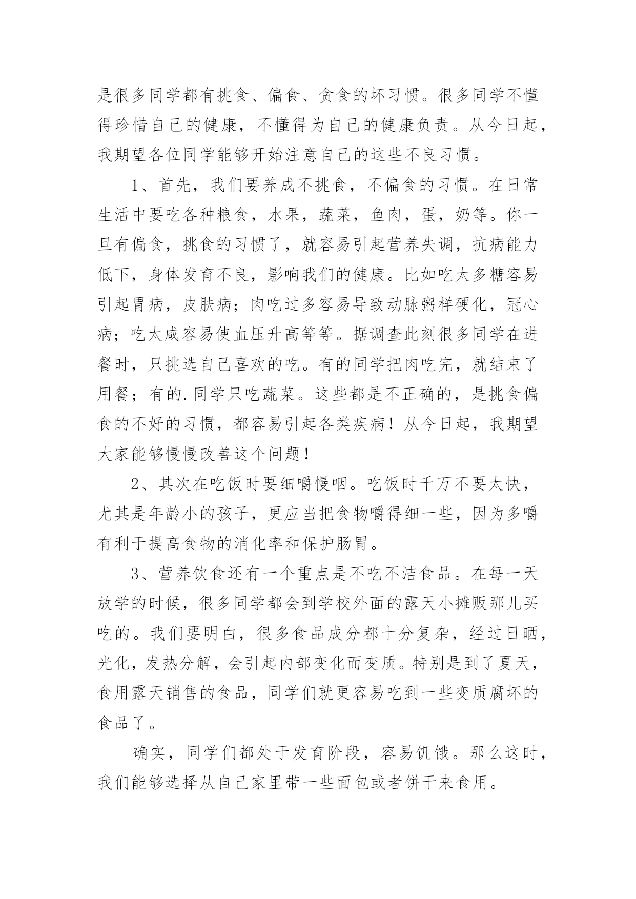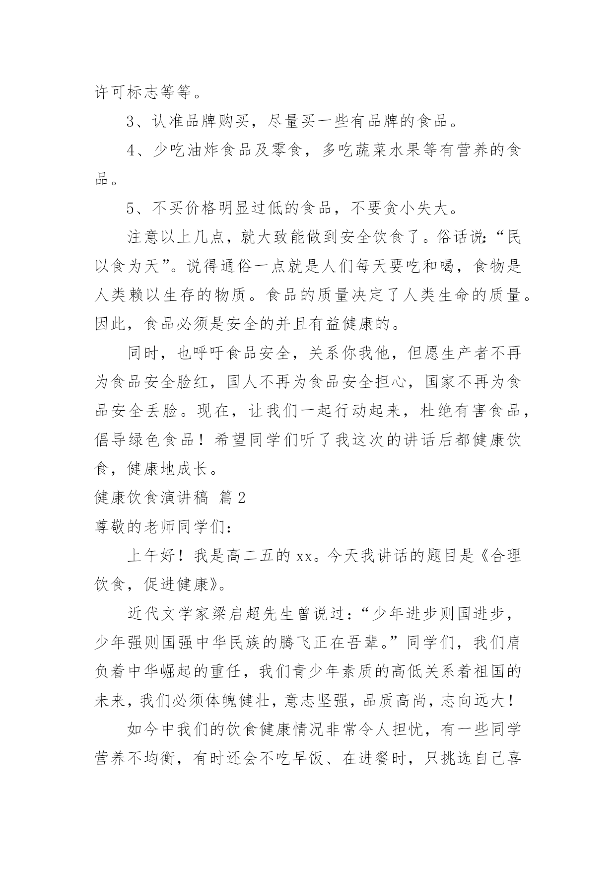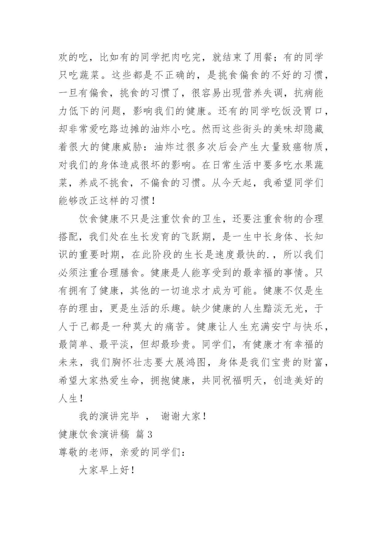 健康饮食演讲稿健康饮食演讲稿常用(27篇)演讲稿要求内容充实,条理清楚,重点突出。在社会发展不断提速的今天,我们使用上演讲稿的情况与日俱增,你写演讲稿时总是没有新意?以下是小编为大家收集的健康饮食演讲稿,仅供参考,希望能够帮助到大家。健康饮食演讲稿篇1老师们,同学们:大家好!今天我国旗下演讲的题目是《健康饮食从我做起》。每一家的健康与食品息息相关,随着经济社会不断进步,人们饮食文化日益多样化,食品卫生与安全成为备受关注的话题。最近,我注意到一个情况,就是每天都能看到我们学校旁的小商店和地摊小贩在卖一些三无食品和垃圾食品,而我们的一些同学却买得乐此不彼,吃得津津有味。可又有多少人知道,吃了它们不仅会导致肥胖,更严重的会使大量细菌侵入人体,造成胃肠炎症。所以,请警告广大朋友为了自己的健康而少吃这类食品。要健康饮食,就要做到以下几点:1、不购买街边小吃或街边小店的'垃圾食品,去一些正规超市购买食物。2、买所需食品时,要注意生产日期、保质期、QS生产许可标志等等。3、认准品牌购买,尽量买一些有品牌的食品。4、少吃油炸食品及零食,多吃蔬菜水果等有营养的食品。5、不买价格明显过低的食品,不要贪小失大。注意以上几点,就大致能做到安全饮食了。俗话说:“民以食为天”。说得通俗一点就是人们每天要吃和喝,食物是人类赖以生存的物质。食品的质量决定了人类生命的质量。因此,食品必须是安全的并且有益健康的。同时,也呼吁食品安全,关系你我他,但愿生产者不再为食品安全脸红,国人不再为食品安全担心,国家不再为食品安全丢脸。现在,让我们一起行动起来,杜绝有害食品,倡导绿色食品!希望同学们听了我这次的讲话后都健康饮食,健康地成长。健康饮食演讲稿篇2尊敬的老师同学们:上午好!我是高二五的xx。今天我讲话的题目是《合理饮食,促进健康》。近代文学家梁启超先生曾说过:“少年进步则国进步,少年强则国强中华民族的腾飞正在吾辈。”同学们,我们肩负着中华崛起的重任,我们青少年素质的高低关系着祖国的未来,我们必须体魄健壮,意志坚强,品质高尚,志向远大!如今中我们的饮食健康情况非常令人担忧,有一些同学营养不均衡,有时还会不吃早饭、在进餐时,只挑选自己喜欢的吃,比如有的同学把肉吃完,就结束了用餐;有的同学只吃蔬菜。这些都是不正确的,是挑食偏食的不好的习惯,一旦有偏食,挑食的习惯了,很容易出现营养失调,抗病能力低下的问题,影响我们的健康。还有的同学吃饭没胃口,却非常爱吃路边摊的油炸小吃。然而这些街头的美味却隐藏着很大的健康威胁:油炸过很多次后会产生大量致癌物质,对我们的身体造成很坏的影响。在日常生活中要多吃水果蔬菜,养成不挑食,不偏食的习惯。从今天起,我希望同学们能够改正这样的习惯!饮食健康不只是注重饮食的卫生,还要注重食物的合理搭配,我们处在生长发育的飞跃期,是一生中长身体、长知识的重要时期,在此阶段的生长是速度最快的.,所以我们必须注重合理膳食。健康是人能享受到的最幸福的事情。只有拥有了健康,其他的一切追求才成为可能。健康不仅是生存的理由,更是生活的乐趣。缺少健康的人生黯淡无光,于人于己都是一种莫大的痛苦。健康让人生充满安宁与快乐,最简单、最平淡,但却最珍贵。同学们,有健康才有幸福的未来,我们胸怀壮志要大展鸿图,身体是我们宝贵的财富,希望大家热爱生命,拥抱健康,共同祝福明天,创造美好的人生!我的演讲完毕,谢谢大家!健康饮食演讲稿篇3尊敬的老师,亲爱的同学们:大家早上好!今天我演讲的主题是《合理膳食,健康成长》。俗话说:“民以食为天”每天的饮食是我们赖以生存的基础,食品是补充身体营养的最有效的途径。食品质量的好坏直接关系到我们的身体。尤其是我们青少年处在生长发育的黄金时段,但有些同学自制力不强,经常会为了一些口腹之欲去吃一些路边摊上不卫生的食品。殊不知这些食品不仅没有营养价值,而且对我们的健康百害而无一利。总有那么一群人,即使知道了食品的`危害,仍然在路边的小摊小贩上购买食品。况且市场上大有一些黑心商家,用价格低廉的原材料甚至是有毒的化学物质制成看似营养丰富,实则是让人避而远之的毒大米、毒牛奶,甚至是塑料,你吃的不是蛋白质,而是可以让人致命的。也许你刚刚吃完的外卖就是商家在不足五平方米的小房间里用上述材料为你精心制作的。等我们到中年的时候,这些潜在的危险便会一股脑全部爆发出来,让你猝不及防。现在拥有健康的本钱,就等于拥有了拼搏的能力。俗话说:“身体是革命的本钱”只要我们拥有强健的体魄,还有什么可以阻挡我们前进的脚步呢?我们还有什么事情是不能做到的呢?那么,如何才能做到合理膳食呢?就三餐而言,早餐应该吃一些营养价值高,少而精的食品。人经过一夜的睡眠,头一晚上进食的营养已近基本消耗完。早上只有及时地补充才能满足我们上午的学习。午餐,则要保证食品的质与量。因为午餐具有承上启下的作用,既要补