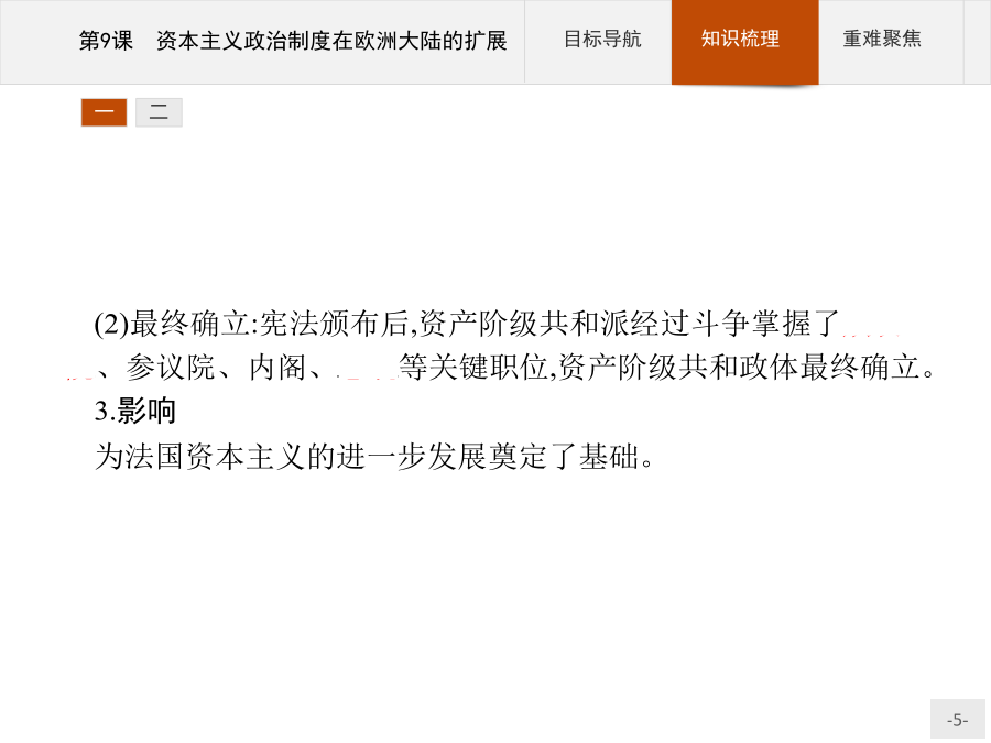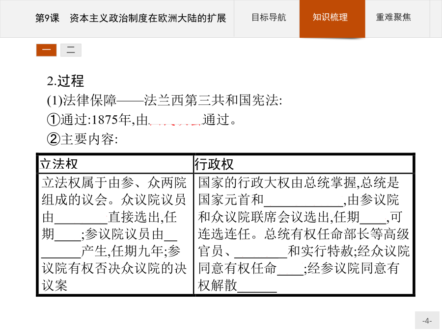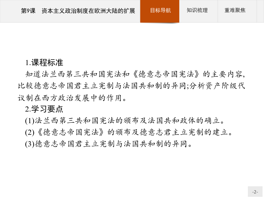 第9课资本主义政治制度在欧洲大陆的扩展情境导入通史坐标:一、法国共和政体的确立★★★1.背景(1)法国在18世纪是欧洲典型的国家,社会矛盾尖锐。(2)资产阶级对封建统治阶级的反抗日趋激烈。(3)一些资产阶级思想家公开反对君主专制,抨击宗教神权,号召人民争取自由和民主。2.历程(1)年,法国爆发资产阶级革命,并于1792年废除君主制,建立了共和国。(2)此后七十多年间,政权在共和制和君主制之间反复易手。(3)1870年,在普法战争中法国战败,法兰西第三共和国建立。3.确立(1)标志:年,法兰西第三共和国宪法
