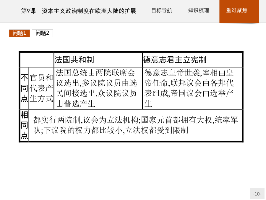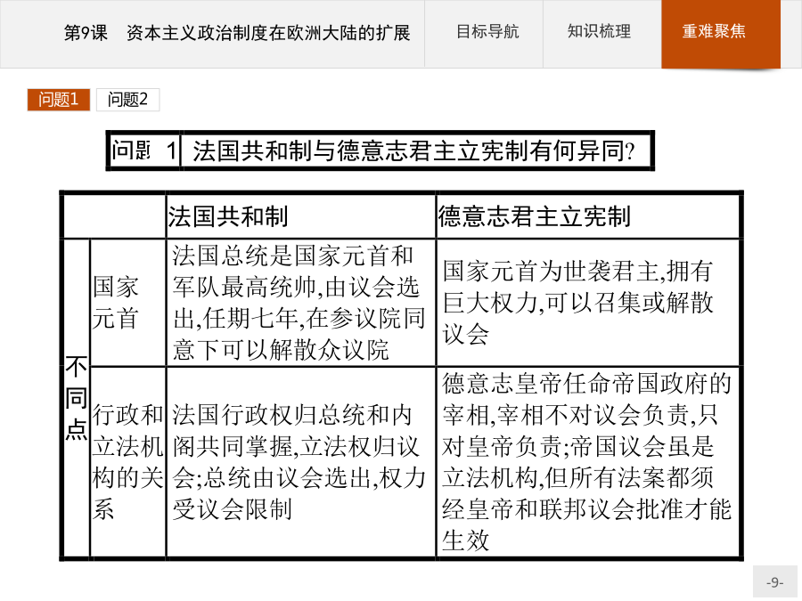 第9课资本主义政治制度在欧洲大陆的扩展1.课程标准知道法兰西第三共和国宪法和《德意志帝国宪法》的主要内容,比较德意志帝国君主立宪制与法国共和制的异同;分析资产阶级代议制在西方政治发展中的作用。2.学习要点(1)法兰西第三共和国宪法的颁布及法国共和政体的确立。(2)《德意志帝国宪法》的颁布及德意志君主立宪制的建立。(3)德意志帝国君主立宪制与法国共和制的异同。一一一一一一问题1问题1问题1问题1问题1问题1