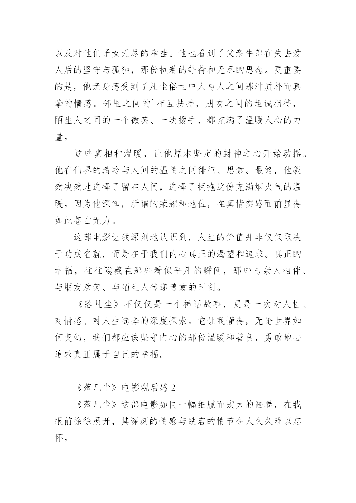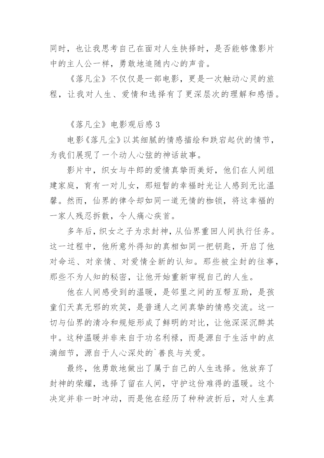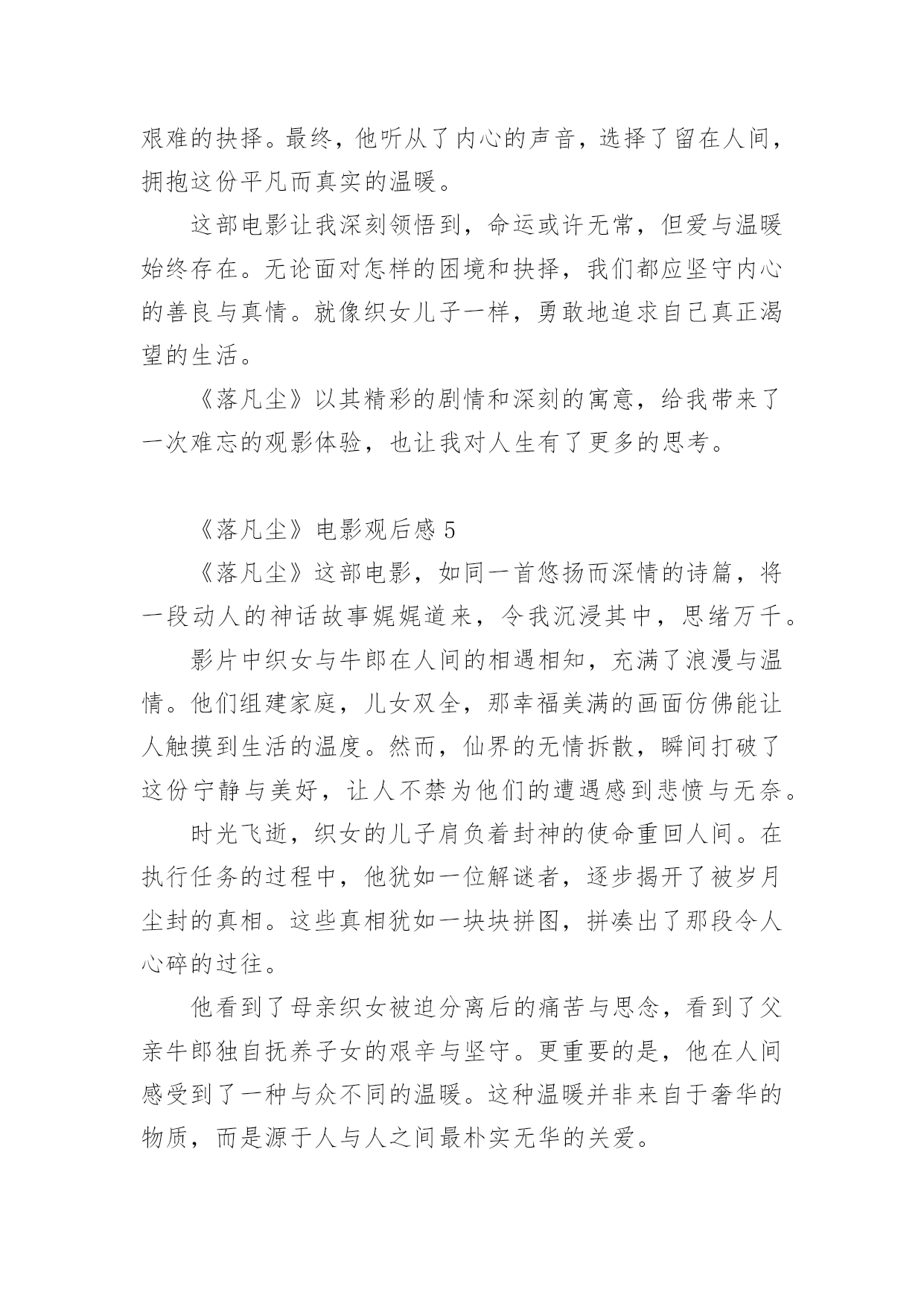《落凡尘》电影观后感《落凡尘》电影观后感(通用5篇)认真看完一部作品以后,相信大家一定领会了不少东西,观后感就是自己的一种思想感悟,观后感相当注重“感”,也就是从作品中领悟出的道理与思想。可是观后感怎么写才合适呢?下面是小编为大家整理的《落凡尘》电影观后感(通用5篇),供大家参考借鉴,希望可以帮助到有需要的朋友。《落凡尘》电影观后感1《落凡尘》这部电影,宛如一幅绚丽多彩却又饱含沧桑的画卷,在我的眼前缓缓展开,让我沉浸其中,感慨万千。织女与牛郎在人间的相遇相知,那纯粹而深厚的情感,犹如潺潺溪流,温润着我的心田。他们共筑爱巢,迎来一双儿女,一家四口的温馨画面,让我感受到了人间烟火里最平凡也最珍贵的幸福。然而,好景不长,仙界的强权无情地将这美满的家庭撕裂,那一瞬间,我的心也仿佛被重重地撞击。时光流转,织女的儿子长大成人,为了封神的梦想,他回到了曾经熟悉却又陌生的人间执行任务。在这个过程中,他揭开了被岁月掩埋的诸多真相。那些曾经被隐瞒的秘密,那些不为人知的过往,如同一把把钥匙,逐一打开了他内心深处的枷锁。他看到了母亲织女对人间的眷恋,对父亲牛郎的深情,以及对他们子女无尽的牵挂。他也看到了父亲牛郎在失去爱人后的坚守与孤独,那份执着的等待和无尽的思念。更重要的是,他亲身感受到了凡尘俗世中人与人之间那种质朴而真挚的情感。邻里之间的`相互扶持,朋友之间的坦诚相待,陌生人之间的一个微笑、一次援手,都充满了温暖人心的力量。这些真相和温暖,让他原本坚定的封神之心开始动摇。他在仙界的清冷与人间的温情之间徘徊、思索。最终,他毅然决然地选择了留在人间,选择了拥抱这份充满烟火气的温暖。因为他深知,所谓的荣耀和地位,在真情实感面前显得如此苍白无力。这部电影让我深刻地认识到,人生的价值并非仅仅取决于功成名就,而是在于我们内心真正的渴望和追求。真正的幸福,往往隐藏在那些看似平凡的瞬间,那些与亲人相伴、与朋友欢笑、与陌生人传递善意的时刻。《落凡尘》不仅仅是一个神话故事,更是一次对人性、对情感、对人生选择的深度探索。它让我懂得,无论世界如何变幻,我们都应该坚守内心的那份温暖和善良,勇敢地去追求真正属于自己的幸福。《落凡尘》电影观后感2《落凡尘》这部电影如同一幅细腻而宏大的画卷,在我眼前徐徐展开,其深刻的情感与跌宕的情节令人久久难以忘怀。影片起始,织女与牛郎的爱情宛如璀璨星辰,照亮了人间。他们的情投意合,儿女绕膝,构成了一幅幸福美满的人间图景。然而,仙界的横加干涉,将这温馨的画面无情打破,令人不禁为这对苦命鸳鸯扼腕叹息。岁月流转,织女之子怀着封神的渴望,从仙界重回人间执行任务。原以为这只是一次普通的使命,却未料成为了他人生的重大转折。在人间的种种际遇中,他逐渐揭开了那些被岁月掩埋的真相。他看到了母亲织女对人间的眷恋和对父亲牛郎的深情,这份情感在分离的岁月中愈发浓烈。他也看到了父亲牛郎在失去爱人后的坚守与孤独,那份默默承受的痛苦令人动容。更重要的是,他亲身感受到了凡尘俗世中那看似平凡却无比珍贵的温暖。街头巷尾的烟火气息,邻里之间的互帮互助,陌生人之间的友善微笑,这些人间的温暖细节如同一缕缕阳光,逐渐穿透了他心中的阴霾。在人间的日子里,他的心被这些温暖所填满,与仙界的清冷和孤寂形成了鲜明的对比。曾经,封神是他心中至高无上的追求,但在经历了这一切后,他开始重新审视自己的人生道路。最终,他毅然决然地选择了留在人间,放弃了仙界的荣耀。因为他深知,人间的温暖、亲情与爱,才是他内心真正渴望的东西。这部电影让我深刻地认识到,人生的价值不在于功名利禄,而在于内心的'满足和情感的寄托。它让我看到了爱情的坚贞不屈,亲情的深沉厚重,以及人间温暖的强大力量。同时,也让我思考自己在面对人生抉择时,是否能够像影片中的主人公一样,勇敢地追随内心的声音。《落凡尘》不仅仅是一部电影,更是一次触动心灵的旅程,让我对人生、爱情和选择有了更深层次的理解和感悟。《落凡尘》电影观后感3电影《落凡尘》以其细腻的情感描绘和跌宕起伏的情节,为我们展现了一个动人心弦的神话故事。影片中,织女与牛郎的爱情真挚而美好,他们在人间组建家庭,育有一对儿女,那短暂的幸福时光让人感到无比温馨。然而,仙界的律令却如同一道无情的枷锁,将这幸福的一家人残忍拆散,令人痛心疾首。多年后,织女之子为求封神,从仙界重回人间执行任务。这一过程中,他所意外得知的真相如同一把钥匙,开启了他对命运、对亲情、对爱情全新的认知。那些被尘封的往事,那些不为人知的秘密,让他开始重新审视自己的人生。他在人间感受到的温暖,是邻里之间的互帮互助,是孩童们天真无邪的欢笑,是普通人之间真挚的情感交流。这一切与仙界的清冷和规矩形成了鲜明的对比,让他深深沉醉其中。这种温暖并非来自于功名利禄,而是源自于生活中的点滴细节,源自于人心深处的`善良与关爱。最终,他勇敢地做出了属于自