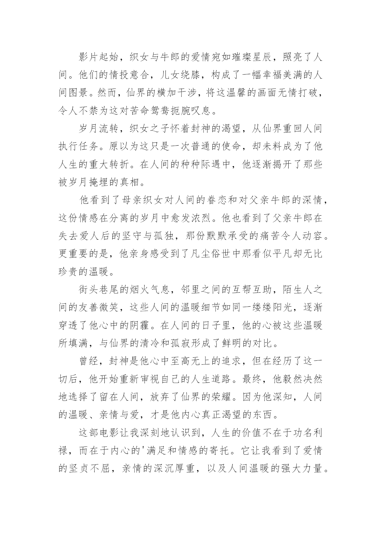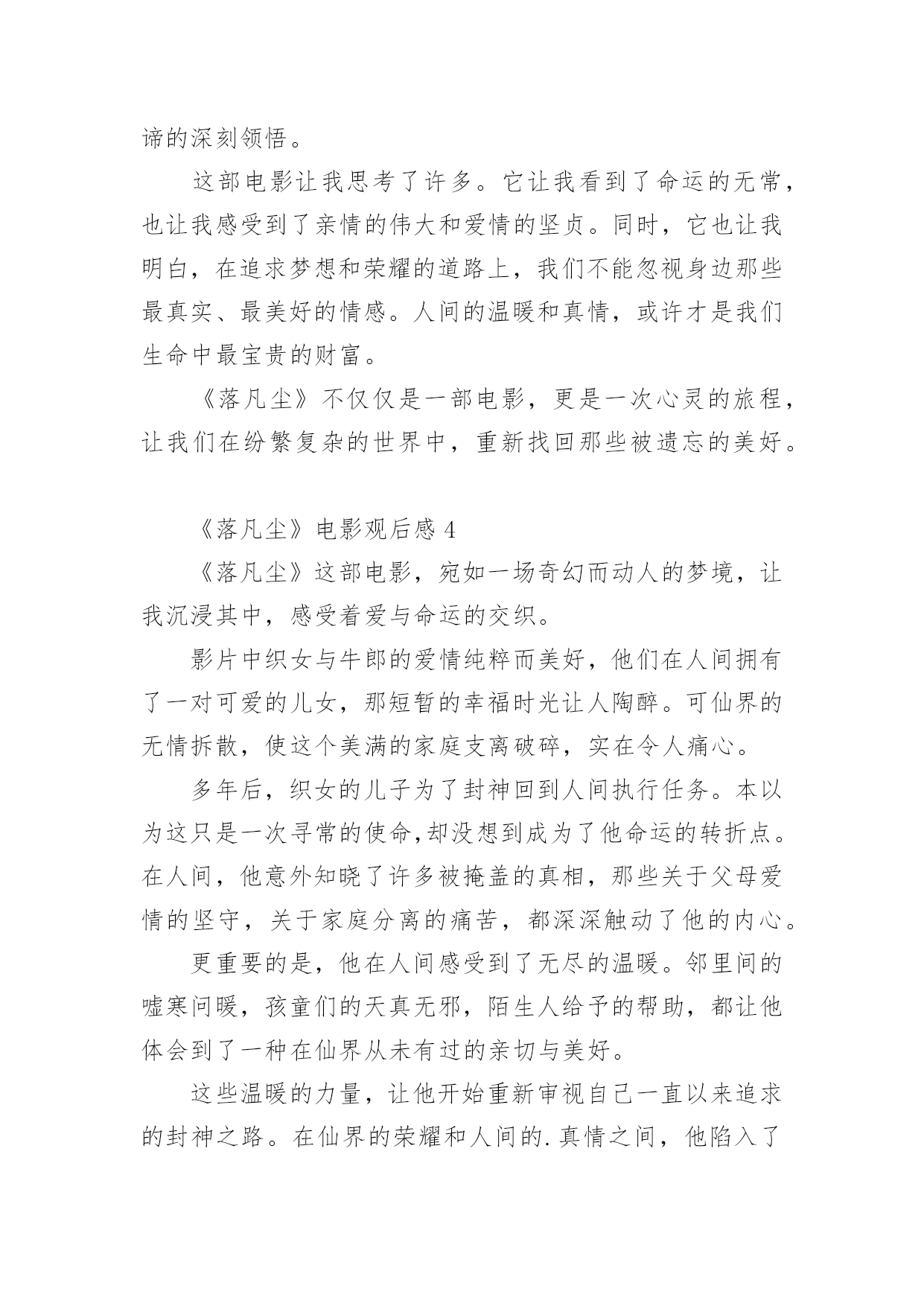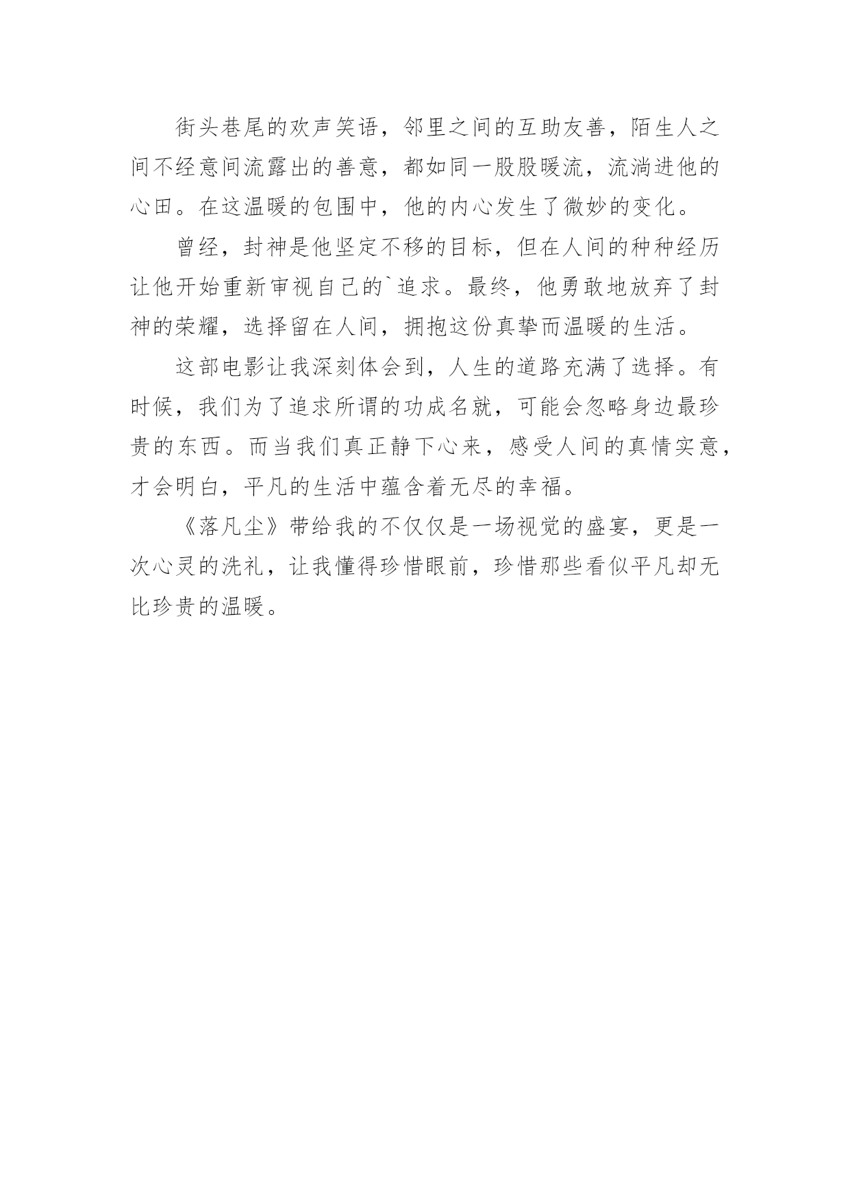 《落凡尘》电影观后感《落凡尘》电影观后感(通用5篇)认真看完一部作品以后,相信大家一定领会了不少东西,观后感就是自己的一种思想感悟,观后感相当注重“感”,也就是从作品中领悟出的道理与思想。可是观后感怎么写才合适呢?下面是小编为大家整理的《落凡尘》电影观后感(通用5篇),供大家参考借鉴,希望可以帮助到有需要的朋友。《落凡尘》电影观后感1《落凡尘》这部电影,宛如一幅绚丽多彩却又饱含沧桑的画卷,在我的眼前缓缓展开,让我沉浸其中,感慨万千。织女与牛郎在人间的相遇相知,那纯粹而深厚的情感,犹如潺潺溪流,温润着我的心田。他们共筑爱巢,迎来一双儿女,一家四口的温馨画面,让我感受到了人间烟火里最平凡也最珍贵的幸福。然而,好景不长,仙界的强权无情地将这美满的家庭撕裂,那一瞬间,我的心也仿佛被重重地撞击。时光流转,织女的儿子长大成人,为了封神的梦想,他回到了曾经熟悉却又陌生的人间执行任务。在这个过程中,他揭开了被岁月掩埋的诸多真相。那些曾经被隐瞒的秘密,那些不为人知的过往,如同一把把钥匙,逐一打开了他内心深处的枷锁。他看到了母亲织女对人间的眷恋,对父亲牛郎的深情,以及对他们子女无尽的牵挂。他也看到了父亲牛郎在失去爱人后的坚守与孤独,那份执着的等待和无尽的思念。更重要的是,他亲身感受到了凡尘俗世中人与人之间那种质朴而真挚的情感。邻里之间的`相互扶持,朋友之间的坦诚相待,陌生人之间的一个微笑、一次援手,都充满了温暖人心的力量。这些真相和温暖,让他原本坚定的封神之心开始动摇。他在仙界的清冷与人间的温情之间徘徊、思索。最终,他毅然决然地选择了留在人间,选择了拥抱这份充满烟火气的温暖。因为他深知,所谓的荣耀和地位,在真情实感面前显得如此苍白无力。这部电影让我深刻地认识到,人生的价值并非仅仅取决于功成名就,而是在于我们内心真正的渴望和追求。真正的幸福,往往隐藏在那些看似平凡的瞬间,那些与亲人相伴、与朋友欢笑、与陌生人传递善意的时刻。《落凡尘》不仅仅是一个神话故事,更是一次对人性、对情感、对人生选择的深度探索。它让我懂得,无论世界如何变幻,我们都应该坚守内心的那份温暖和善良,勇敢地去追求真正属于自己的幸福。《落凡尘》电影观后感2《落凡尘》这部电影如同一幅细腻而宏大的画卷,在我眼前徐徐展开,其深刻的情感与跌宕的情节令人久久难以忘怀。影片起始,织女与牛郎的爱情宛如璀璨星辰,照亮了人间。他们的情投意合,儿女绕膝,构成了一幅幸福美满的人间图景。然而,仙界的横加干涉,将这温馨的画面无情打破,令人不禁为这对苦命鸳鸯扼腕叹息。岁月流转,织女之子怀着封神的渴望,从仙界重回人间执行任务。原以为这只是一次普通的使命,却未料成为了他人生的重大转折。在人间的种种际遇中,他逐渐揭开了那些被岁月掩埋的真相。他看到了母亲织女对人间的眷恋和对父亲牛郎的深情,这份情感在分离的岁月中愈发浓烈。他也看到了父亲牛郎在失去爱人后的坚守与孤独,那份默默承受的痛苦令人动容。更重要的是,他亲身感受到了凡尘俗世中那看似平凡却无比珍贵的温暖。街头巷尾的烟火气息,邻里之间的互帮互助,陌生人之间的友善微笑,这些人间的温暖细节如同一缕缕阳光,逐渐穿透了他心中的阴霾。在人间的日子里,他的心被这些温暖所填满,与仙界的清冷和孤寂形成了鲜明的对比。曾经,封神是他心中至高无上的追求,但在经历了这一切后,他开始重新审视自己的人生道路。最终,他毅然决然地选择了留在人间,放弃了仙界的荣耀。因为他深知,人间的温暖、亲情与爱,才是他内心真正渴望的东西。这部电影让我深刻地认识到,人生的价值不在于功名利禄,而在于内心的'满足和情感的寄托。它让我看到了爱情的坚贞不屈,亲情的深沉厚重,以及人间温暖的强大力量。同时,也让我思考自己在面对人生抉择时,是否能够像影片中的主人公一样,勇敢地追随内心的声音。《落凡尘》不仅仅是一部电影,更是一次触动心灵的旅程,让我对人生、爱情和选择有了更深层次的理解和感悟。《落凡尘》电影观后感3电影《落凡尘》以其细腻的情感描绘和跌宕起伏的情节,为我们展现了一个动人心弦的神话故事。影片中,织女与牛郎的爱情真挚而美好,他们在人间组建家庭,育有一对儿女,那短暂的幸福时光让人感到无比温馨。然而,仙界的律令却如同一道无情的枷锁,将这幸福的一家人残忍拆散,令人痛心疾首。多年后,织女之子为求封神,从仙界重回人间执行任务。这一过程中,他所意外得知的真相如同一把钥匙,开启了他对命运、对亲情、对爱情全新的认知。那些被尘封的往事,那些不为人知的秘密,让他开始重新审视自己的人生。他在人间感受到的温暖,是邻里之间的互帮互助,是孩童们天真无邪的欢笑,是普通人之间真挚的情感交流。这一切与仙界的清冷和规矩形成了鲜明的对比,让他深深沉醉其中。这种温暖并非来自于功名利禄,而是源自于生活中的点滴细节,源自于人心深处的`善良与关爱。最终,他勇敢地做出了属于自