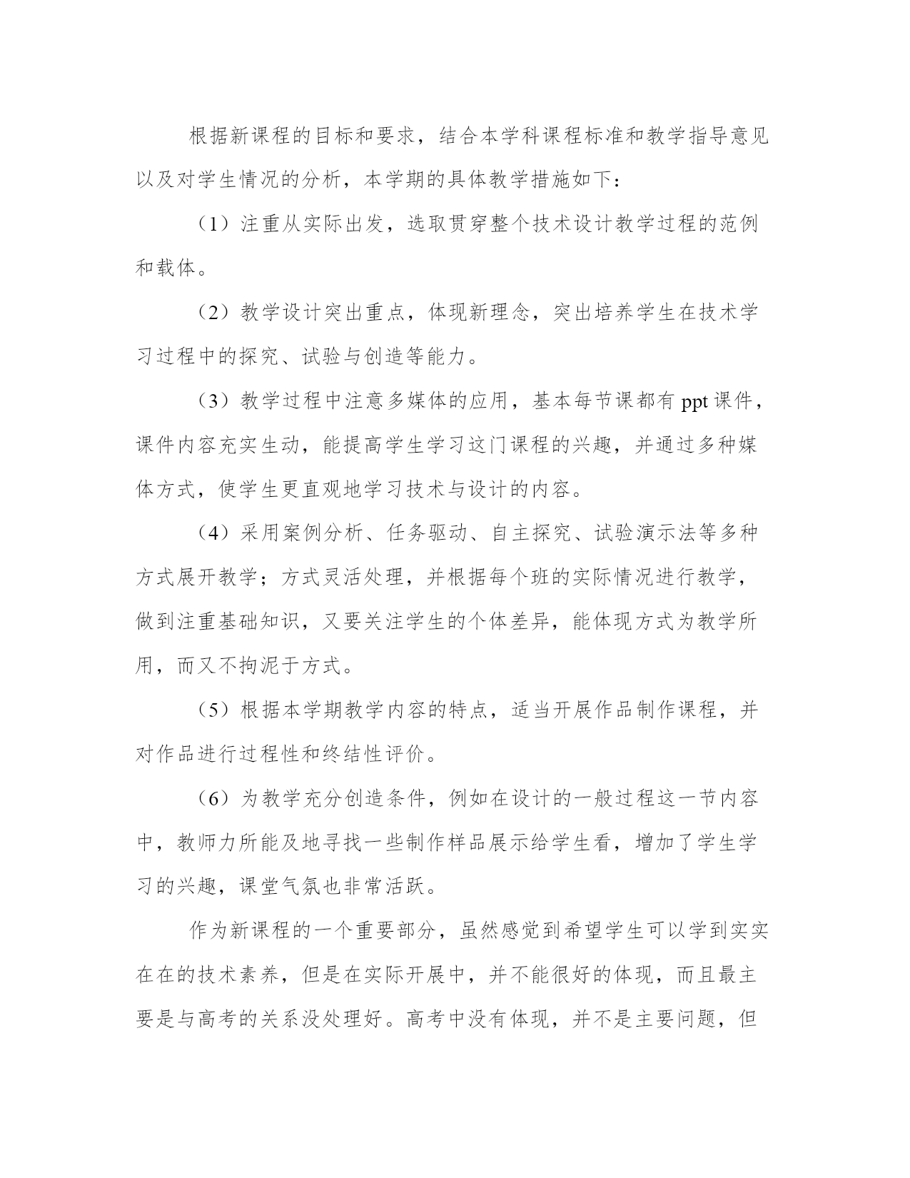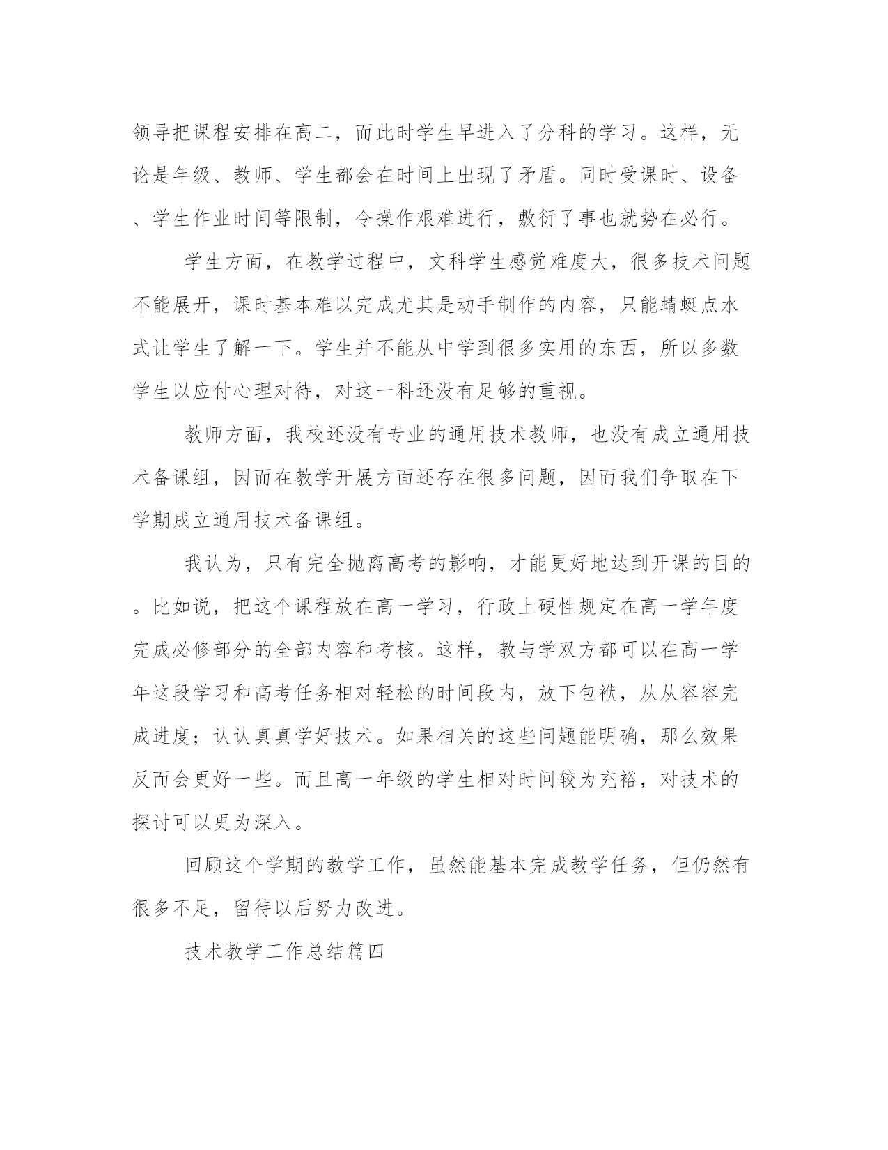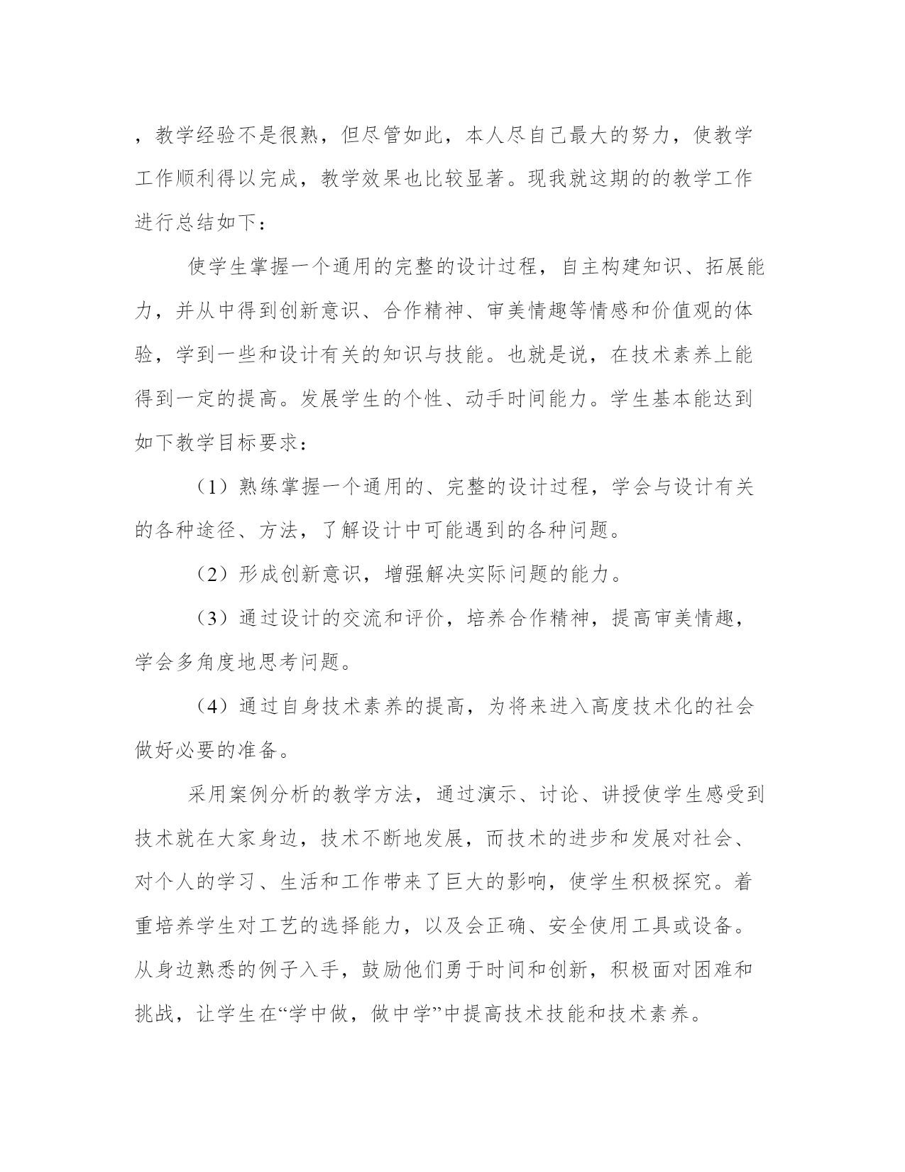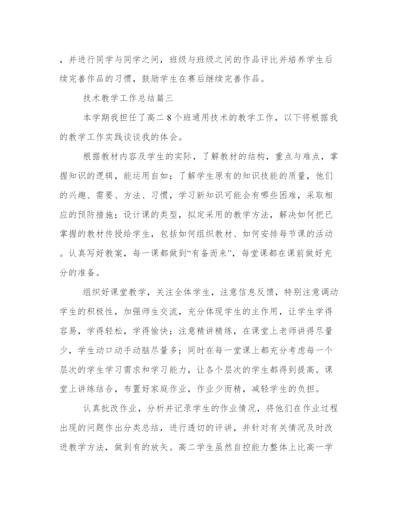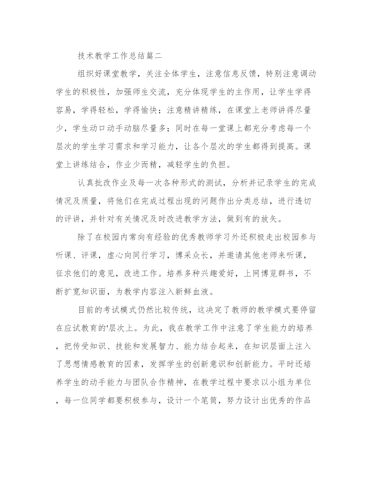 2023年技术教学工作总结(实用19篇)总结是在一段时间内对学习和工作生活等表现加以总结和概括的一种书面材料,它可以促使我们思考,我想我们需要写一份总结了吧。那么我们该如何写一篇较为完美的总结呢?以下是小编收集整理的工作总结书范文,仅供参考,希望能够帮助到大家。技术教学工作总结篇一本学年我担任高一年级25—26共11个班的通用技术教学工作。在这一学期结束之际,我认真梳理了本学期的教学工作,做出如下总结。课程内容相同,班情不同,因此我在备课时力争做到“三备”:备教材,备教法,备学生。根据教材内容及学生的实际,深入了解教材的结构,详细分析教材重点与难点,以便掌握知识的逻辑,在教学活动中运用自如。在课内外了解学生已有的知识技能水平,了解学生他们的兴趣、需要、方法、习惯,以便在课堂中有针对性开展活动。在编写教案时,注意设计课的类型,考虑采用什么教学方法,把已掌握的教材内容传授给学生,包括如何组织教材、如何安排每节课的活动。同时,认真写好教案,每一课都做到“有备而来”,每堂课都在课前做好充分的准备。关注全体学生,激发学生的学习积极性,使学生参与课堂。加强师生交流,充分体现学生的主导作用,让学生学得容易,学得轻松,学得愉快。用丰富的案例激发学生的情感,创造良好的课堂气氛使他们融入课堂,课堂提问面向全体学生,注意引发学生学通用技术的兴趣,注意精讲精练,在课堂上注意讲得少,学生动口动手动脑尽量多;在每一堂课上充分考虑不同层次的学生学习需求和学习能力,让学生都得到提高。课堂上讲练结合,笔记精而少,减轻学生的负担。通用技术教师不仅要有广泛的专业知识,还要具备一定的综合素质,更要具备有机地整合学科知识的能力和敏锐的洞察力。为此,我广学多识,通过网络学习弥补自己欠缺的知识,提高课堂教学水平和多视角、深层次的分析和反思能力,提高业务水平和解决教学问题的能力。订阅专业报刊与杂志,不断扩宽知识面,拓宽自己的教育视野,提高自己的业务水平。严格执行学校的各种规章制度学校的各种活动按时参加,从不迟到,早退。在每周一的升国旗时间,我倾听了学子们的青春表白,聆听了各位老师的精彩演讲;在校例会上,我了解了学校的近期工作安排。学校的各种考试中履行自己的监考职责。同时,做好通用技术教室的卫生和设施维护。辛勤的付出一定会有回报,回顾这几个月的教学工作,我深知自己的教学业务能力有了提高,但还需要加倍努力,最终才会走出一片课堂的新天地。今后,我会不断探究开展通用技术课的特点,引导学生关注这门课,真正让学生从通用技术课程中感受到与众不同的乐趣,喜欢上这门课。技术教学工作总结篇二组织好课堂教学,关注全体学生,注意信息反馈,特别注意调动学生的积极性,加强师生交流,充分体现学生的主作用,让学生学得容易,学得轻松,学得愉快;注意精讲精练,在课堂上老师讲得尽量少,学生动口动手动脑尽量多;同时在每一堂课上都充分考虑每一个层次的学生学习需求和学习能力,让各个层次的学生都得到提高。课堂上讲练结合,作业少而精,减轻学生的负担。认真批改作业及每一次各种形式的测试,分析并记录学生的完成情况及质量,将他们在完成过程出现的问题作出分类总结,进行透切的评讲,并针对有关情况及时改进教学方法,做到有的放矢。除了在校园内常向有经验的优秀教师学习外还积极走出校园参与听课、评课,虚心向同行学习,博采众长,并邀请其他老师来听课,征求他们的意见,改进工作。培养多种兴趣爱好,上网博览群书,不断扩宽知识面,为教学内容注入新鲜血液。目前的考试模式仍然比较传统,这决定了教师的教学模式要停留在应试教育的'层次上。为此,我在教学工作中注意了学生能力的培养,把传受知识、技能和发展智力、能力结合起来,在知识层面上注入了思想情感教育的因素,发挥学生的创新意识和创新能力。平时还培养学生的动手能力与团队合作精神,在教学过程中要求以小组为单位,每一位同学都要积极参与,设计一个笔筒,努力设计出优秀的作品,并进行同学与同学之间,班级与班级之间的作品评比并培养学生后续完善作品的习惯,鼓励学生在赛后继续完善作品。技术教学工作总结篇三本学期我担任了高二8个班通用技术的教学工作,以下将根据我的教学工作实践谈谈我的体会。根据教材内容及学生的实际,了解教材的结构,重点与难点,掌握知识的逻辑,能运用自如;了解学生原有的知识技能的质量,他们的兴趣、需要、方法、习惯,学习新知识可能会有哪些困难,采取相应的预防措施;设计课的类型,拟定采用的教学方法,解决如何把已掌握的教材传授给学生,包括如何组织教材、如何安排每节课的活动。认真写好教案,每一课都做到“有备而来”,每堂课都在课前做好充分的准备。组织好课堂教学,关注全体学生,注意信息反馈,特别注意调动学生的积极性,加强师生交流,充分体现学生的主作用,让学生学得容易,学得轻松,学得愉快;注
