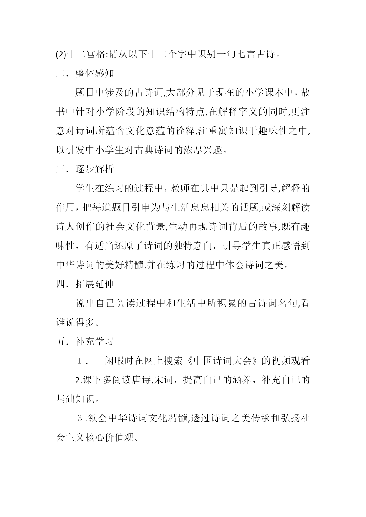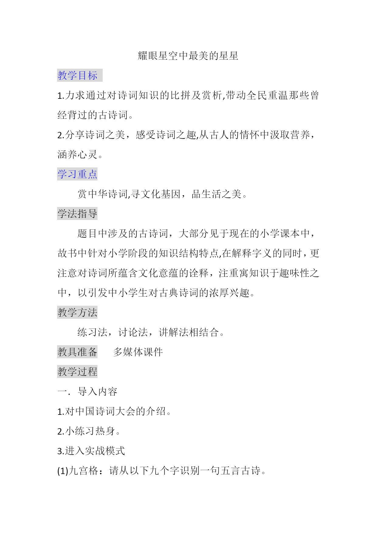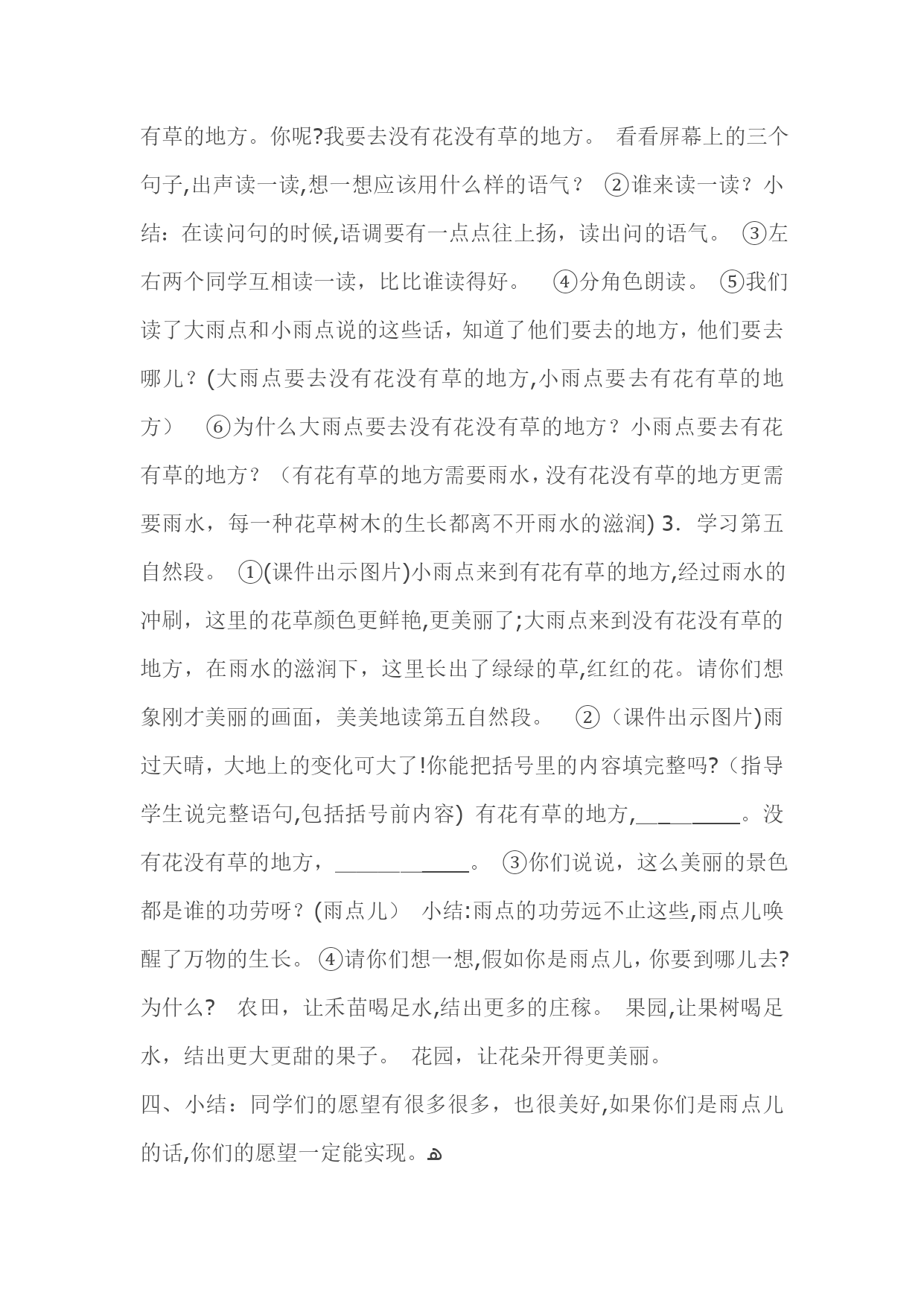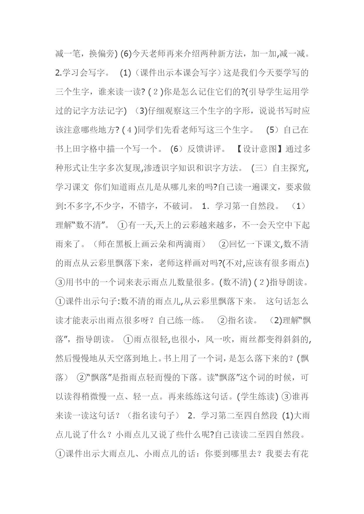 教学目标知识与能力:认识十一个生字,会写三个字。2.正确、流利地朗读课文。3.仿照“我会读”的句式说句子。4.了解课文内容,懂得雨水与植物生长有着密切的关系过程与方法:1.鼓励学生通过多种方法识字,掌握生字发音、字形及意义。2.抓住标点符号及重点词语,在理解标点符号作用和词义的基础上,进行朗读指导。尊重学生独特的朗读体验。3.借助多媒体调动学生各种感官,激发学习兴趣,提高学习效率。情感态度与价值观:引导学生明白雨点儿滋润了万物,向往美好的心境,关心自然和生命。二、教学重难点教学重点:教学难点:了解课文内容,懂得雨水与植物生长有着密切的关系。教学过程(一)初读课文,整体感知1.请同学们齐读课题。(指导学生读好课题中的儿话音)2.老师来读一遍课文,请同学们把书拿好,眼睛看着课文,认真听。(培养良好的倾听习惯)3.同学们,请你们自己读一遍课文,在书中标画自然段,圈画会认字。(五个自然段)【设计意图】初步感知课文内容。(二)多种方法学生字词1.学习认读字。(1)大屏幕上有许多词语,请你借助拼音读一读。(课件出示认读字组成的词语,学生借助拼音自读)(2)这些词语去掉拼音了,谁想当小老师带着大家读一读?(3)看图举词卡游戏:仔细看图,想一想图上画的是什么?然后请你们在词卡中迅速找到相应的词语并举给老师看。(4)认读字从词里跑出来,你们还认识吗?(开火车读认读字)(5)之前我们识记新字有哪些方法?(加一笔,减一笔,换偏旁)(6)今天老师再来介绍两种新方法,加一加,减一减。2.学习会写字。(1)(课件出示本课会写字)这是我们今天要学写的三个生字,谁来读一读?(2)你是怎么记住它们的?(引导学生运用学过的记字方法记字)(3)仔细观察这三个生字的字形,说说书写时应该注意哪些地方?(4)同学们先看老师写这三个生字。(5)自己在书上田字格中描一个写一个。(6)反馈讲评。【设计意图】通过多种形式让生字多次复现,渗透识字知识和识字方法。(三)自主探究,学习课文你们知道雨点儿是从哪儿来的吗?自己读一遍课文,要求做到:不多字,不少字,不错字,不破词。1.学习第一自然段。(1)理解“数不清”。①有一天,天上的云彩越来越多,不一会天空中下起雨来了。(师在黑板上画云朵和两滴雨)②回忆一下课文,数不清的雨点从云彩里飘落下来,老师这样画对吗?(不对,应该有很多雨点)③用书中的一个词来表示雨点儿数量很多。(数不清)(2)指导朗读。①课件出示句子:数不清的雨点儿,从云彩里飘落下来。这句话怎么读才能表示出雨点很多呀?自己练一练。②指名读。(2)理解“飘落”,指导朗读。①雨点很轻,也很小,风一吹,雨丝都变得斜斜的,然后慢慢地从天空落到地上。书上用了一个词,是怎么落下来的?(飘落)②“飘落”是指雨点轻而慢的下落。读“飘落”这个词的时候,可以读得稍微慢一点、轻一点。再来练练这句话。(学生练读)③谁再来读一读这句话?(指名读句子)2.学习第二至四自然段(1)大雨点儿说了什么?小雨点儿又说了些什么呢?自己读读二至四自然段。①课件出示大雨点儿、小雨点儿的话:你要到哪里去?我要去有花有草的地方。你呢?我要去没有花没有草的地方。看看屏幕上的三个句子,出声读一读,想一想应该用什么样的语气?②谁来读一读?小结:在读问句的时候,语调要有一点点往上扬,读出问的语气。③左右两个同学互相读一读,比比谁读得好。④分角色朗读。⑤我们读了大雨点和小雨点说的这些话,知道了他们要去的地方,他们要去哪儿?(大雨点要去没有花没有草的地方,小雨点要去有花有草的地方)⑥为什么大雨点要去没有花没有草的地方?小雨点要去有花有草的地方?(有花有草的地方需要雨水,没有花没有草的地方更需要雨水,每一种花草树木的生长都离不开雨水的滋润)3.学习第五自然段。①(课件出示图片)小雨点来到有花有草的地方,经过雨水的冲刷,这里的花草颜色更鲜艳,更美丽了;大雨点来到没有花没有草的地方,在雨水的滋润下,这里长出了绿绿的草,红红的花。请你们想象刚才美丽的画面,美美地读第五自然段。②(课件出示图片)雨过天晴,大地上的变化可大了!你能把括号里的内容填完整吗?(指导学生说完整语句,包括括号前内容)有花有草的地方,_______。没有花没有草的地方,________。③你们说说,这么美丽的景色都是谁的功劳呀?(雨点儿)小结:雨点的功劳远不止这些,雨点儿唤醒了万物的生长。④请你们想一想,假如你是雨点儿,你要到哪儿去?为什么?农田,让禾苗喝足水,结出更多的庄稼。果园,让果树喝足水,结出更大更甜的果子。花园,让花朵开得更美丽。四、小结:同学们的愿望有很多很多,也很美好,如果你们是雨点儿的话,你们的愿望一定能实现。ﻫ耀眼星空中最美的星星教学目标力求通过对诗词知识的比拼及赏析,带动全民重温那些曾经背过的古诗词。分享诗词之美,感受诗词之趣,从