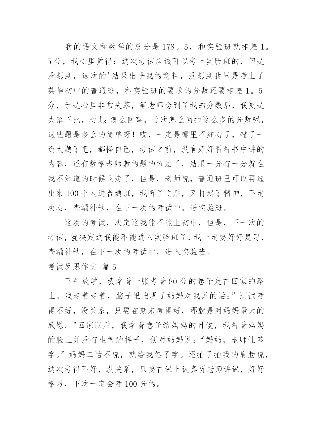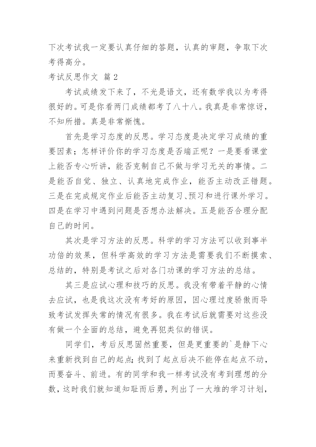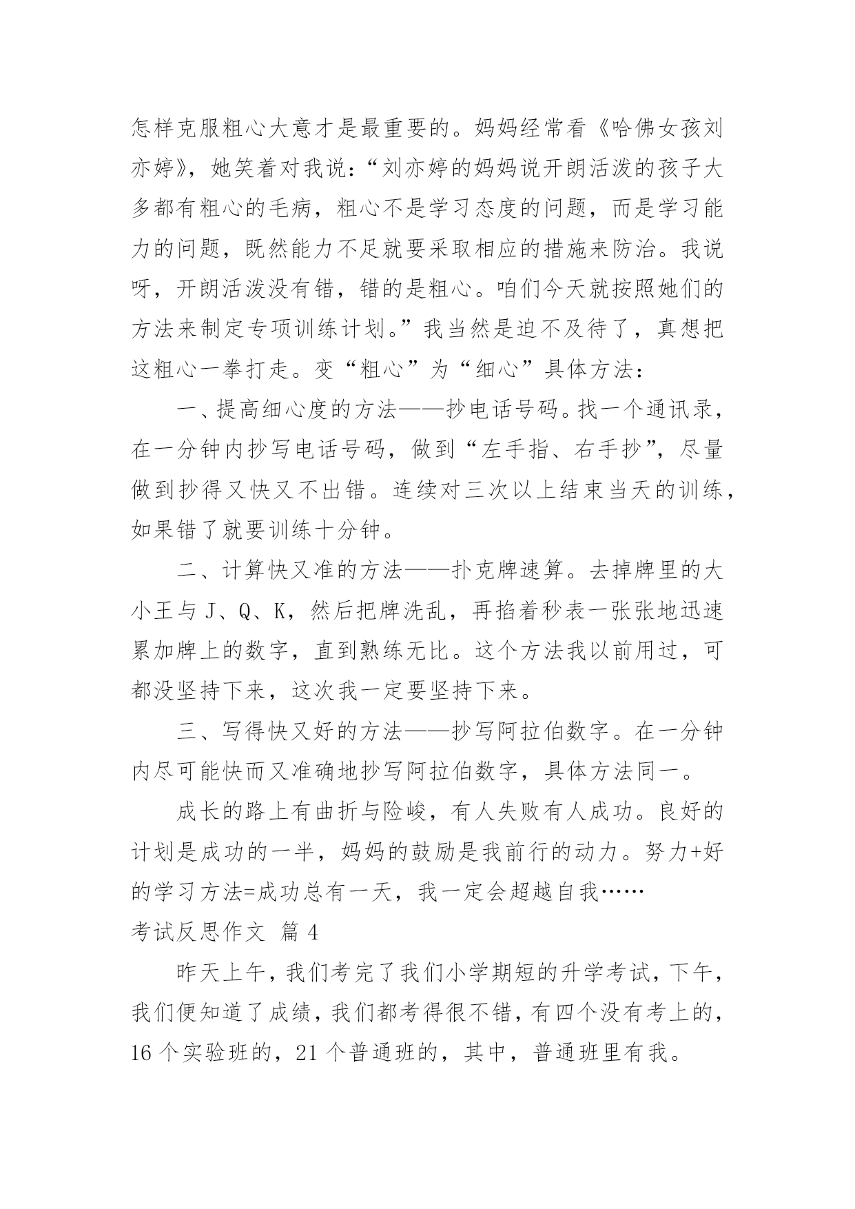 考试反思作文考试反思作文7篇[合集]在日常生活或是工作学习中,大家都经常看到作文的身影吧,作文是一种言语活动,具有高度的综合性和创造性。你所见过的作文是什么样的呢?以下是小编帮大家整理的考试反思作文7篇,欢迎阅读,希望大家能够喜欢。考试反思作文篇1时光飞逝,转眼就到了期中考试,成绩早已出来了,但基础知识的得分却让我很失望。第一,给词加点字选择意思,我错了。错的原因就是没有把字的.意思套进词里,反复读,并且理解。第二,判断题,我错了。原因是我没有认真,仔细、反复读题。再一个,那道题实在是不好理解,我应该多读,多想,再做题。第三,阅读理解的概括全文的题,我错了。原因还是没有反复阅读短文,理解短文,并写出起因及结果。第四,最后,老师还发现我“堵”字下面的“日”字写成了“目”字,唉,又马虎了!我每次考试都有不应该错的地方,所以我以后我要认真仔细答卷。第五,基础题上的看拼音写字这类的题目错的还不少,分也扣的不少。这次考试虽然考完了,但这次犯的错误却让我难以忘怀。下次考试我一定要认真仔细的答题,认真的审题,争取下次考得高分。考试反思作文篇2考试成绩发下来了,不光是语文,还有数学我以为考得很好的。可是你看两门成绩都考了八十八。我真是非常惊讶,不知所措。真是非常惭愧。首先是学习态度的反思。学习态度是决定学习成绩的重要因素;怎样评价你的学习态度是否端正呢?一是要看课堂上能否专心听讲,能否克制自己不做与学习无关的事情。二是能否自觉、独立、认真地完成作业,能否主动改正错题。三是在完成规定作业后能否主动复习、预习和进行课外学习。四是在学习中遇到问题是否想办法解决。五是能否合理分配自己的时间。其次是学习方法的反思。科学的学习方法可以收到事半功倍的效果,但科学高效的学习方法是需要我们不断摸索、总结的,特别是考试之后对各门功课的学习方法的总结。其三是应试心理和技巧的反思。我没有带着平静的心情去应试,也是我这次没有考好的原因,因心理过度骄傲而导致考试发挥失常的情况有很多。我在考试后就需要对这些没有做一个全面的总结,避免再犯类似的错误。同学们,考后反思固然重要,但是更重要的`是静下心来重新找到自己的起点;找到了起点后决不能停在起点不动,而要奋斗、前进。有的同学和我一样考试没有考到理想的分数,这时我们就知道知耻而后勇,列出了一大堆的学习计划,下了一大堆的决心,但是几天过后就又像以前一样了,又失去了动力。所以对待学习,我们要有坚定的毅力。考试反思作文篇3当我看到数学成绩时,我哭了,透过泪水我看到了老师与父母对我的失望与惋惜!这次的数学成绩太令我失望了,因为错的非常可惜。一道应用题,在4000米长的路两旁栽树,每隔100米栽一棵,两端都要栽,问一共能栽多少棵?我算式列对了,可惜把4000抄成了400,检查时竟也没检查出来,因此,那宝贵的5分就跟我说“拜拜”了。最后一题是画折线统计图,图我画对了,可画完后,我却放松了,描点的时候,我竟然把85描在了75上,虽说下面的都描对了,可一分也没给我。都是粗心惹得祸,看着卷子上那鲜红而又刺眼的`红叉叉,我心里像打翻了五味瓶,说不出是什么味了。我流着泪,垂头丧气地趴在桌子上,其实妈妈也非常失望,可是为了不让我气馁,妈妈却又安慰我,鼓励我:“这只是人生中的一次小测验而已,你要学会输得起,考得不好没关系,只要你能从中找到错误并吸取教训,你就是最棒的。考试已经过去了,要把所有的成绩都归零。不要因为语文、英语考得好而骄傲,也不要因为数学没考好就气馁。我们现在要做的就是要从失败的地方站起来,为以后的学习打好基础,时刻对自己充满信心,宝贝,妈妈相信你!”听了妈妈这番话,我的眼前顿时一片光亮,我内心的阴暗被驱逐走了。我又重新拾回了信心,对呀!哭不是目的,怎样克服粗心大意才是最重要的。妈妈经常看《哈佛女孩刘亦婷》,她笑着对我说:“刘亦婷的妈妈说开朗活泼的孩子大多都有粗心的毛病,粗心不是学习态度的问题,而是学习能力的问题,既然能力不足就要采取相应的措施来防治。我说呀,开朗活泼没有错,错的是粗心。咱们今天就按照她们的方法来制定专项训练计划。”我当然是迫不及待了,真想把这粗心一拳打走。变“粗心”为“细心”具体方法:一、提高细心度的方法——抄电话号码。找一个通讯录,在一分钟内抄写电话号码,做到“左手指、右手抄”,尽量做到抄得又快又不出错。连续对三次以上结束当天的训练,如果错了就要训练十分钟。二、计算快又准的方法——扑克牌速算。去掉牌里的大小王与J、Q、K,然后把牌洗乱,再掐着秒表一张张地迅速累加牌上的数字,直到熟练无比。这个方法我以前用过,可都没坚持下来,这次我一定要坚持下来。三、写得快又好的方法——抄写阿拉伯数字。在一分钟内尽可能快而又准确地抄写阿拉伯数字,具体方法同一。成长的路上有曲折与险峻,有人失败有人成功。良好的计划是成功的一半,妈妈的鼓励是
