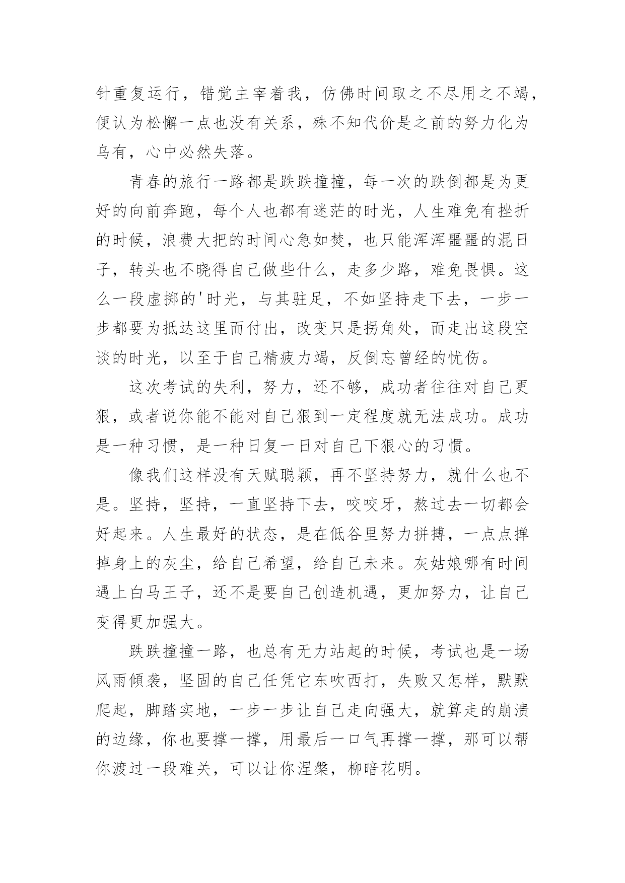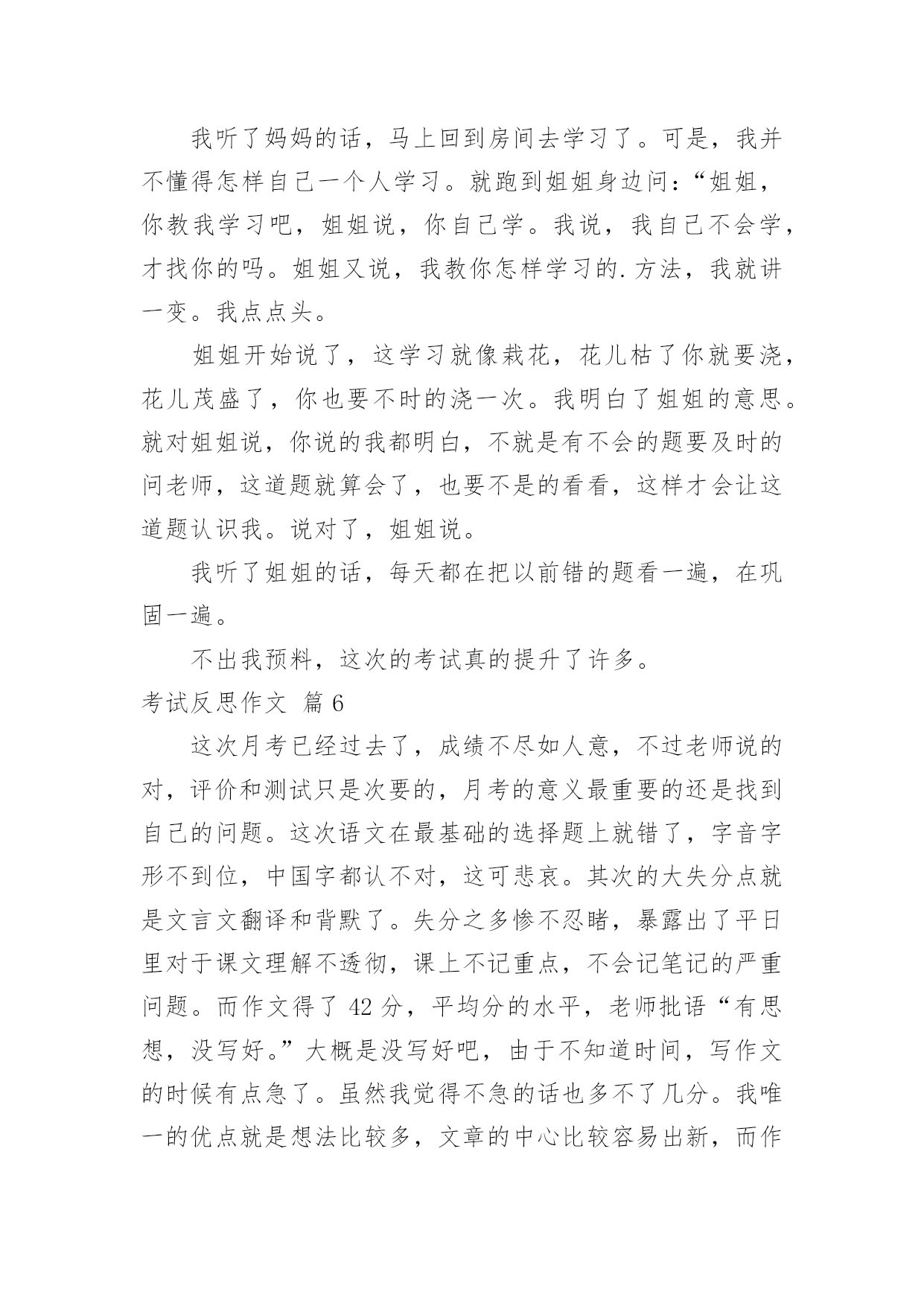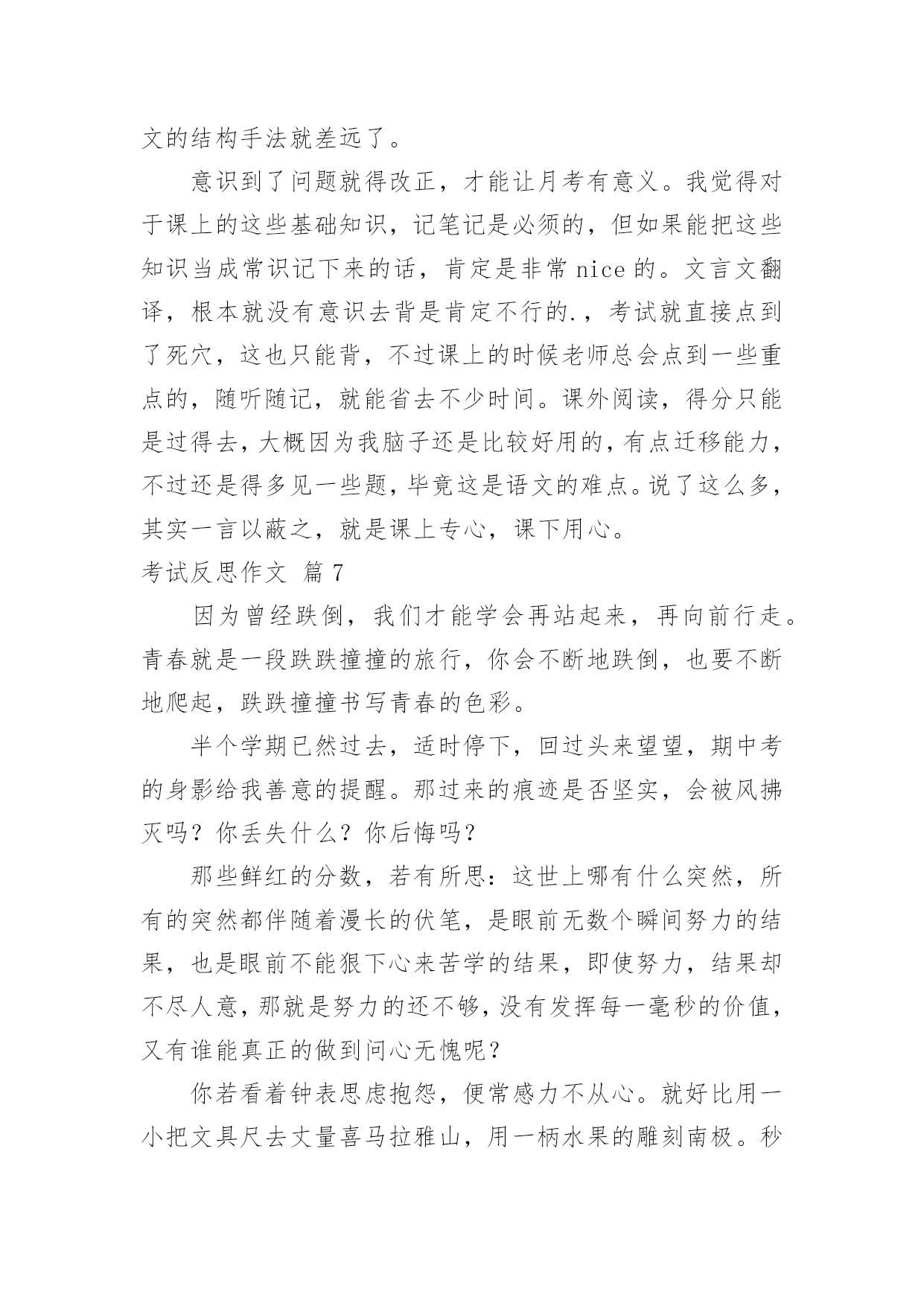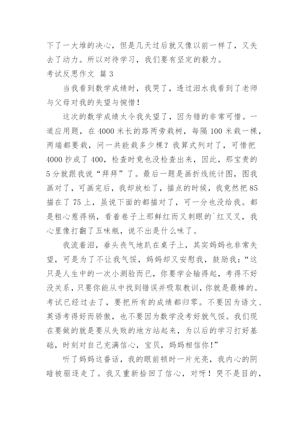 考试反思作文考试反思作文7篇[合集]在日常生活或是工作学习中,大家都经常看到作文的身影吧,作文是一种言语活动,具有高度的综合性和创造性。你所见过的作文是什么样的呢?以下是小编帮大家整理的考试反思作文7篇,欢迎阅读,希望大家能够喜欢。考试反思作文篇1时光飞逝,转眼就到了期中考试,成绩早已出来了,但基础知识的得分却让我很失望。第一,给词加点字选择意思,我错了。错的原因就是没有把字的.意思套进词里,反复读,并且理解。第二,判断题,我错了。原因是我没有认真,仔细、反复读题。再一个,那道题实在是不好理解,我应该多读,多想,再做题。第三,阅读理解的概括全文的题,我错了。原因还是没有反复阅读短文,理解短文,并写出起因及结果。第四,最后,老师还发现我“堵”字下面的“日”字写成了“目”字,唉,又马虎了!我每次考试都有不应该错的地方,所以我以后我要认真仔细答卷。第五,基础题上的看拼音写字这类的题目错的还不少,分也扣的不少。这次考试虽然考完了,但这次犯的错误却让我难以忘怀。下次考试我一定要认真仔细的答题,认真的审题,争取下次考得高分。考试反思作文篇2考试成绩发下来了,不光是语文,还有数学我以为考得很好的。可是你看两门成绩都考了八十八。我真是非常惊讶,不知所措。真是非常惭愧。首先是学习态度的反思。学习态度是决定学习成绩的重要因素;怎样评价你的学习态度是否端正呢?一是要看课堂上能否专心听讲,能否克制自己不做与学习无关的事情。二是能否自觉、独立、认真地完成作业,能否主动改正错题。三是在完成规定作业后能否主动复习、预习和进行课外学习。四是在学习中遇到问题是否想办法解决。五是能否合理分配自己的时间。其次是学习方法的反思。科学的学习方法可以收到事半功倍的效果,但科学高效的学习方法是需要我们不断摸索、总结的,特别是考试之后对各门功课的学习方法的总结。其三是应试心理和技巧的反思。我没有带着平静的心情去应试,也是我这次没有考好的原因,因心理过度骄傲而导致考试发挥失常的情况有很多。我在考试后就需要对这些没有做一个全面的总结,避免再犯类似的错误。同学们,考后反思固然重要,但是更重要的`是静下心来重新找到自己的起点;找到了起点后决不能停在起点不动,而要奋斗、前进。有的同学和我一样考试没有考到理想的分数,这时我们就知道知耻而后勇,列出了一大堆的学习计划,下了一大堆的决心,但是几天过后就又像以前一样了,又失去了动力。所以对待学习,我们要有坚定的毅力。考试反思作文篇3当我看到数学成绩时,我哭了,透过泪水我看到了老师与父母对我的失望与惋惜!这次的数学成绩太令我失望了,因为错的非常可惜。一道应用题,在4000米长的路两旁栽树,每隔100米栽一棵,两端都要栽,问一共能栽多少棵?我算式列对了,可惜把4000抄成了400,检查时竟也没检查出来,因此,那宝贵的5分就跟我说“拜拜”了。最后一题是画折线统计图,图我画对了,可画完后,我却放松了,描点的时候,我竟然把85描在了75上,虽说下面的都描对了,可一分也没给我。都是粗心惹得祸,看着卷子上那鲜红而又刺眼的`红叉叉,我心里像打翻了五味瓶,说不出是什么味了。我流着泪,垂头丧气地趴在桌子上,其实妈妈也非常失望,可是为了不让我气馁,妈妈却又安慰我,鼓励我:“这只是人生中的一次小测验而已,你要学会输得起,考得不好没关系,只要你能从中找到错误并吸取教训,你就是最棒的。考试已经过去了,要把所有的成绩都归零。不要因为语文、英语考得好而骄傲,也不要因为数学没考好就气馁。我们现在要做的就是要从失败的地方站起来,为以后的学习打好基础,时刻对自己充满信心,宝贝,妈妈相信你!”听了妈妈这番话,我的眼前顿时一片光亮,我内心的阴暗被驱逐走了。我又重新拾回了信心,对呀!哭不是目的,怎样克服粗心大意才是最重要的。妈妈经常看《哈佛女孩刘亦婷》,她笑着对我说:“刘亦婷的妈妈说开朗活泼的孩子大多都有粗心的毛病,粗心不是学习态度的问题,而是学习能力的问题,既然能力不足就要采取相应的措施来防治。我说呀,开朗活泼没有错,错的是粗心。咱们今天就按照她们的方法来制定专项训练计划。”我当然是迫不及待了,真想把这粗心一拳打走。变“粗心”为“细心”具体方法:一、提高细心度的方法——抄电话号码。找一个通讯录,在一分钟内抄写电话号码,做到“左手指、右手抄”,尽量做到抄得又快又不出错。连续对三次以上结束当天的训练,如果错了就要训练十分钟。二、计算快又准的方法——扑克牌速算。去掉牌里的大小王与J、Q、K,然后把牌洗乱,再掐着秒表一张张地迅速累加牌上的数字,直到熟练无比。这个方法我以前用过,可都没坚持下来,这次我一定要坚持下来。三、写得快又好的方法——抄写阿拉伯数字。在一分钟内尽可能快而又准确地抄写阿拉伯数字,具体方法同一。成长的路上有曲折与险峻,有人失败有人成功。良好的计划是成功的一半,妈妈的鼓励是