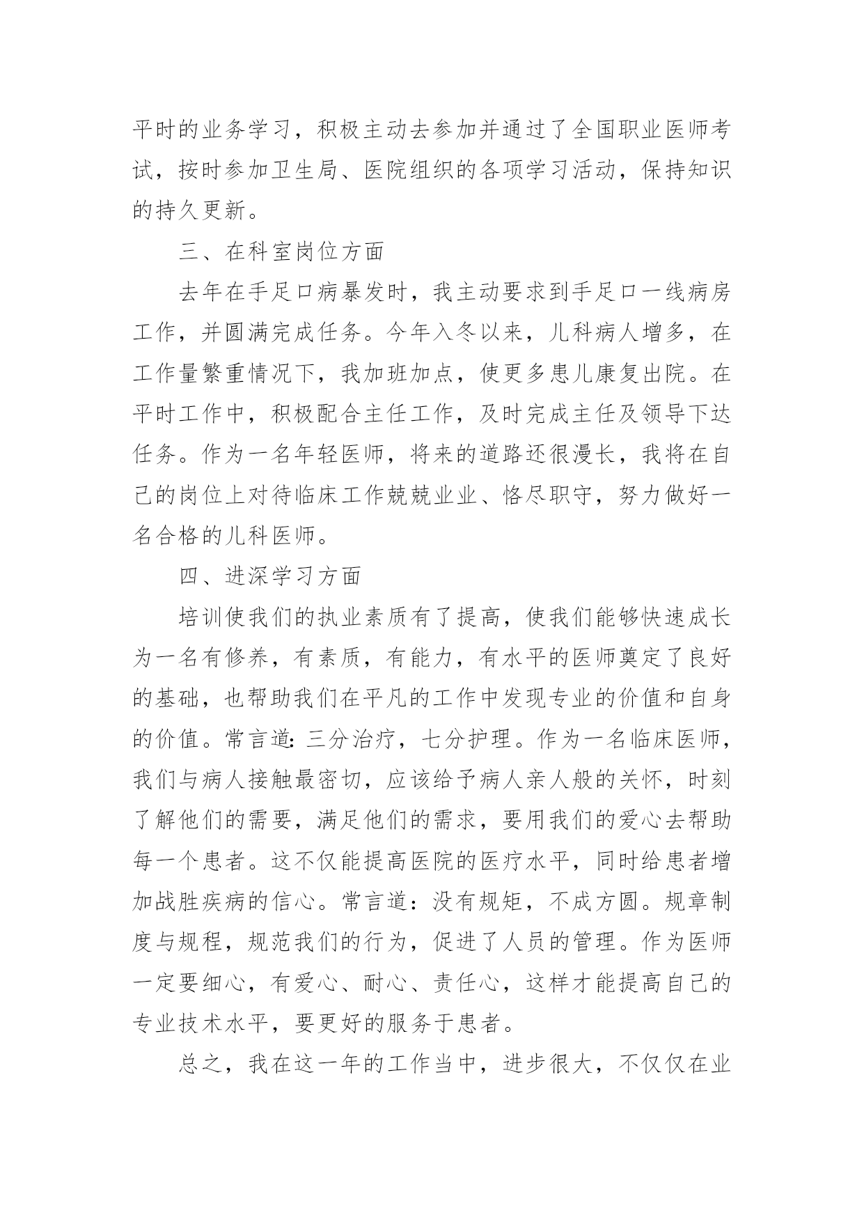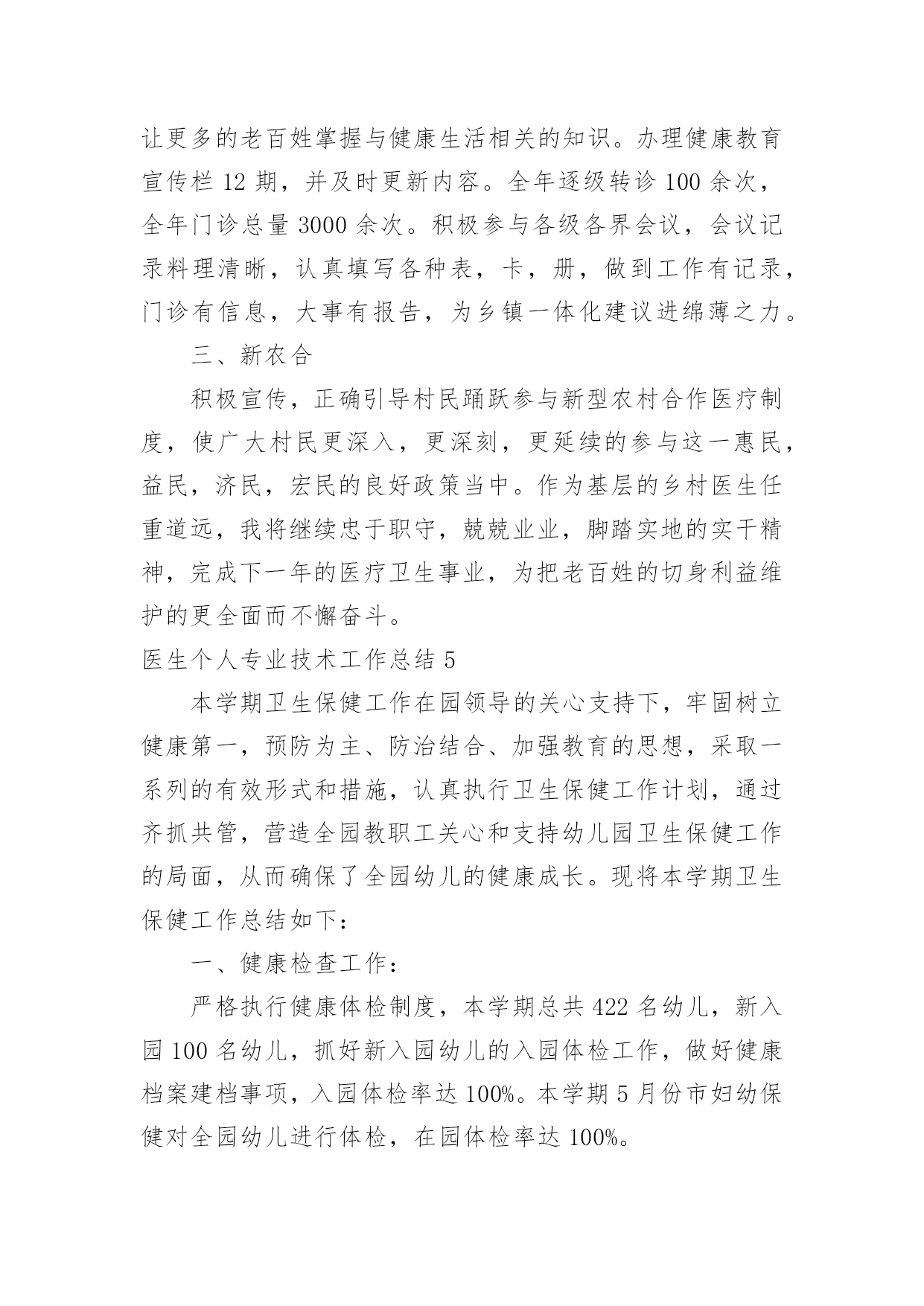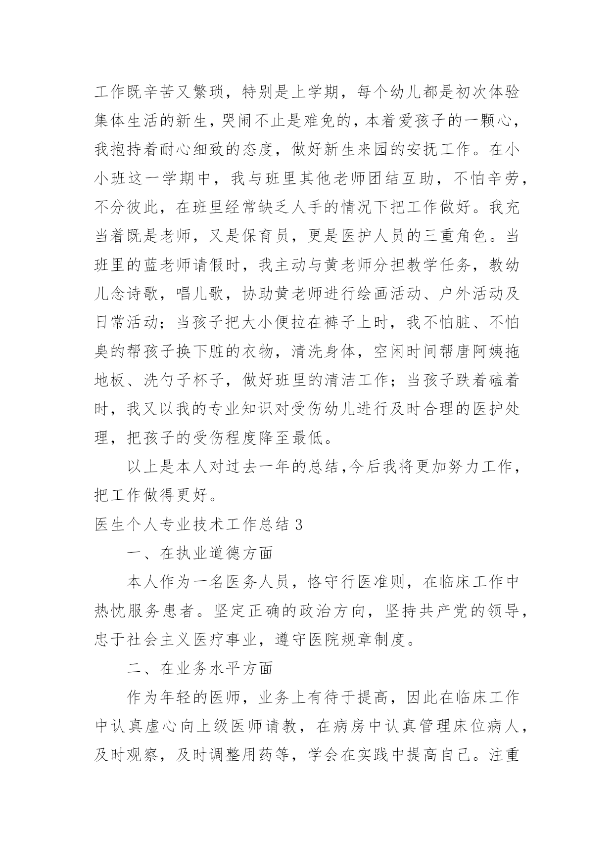 医生个人专业技术工作总结医生个人专业技术工作总结(汇编15篇)总结就是把一个时段的学习、工作或其完成情况进行一次全面系统的总结,它能帮我们理顺知识结构,突出重点,突破难点,因此十分有必须要写一份总结哦。我们该怎么去写总结呢?下面是小编为大家整理的医生个人专业技术工作总结,欢迎阅读,希望大家能够喜欢。医生个人专业技术工作总结1自去年7月到医院工作,我在二十部,二十部,二十科和重症监护病房轮换,学习工作。体验式学习,通过一年的感觉,以先前获得的理论知识和临床工作的实际相结合,我们必须在和平时期,一方面对自己的严格要求,并就此与多老师教另一方面,业余的时间刻苦钻研业务,经验要素的使用。在同期间对癌症化疗,化疗适应症,禁忌症和并发症的治疗各类专业第三十第一次接触的xx科目比较陌生。经过4个月的学习,感觉学到了很多有用的知识,如:各种形式的化疗药物在不同的外周静脉的刺激,在化疗,如毒品泄漏的危险,应立即采取保健措施,长期的发生术后深静脉导管护理的病人长期化疗。此外,在化疗的病人会出现胃肠道,皮肤,粘膜,精神状态和化疗的一系列反应的病人,此时,我们需要为病人提供护理子护理领域的热情,尊重,耐心听病人的主诉,良好的床头交接班,给病人精神上的支持。在有关知识,在学科学习的xx三十。术前准备的心理辅导和肠道准备,饮食指导。术后生命体征监测,观察切口,协助咳嗽咳痰,观察输液量和输液速度,各种引流管护理,导管护理,饮食护理,与观察和护理等术后并发症。作为妇女事务局与特异性肿瘤患者,在日常工作中,它要求我们必须更多的耐心去与他们的交流和沟通,才能更好地提高护理质量,让病人信任我们的工作。现在我三十病房旋转,这是一个综合部门,有超声刀,介入性研究,西医和化疗。我觉得在这里学习,如很多事情:谐波手术刀病人应注意皮肤的保护,感觉活动的体温,和肢端足背脉搏等;后,应逐患者肢体制动干预对象,沙袋加拿大的压力,观察病人排尿。经过近一年的研究,除了与企业各部门的知识,熟悉,但我仍然注意到,在注意文明礼貌服务,坚持文明和语言,有尊严的日常工作,文书工作,护士的专业形象,整洁的衣服,头发,没有浓妆艳抹,不穿高跟鞋,堵塞环,礼貌患有态度和蔼,语言规范。认真学习医疗事故处理条例及其法律和法规,对医疗的积极参与医院组织学习活动,以丰富的法律知识,增强安全法规自我保护意识。在积极和护士长严格的指导下,我在许多方面取得了长足的进步和改善通常在商业部门参加每月一次学习,每个星期二的上午的会议上,坚持以病人护理的关键轮,护理人员为基础的培训,由部组织的关怀坚持二是技术操作考试,取得了良好的效果。在一年的工作,可总是爱和奉献精神,贯彻以病人为中心,为核心的服务理念,提高自身素质和应急能力的质量。当然,我我发现还有一些不足之处应予改善。例如,在学习,有时有浮躁的情绪,感觉太多的东西需要学习,心浮气躁,尤其是在面对挫折,我们不能冷静处理。在工作中,有时存在着标准不高的现象,虽然基本上能够履行其职责和义务,但在行动方面也得到进一步改善,这是需要改进和加强我的未来发生。医生个人专业技术工作总结2一年的时光就这样过去了,回顾这一年的工作,真的只能用累这一个字来总结。上半年我担任园医一职,认真执行既定的各项卫生保健工作制度。把好新学期新入园幼儿的体检关;管理好儿童免疫证;对预防接种、漏种儿童及时提醒家长补种,做好接种、漏种登记;做好在园幼儿的年度体检;坚持每日晨检,做好晨检工作;做好灭蚊工作;制定每周食谱,定期召开膳食会;认真贯彻、落实每周一小检、每月一大检的卫生检查制度;配合上级卫生保健部门,开展各项卫生保健工作。配合防疫站为小朋友口服轮状病毒及注射流感疫苗;做好伙食留样工作;全园组织春游,积极配合各班及时处理意外事故发生;布置好每月一期卫生保健宣传专栏;写好期末各项统计、期末保健工作总结,认真做好年报表,整理一学期卫生保健资料、存档。下半年我主动请缨到小小班帮忙。谁都知道,小小班的工作既辛苦又繁琐,特别是上学期,每个幼儿都是初次体验集体生活的新生,哭闹不止是难免的,本着爱孩子的一颗心,我抱持着耐心细致的态度,做好新生来园的安抚工作。在小小班这一学期中,我与班里其他老师团结互助,不怕辛劳,不分彼此,在班里经常缺乏人手的情况下把工作做好。我充当着既是老师,又是保育员,更是医护人员的三重角色。当班里的蓝老师请假时,我主动与黄老师分担教学任务,教幼儿念诗歌,唱儿歌,协助黄老师进行绘画活动、户外活动及日常活动;当孩子把大小便拉在裤子上时,我不怕脏、不怕臭的帮孩子换下脏的衣物,清洗身体,空闲时间帮唐阿姨拖地板、洗勺子杯子,做好班里的清洁工作;当孩子跌着磕着时,我又以我的专业知识对受伤幼儿进行及时合理的医护处理,把孩子的受伤程度降至最低。以上是本人对过去一年的总结,今后我将更加努力工作,把工作做得更好