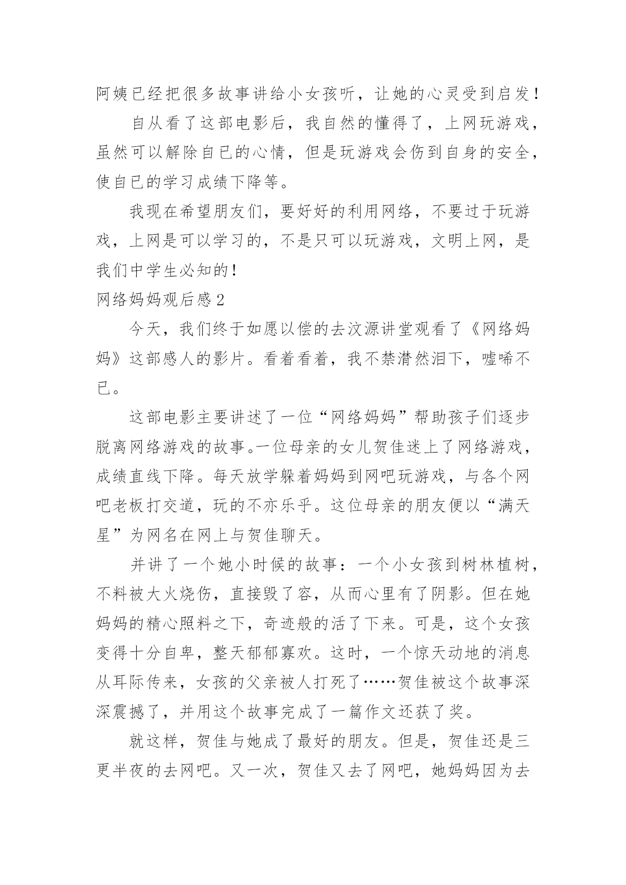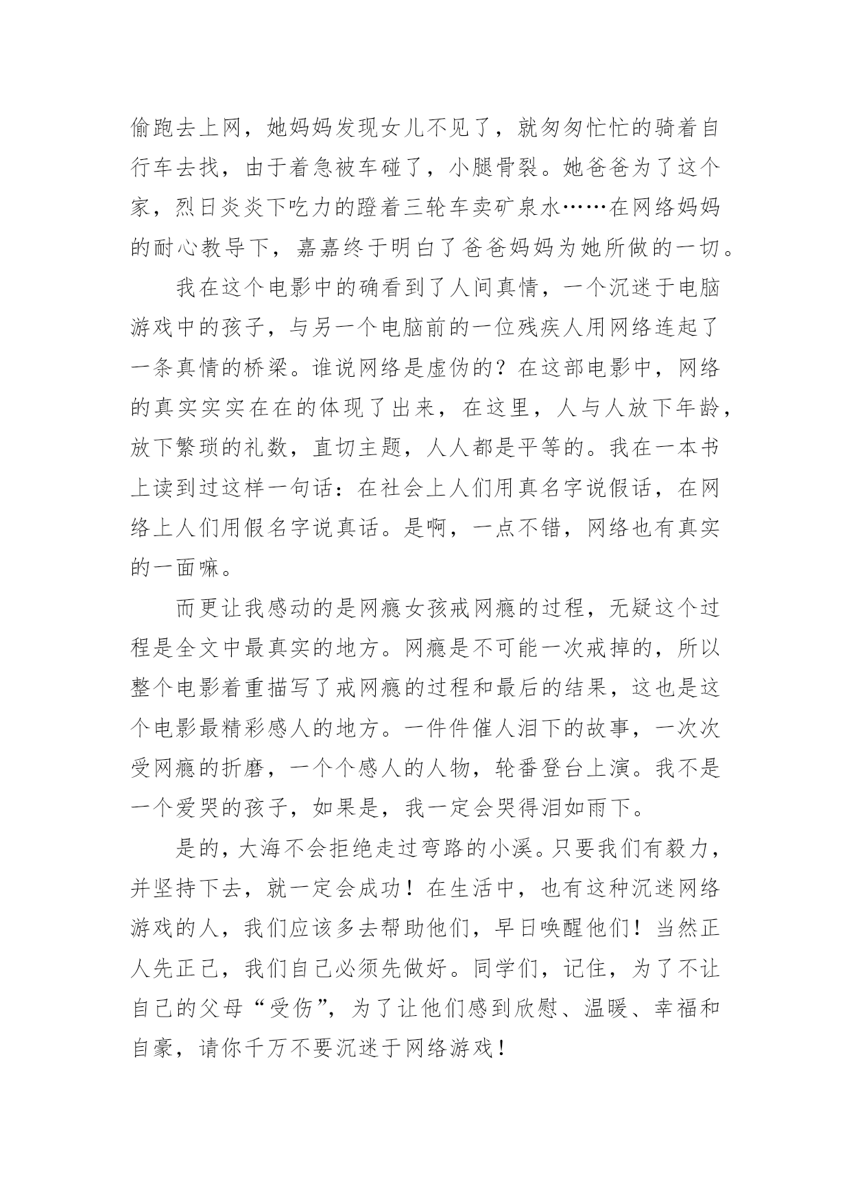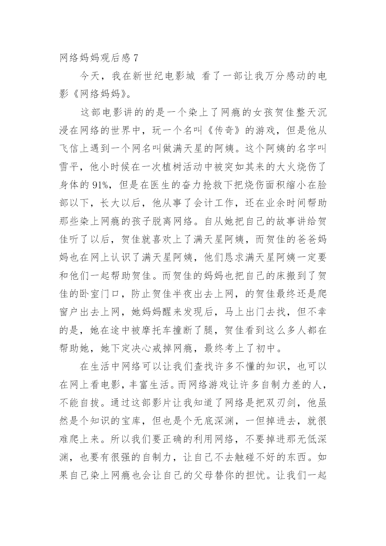 网络妈妈观后感网络妈妈观后感看完一部经典作品以后,相信大家增长不少见闻吧,为此就要认真思考观后感如何写了。那么你真的懂得怎么写观后感吗?下面是小编为大家收集的网络妈妈观后感,欢迎大家借鉴与参考,希望对大家有所帮助。网络妈妈观后感1上个星期,老师让我们全班同学在网上的自习2和自习3观看《网络妈妈》,这部电影有观于“满天星”阿姨坚强的生活态度,有感于她挽救陷入网瘾而不能自拔的中学生时独有的爱心、独特的教育方法,回想自已在学校生活中与孩子们长期接触的点点滴滴,追使自已不得不静下心来自我反思。可怜天下父母心啊,做父母的哪个不疼自已的孩子,可比起“满天星”阿姨来,孩子们为何更会听从一个毫无相干的人劝说。电影中母亲那种强制性的管教、歇斯底的规劝,却抵抗不过阿姨轻轻耐心的说教。原来孩子们也有自尊心,她们稚嫩的心灵更需要大人们细心呵护。在这部电影里的佳佳,虽然她在学校不怎么受别人欢迎,但从她玩游戏中,还可以看得出她是还有同情心的人,“满天星”阿姨把自已小时候的故事讲给小女孩听,后来小女孩把这个故事的情节写了出来,结果获奖了。其实,“满天星”阿姨已经把很多故事讲给小女孩听,让她的心灵受到启发!自从看了这部电影后,我自然的懂得了,上网玩游戏,虽然可以解除自已的心情,但是玩游戏会伤到自身的安全,使自已的学习成绩下降等。我现在希望朋友们,要好好的利用网络,不要过于玩游戏,上网是可以学习的,不是只可以玩游戏,文明上网,是我们中学生必知的!网络妈妈观后感2今天,我们终于如愿以偿的去汶源讲堂观看了《网络妈妈》这部感人的影片。看着看着,我不禁潸然泪下,嘘唏不已。这部电影主要讲述了一位“网络妈妈”帮助孩子们逐步脱离网络游戏的故事。一位母亲的女儿贺佳迷上了网络游戏,成绩直线下降。每天放学躲着妈妈到网吧玩游戏,与各个网吧老板打交道,玩的不亦乐乎。这位母亲的朋友便以“满天星”为网名在网上与贺佳聊天。并讲了一个她小时候的故事:一个小女孩到树林植树,不料被大火烧伤,直接毁了容,从而心里有了阴影。但在她妈妈的精心照料之下,奇迹般的活了下来。可是,这个女孩变得十分自卑,整天郁郁寡欢。这时,一个惊天动地的消息从耳际传来,女孩的父亲被人打死了……贺佳被这个故事深深震撼了,并用这个故事完成了一篇作文还获了奖。就这样,贺佳与她成了最好的朋友。但是,贺佳还是三更半夜的去网吧。又一次,贺佳又去了网吧,她妈妈因为去找她,结果被车撞了,住进了医院。在“满天星”的告诫下,贺佳一路跌跌撞撞跑到了医院,泪水恣意流淌,深情的喊了一声妈!学校对贺佳迷恋网吧的事颇为气愤,劝其退学。通过班主任孙老师的劝解,贺佳终于能留下来。通过这些事,贺佳终于痛下决心,坚决脱离了网络游戏,并立志“好好学习,天天向上”。“满天星”通过与迷恋网络游戏的孩子聊天,交朋友,引导很多孩子回归学校。这些孩子亲切的叫她“网络妈妈”。通过看这部电影,我感受极多。网络游戏虽好玩,可要有个限度,不能整天迷恋。那样会毁掉人的一生。还有,一旦你沉迷于网络游戏,爸爸妈妈老师也会跟着你痛苦不堪,日渐憔悴。所以,再次告诫大家:网络游戏猛于虎,切记要远离它!网络妈妈观后感3星期四,老师带我们去了看电影。电影的名字是《网络妈妈》。电影里的主人公“满天星”让我不由得赞叹:“多好的一位阿姨啊!”就是她,通过网上的聊天,把一个个迷上网络游戏的初中生教育成了关心同学,懂得爱父母的好孩子,让他们都回到了课堂上学习。她就好像是这些孩子的“网络妈妈”。首先,电影讲了一个初中男孩因为玩电脑游戏而昏迷了。然后又讲了一个初中女孩在网吧里玩电脑游戏上瘾了,都深夜了,还没有回学校睡觉。妈妈来找她,她看见了妈妈却藏起来,结果妈妈没找到她,妈妈又难过又着急。这个叫佳佳的女孩天天都去网吧里玩游戏,经常不回家,妈妈都为她伤透了心,却拿她没办法。最后是“满天星”阿姨帮佳佳改掉了玩游戏上瘾的坏毛病。电影中让我感动的一个人是佳佳的妈妈。有一天,佳佳又半夜跑去网吧玩游戏了。妈妈发现了,赶紧骑着自行车去找佳佳,当时天又黑,妈妈心里又急,慌乱之下却被一辆车撞倒了,脚上的骨头都裂了,痛得妈妈大哭。妈妈被送到了医院,可佳佳却还在网吧里兴奋地玩着游戏呢。真是“可怜天下父母心”啊!佳佳的爸爸妈妈为了佳佳学好什么都愿意去做。这部电影里最让我感动的人是“满天星”阿姨。她从小就被大火烧伤了身体,经历了无数次的手术,但还是落下了双手残疾。可她不仅坚强地活下来了,而且还帮助了许多迷恋网络的孩子。她真有爱心!她对佳佳说了一句话:大海从不拒绝走了弯路的小溪。我觉得很好,因为这句话让我明白了:不管一个人曾经犯了多大的错误,只要他有信心、有决心去改正错误,大家也会欢迎他的。我觉得这是一部很感人的电影,它让我知道了要关心父母以及你所有的亲人。它让我明白了不能迷上网络游戏。我以后一定要少玩电脑游戏。网络妈妈观后感4看完《