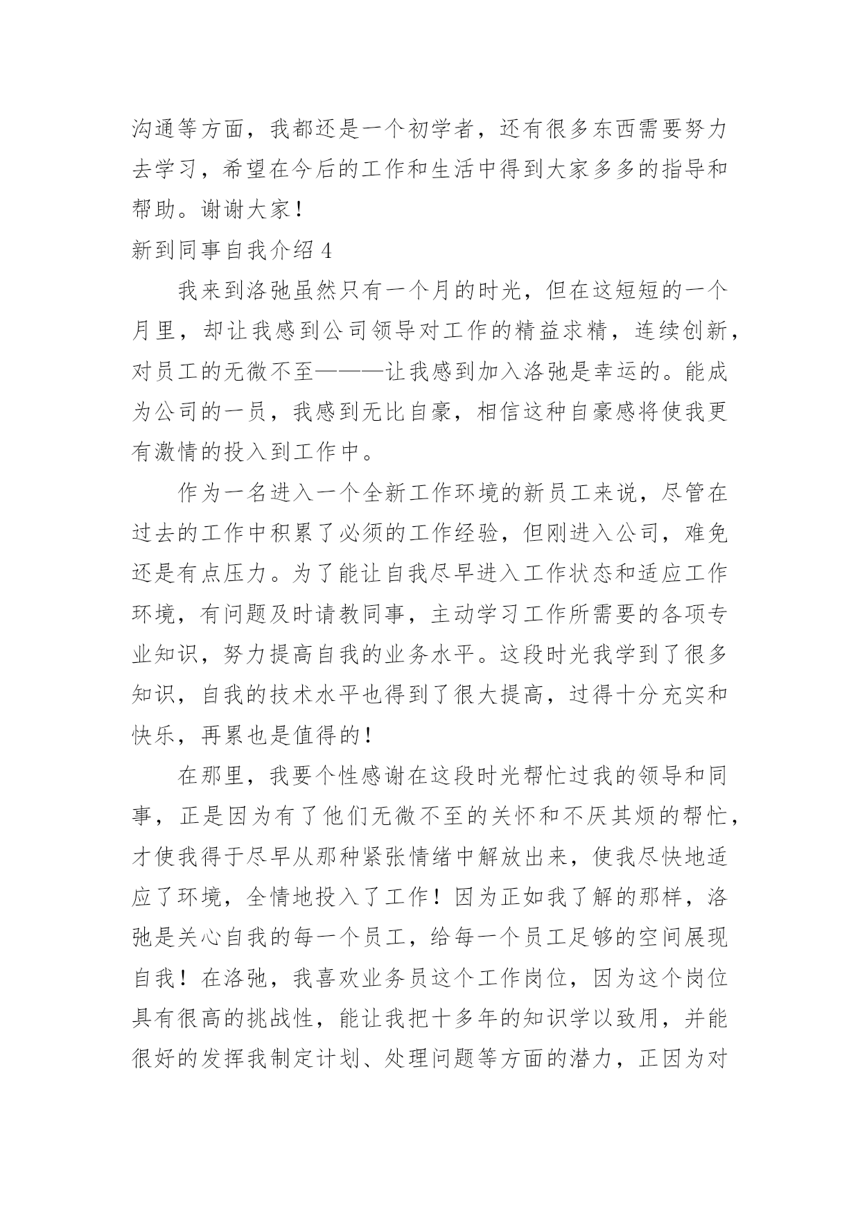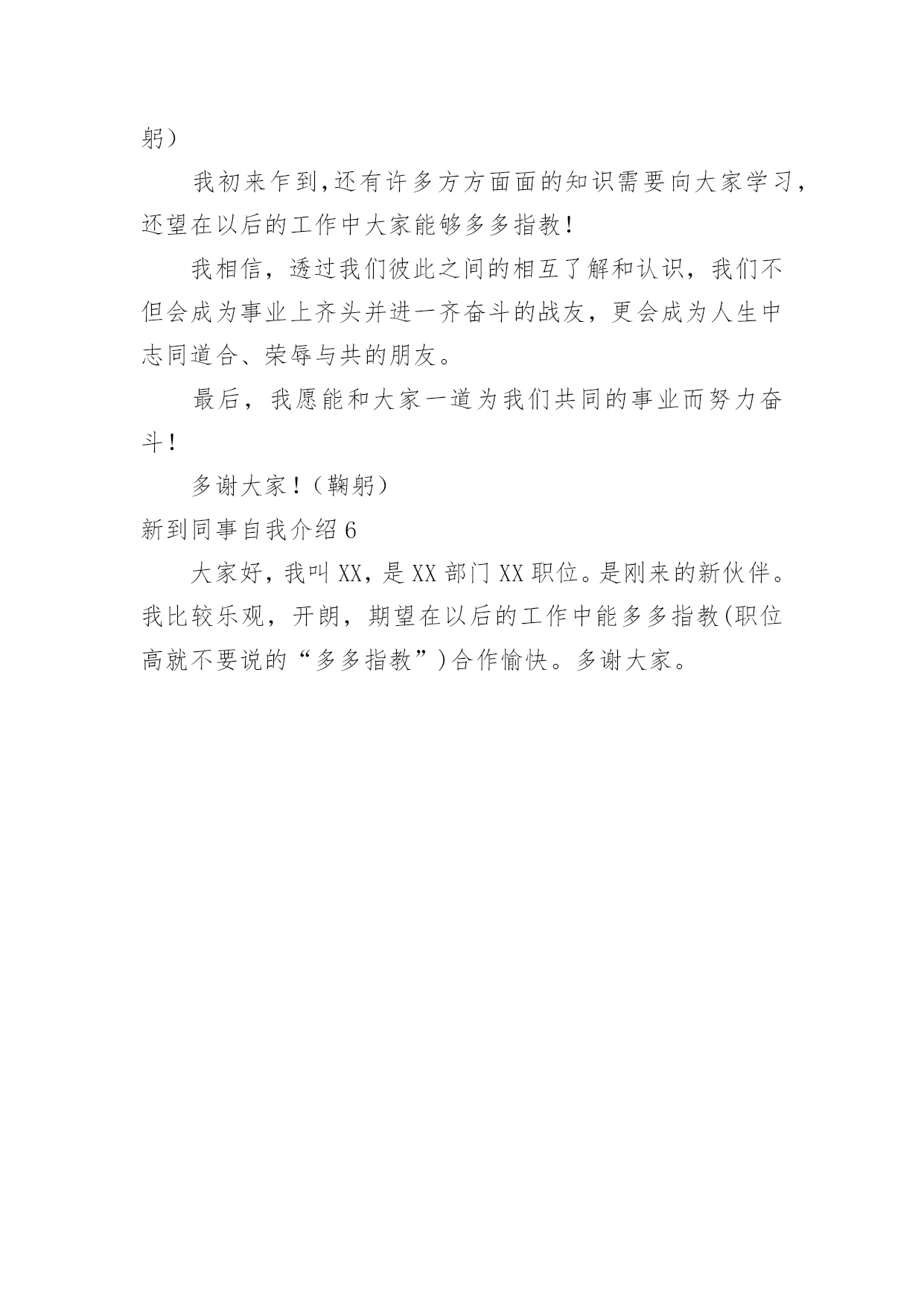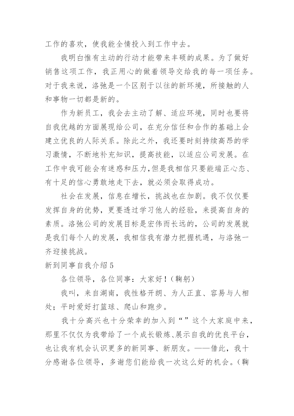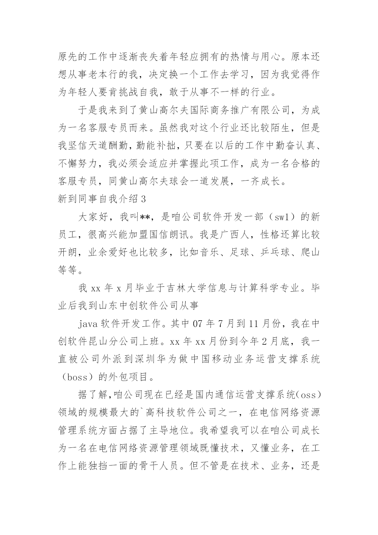 新到同事自我介绍新到同事自我介绍新到同事自我介绍1我是**,属于**部门,来自广东,在加入公司之前,主要Focus在技术和SD方面。曾参与XXX全球ERP整合项目和XXXX杭州工厂的SAP项目。但是HR就比较空白,期望各位多多指教。至于爱好方面——请问一下,哪里能够游泳?当然不要太贵那种,有空大家能够一齐咯,人多才好玩嘛;再顺便问一下,哪有篮球场?有同道中人能够一齐切磋切磋,当然更好了;乒乓球也是我所爱,但是培训室里面的乒乓球台,充分说明公司里面藏龙卧虎。排行第一,肯定是没我份了,只期望排行不是倒数那个;说到K歌,也算是我一大爱好,最喜欢就是,扯着嗓子唱到声嘶力竭,尽兴而归。至于好不好听,那就见仁见智咯,钓胜于鱼嘛,呵呵。最喜欢点的就是《劲歌金曲》,能做十几二十分钟的“麦霸”。毕竟公司里面会讲粤语,能唱粤语歌的人不多,嘿嘿。新到同事自我介绍2大家好,我叫张玮,在来到公司之前已经在社会工作了两年的时光。两年不长,但是也让我脱离了刚从校门的青涩与迷茫,使我对社会工作有了必须的了解与适应,同时也在原先的工作中逐渐丧失着年轻应拥有的热情与用心。原本还想从事老本行的我,决定换一个工作去学习,因为我觉得作为年轻人要肯挑战自我,敢于从事不一样的行业。于是我来到了黄山高尔夫国际商务推广有限公司,为成为一名客服专员而来。虽然我对这个行业还比较陌生,但是我坚信天道酬勤,勤能补拙,只要在以后的工作中勤奋认真、不懈努力,我必须会适应并掌握此项工作,成为一名合格的客服专员,同黄山高尔夫球会一道发展,一齐成长。新到同事自我介绍3大家好,我叫**,是咱公司软件开发一部(sw1)的新员工,很高兴能加盟国信朗讯。我是广西人,性格还算比较开朗,业余爱好也比较多,比如音乐、足球、乒乓球、爬山等等。我xx年x月毕业于吉林大学信息与计算科学专业。毕业后我到山东中创软件公司从事java软件开发工作。其中07年7月到11月份,我在中创软件昆山分公司上班。xx年xx月份到今年2月底,我一直被公司外派到深圳华为做中国移动业务运营支撑系统(boss)的外包项目。据了解,咱公司现在已经是国内通信运营支撑系统(oss)领域的规模最大的`高科技软件公司之一,在电信网络资源管理系统方面占据了主导地位。我希望我可以在咱公司成长为一名在电信网络资源管理领域既懂技术,又懂业务,在工作上能独挡一面的骨干人员。但不管是在技术、业务,还是沟通等方面,我都还是一个初学者,还有很多东西需要努力去学习,希望在今后的工作和生活中得到大家多多的指导和帮助。谢谢大家!新到同事自我介绍4我来到洛弛虽然只有一个月的时光,但在这短短的一个月里,却让我感到公司领导对工作的精益求精,连续创新,对员工的无微不至———让我感到加入洛弛是幸运的。能成为公司的一员,我感到无比自豪,相信这种自豪感将使我更有激情的投入到工作中。作为一名进入一个全新工作环境的新员工来说,尽管在过去的工作中积累了必须的工作经验,但刚进入公司,难免还是有点压力。为了能让自我尽早进入工作状态和适应工作环境,有问题及时请教同事,主动学习工作所需要的各项专业知识,努力提高自我的业务水平。这段时光我学到了很多知识,自我的技术水平也得到了很大提高,过得十分充实和快乐,再累也是值得的!在那里,我要个性感谢在这段时光帮忙过我的领导和同事,正是因为有了他们无微不至的关怀和不厌其烦的帮忙,才使我得于尽早从那种紧张情绪中解放出来,使我尽快地适应了环境,全情地投入了工作!因为正如我了解的那样,洛弛是关心自我的每一个员工,给每一个员工足够的空间展现自我!在洛弛,我喜欢业务员这个工作岗位,因为这个岗位具有很高的挑战性,能让我把十多年的知识学以致用,并能很好的发挥我制定计划、处理问题等方面的潜力,正因为对工作的喜欢,使我能全情投入到工作中去。我明白惟有主动的行动才能带来丰硕的成果。为了做好销售这项工作,我正用心的做着领导交给我的每一项任务。对于我来说,洛弛是一个区别于以往的新环境,所接触的人和事物一切都是新的。作为新员工,我会去主动了解、适应环境,同时也要将自我优越的方面展现给公司,在充分信任和合作的基础上会建立优良的人际关系。除此之外,我还要时刻持续高昂的学习激情,不断地补充知识,提高技能,以适应公司发展。在工作中我可能会有迷惑和压力,但是我相信只要能端正心态、有十足的信心勇敢地走下去,就必须会取得成功。社会在发展,信息在增长,挑战也在加剧。我不仅仅要发挥自身的优势,更要透过学习他人的经验,来提高自身的素质。洛弛公司的发展目标是宏伟而长远的,公司的发展就是我们每个人的发展,我相信我有潜力把握机遇,与洛弛一齐迎接挑战。新到同事自我介绍5各位领导,各位同事:大家好!(鞠躬)我叫,来自湖南,我性格开朗、为人正直、容易与人相处;平时爱好打篮球、爬山和跑步。我十分高兴也十分荣幸的加入