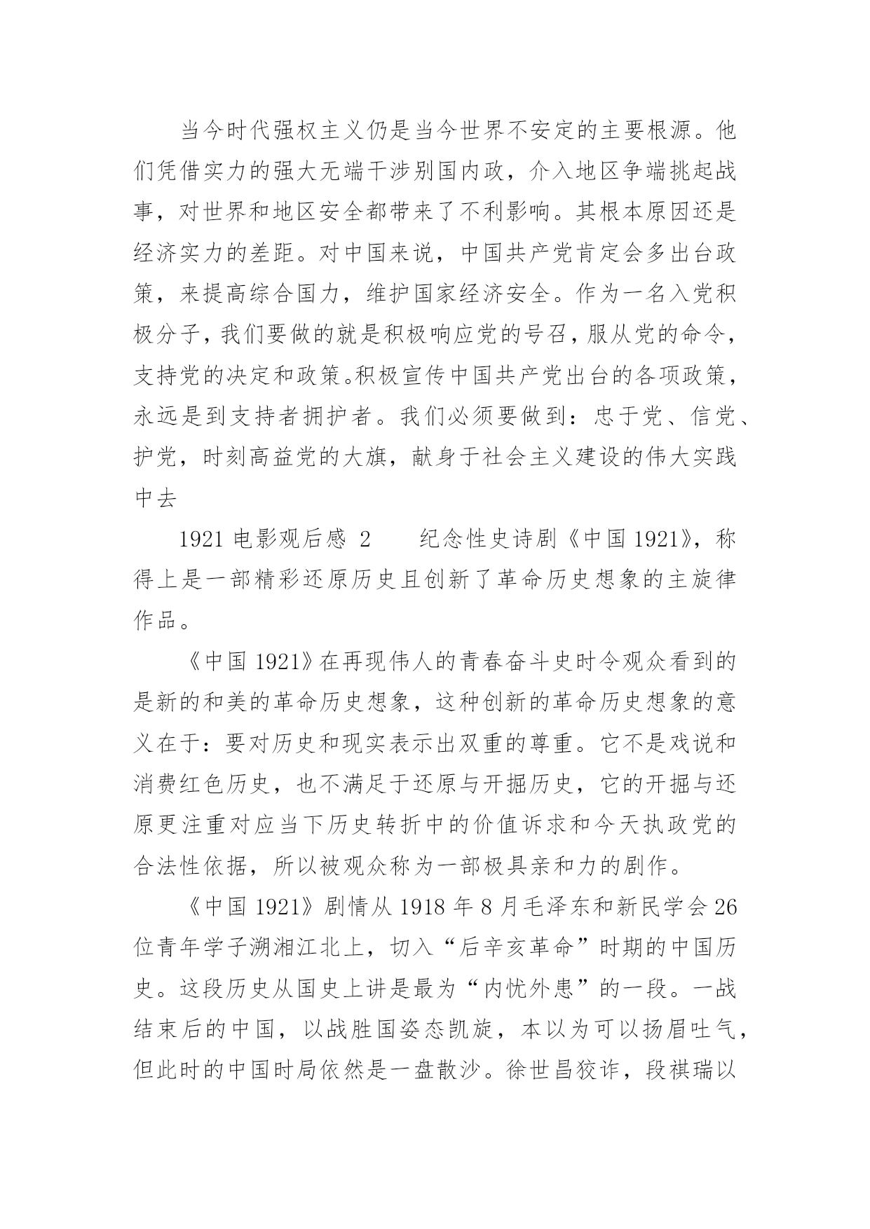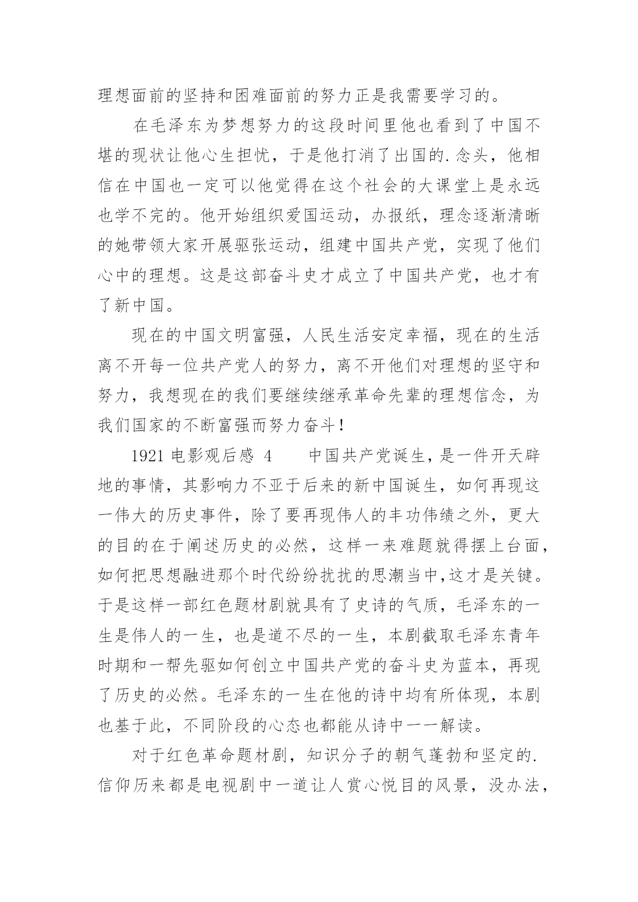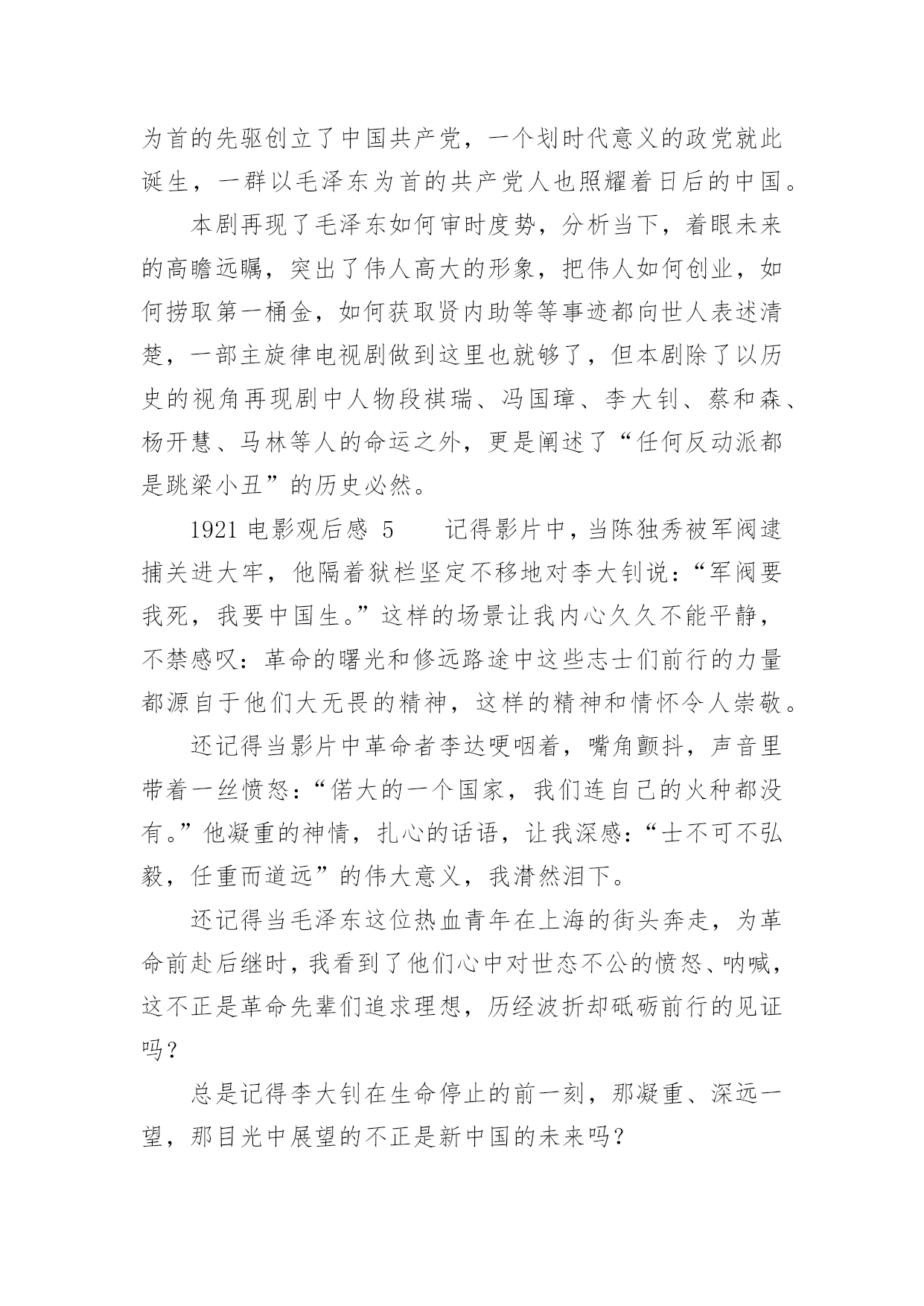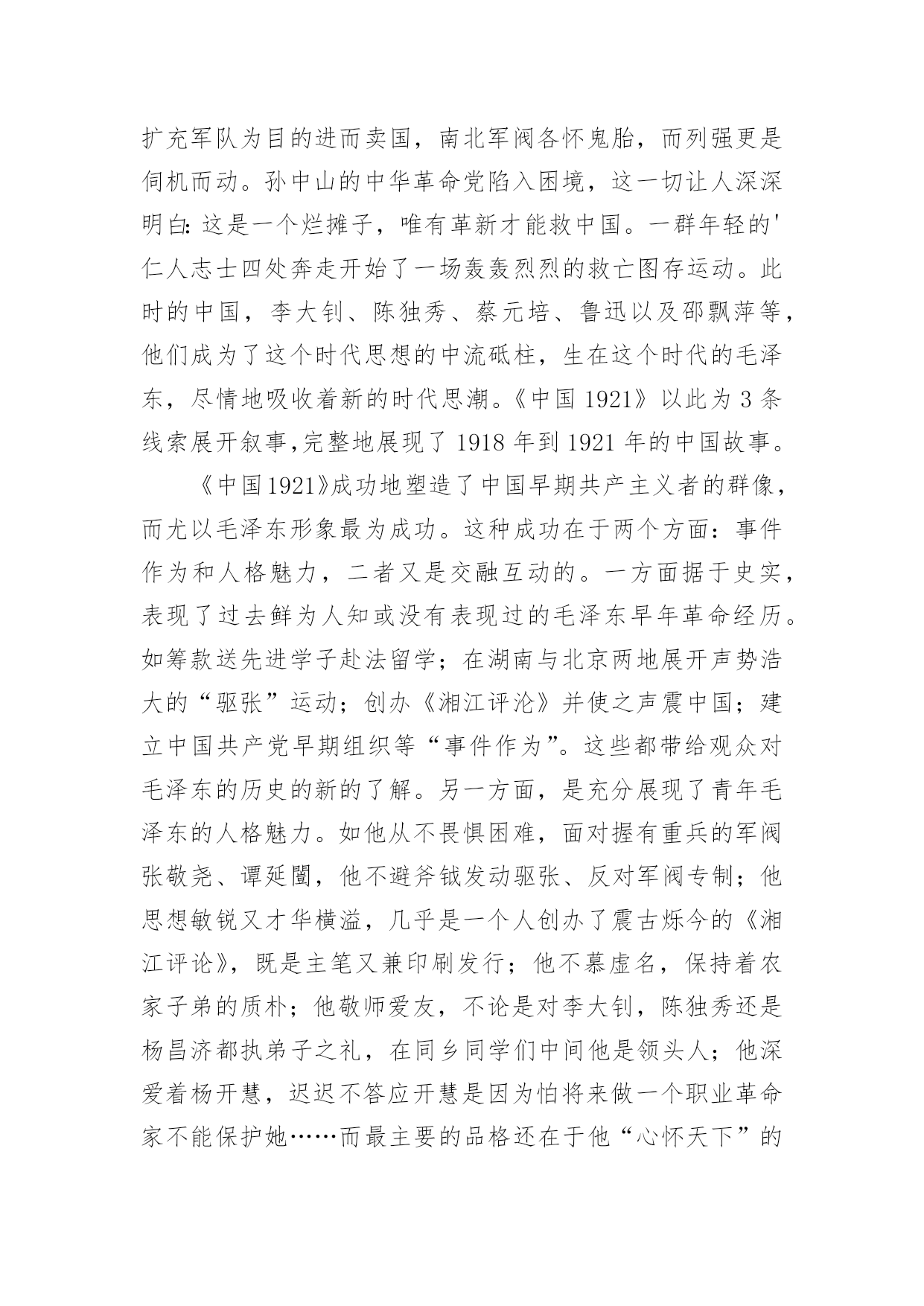 1921电影观后感有关1921电影观后感(精选5篇)看完一部作品后,相信你一定有很多值得分享的收获,何不写一篇观后感记录下呢?那么你真的会写观后感吗?以下是小编帮大家整理的1921电影观后感范文(精选5篇),欢迎大家借鉴与参考,希望对大家有所帮助!1921电影观后感1此部纪录片以上海的城市特质为切入点,详细讲述了中国共产党的成长历程,解读了英雄城市上海的历史基因。通过追溯中国共产党的成立之路,展现了上海革命圣地的不同风貌。通篇五集,第1集《风起》,开篇以响应“五四”的“六三运动”为切入点,从上海特殊的城市地位和人文精神展现其孕育社会革命的天然气质。第2集《潮动》,深度剖析上海历史文化基因对成为党的诞生地的重要主导作用。第3集《选择》,陈述中国先进知识分子如何与改良主义者、折衷主义者、无政府主义者分道扬镳,坚定的选择马克思主义的过程。第4集《曙光》,详细描述了中国共产党诞生时,外部的苏俄和共产国际对党的帮助的历史始末。第5集《星火》,讲述中国共产党从上海发起诞生后,先后推动工人运动、马克思主义宣传、帮助各地建立共产党早期组织。1921年7月,中国共产党第一次全国代表大会在上海召开。自此,中国共产党完成了独立建党进程。影片虽是讲建党以前的故事,实则对现代的年青人有着极大的学习和借荐作用。观看此片后,我的内心无比震撼。《中国1921》很好反映了建党历程,反映了共产党如何建立、时代背景、历史渊源等问题。通过纪录片我了解到,中国共产党的早期活动都是从先的知识分子中发起,大学生群体一直是坚实的文持力量。中国共产党带领中国人民的奋斗史和所取得的辉煌成就,充分证明了中国共产党是中国工人阶级的先锋队,是中国人民和中华民族的先锋队,是中国特色社会主义事业的领导核心,是伟大、光荣、正确的党。我们党的奋斗史,是一部领导中国人民站起来的历史,领导人民群众富起来的历史,领导中华民族强起来的历史,是中华民族史上一束最辉煌灿烂的画卷。我们党是执政党,那是历史的选择、人民的选择。作为当代大学生,新青年,入党积极分子,我认为我们有必要继口年前建党先驱的'革命精神,始终积极的拥护党的领导地位。进入21世纪以来,国际国内形势发生了深刻变化,中国在经历了接近百年的磨练和低砺后,也成为领导中华民族奔赴现代化和全面小康会的核心和中轴力量。作为当代的大学生,我们虽然在思想和生活上发生该以大了深刻的变化,但是面对当前国内外的形势时仍然应该以大局为重,做生活和思想上的理智者。对于党内党外存在的各种矛盾,我们应该理性地看待,对于党在工作中存在的诸多问题,我们应该理性的云解决,而不能以此否定的伟大地位,脱离与党的关系。当今时代强权主义仍是当今世界不安定的主要根源。他们凭借实力的强大无端干涉别国内政,介入地区争端挑起战事,对世界和地区安全都带来了不利影响。其根本原因还是经济实力的差距。对中国来说,中国共产党肯定会多出台政策,来提高综合国力,维护国家经济安全。作为一名入党积极分子,我们要做的就是积极响应党的号召,服从党的命令,支持党的决定和政策。积极宣传中国共产党出台的各项政策,永远是到支持者拥护者。我们必须要做到:忠于党、信党、护党,时刻高益党的大旗,献身于社会主义建设的伟大实践中去1921电影观后感2纪念性史诗剧《中国1921》,称得上是一部精彩还原历史且创新了革命历史想象的主旋律作品。《中国1921》在再现伟人的青春奋斗史时令观众看到的是新的和美的革命历史想象,这种创新的革命历史想象的意义在于:要对历史和现实表示出双重的尊重。它不是戏说和消费红色历史,也不满足于还原与开掘历史,它的开掘与还原更注重对应当下历史转折中的价值诉求和今天执政党的合法性依据,所以被观众称为一部极具亲和力的剧作。《中国1921》剧情从1918年8月毛泽东和新民学会26位青年学子溯湘江北上,切入“后辛亥革命”时期的中国历史。这段历史从国史上讲是最为“内忧外患”的一段。一战结束后的中国,以战胜国姿态凯旋,本以为可以扬眉吐气,但此时的中国时局依然是一盘散沙。徐世昌狡诈,段祺瑞以扩充军队为目的进而卖国,南北军阀各怀鬼胎,而列强更是伺机而动。孙中山的中华革命党陷入困境,这一切让人深深明白:这是一个烂摊子,唯有革新才能救中国。一群年轻的'仁人志士四处奔走开始了一场轰轰烈烈的救亡图存运动。此时的中国,李大钊、陈独秀、蔡元培、鲁迅以及邵飘萍等,他们成为了这个时代思想的中流砥柱,生在这个时代的毛泽东,尽情地吸收着新的时代思潮。《中国1921》以此为3条线索展开叙事,完整地展现了1918年到1921年的中国故事。《中国1921》成功地塑造了中国早期共产主义者的群像,而尤以毛泽东形象最为成功。这种成功在于两个方面:事件作为和人格魅力,二者又是交融互动的。一方面据于史实,表现了过去鲜为人知或没有表现过的毛泽东早年革命经历。如筹