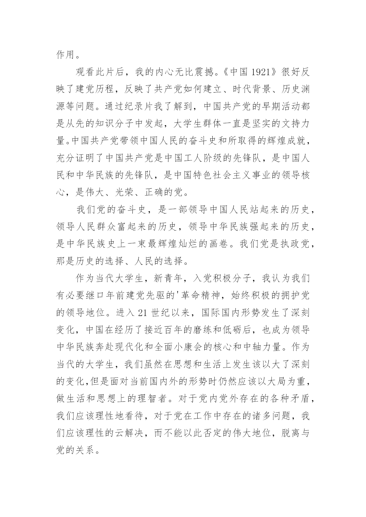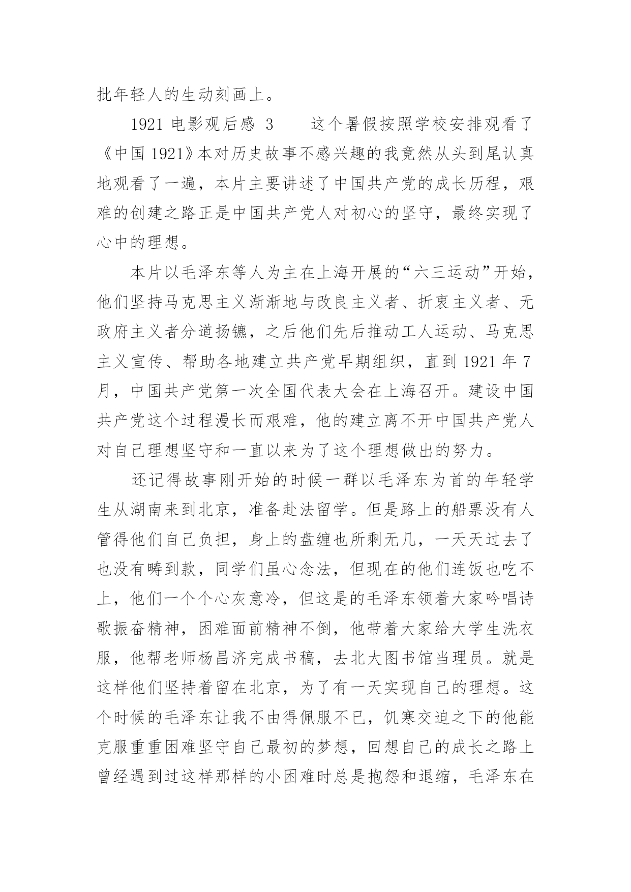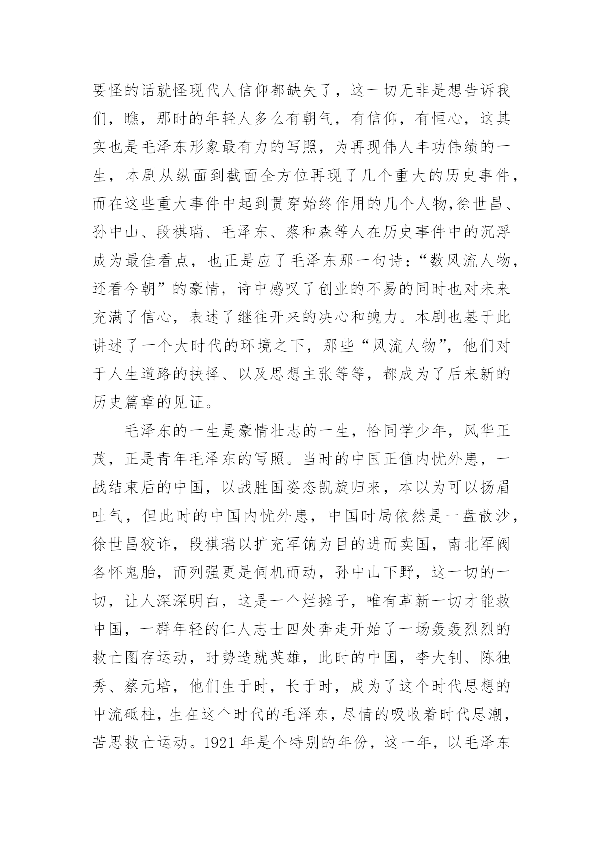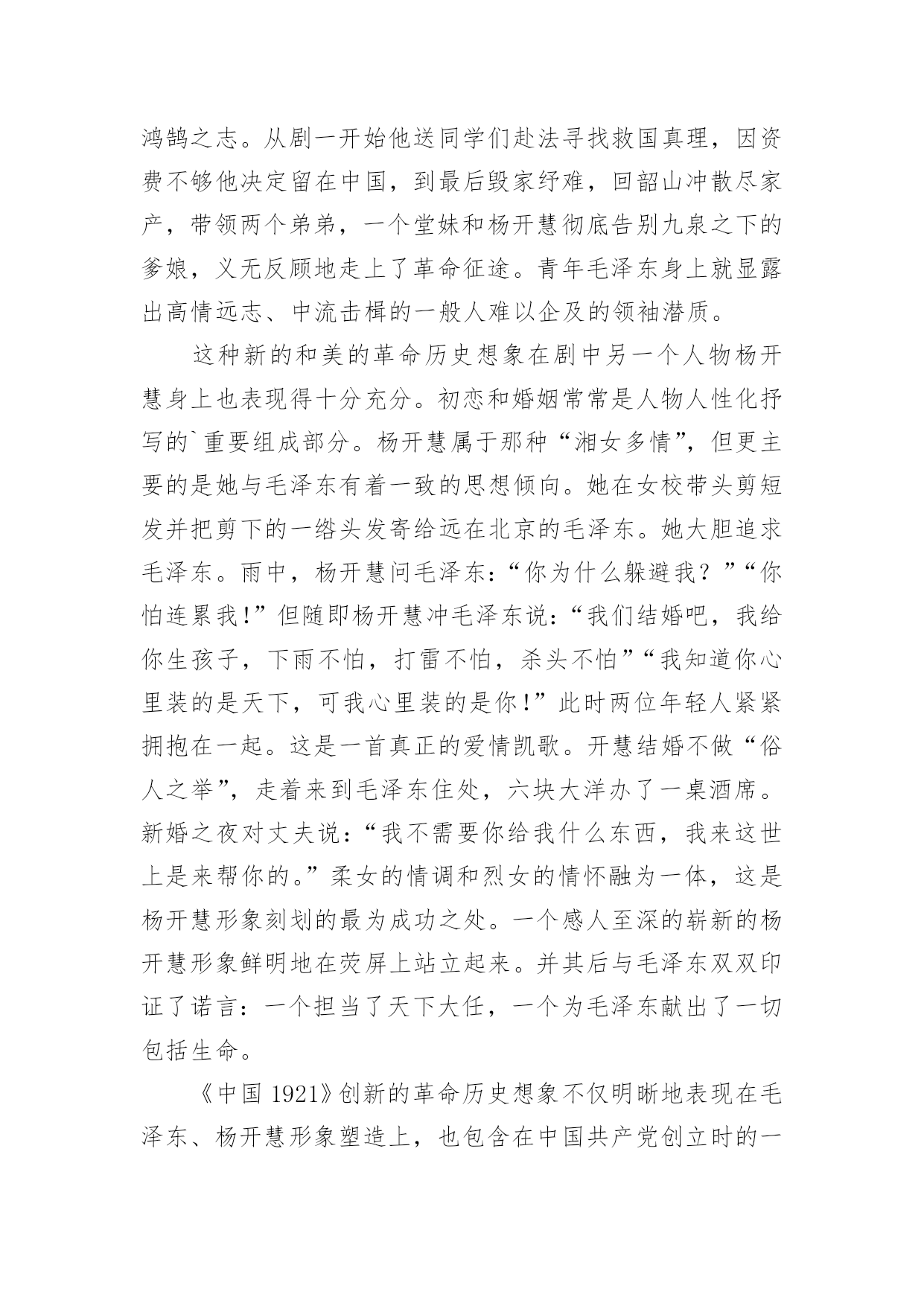 1921电影观后感有关1921电影观后感(精选5篇)看完一部作品后,相信你一定有很多值得分享的收获,何不写一篇观后感记录下呢?那么你真的会写观后感吗?以下是小编帮大家整理的1921电影观后感范文(精选5篇),欢迎大家借鉴与参考,希望对大家有所帮助!1921电影观后感1此部纪录片以上海的城市特质为切入点,详细讲述了中国共产党的成长历程,解读了英雄城市上海的历史基因。通过追溯中国共产党的成立之路,展现了上海革命圣地的不同风貌。通篇五集,第1集《风起》,开篇以响应“五四”的“六三运动”为切入点,从上海特殊的城市地位和人文精神展现其孕育社会革命的天然气质。第2集《潮动》,深度剖析上海历史文化基因对成为党的诞生地的重要主导作用。第3集《选择》,陈述中国先进知识分子如何与改良主义者、折衷主义者、无政府主义者分道扬镳,坚定的选择马克思主义的过程。第4集《曙光》,详细描述了中国共产党诞生时,外部的苏俄和共产国际对党的帮助的历史始末。第5集《星火》,讲述中国共产党从上海发起诞生后,先后推动工人运动、马克思主义宣传、帮助各地建立共产党早期组织。1921年7月,中国共产党第一次全国代表大会在上海召开。自此,中国共产党完成了独立建党进程。影片虽是讲建党以前的故事,实则对现代的年青人有着极大的学习和借荐作用。观看此片后,我的内心无比震撼。《中国1921》很好反映了建党历程,反映了共产党如何建立、时代背景、历史渊源等问题。通过纪录片我了解到,中国共产党的早期活动都是从先的知识分子中发起,大学生群体一直是坚实的文持力量。中国共产党带领中国人民的奋斗史和所取得的辉煌成就,充分证明了中国共产党是中国工人阶级的先锋队,是中国人民和中华民族的先锋队,是中国特色社会主义事业的领导核心,是伟大、光荣、正确的党。我们党的奋斗史,是一部领导中国人民站起来的历史,领导人民群众富起来的历史,领导中华民族强起来的历史,是中华民族史上一束最辉煌灿烂的画卷。我们党是执政党,那是历史的选择、人民的选择。作为当代大学生,新青年,入党积极分子,我认为我们有必要继口年前建党先驱的'革命精神,始终积极的拥护党的领导地位。进入21世纪以来,国际国内形势发生了深刻变化,中国在经历了接近百年的磨练和低砺后,也成为领导中华民族奔赴现代化和全面小康会的核心和中轴力量。作为当代的大学生,我们虽然在思想和生活上发生该以大了深刻的变化,但是面对当前国内外的形势时仍然应该以大局为重,做生活和思想上的理智者。对于党内党外存在的各种矛盾,我们应该理性地看待,对于党在工作中存在的诸多问题,我们应该理性的云解决,而不能以此否定的伟大地位,脱离与党的关系。当今时代强权主义仍是当今世界不安定的主要根源。他们凭借实力的强大无端干涉别国内政,介入地区争端挑起战事,对世界和地区安全都带来了不利影响。其根本原因还是经济实力的差距。对中国来说,中国共产党肯定会多出台政策,来提高综合国力,维护国家经济安全。作为一名入党积极分子,我们要做的就是积极响应党的号召,服从党的命令,支持党的决定和政策。积极宣传中国共产党出台的各项政策,永远是到支持者拥护者。我们必须要做到:忠于党、信党、护党,时刻高益党的大旗,献身于社会主义建设的伟大实践中去1921电影观后感2纪念性史诗剧《中国1921》,称得上是一部精彩还原历史且创新了革命历史想象的主旋律作品。《中国1921》在再现伟人的青春奋斗史时令观众看到的是新的和美的革命历史想象,这种创新的革命历史想象的意义在于:要对历史和现实表示出双重的尊重。它不是戏说和消费红色历史,也不满足于还原与开掘历史,它的开掘与还原更注重对应当下历史转折中的价值诉求和今天执政党的合法性依据,所以被观众称为一部极具亲和力的剧作。《中国1921》剧情从1918年8月毛泽东和新民学会26位青年学子溯湘江北上,切入“后辛亥革命”时期的中国历史。这段历史从国史上讲是最为“内忧外患”的一段。一战结束后的中国,以战胜国姿态凯旋,本以为可以扬眉吐气,但此时的中国时局依然是一盘散沙。徐世昌狡诈,段祺瑞以扩充军队为目的进而卖国,南北军阀各怀鬼胎,而列强更是伺机而动。孙中山的中华革命党陷入困境,这一切让人深深明白:这是一个烂摊子,唯有革新才能救中国。一群年轻的'仁人志士四处奔走开始了一场轰轰烈烈的救亡图存运动。此时的中国,李大钊、陈独秀、蔡元培、鲁迅以及邵飘萍等,他们成为了这个时代思想的中流砥柱,生在这个时代的毛泽东,尽情地吸收着新的时代思潮。《中国1921》以此为3条线索展开叙事,完整地展现了1918年到1921年的中国故事。《中国1921》成功地塑造了中国早期共产主义者的群像,而尤以毛泽东形象最为成功。这种成功在于两个方面:事件作为和人格魅力,二者又是交融互动的。一方面据于史实,表现了过去鲜为人知或没有表现过的毛泽东早年革命经历。如筹